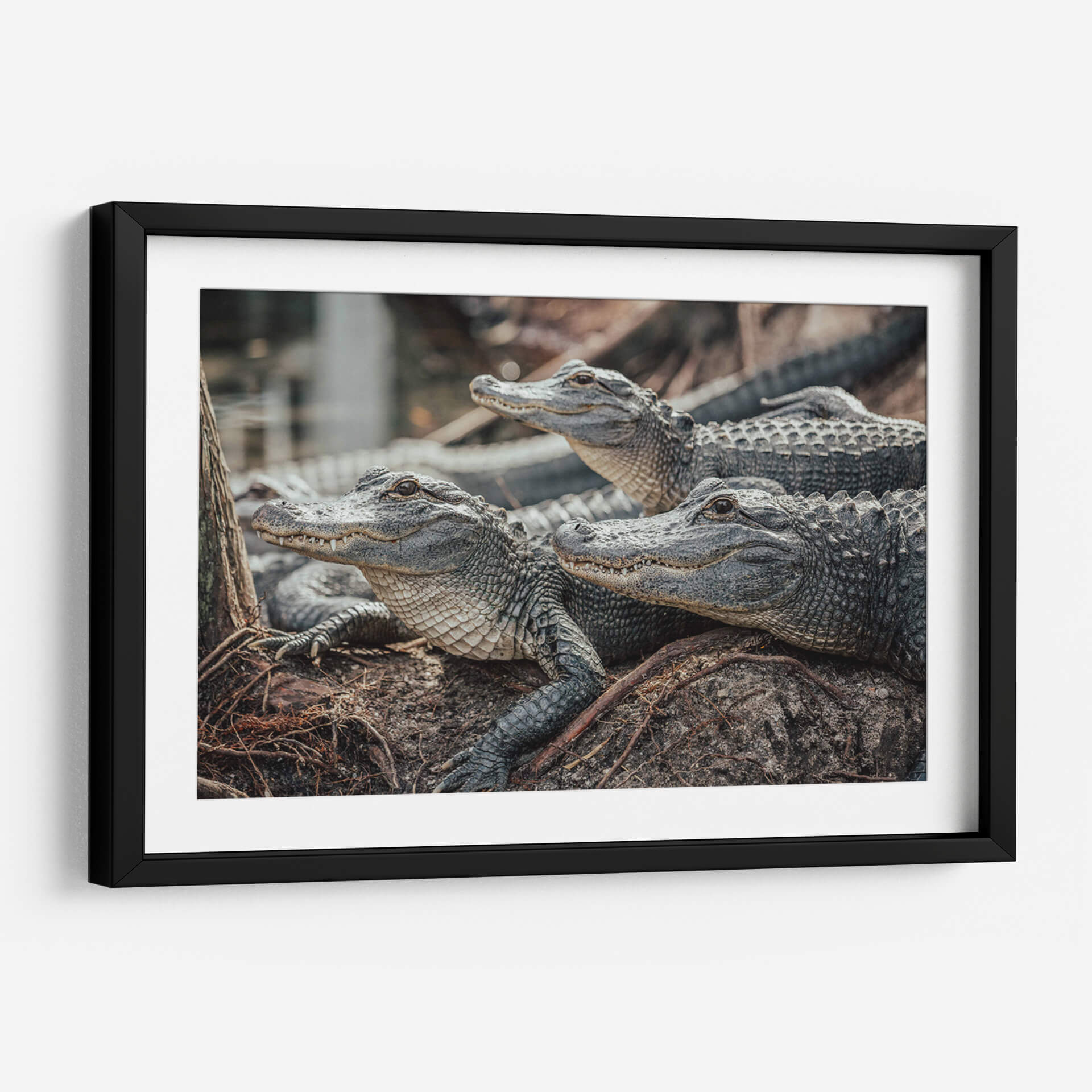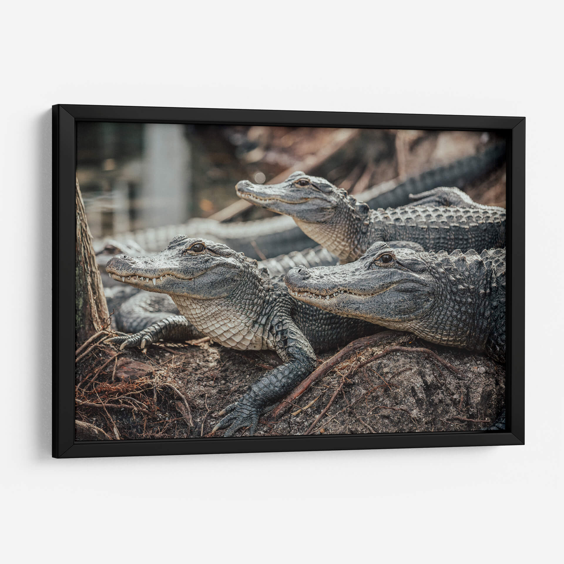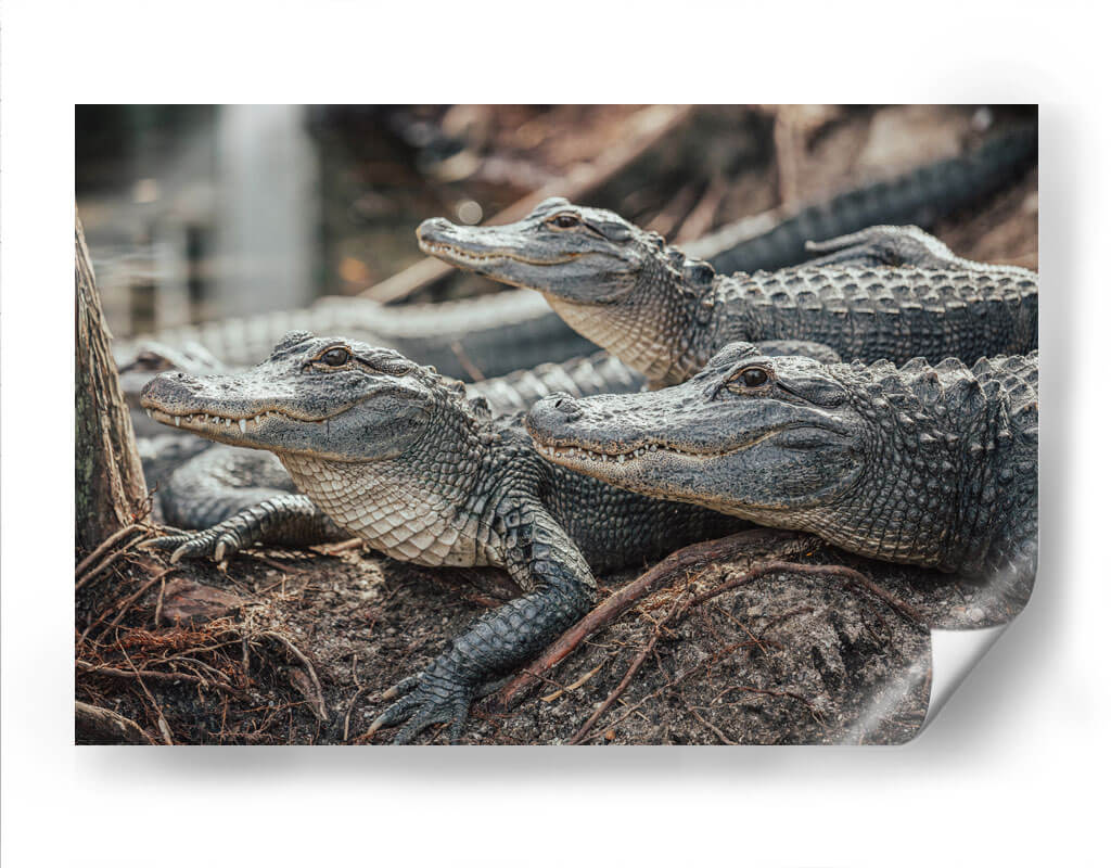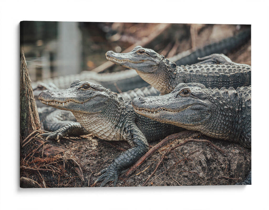 Captura la fuerza y el misterio de la naturaleza con este impresionante lienzo "Cocodrilos al Acecho". La obra presenta un primer plano íntimo de tres caimanes o cocodrilos, cuyas escamas detalladas y miradas penetrantes evocan una sensación de poder ancestral. La paleta de colores se centra en tonos tierra, grises profundos y verdes apagados, creando una atmósfera sombría y realista que transporta al espectador directamente a su hábitat natural. La composición, con los reptiles posicionados en diferentes planos y ángulos, añade profundidad y dinamismo, invitando a una contemplación pausada de su majestuosidad. Este arte de pared es perfecto para quienes buscan añadir un toque salvaje y sofisticado a su hogar u oficina, ideal para salas de estar modernas, estudios o incluso espacios de inspiración en entornos empresariales. Su realismo detallado y la presencia imponente de estos animales lo convierten en una pieza de conversación única, capaz de infundir carácter y una conexión con el reino animal en cualquier decoración.