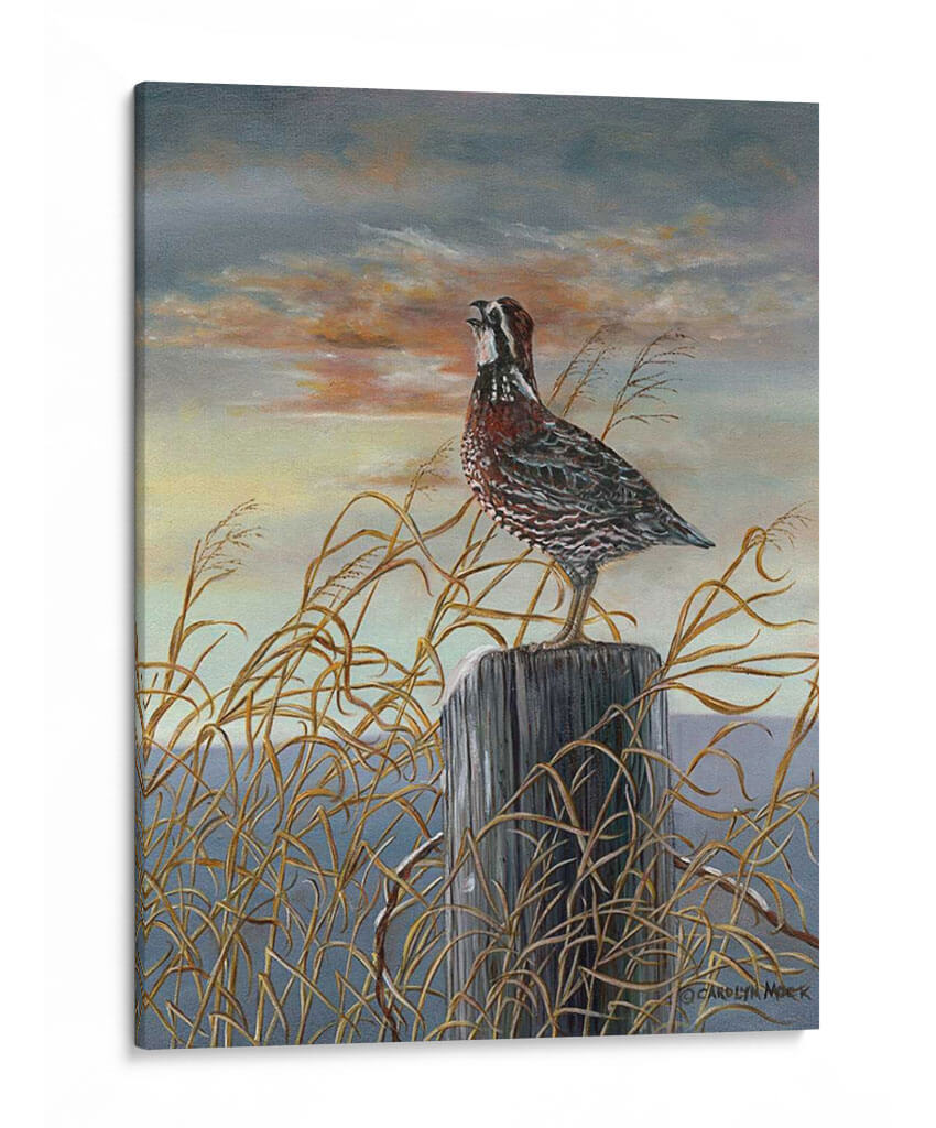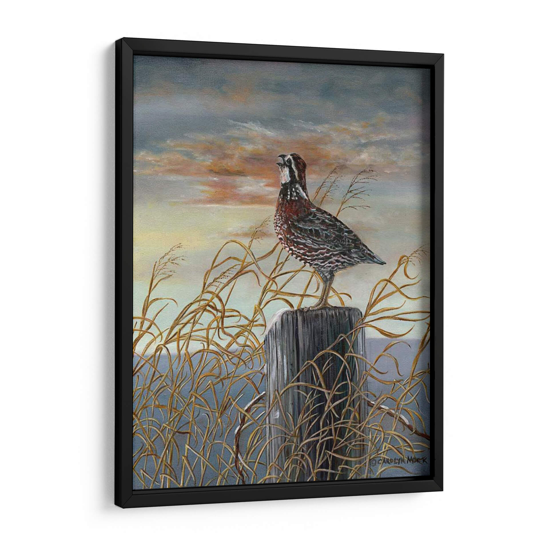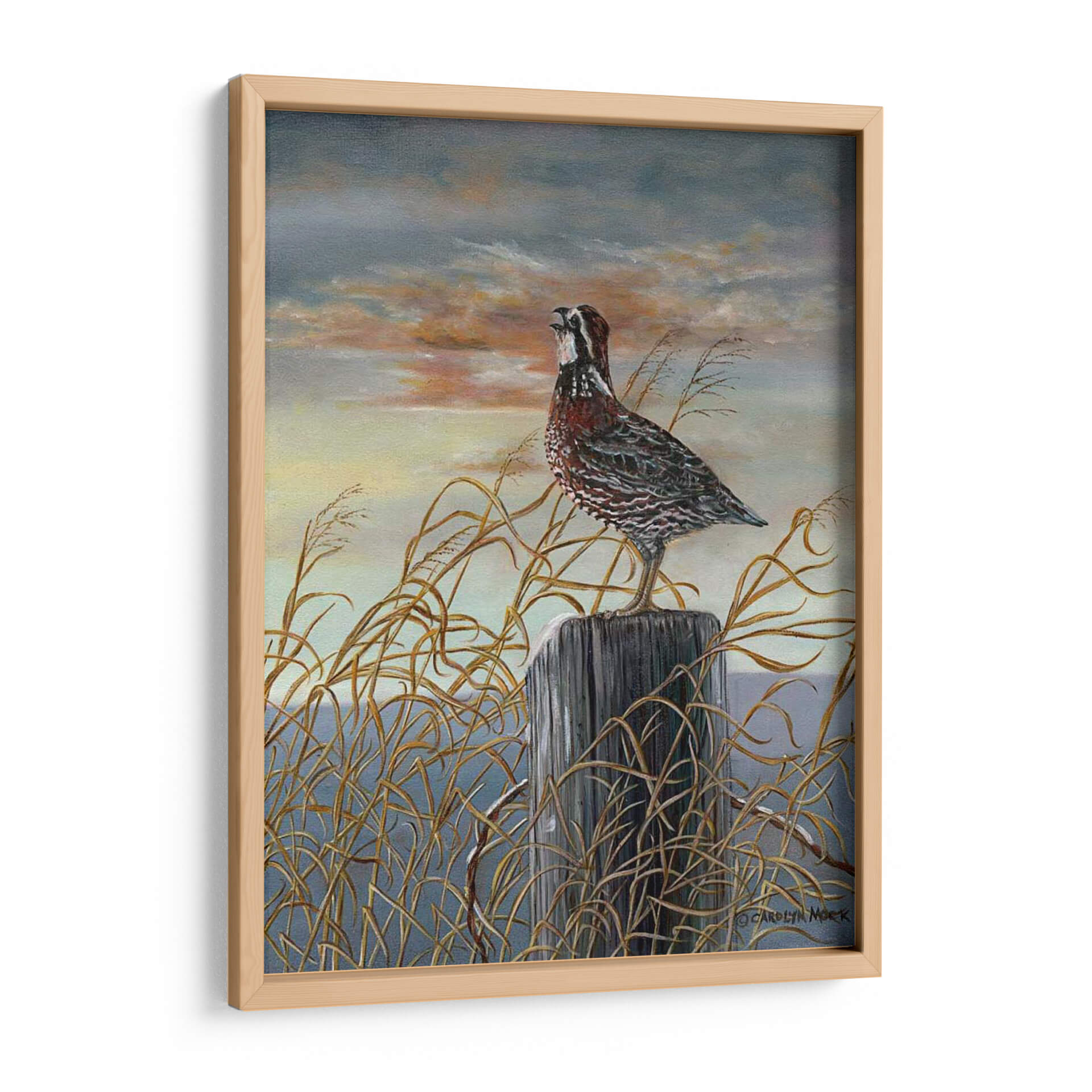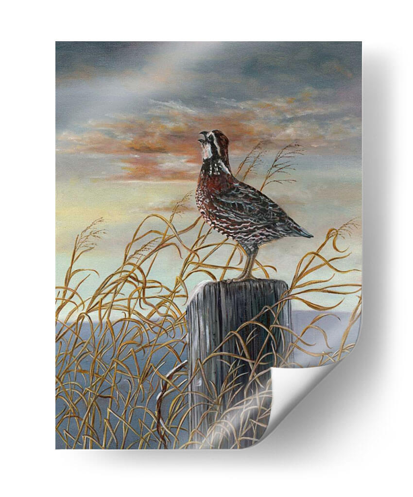 Captura la esencia de la naturaleza con este evocador cuadro decorativo que presenta una codorniz posada majestuosamente sobre un poste de madera, rodeada de pastos secos. La obra, titulada 'Codorniz En Un Post' del artista Carolyn Mock, te transporta a un paisaje sereno y campestre. La paleta de colores, dominada por tonos tierra, ocres y grises suaves con toques de azul en el fondo, crea una atmósfera de calma y contemplación, ideal para espacios que buscan un toque de tranquilidad y conexión con el entorno natural. Los detalles finos en el plumaje de la codorniz y la textura del poste de madera demuestran una técnica realista que aporta profundidad y vida a la pieza. Este cuadro decorativo es perfecto para añadir un punto focal distintivo a tu sala de estar, dormitorio o estudio, infundiendo un ambiente de paz y armonía. Su estilo realista y la temática de la vida silvestre lo convierten en una elección atemporal para amantes de la naturaleza y del arte figurativo. Integra la belleza del mundo natural en tu hogar con esta impresionante obra que invita a la reflexión y al disfrute visual.
