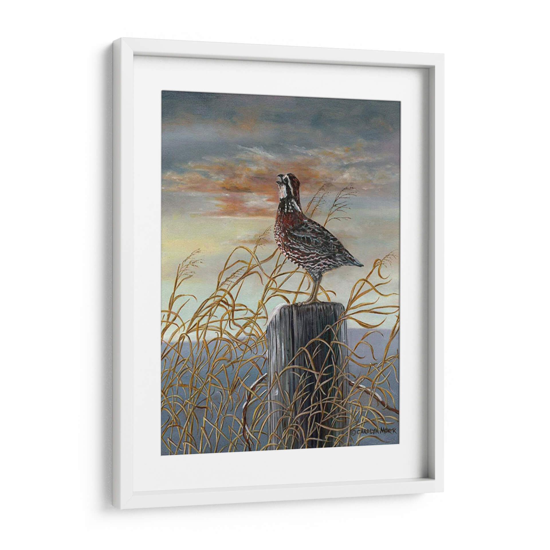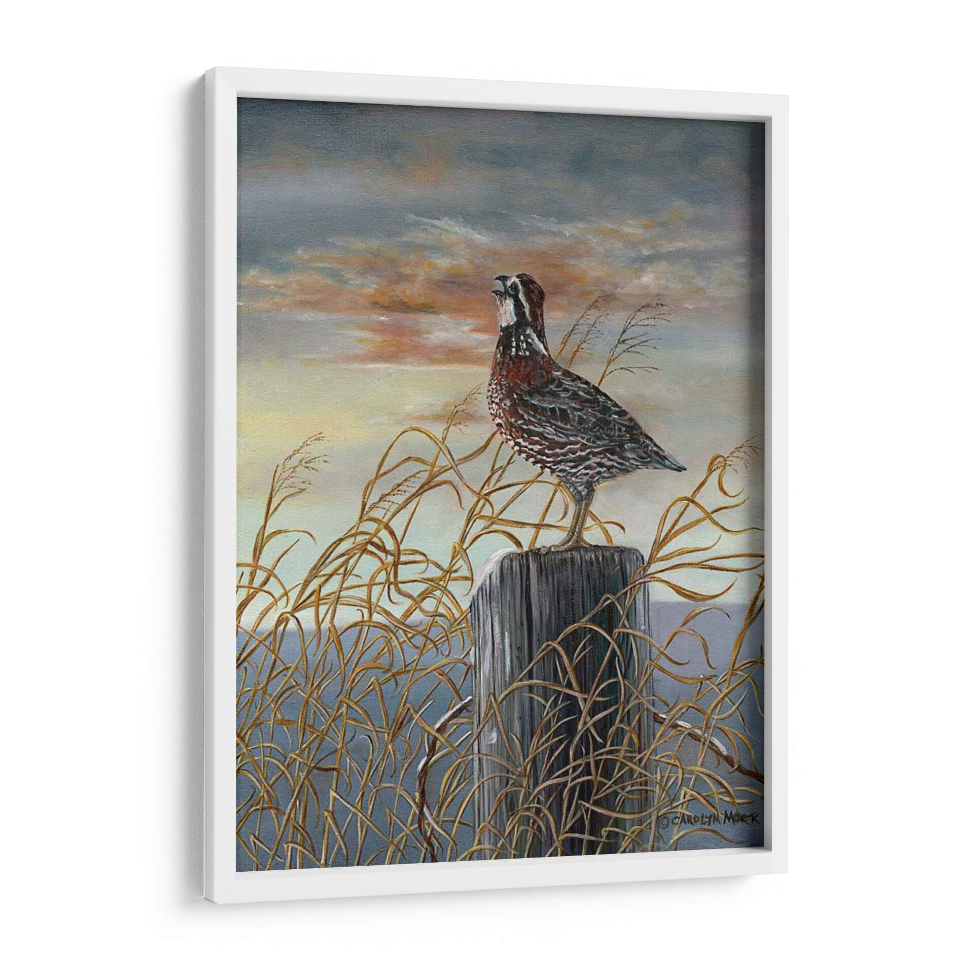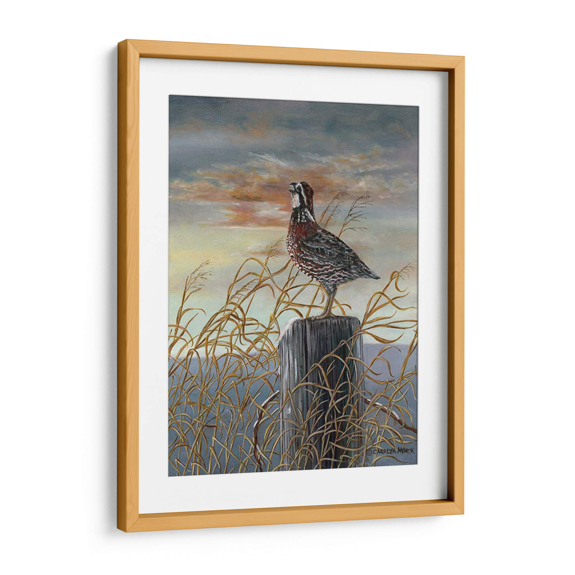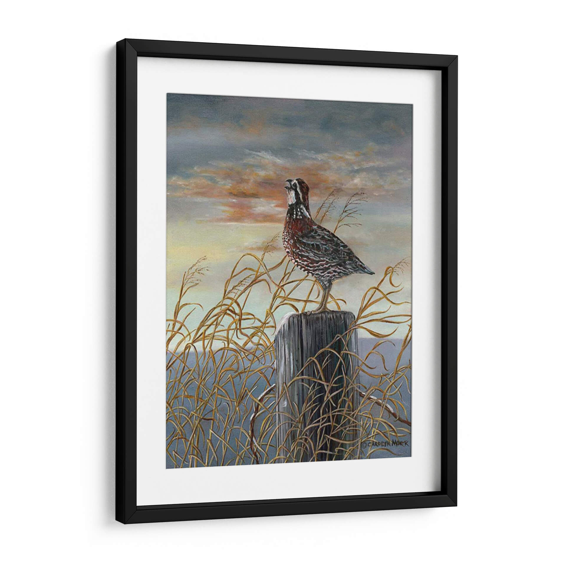 Captura la esencia de la naturaleza con este evocador cuadro decorativo que presenta una codorniz posada majestuosamente sobre un poste de madera, rodeada de pastos secos. La obra, titulada 'Codorniz En Un Post' del artista Carolyn Mock, te transporta a un paisaje sereno y campestre. La paleta de colores, dominada por tonos tierra, ocres y grises suaves con toques de azul en el fondo, crea una atmósfera de calma y contemplación, ideal para espacios que buscan un toque de tranquilidad y conexión con el entorno natural. Los detalles finos en el plumaje de la codorniz y la textura del poste de madera demuestran una técnica realista que aporta profundidad y vida a la pieza. Este cuadro decorativo es perfecto para añadir un punto focal distintivo a tu sala de estar, dormitorio o estudio, infundiendo un ambiente de paz y armonía. Su estilo realista y la temática de la vida silvestre lo convierten en una elección atemporal para amantes de la naturaleza y del arte figurativo. Integra la belleza del mundo natural en tu hogar con esta impresionante obra que invita a la reflexión y al disfrute visual.