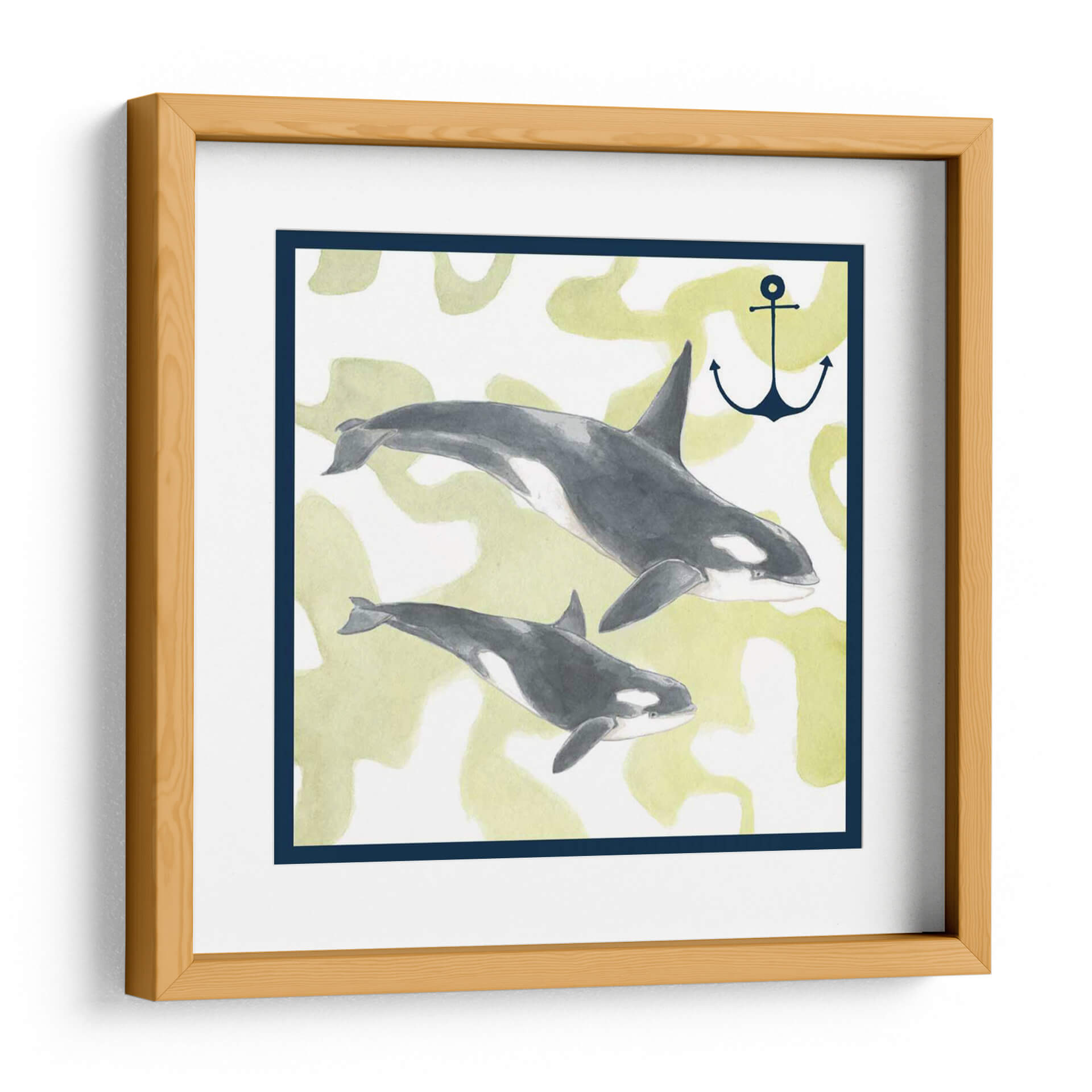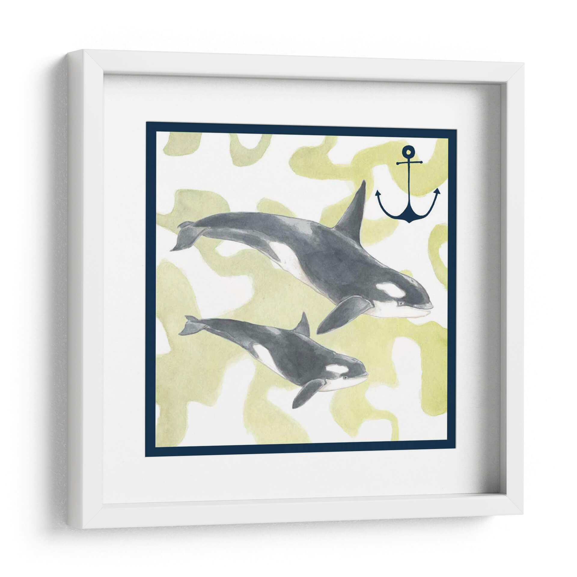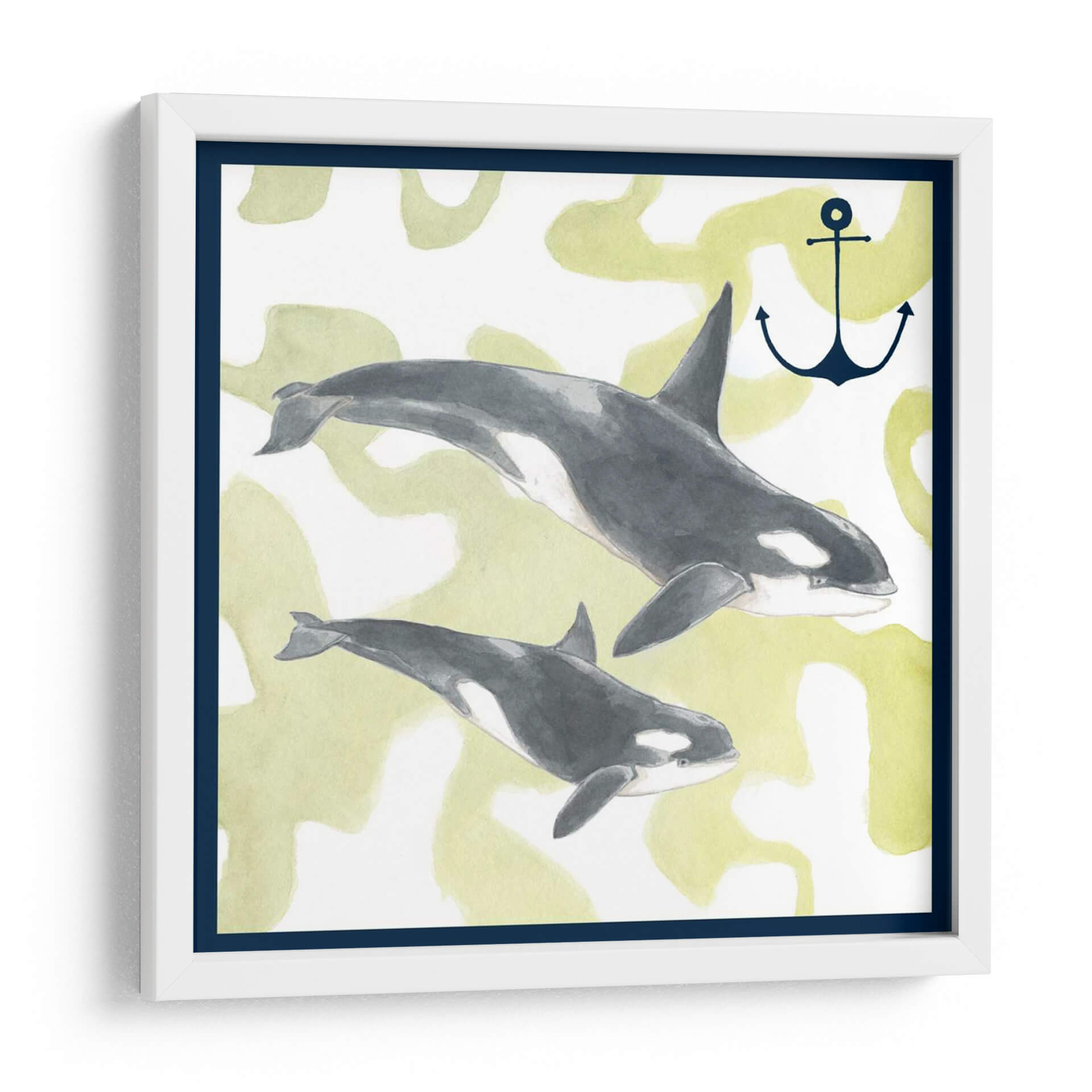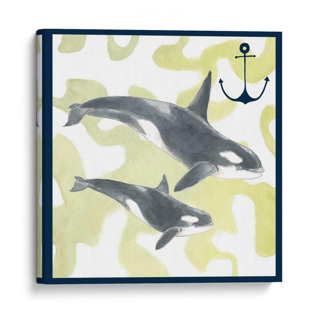 Sumérgete en la serena belleza del océano con "Composición De Ballenas Iii", una obra de arte que captura la majestuosidad de dos orcas en su hábitat natural. La artista Megan Meagher nos presenta una composición delicada y evocadora, donde los tonos grises profundos y blancos de las ballenas contrastan sutilmente con un fondo texturizado en suaves tonos verdes y amarillos, reminiscentes de la luz filtrándose a través del agua. Un ancla náutica, representada en un azul marino profundo, añade un toque de simbolismo marino y aventura. Esta pieza, ejecutada con una técnica que evoca la acuarela, transmite una sensación de calma y movimiento fluido, ideal para quienes buscan añadir un elemento de la naturaleza y la tranquilidad a su hogar u oficina. "Composición De Ballenas Iii" es más que un simple cuadro decorativo; es una ventana a la vida marina que invita a la contemplación y a la conexión con el mundo natural, perfecta para salones, dormitorios o estudios que deseen un aire sofisticado y sereno.