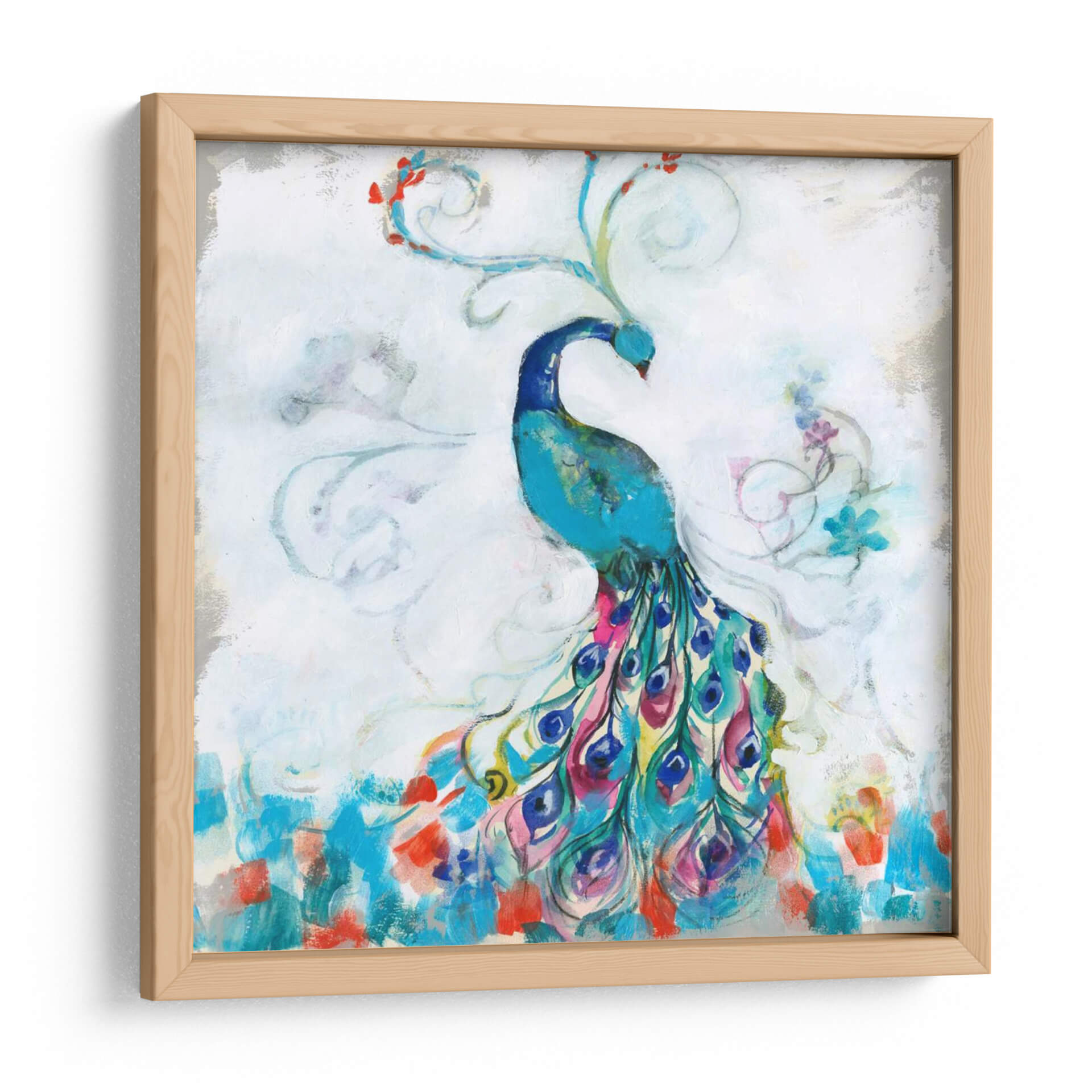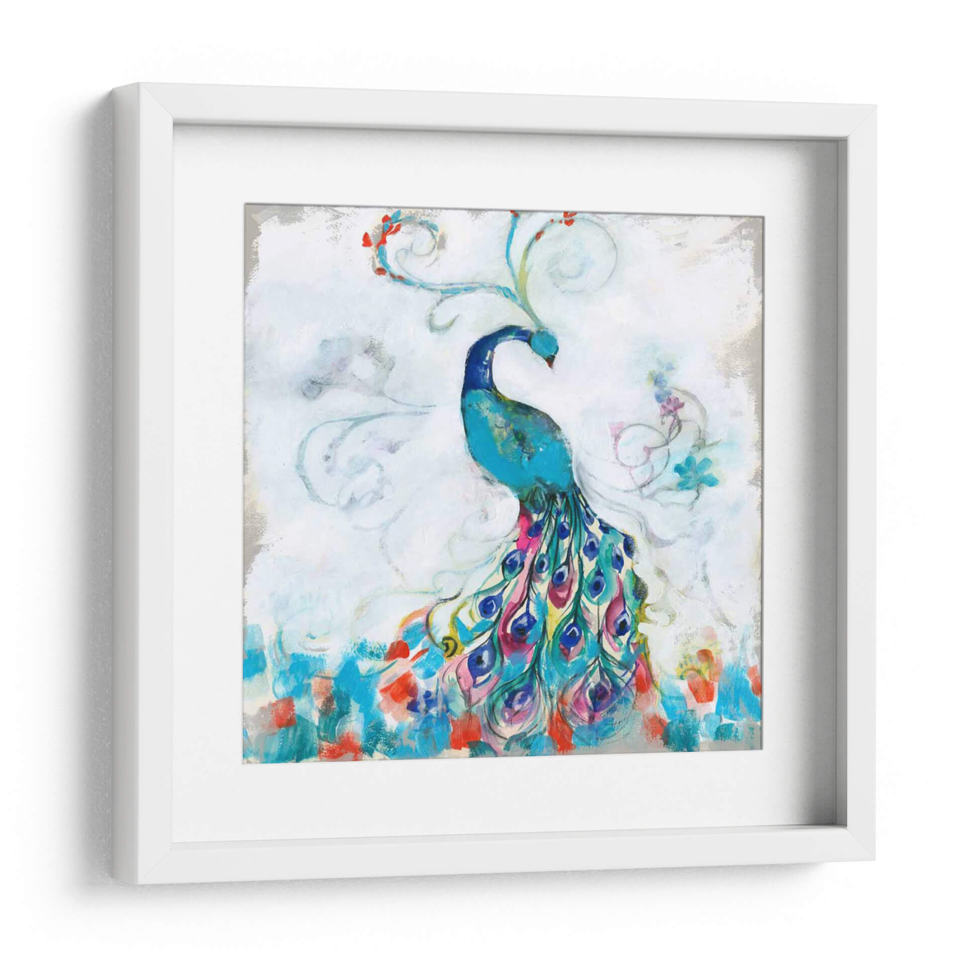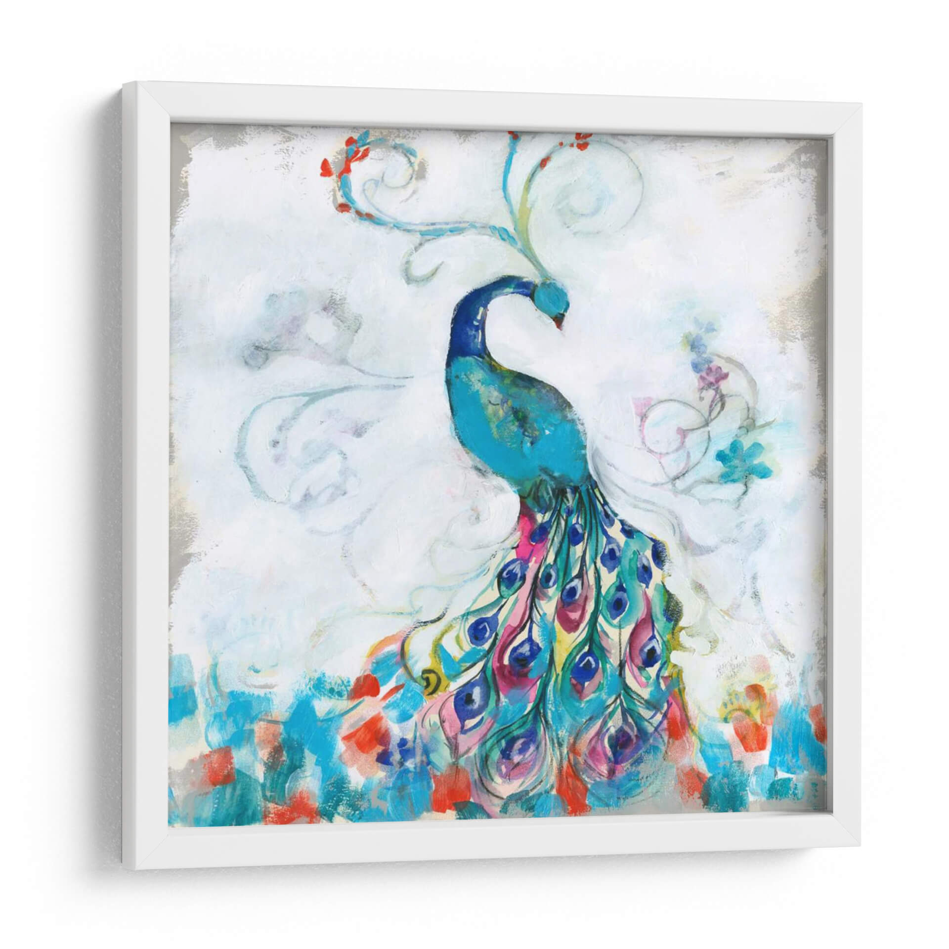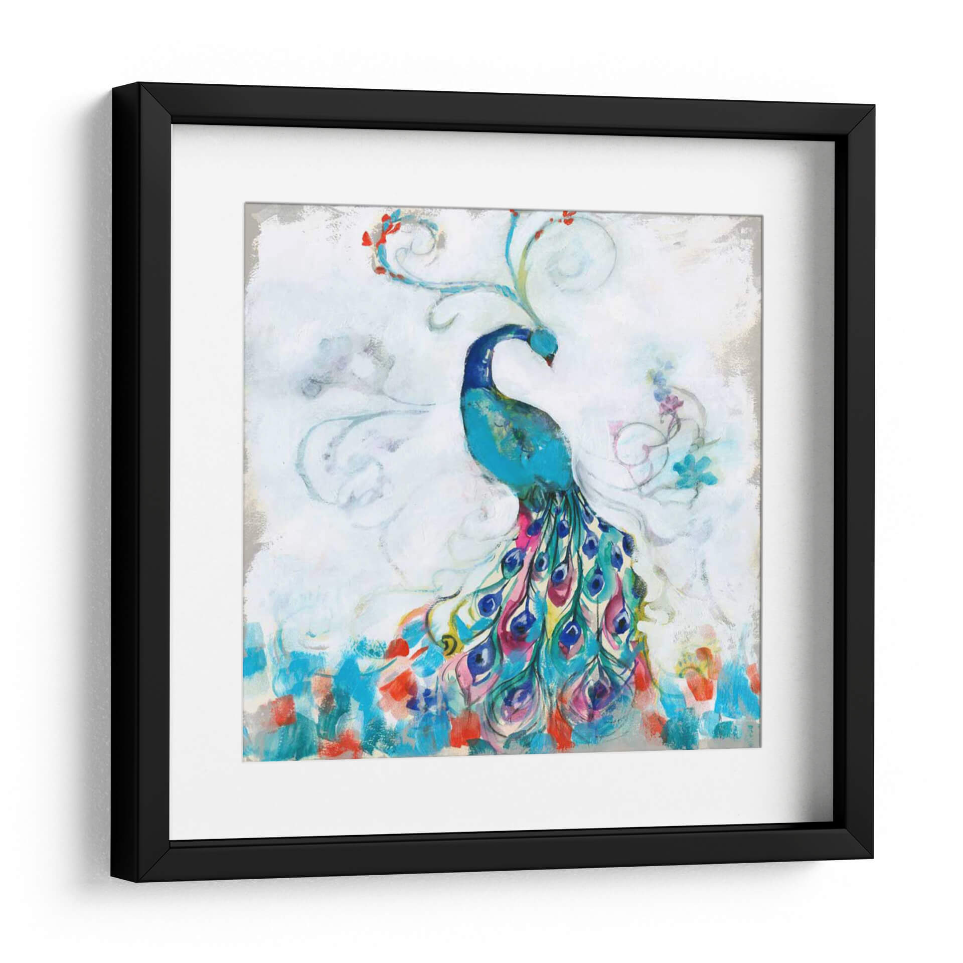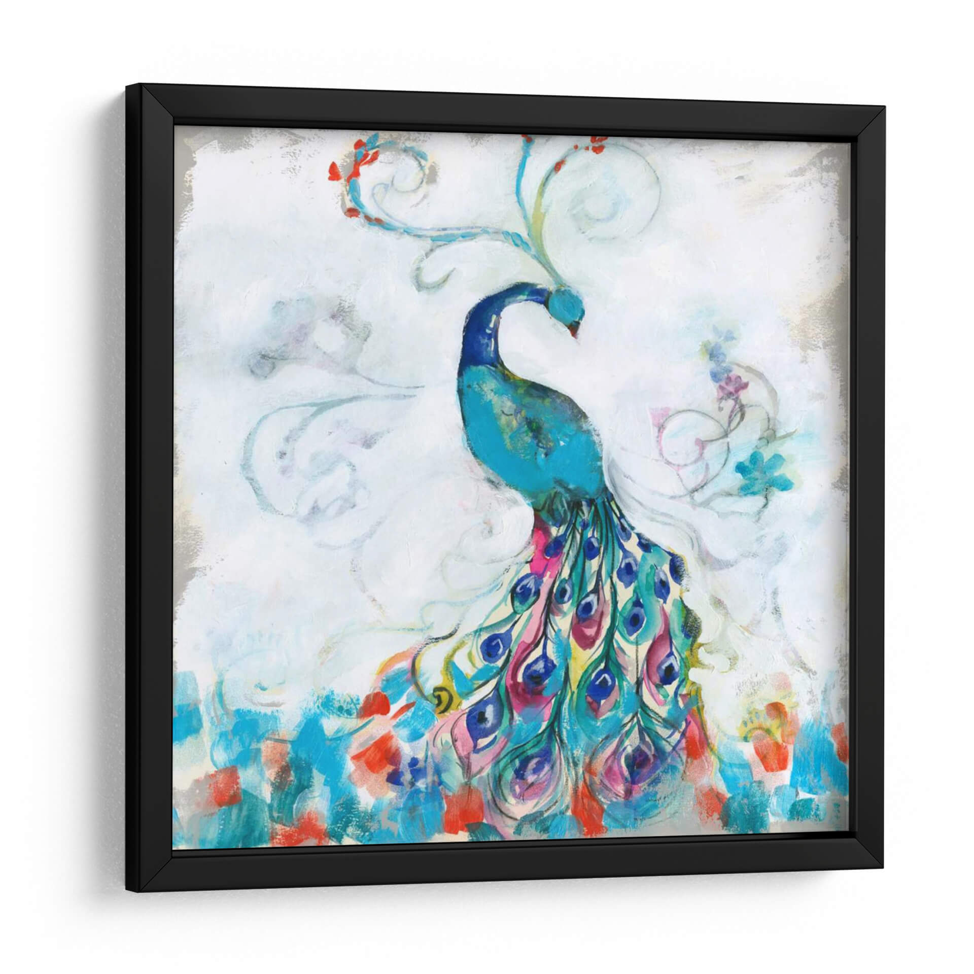 Embellece tu espacio con la vibrante obra "Confetti Peacock I" de Jennifer Goldberger. Este cautivador cuadro decorativo presenta un majestuoso pavo real en tonos azules intensos, con una cola espectacular que explota en una cascada de colores vivos como fucsia, turquesa, amarillo y carmesí. Las pinceladas sueltas y gestuales crean una sensación de movimiento y energía, mientras que los detalles florales y los remolinos etéreos añaden un toque de fantasía y delicadeza. El fondo, con sus tonos blancos y grises texturizados, permite que el pavo real sea el protagonista indiscutible, creando un contraste visual impactante. "Confetti Peacock I" es más que una simple decoración; es una celebración de la belleza natural y la exuberancia. Su estilo contemporáneo y su paleta de colores audaz lo convierten en la pieza ideal para añadir un punto focal de alegría y sofisticación a cualquier sala de estar, comedor o dormitorio. Transforma tu hogar en una galería de arte personal con esta pieza única que evoca admiración y vitalidad. Es perfecto para quienes buscan arte con personalidad y un toque de color.