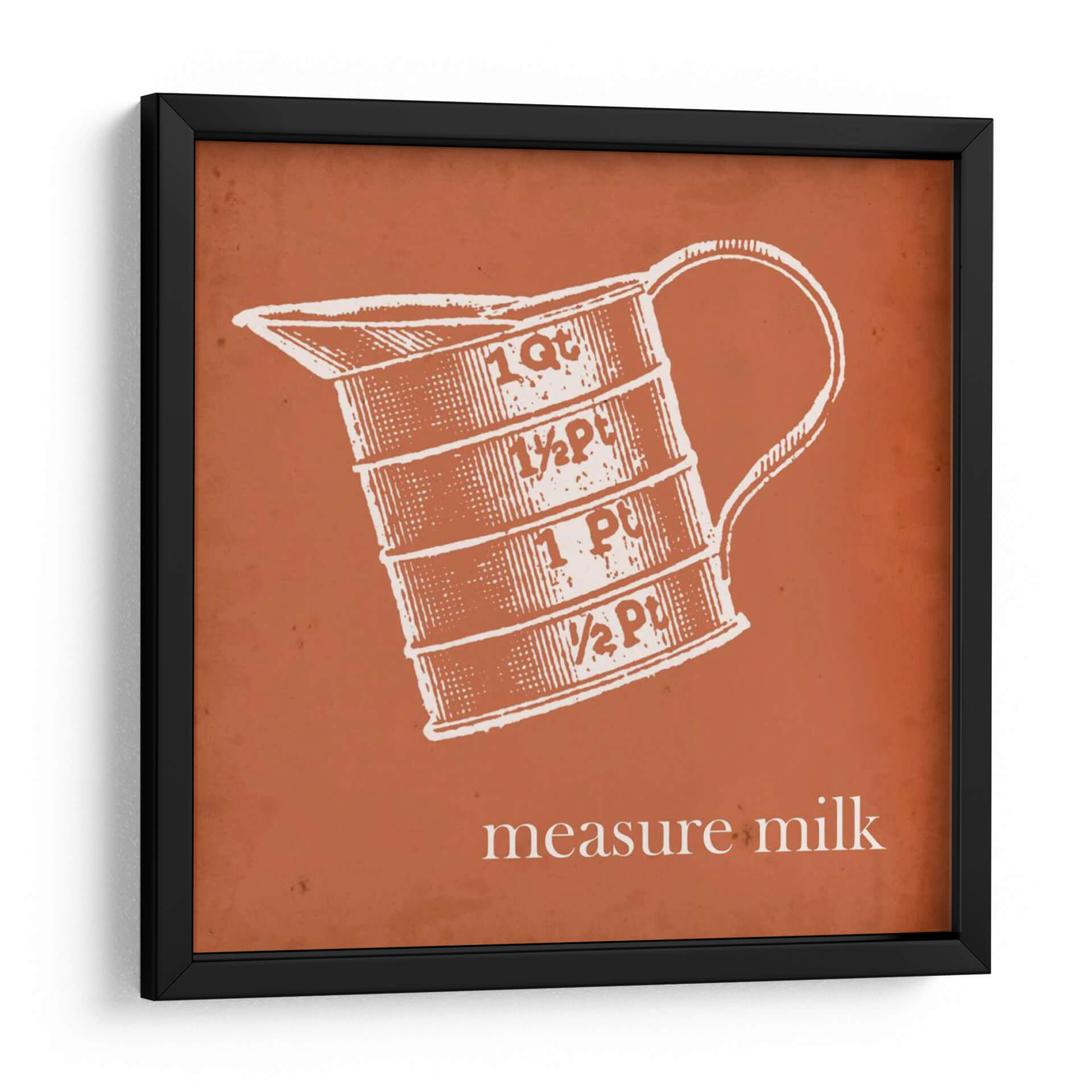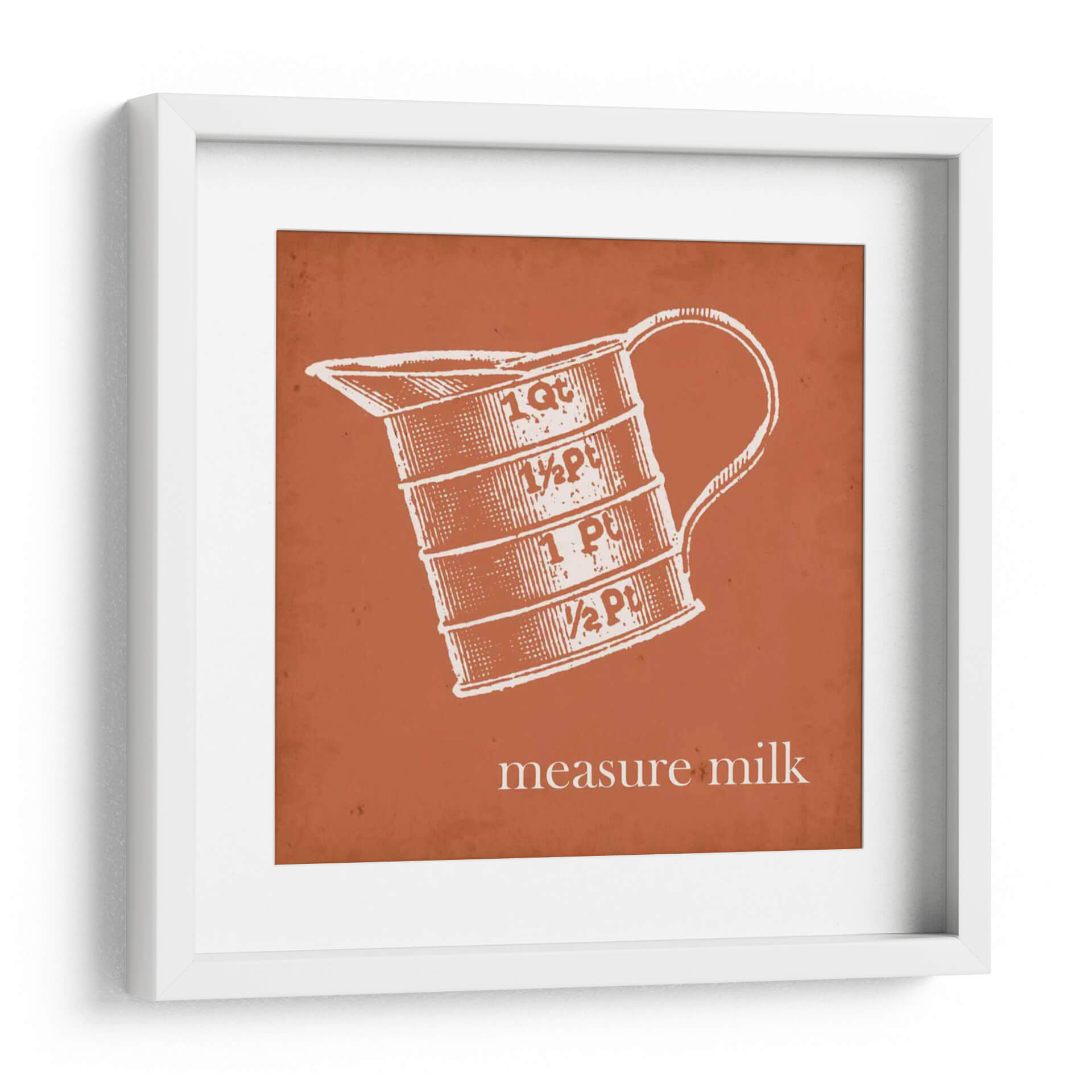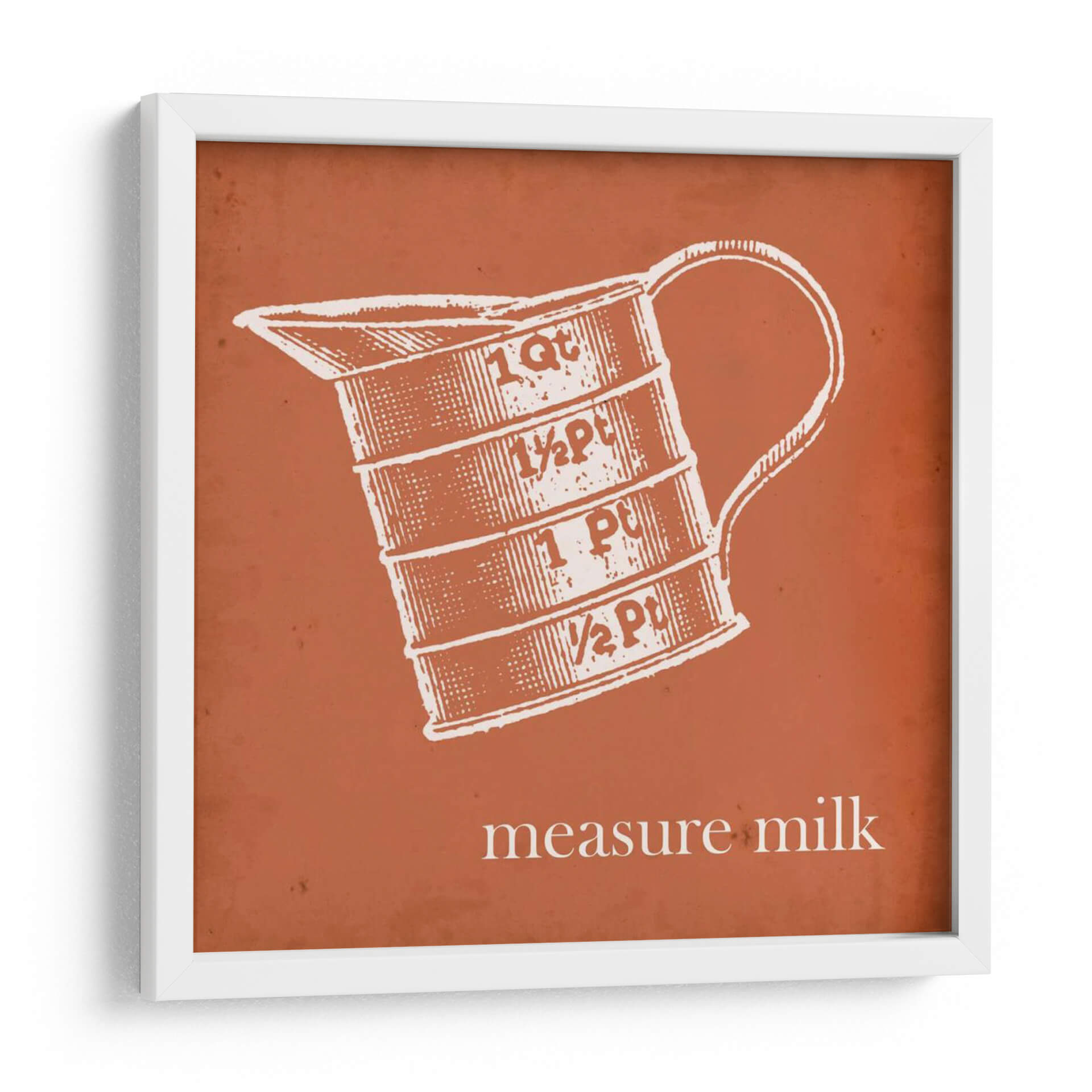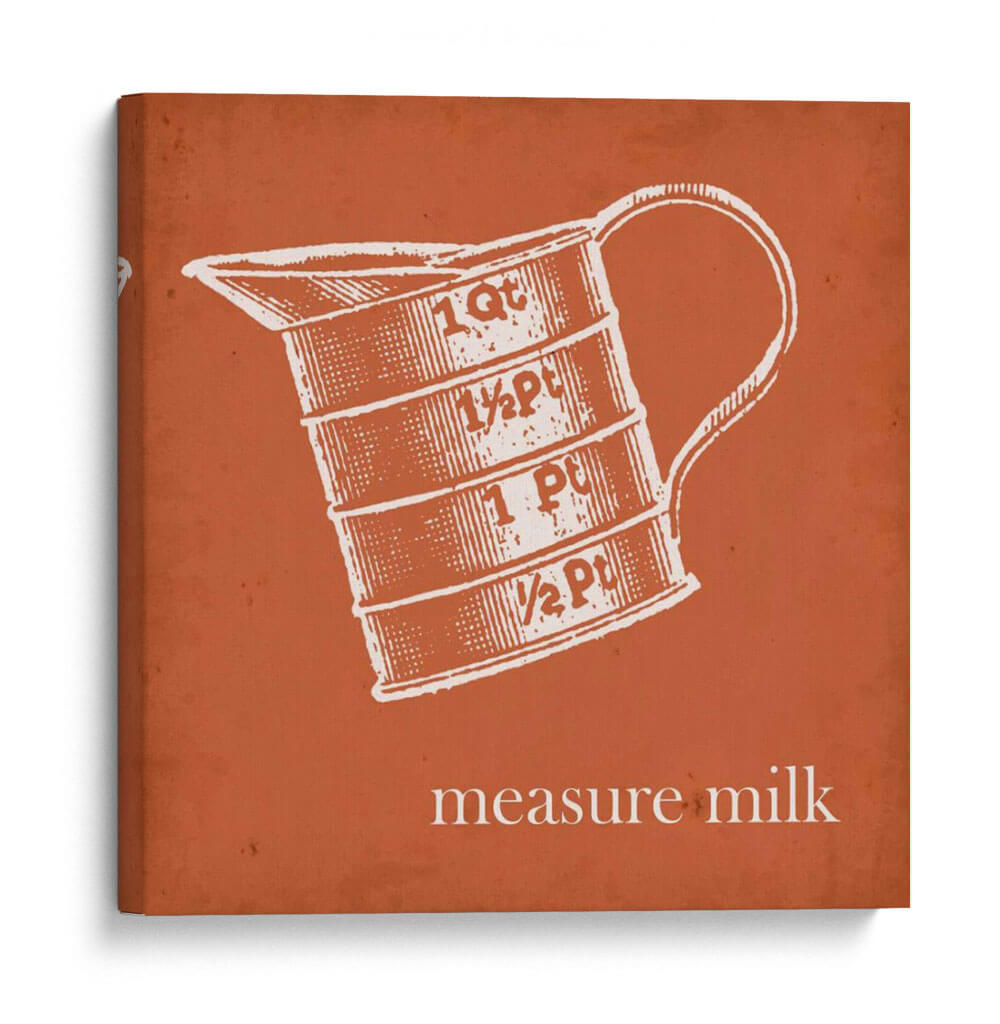 Transforma tu cocina o comedor con este cautivador cuadro decorativo de Jarman Fagalde, "Cottate Cocina Iv". Esta obra de arte, que presenta una ilustración de estilo vintage de una jarra medidora con inscripciones de "1 Qt", "½ Pt", "1 Pt" y "½ Pt", evoca una sensación de nostalgia y encanto rústico. La paleta de colores, dominada por un vibrante tono terracota de fondo y un detallado grabado en blanco de la jarra, crea un contraste llamativo y acogedor. El estilo gráfico y la composición centrada en el objeto lo convierten en un punto focal ideal para espacios de inspiración campestre o retro. La frase "measure milk" añade un toque de autenticidad y funcionalidad, rememorando tiempos pasados en la cocina. Este cuadro es perfecto para añadir personalidad a tu hogar, ya sea en la cocina, el comedor o incluso en un estudio de diseño. Su diseño limpio y su temática cotidiana lo hacen versátil, complementando una variedad de estilos decorativos, desde el farmhouse moderno hasta el ecléctico.
