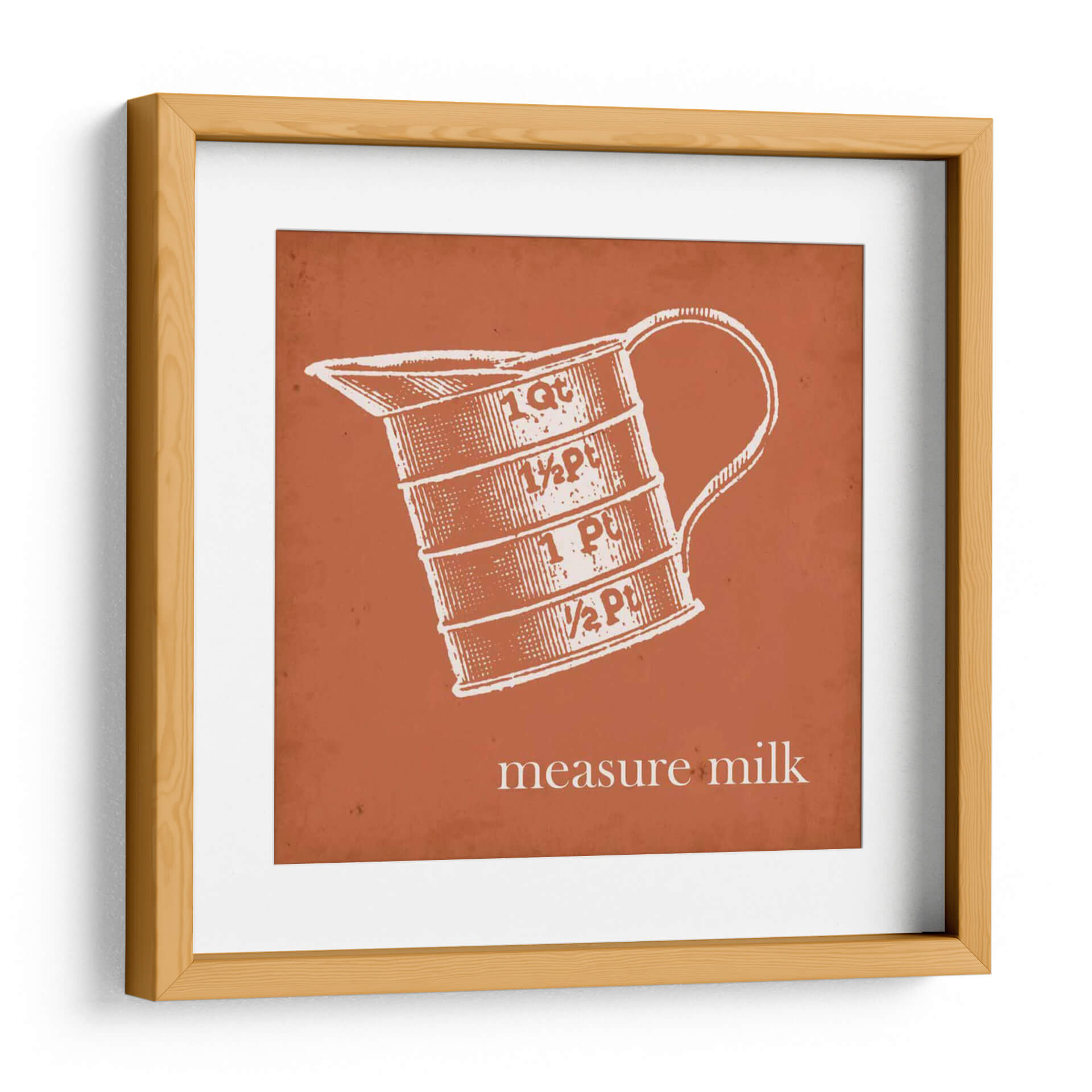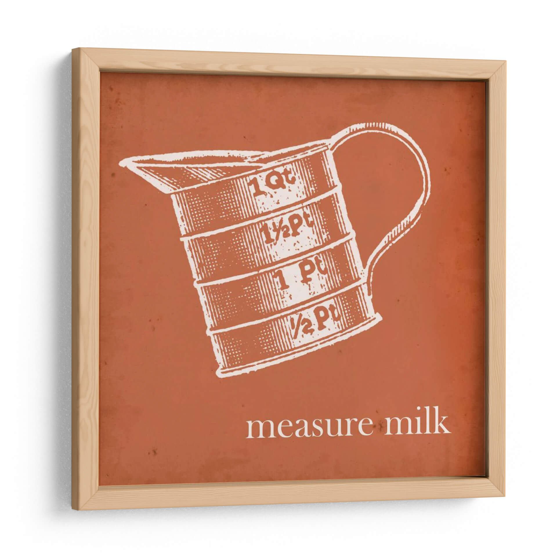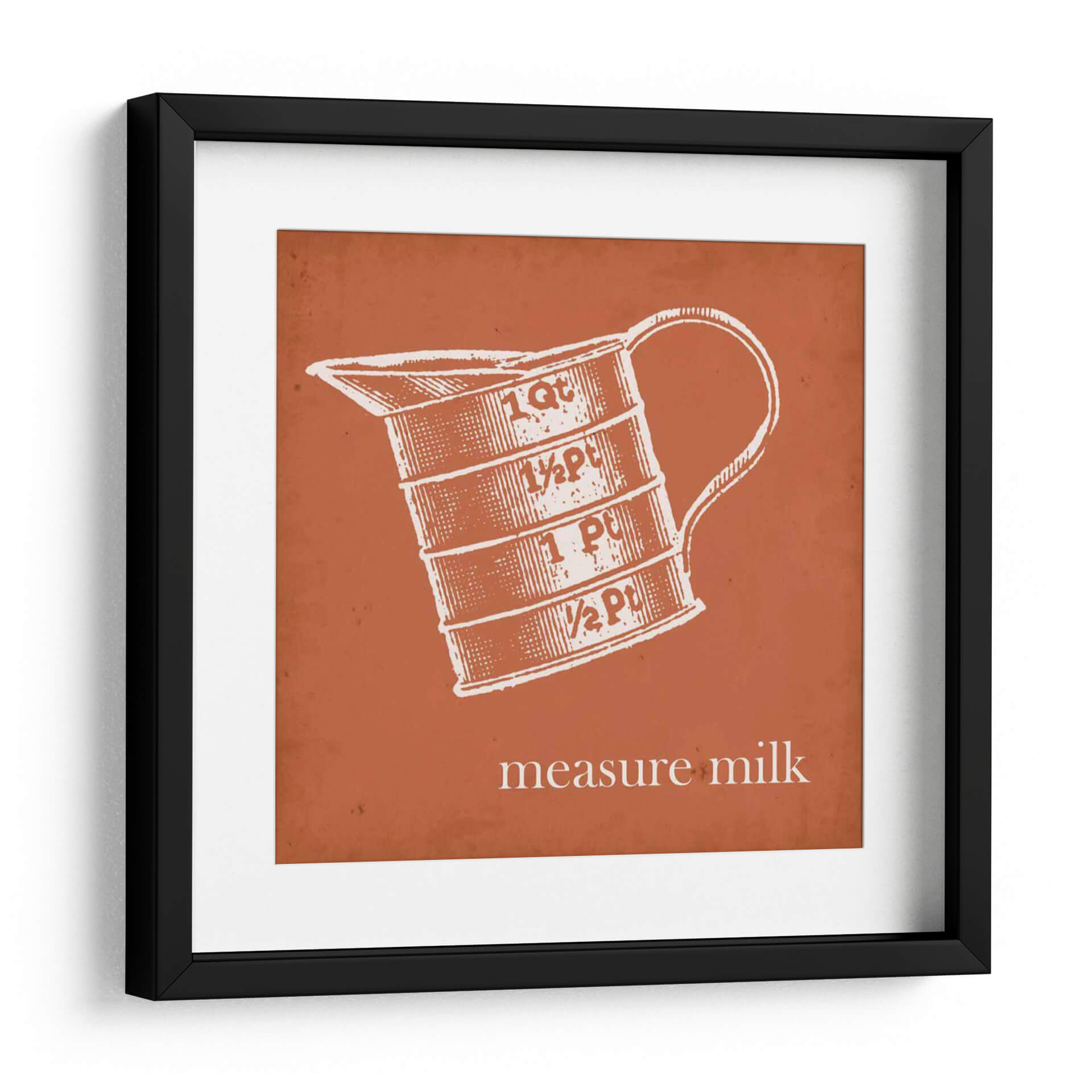 Transforma tu cocina o comedor con este cautivador cuadro decorativo de Jarman Fagalde, "Cottate Cocina Iv". Esta obra de arte, que presenta una ilustración de estilo vintage de una jarra medidora con inscripciones de "1 Qt", "½ Pt", "1 Pt" y "½ Pt", evoca una sensación de nostalgia y encanto rústico. La paleta de colores, dominada por un vibrante tono terracota de fondo y un detallado grabado en blanco de la jarra, crea un contraste llamativo y acogedor. El estilo gráfico y la composición centrada en el objeto lo convierten en un punto focal ideal para espacios de inspiración campestre o retro. La frase "measure milk" añade un toque de autenticidad y funcionalidad, rememorando tiempos pasados en la cocina. Este cuadro es perfecto para añadir personalidad a tu hogar, ya sea en la cocina, el comedor o incluso en un estudio de diseño. Su diseño limpio y su temática cotidiana lo hacen versátil, complementando una variedad de estilos decorativos, desde el farmhouse moderno hasta el ecléctico.