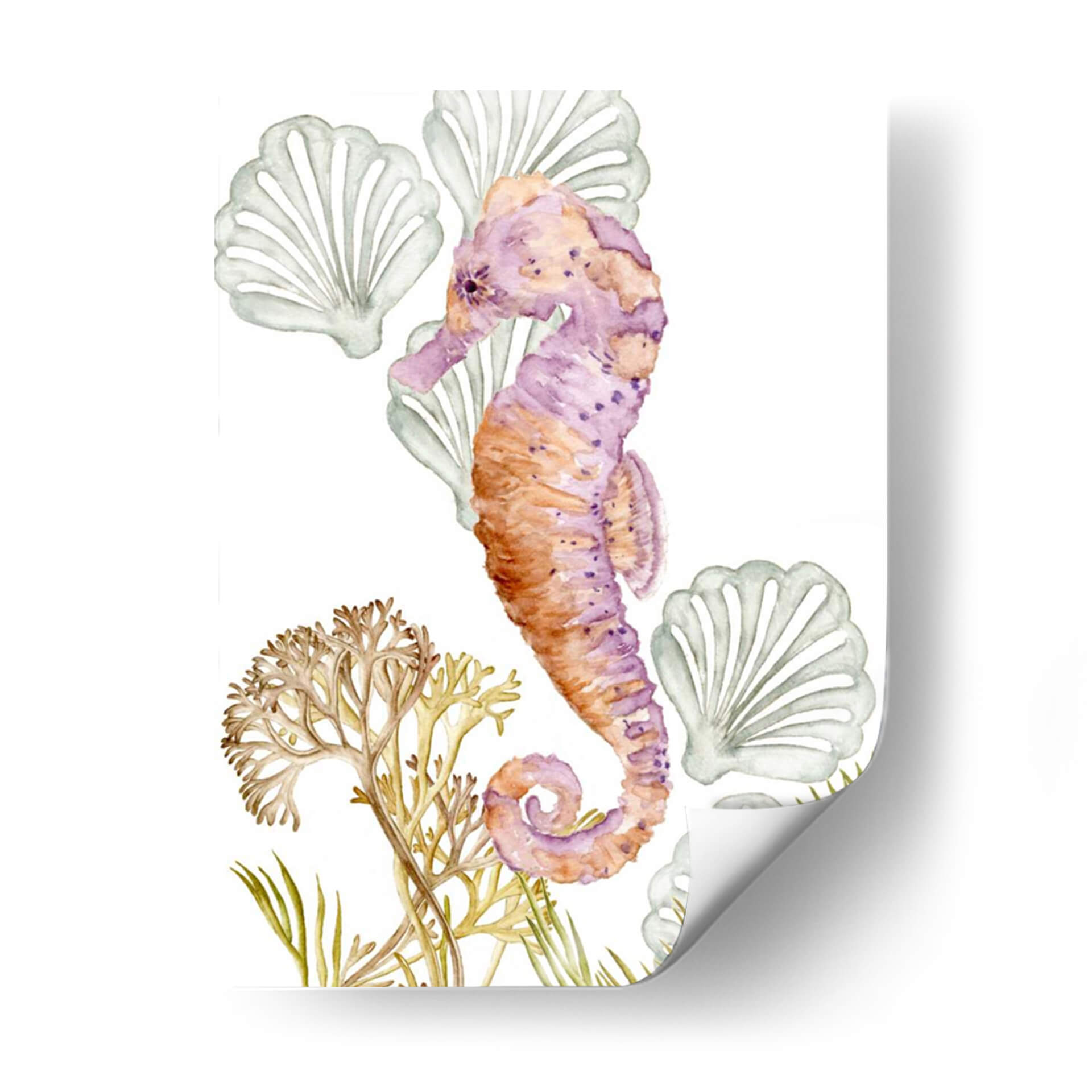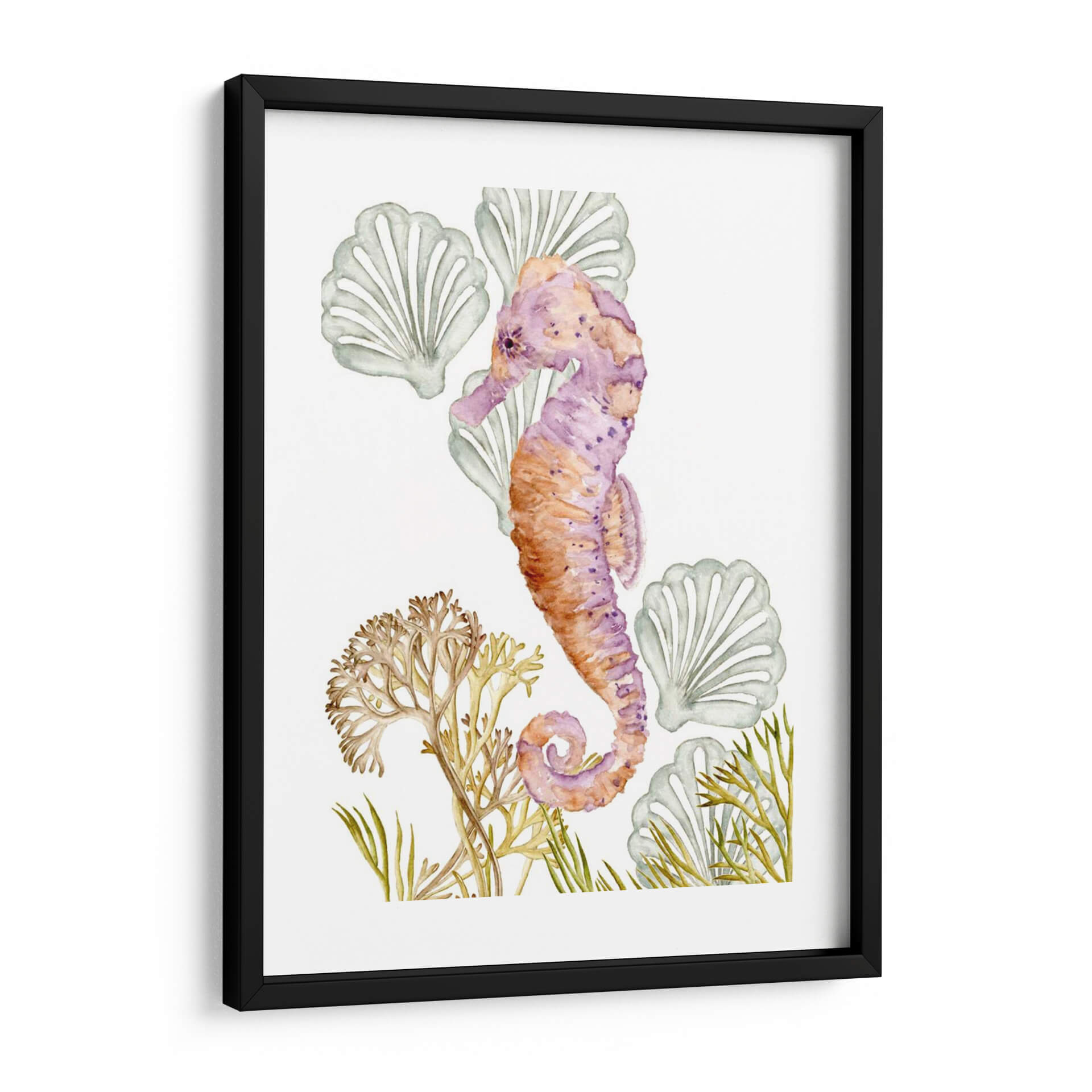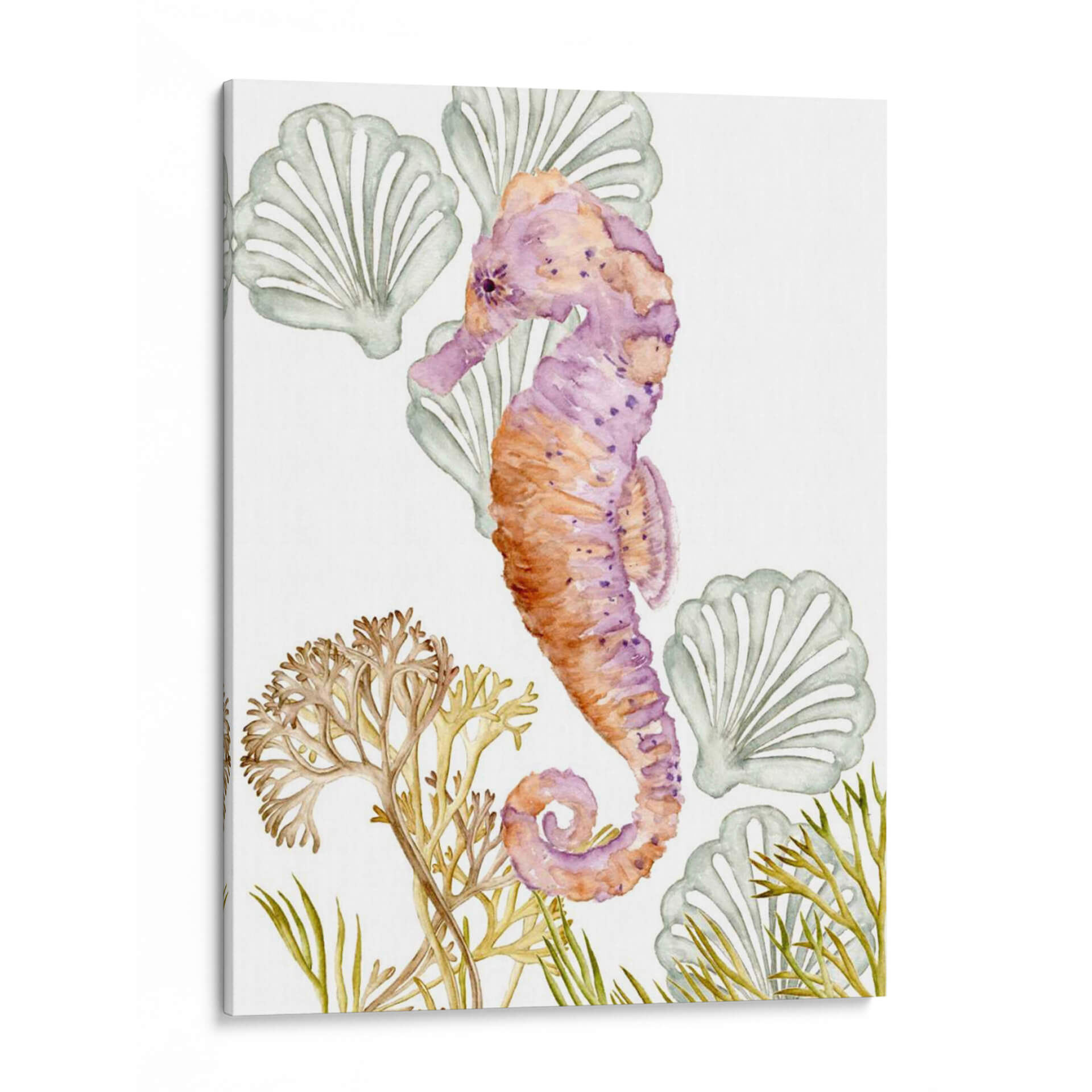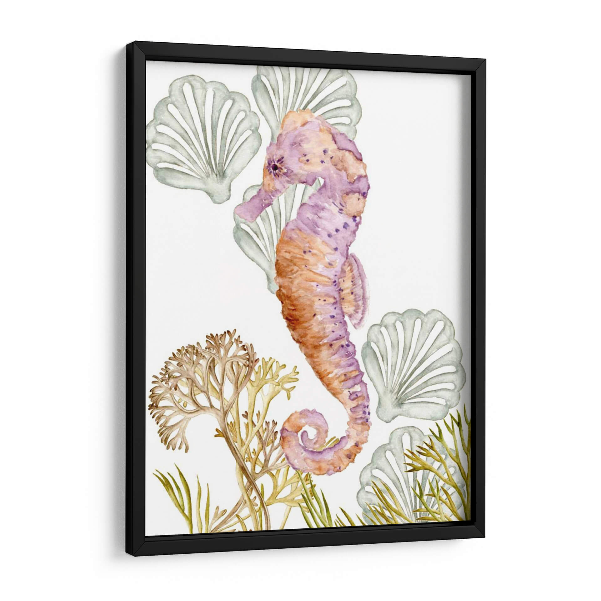 Sumérgete en la serena belleza del océano con "Criaturas Submarinas II", una cautivadora obra de arte de Melissa Wang. Esta pieza, ejecutada con la delicadeza de la acuarela, presenta un hipnótico caballito de mar en tonos vibrantes de púrpura y naranja, adornado con sutiles manchas que le otorgan profundidad y carácter. Alrededor de la figura principal, encontramos formaciones marinas estilizadas que evocan la tranquilidad de las profundidades, con delicadas algas y conchas marinas que completan la composición. La paleta de colores, que transita entre los tonos cálidos del coral y los fríos del lavanda y el verde agua, crea una atmósfera de calma y armonía, perfecta para espacios que buscan un toque de serenidad y conexión con la naturaleza marina. Su estilo acuarela, con pinceladas suaves y transparencias, aporta una sensación etérea y soñadora. Este cuadro decorativo es ideal para añadir un punto focal de color y elegancia a cualquier habitación, desde un sereno dormitorio hasta una luminosa sala de estar o una inspiradora oficina. "Criaturas Submarinas II" no es solo una decoración, es una invitación a la contemplación y al bienestar, aportando la frescura y la magia del mundo submarino a tu hogar.