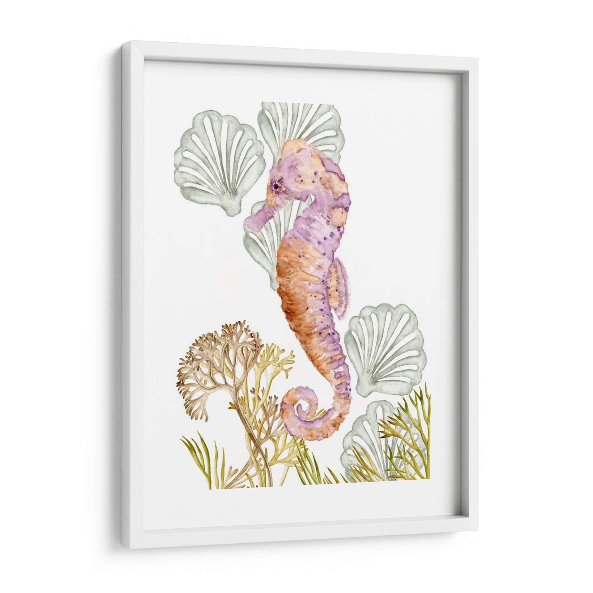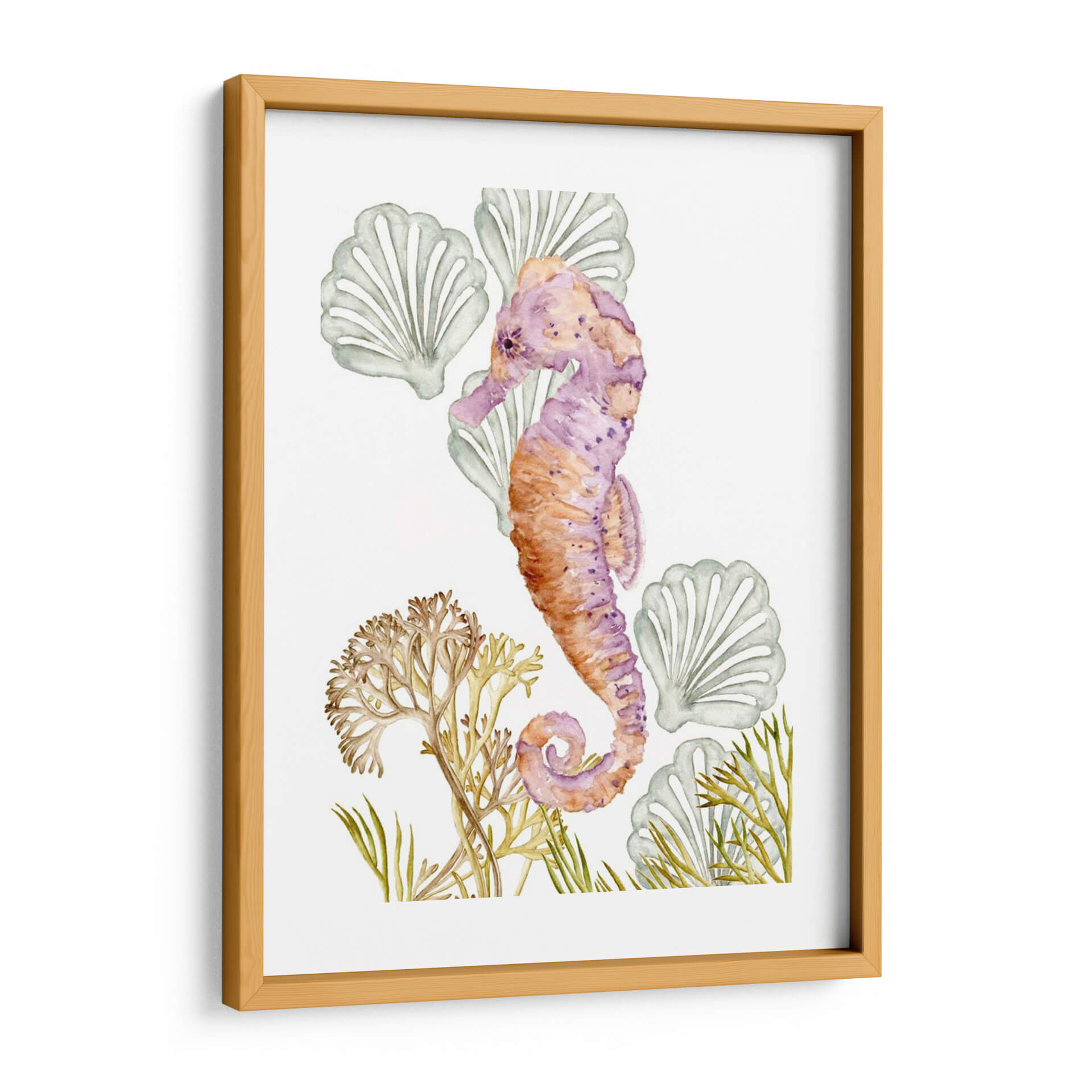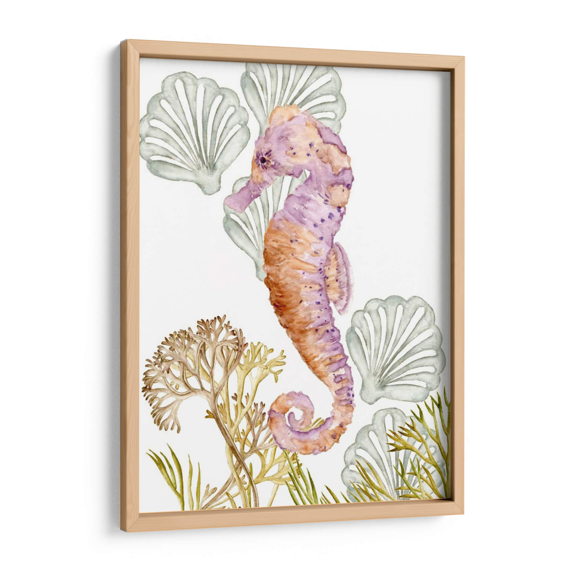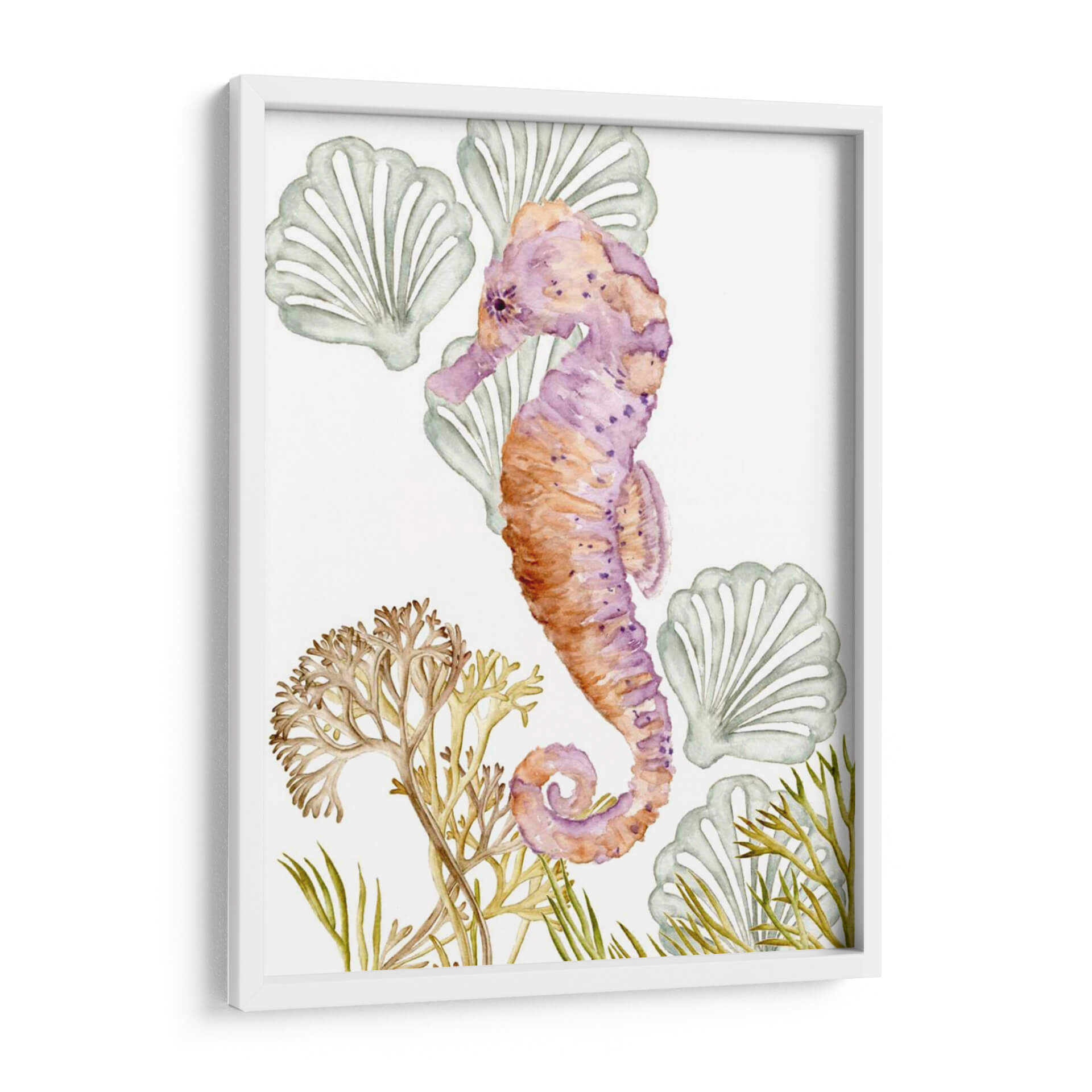Sumérgete en la serena belleza del océano con "Criaturas Submarinas II", una cautivadora obra de arte de Melissa Wang. Esta pieza, ejecutada con la delicadeza de la acuarela, presenta un hipnótico caballito de mar en tonos vibrantes de púrpura y naranja, adornado con sutiles manchas que le otorgan profundidad y carácter. Alrededor de la figura principal, encontramos formaciones marinas estilizadas que evocan la tranquilidad de las profundidades, con delicadas algas y conchas marinas que completan la composición. La paleta de colores, que transita entre los tonos cálidos del coral y los fríos del lavanda y el verde agua, crea una atmósfera de calma y armonía, perfecta para espacios que buscan un toque de serenidad y conexión con la naturaleza marina. Su estilo acuarela, con pinceladas suaves y transparencias, aporta una sensación etérea y soñadora. Este cuadro decorativo es ideal para añadir un punto focal de color y elegancia a cualquier habitación, desde un sereno dormitorio hasta una luminosa sala de estar o una inspiradora oficina. "Criaturas Submarinas II" no es solo una decoración, es una invitación a la contemplación y al bienestar, aportando la frescura y la magia del mundo submarino a tu hogar.
