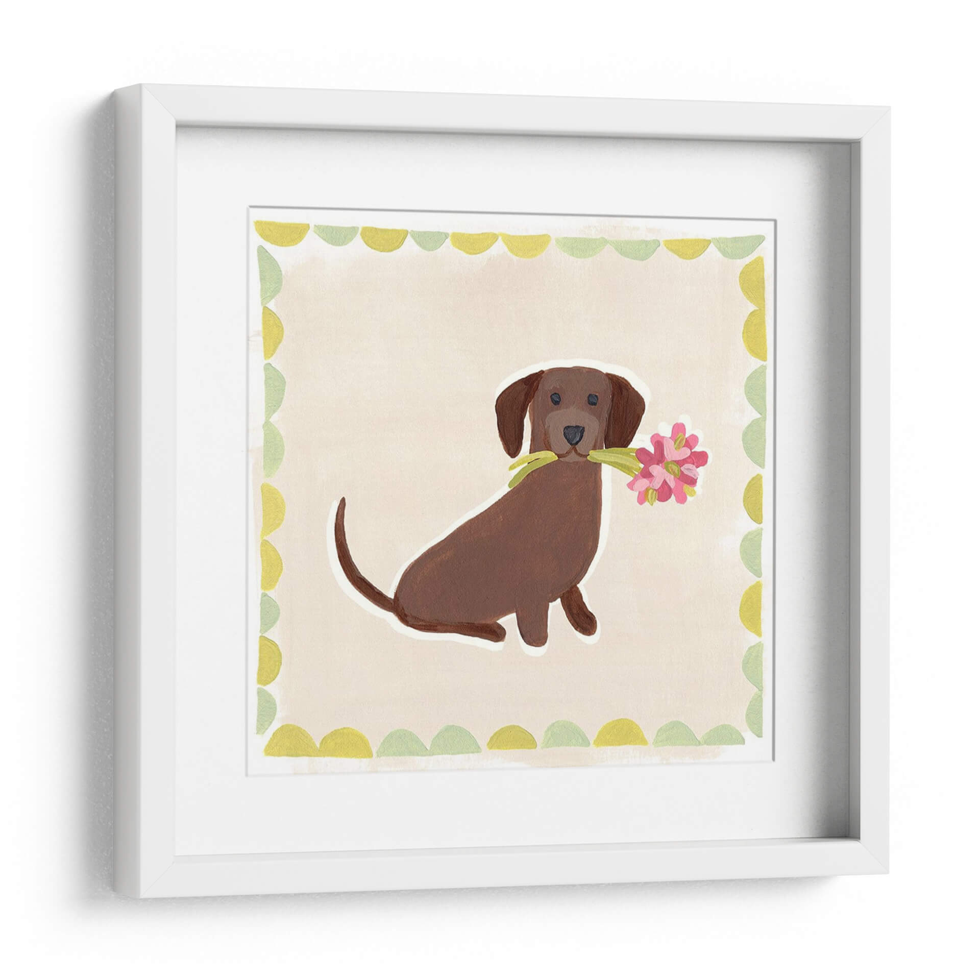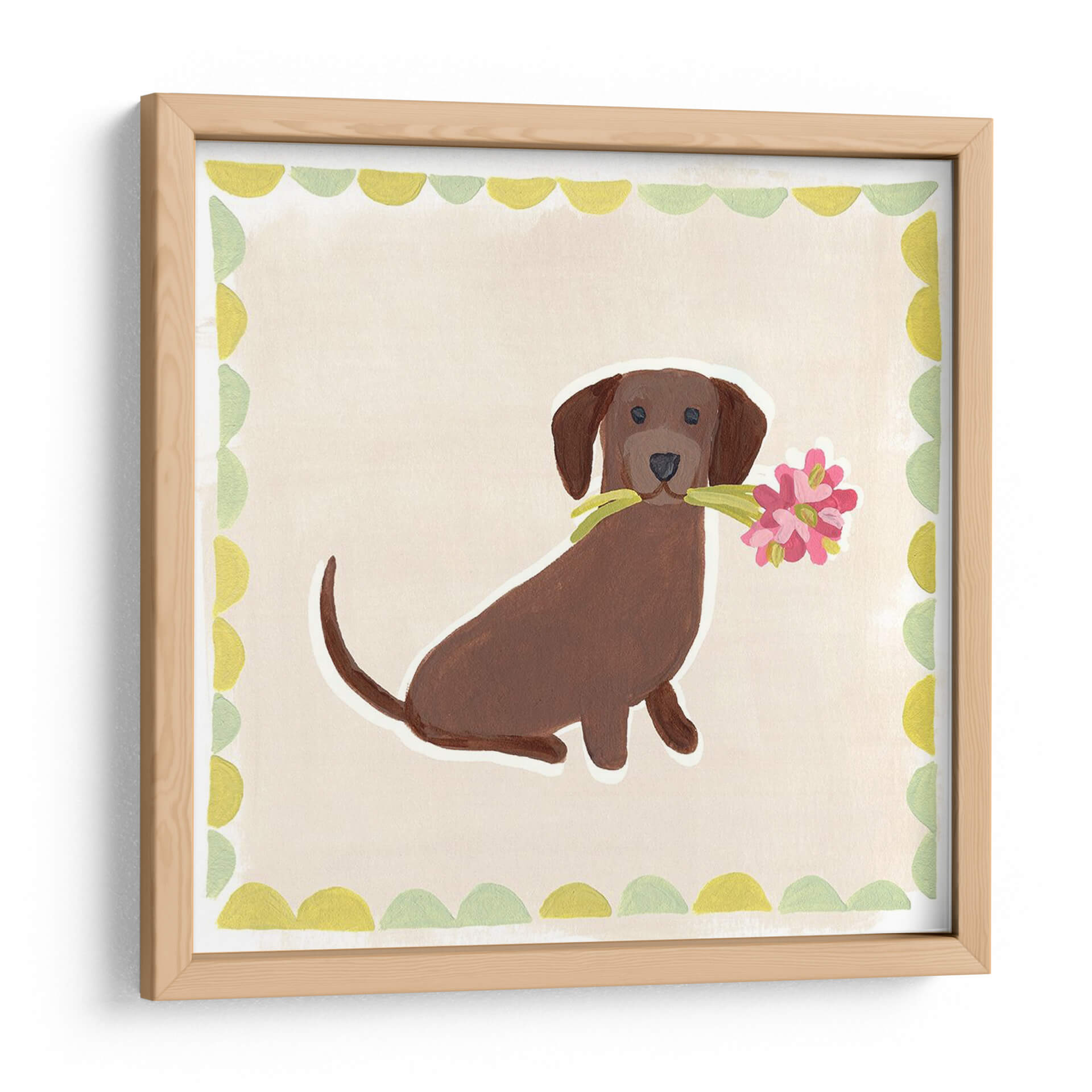 Captura la alegría y el encanto con este adorable cuadro decorativo de un dachshund, cariñosamente conocido como 'Dachshund Delight IV' por la artista June Erica Vess. Esta obra de arte presenta a un tierno perro salchicha de color marrón, sentado con elegancia y sosteniendo un delicado ramo de flores rosadas en su hocico, un gesto tierno que irradia dulzura y afecto. El fondo, de un suave tono beige arena, crea una atmósfera serena y cálida, realzada por un borde decorativo compuesto por semicírculos en tonos verdes menta y amarillos pálidos. El estilo artístico, con sus líneas sencillas y colores primarios bien definidos, aporta un toque contemporáneo y lúdico, ideal para quienes buscan añadir personalidad y un toque de vitalidad a sus espacios. Este cuadro decorativo es perfecto para infundir calidez en una sala de estar, añadir un toque juguetón a una habitación infantil o crear un rincón acogedor en una oficina. Su diseño universalmente agradable y su temática de mascotas lo convierten en una elección excepcional para los amantes de los perros y para cualquiera que aprecie el arte con alma. Transforma cualquier ambiente con esta pieza única que celebra la inocencia y la belleza de la naturaleza canina.