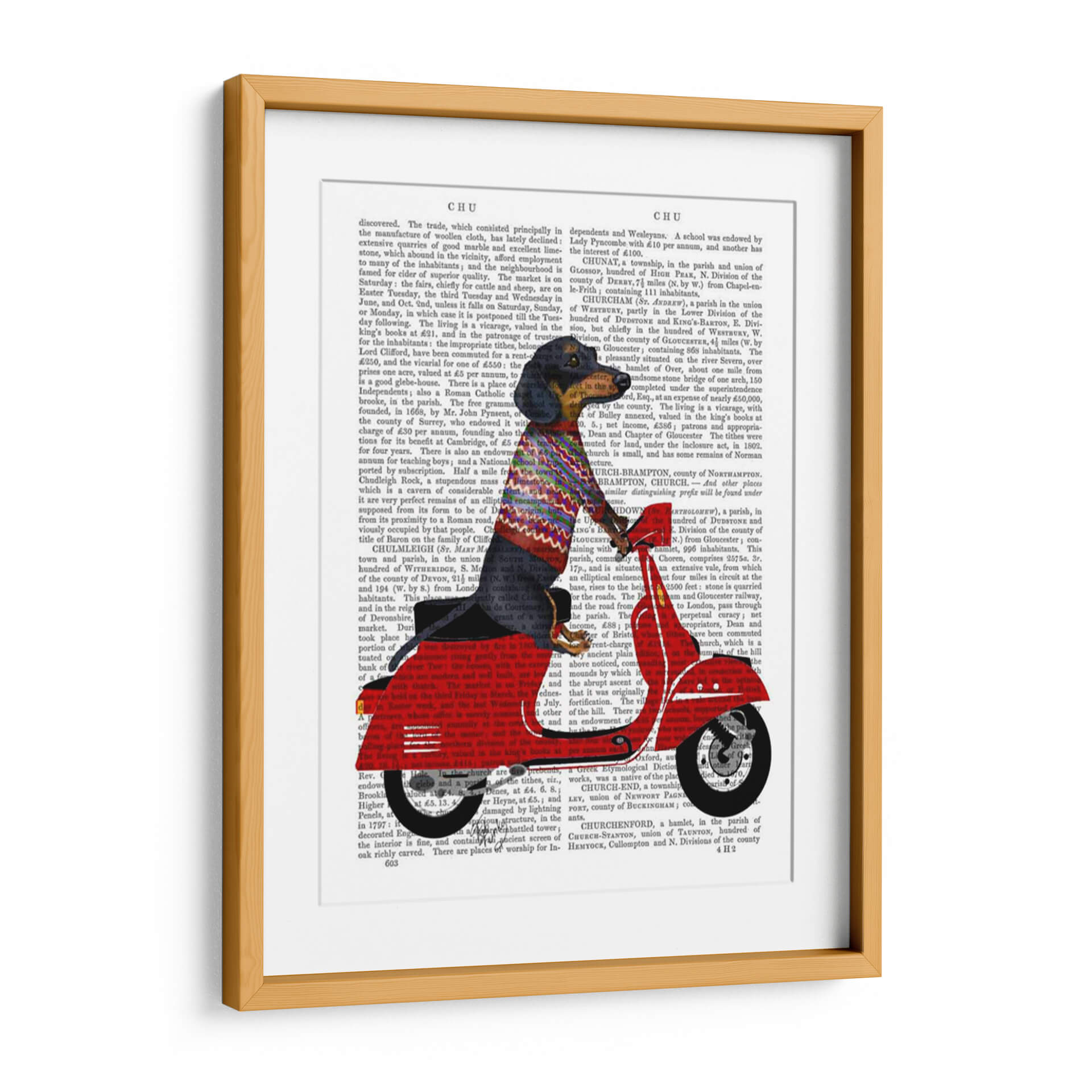Sumérgete en la originalidad y el encanto de "Dachshund En Un Ciclomotor", una obra de arte digital que fusiona lo peculiar con lo estiloso. Esta cautivadora pieza presenta un adorable dachshund vestido con un suéter vibrante y colorido, montado con confianza sobre un ciclomotor rojo brillante. El fondo, una página de un diccionario o enciclopedia antigua, añade una capa de textura y contexto histórico, creando un contraste fascinante entre lo clásico y lo contemporáneo. Los colores predominantes son el rojo intenso del ciclomotor, los tonos tierra y marrones del perro, y el sepia del papel antiguo, equilibrados por los vivos colores del suéter del dachshund. El estilo es decididamente pop y surrealista, invitando a la sonrisa y generando una sensación de alegría juguetona. Ideal para espacios que buscan un toque de humor y personalidad, como una sala de estar moderna, un despacho creativo o incluso una habitación juvenil. Este cuadro decorativo es perfecto para amantes de los perros, entusiastas de los vehículos vintage y cualquiera que aprecie el arte con un giro inesperado y lleno de carácter. Añade un punto focal divertido y memorable a tu decoración con esta pieza única de Fab Funky.