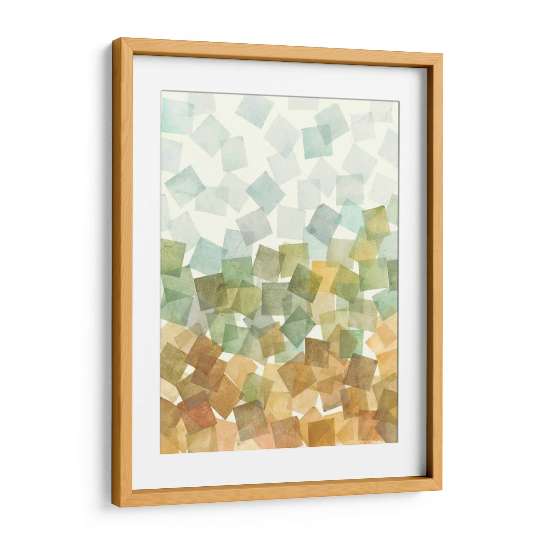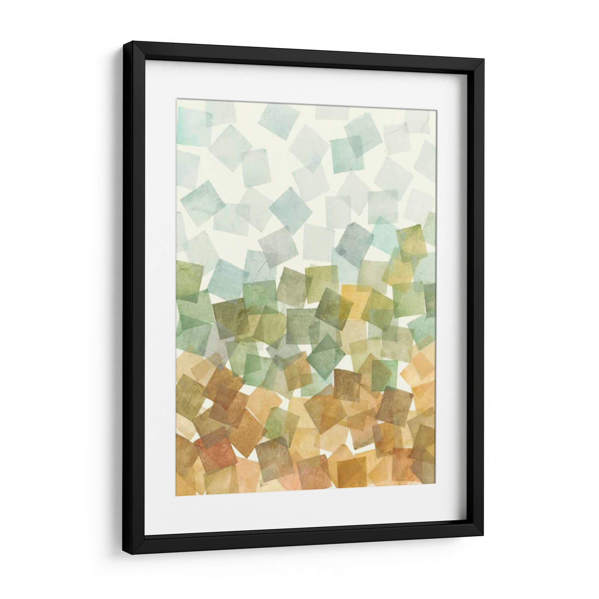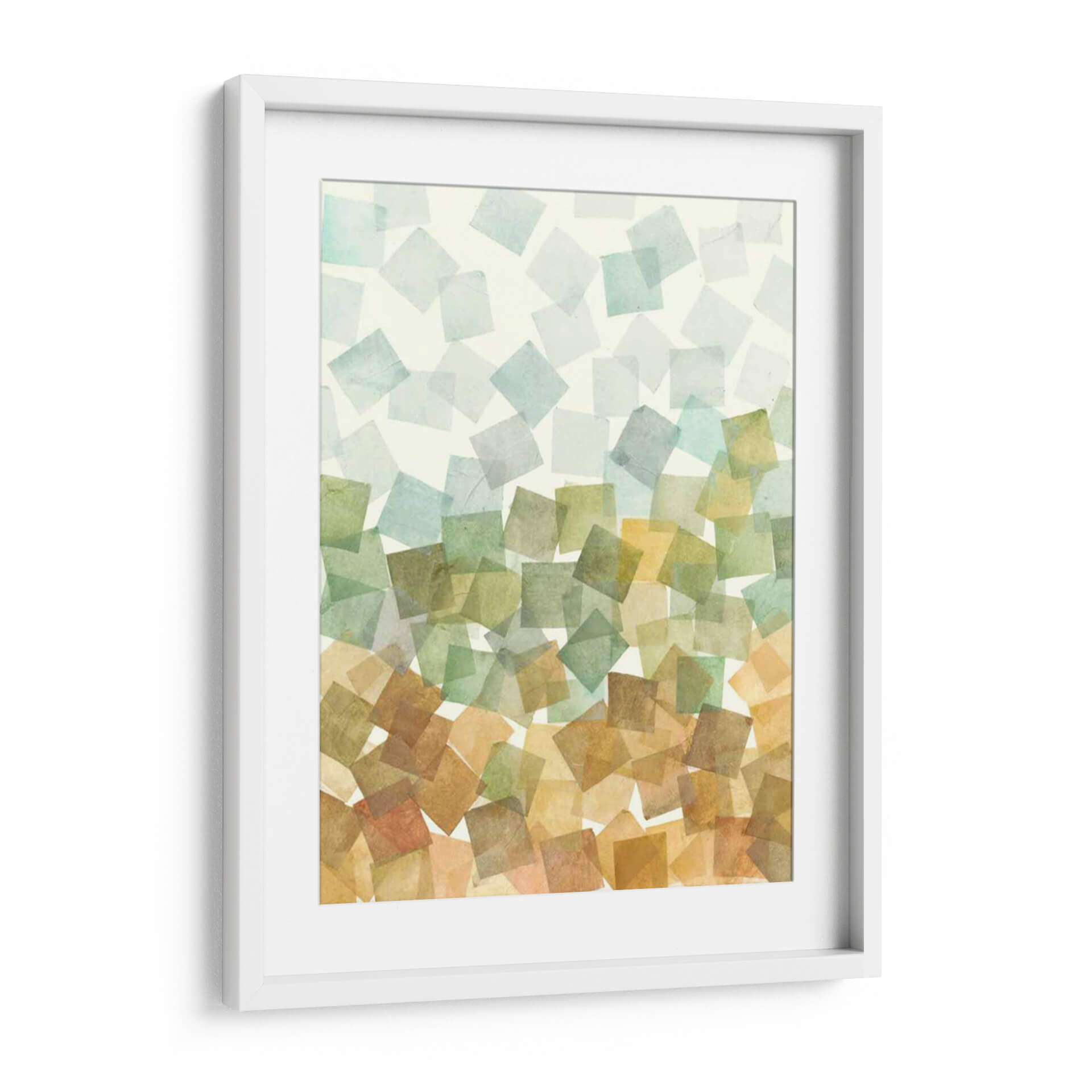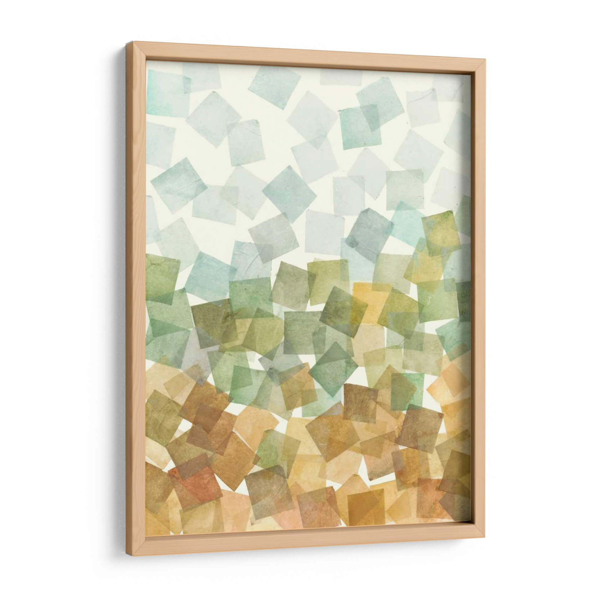 Sumérgete en la serenidad y el orden abstracto con "Deconstruido Fall II II" de Megan Meagher. Esta obra de arte cautiva con su composición de formas geométricas superpuestas, evocando la delicadeza de las hojas de otoño cayendo suavemente. La paleta de colores, que transita desde suaves tonos celestes y verdosos en la parte superior hacia cálidos ocres y terracotas en la base, crea una atmósfera de transición y armonía natural. Cada cuadrado, con su textura sutil y translucidez, parece flotar, invitando a la contemplación y a la calma. Ideal para añadir un toque de sofisticación orgánica a tu sala de estar, dormitorio u oficina, este cuadro decorativo abstracto se convierte en un punto focal que inspira tranquilidad y conexión con la naturaleza. Su diseño contemporáneo y su ejecución impecable lo convierten en una pieza esencial para quienes buscan un arte que eleve su espacio y refleje una apreciación por la belleza sutil y el equilibrio. Descubre la magia de la abstracción geométrica y transforma tu hogar con esta pieza única de Megan Meagher.