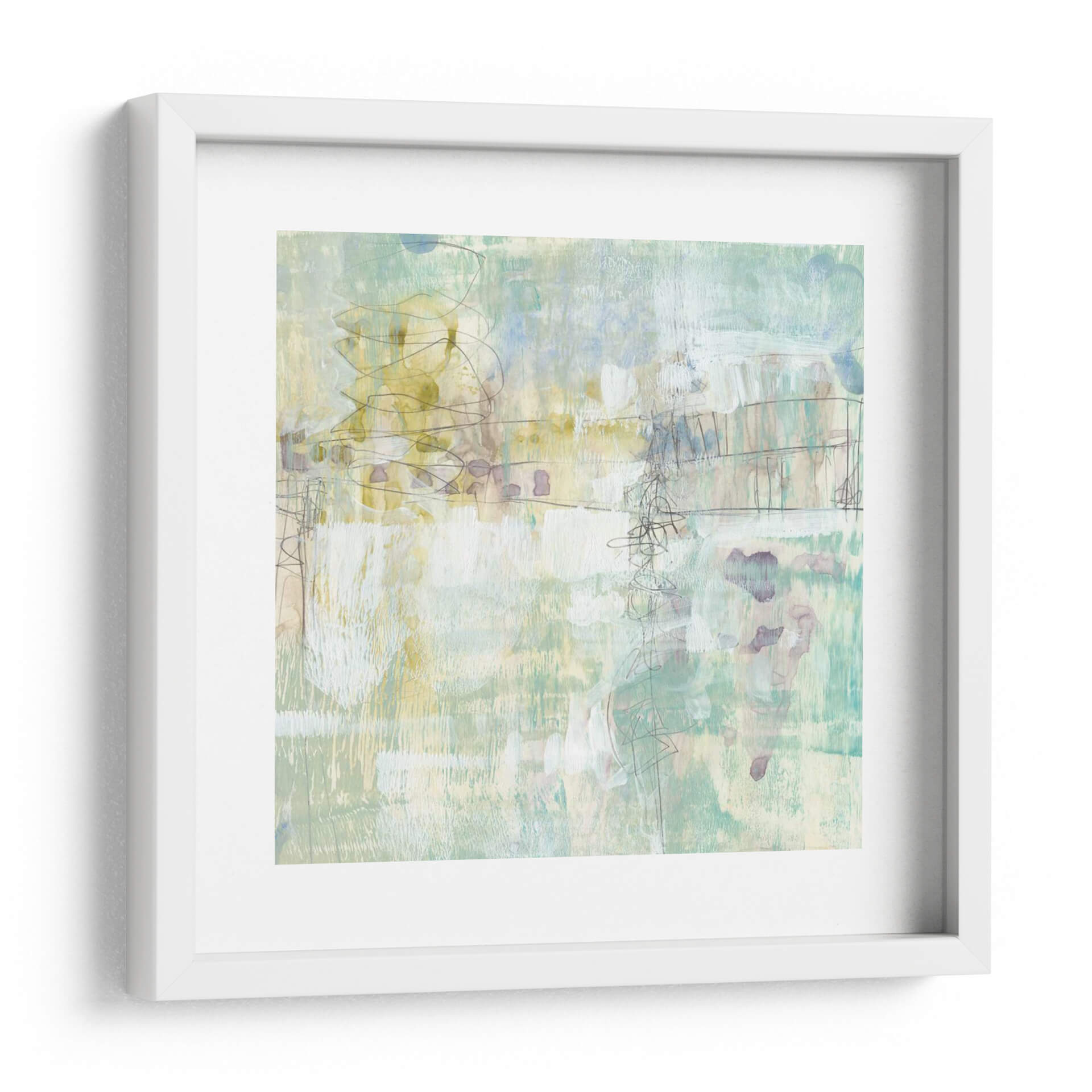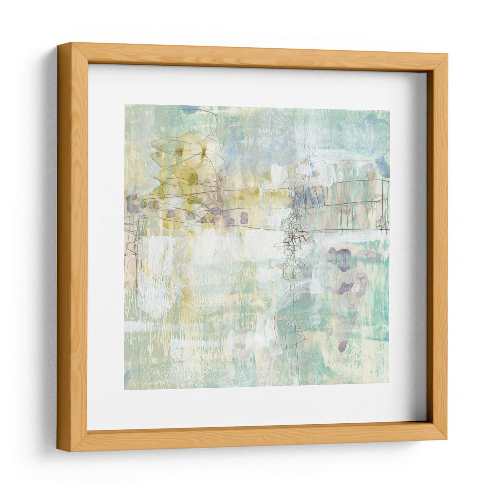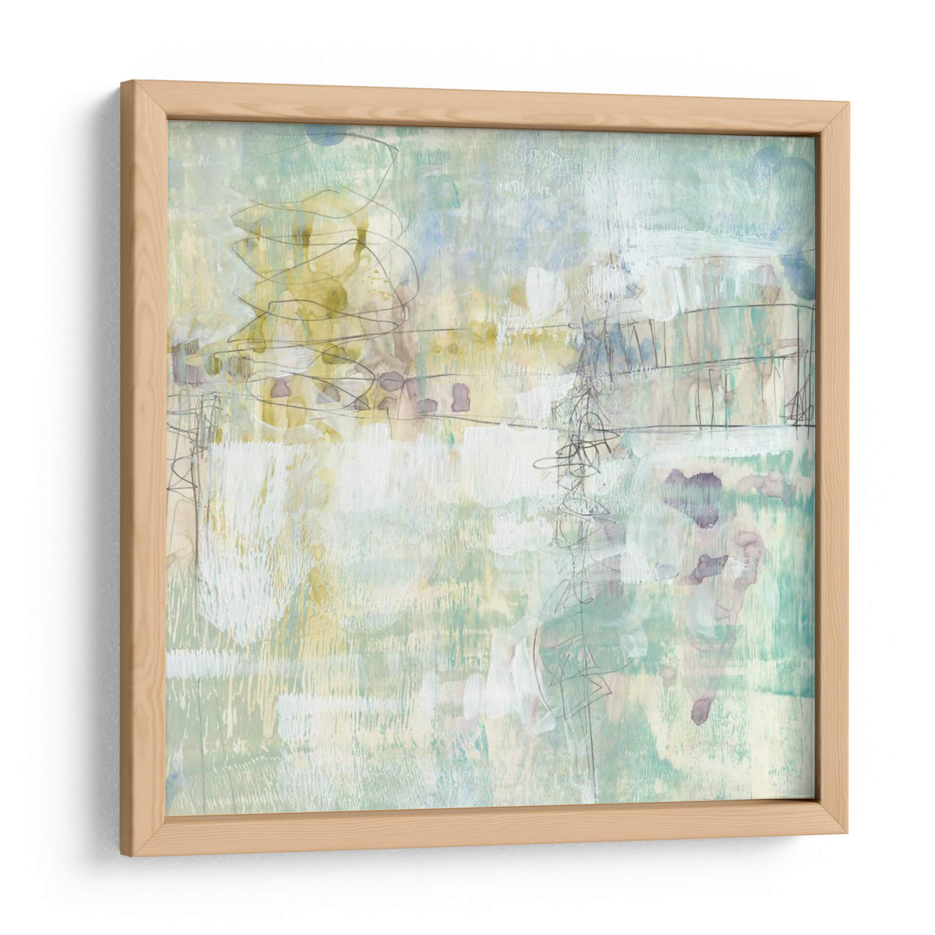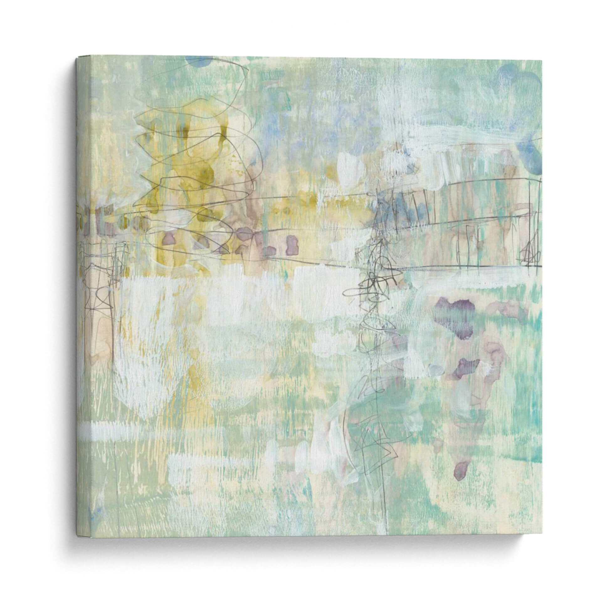 Sumérgete en la serenidad etérea de 'Desayuno Club I', una obra de arte abstracta de Jennifer Goldberger que evoca una atmósfera de calma y reflexión. Esta pieza se caracteriza por su delicada paleta de colores pastel, dominada por suaves tonos verdes menta, celestes y toques de amarillo pálido, intercalados con blancos nítidos y sutiles morados. La composición se desarrolla a través de capas de texturas visuales, donde pinceladas suaves se mezclan con finos trazos de dibujo lineal que añaden un elemento de intriga y movimiento. Es un cuadro decorativo que, a pesar de su naturaleza abstracta, sugiere paisajes etéreos o estados de ánimo contemplativos. Ideal para infundir paz y sofisticación en cualquier espacio, desde una sala de estar contemporánea hasta un tranquilo dormitorio o una oficina que busque un toque de inspiración artística. 'Desayuno Club I' es una invitación a la contemplación, perfecta para quienes aprecian el arte abstracto con profundidad emocional y una estética refinada.
