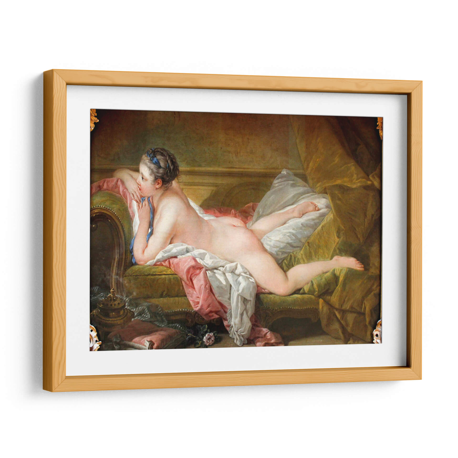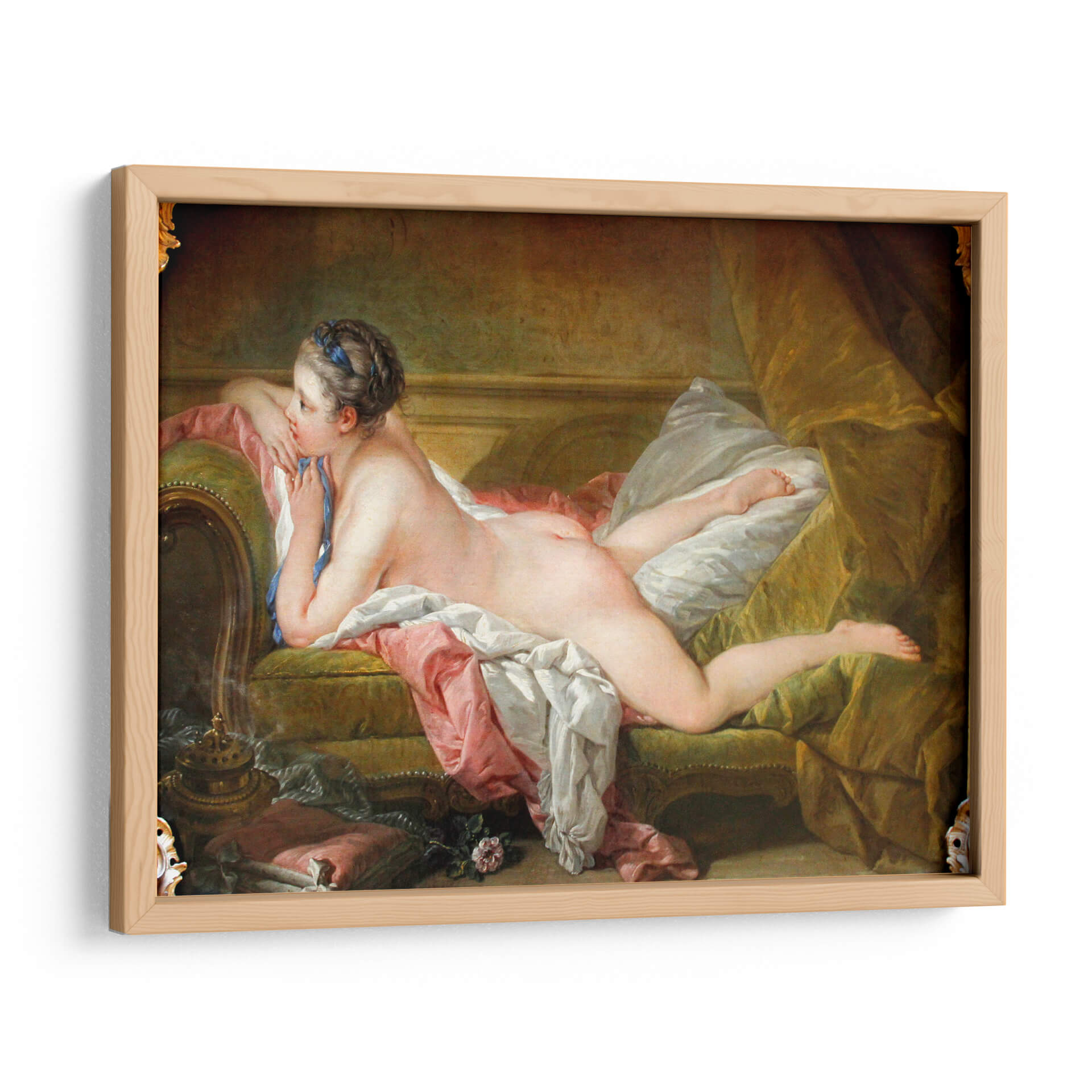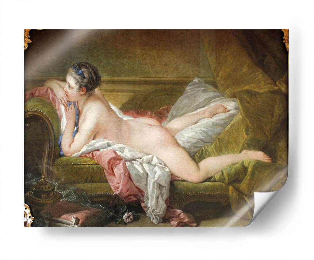 Descubre la obra maestra 'Desnudo en reposo - retrato de Mademoiselle Louise O'Murphy' de François Boucher, una pieza que irradia sensualidad y serenidad. Este cuadro decorativo captura la delicadeza de la figura femenina recostada, con una paleta de colores suaves y tonos pastel que crean una atmósfera de intimidad y calma. La composición, característica del Rococó, presenta una figura curvilínea en una pose relajada, rodeada de telas vaporosas y cojines mullidos que acentúan la opulencia y el confort del entorno. Los detalles sutiles, como la mirada pensativa de Mademoiselle Louise O'Murphy y la suave iluminación, invitan a la contemplación y añaden profundidad a la pieza. Ideal para añadir un toque de elegancia clásica y un aire de sofisticación a tu dormitorio, salón o tocador. Este retrato es una celebración de la belleza y la tranquilidad, perfecto para quienes buscan una decoración que combine arte histórico con un toque contemporáneo. Transforma tu espacio con esta obra que evoca una sensación de ensueño y refinamiento, aportando un punto focal de arte atemporal a tu hogar.