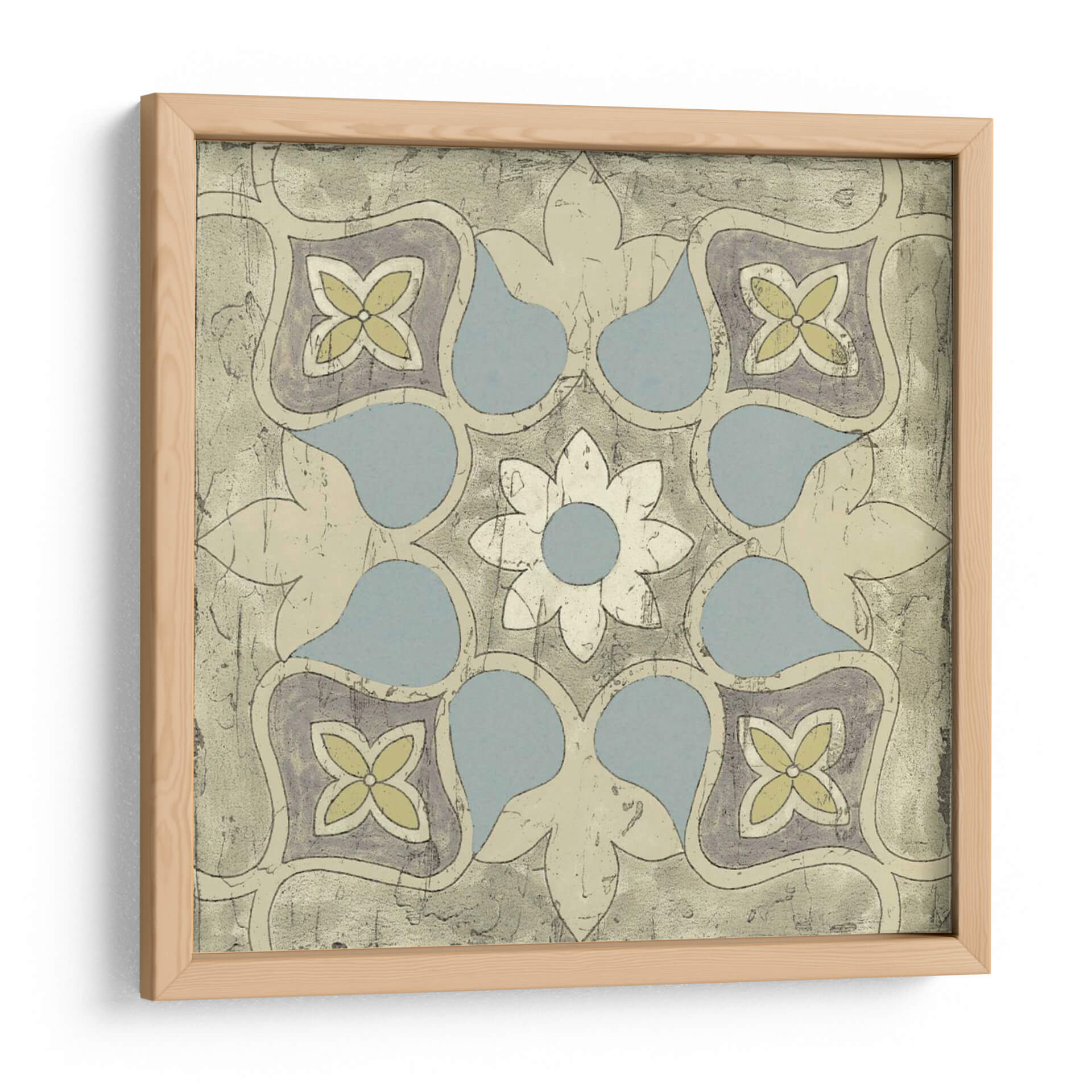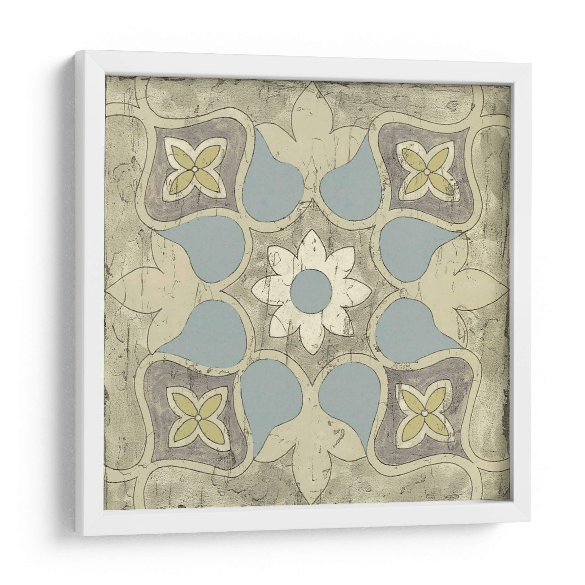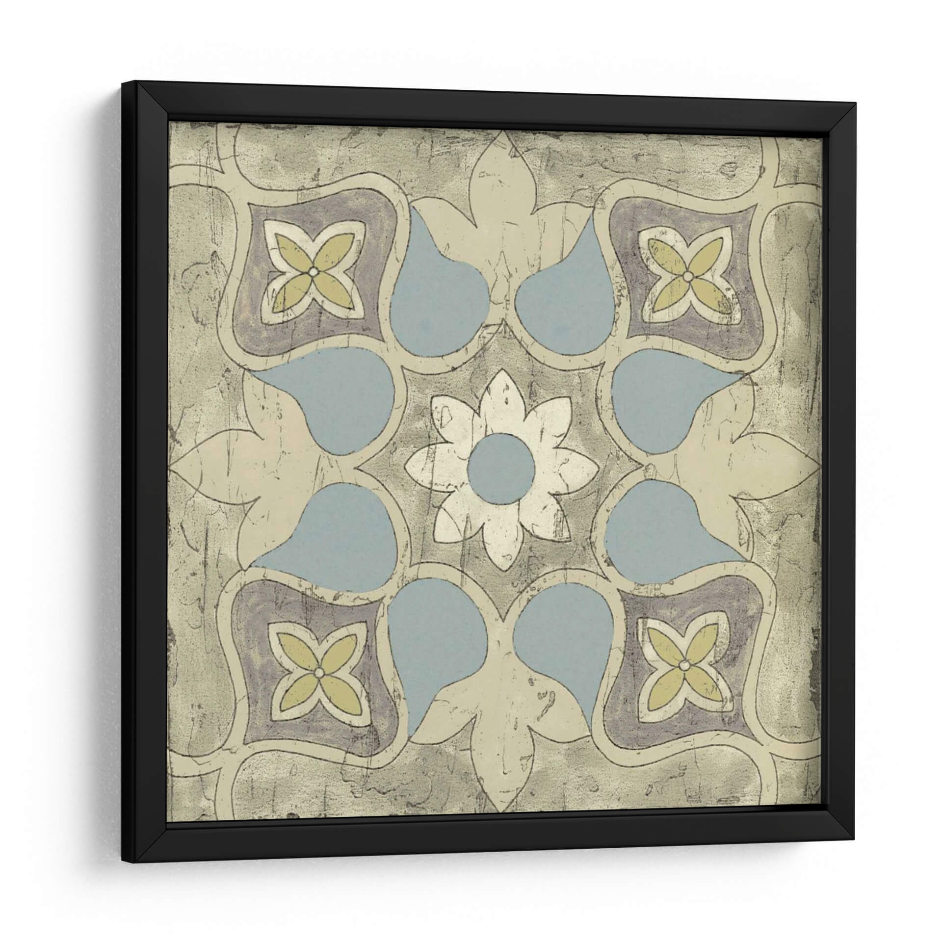 Embellece tu hogar con el cuadro decorativo "Diseño De Azulejos Pastel V", una pieza que evoca la elegancia atemporal de los mosaicos tradicionales con un toque contemporáneo. Esta obra de arte presenta un patrón geométrico intrincado, centrado en una flor estilizada rodeada de formas orgánicas suaves y elementos florales, reminiscentes de diseños de azulejos marroquíes o portugueses. La paleta de colores, dominada por tonos pastel de azul pálido, amarillo suave y toques de gris violáceo sobre un fondo texturizado en tonos arena y beige, crea una atmósfera serena y acogedora. La composición simétrica y el estilo que fusiona lo clásico con lo moderno lo convierten en una adición versátil para cualquier espacio. Imagina este cuadro aportando un aire de sofisticación y calma a tu sala de estar, un toque de color sutil a tu dormitorio, o una declaración de estilo único en tu oficina. Su diseño detallado y la delicadeza de sus colores invitan a la contemplación, transformando cualquier pared en un punto focal de belleza y buen gusto. Ideal para quienes buscan una decoración de pared que combine arte histórico y diseño actual.