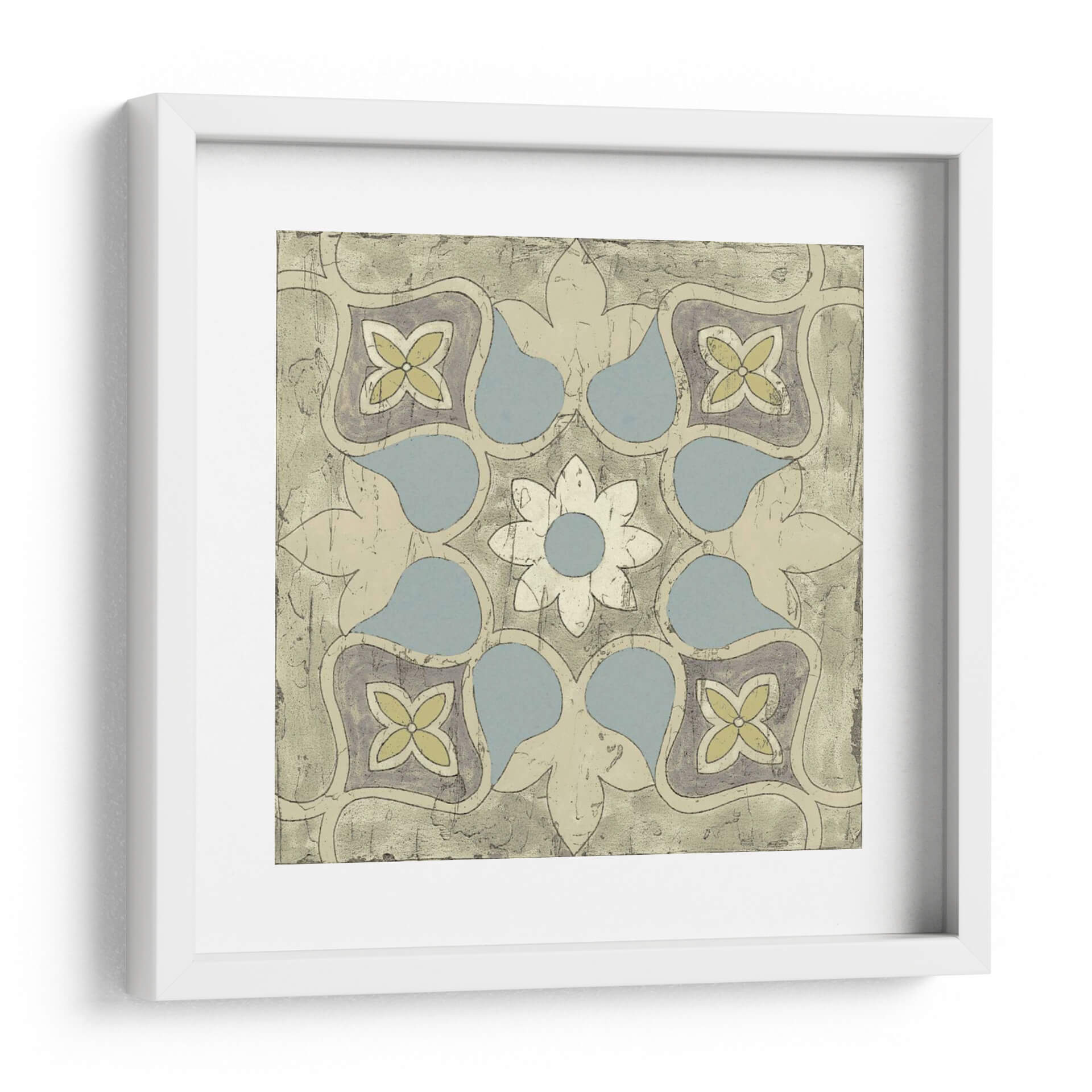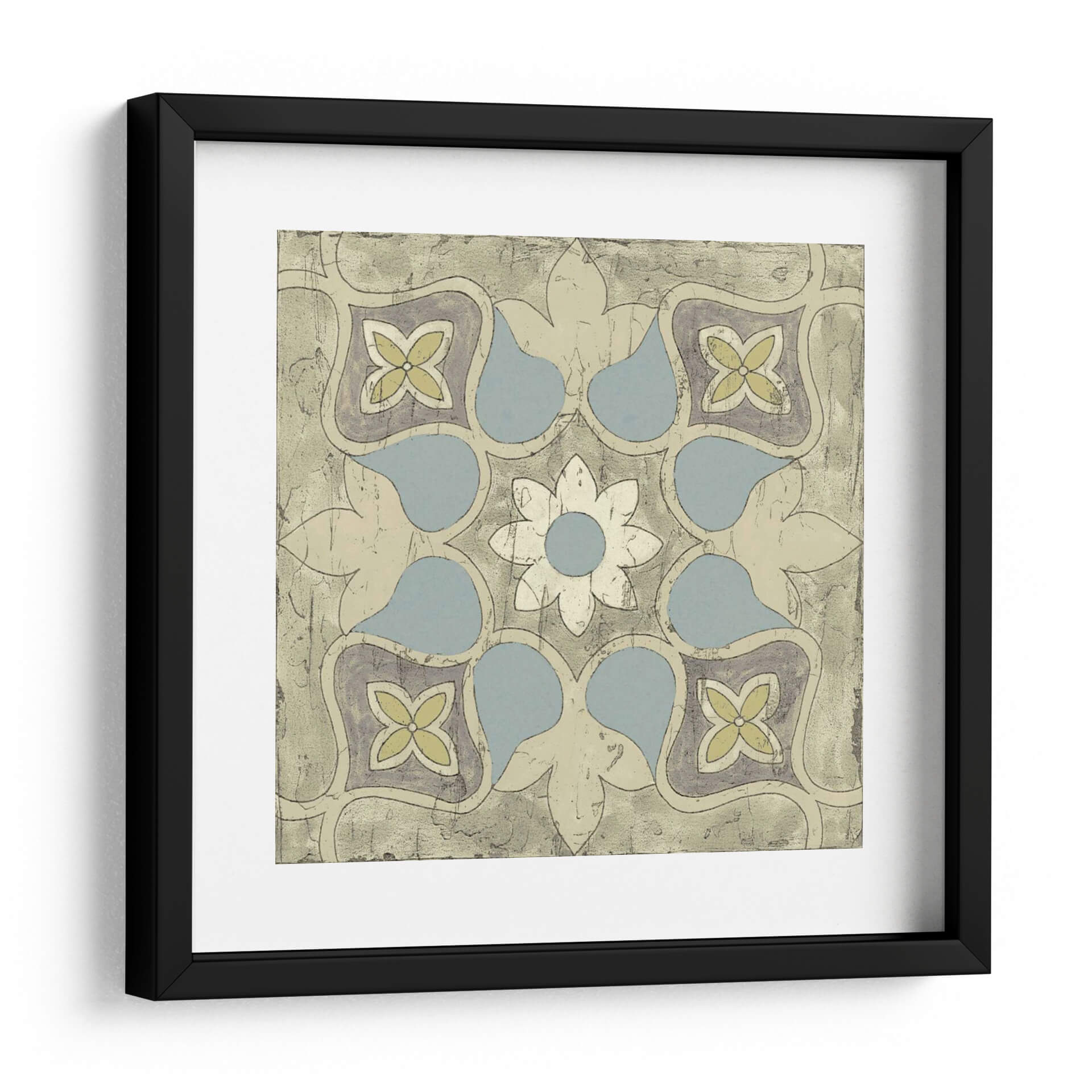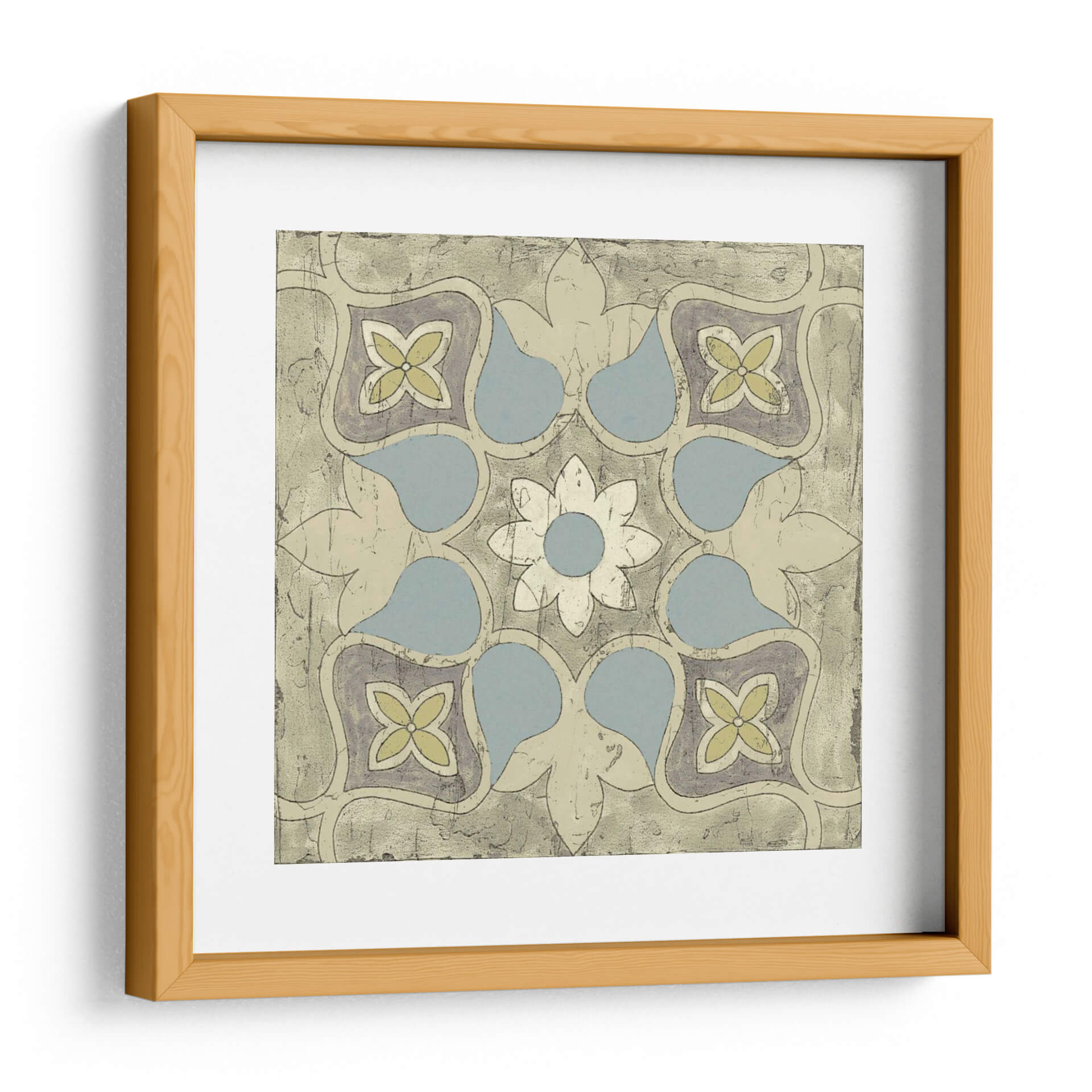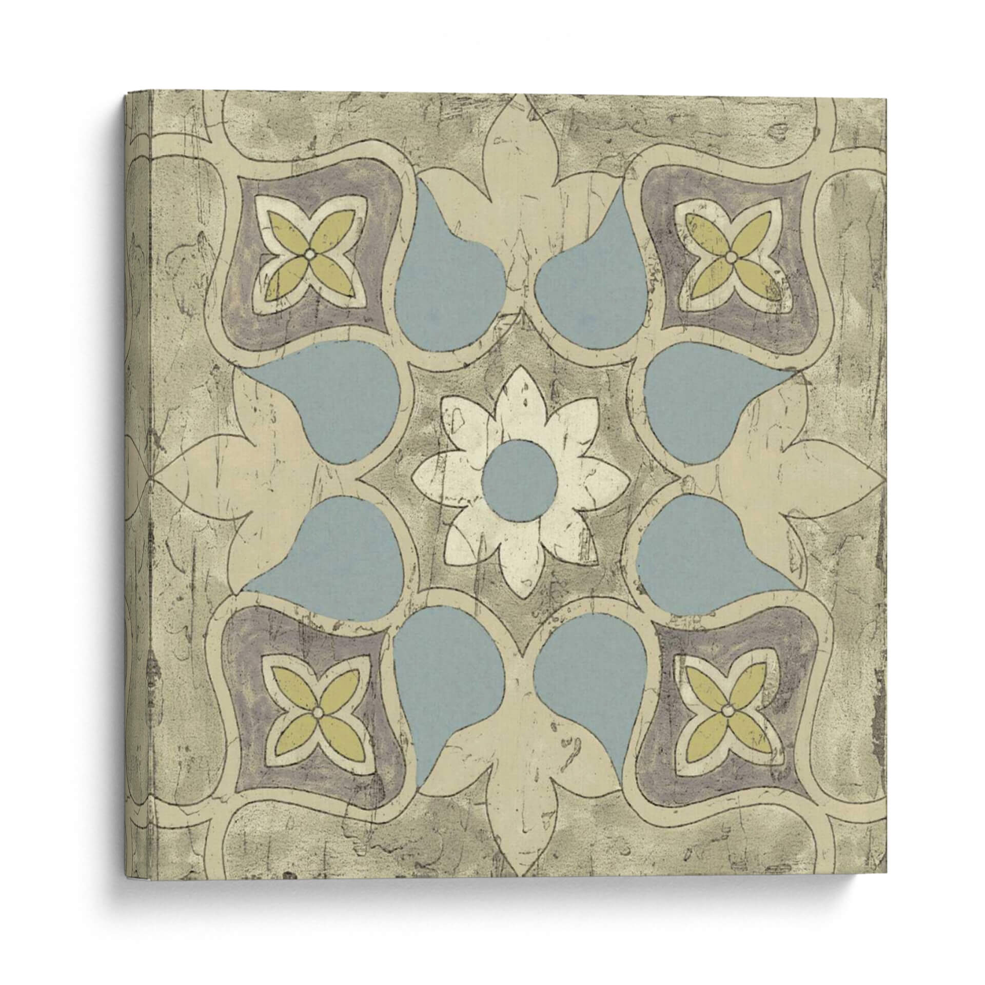 Embellece tu hogar con el cuadro decorativo "Diseño De Azulejos Pastel V", una pieza que evoca la elegancia atemporal de los mosaicos tradicionales con un toque contemporáneo. Esta obra de arte presenta un patrón geométrico intrincado, centrado en una flor estilizada rodeada de formas orgánicas suaves y elementos florales, reminiscentes de diseños de azulejos marroquíes o portugueses. La paleta de colores, dominada por tonos pastel de azul pálido, amarillo suave y toques de gris violáceo sobre un fondo texturizado en tonos arena y beige, crea una atmósfera serena y acogedora. La composición simétrica y el estilo que fusiona lo clásico con lo moderno lo convierten en una adición versátil para cualquier espacio. Imagina este cuadro aportando un aire de sofisticación y calma a tu sala de estar, un toque de color sutil a tu dormitorio, o una declaración de estilo único en tu oficina. Su diseño detallado y la delicadeza de sus colores invitan a la contemplación, transformando cualquier pared en un punto focal de belleza y buen gusto. Ideal para quienes buscan una decoración de pared que combine arte histórico y diseño actual.