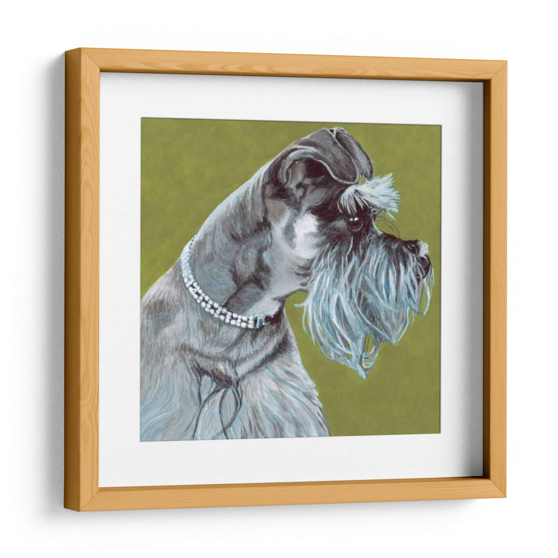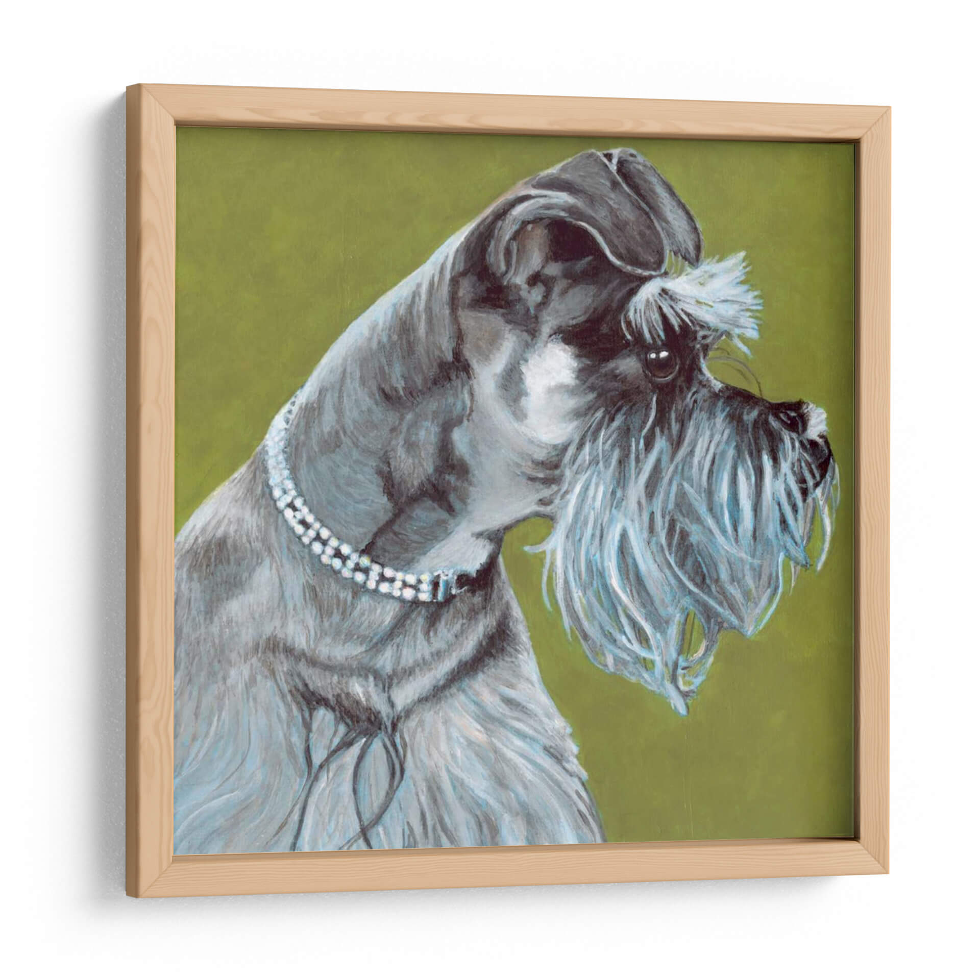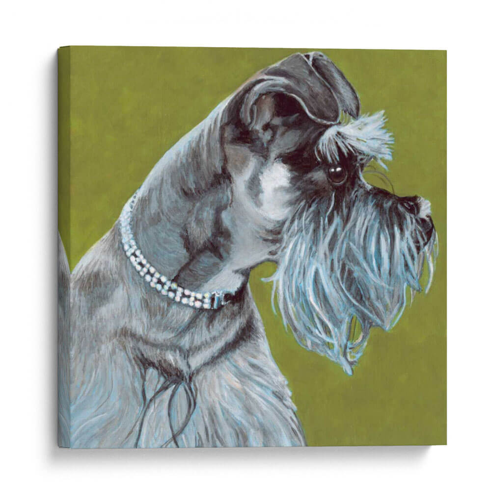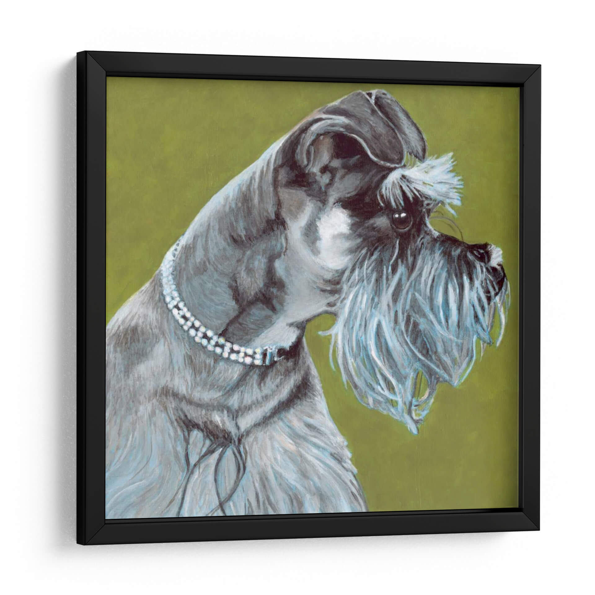 Este cautivador cuadro decorativo presenta un retrato íntimo de un perro Schnauzer, capturado con una técnica expresionista y pinceladas audaces que dan vida a su pelaje grisáceo y barba característica. La mirada del perro, dirigida hacia el horizonte, evoca una sensación de lealtad y nobleza, mientras que el collar de perlas añade un toque de elegancia inesperada. El fondo de un verde oliva vibrante contrasta maravillosamente con los tonos fríos del animal, creando una composición dinámica y atractiva. Esta obra de arte es perfecta para amantes de los perros y para quienes buscan añadir un punto de interés sofisticado y lleno de personalidad a su hogar u oficina. Ideal para salas de estar, estudios o incluso dormitorios, este cuadro decorativo es una pieza que inspira conversación y aporta calidez a cualquier espacio, celebrando la conexión única entre humanos y sus mascotas con un estilo artístico moderno y distintivo.