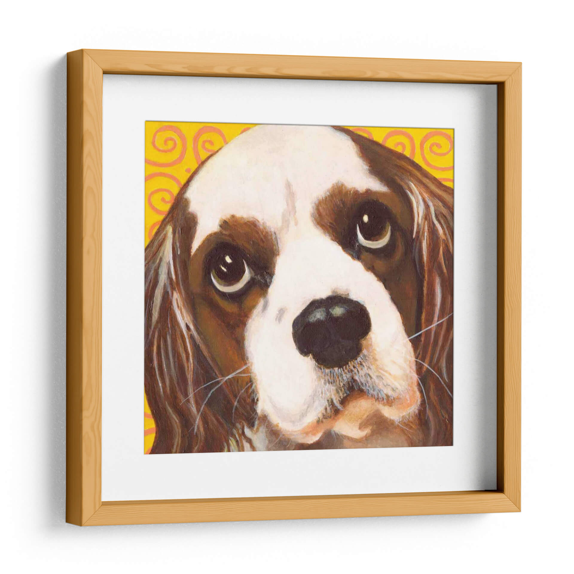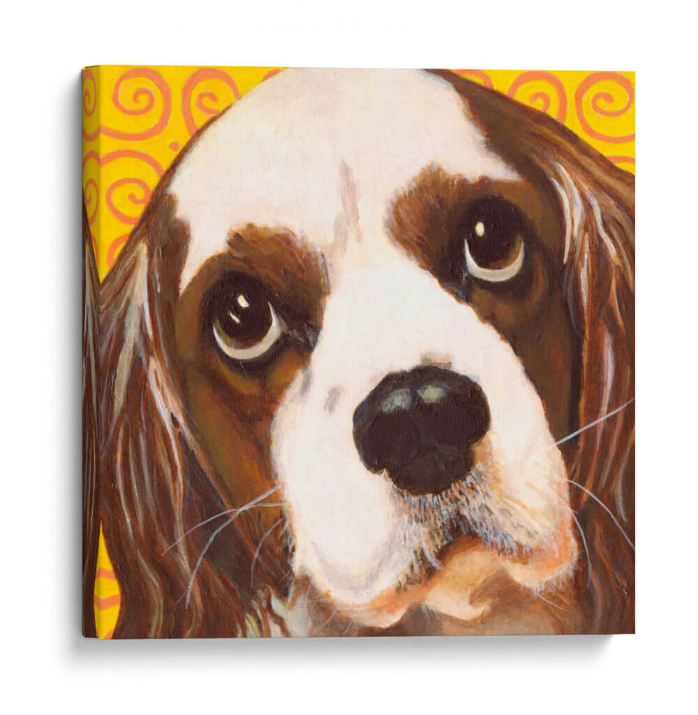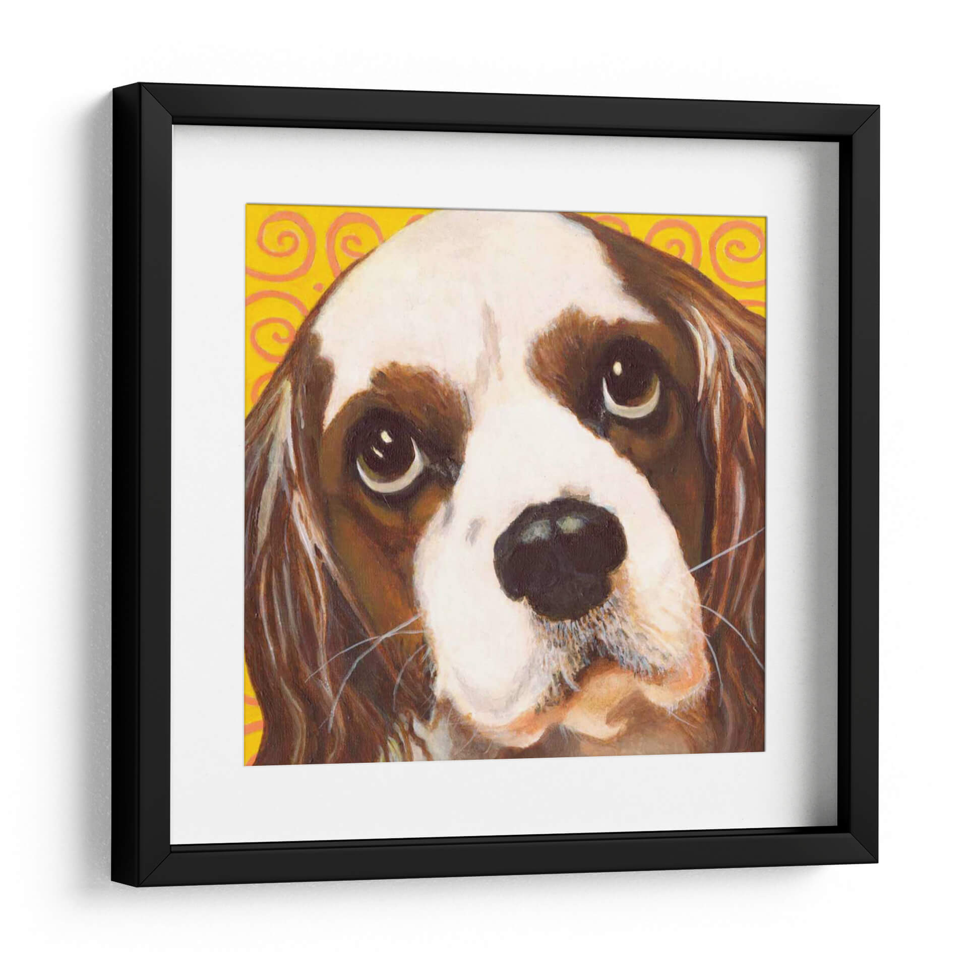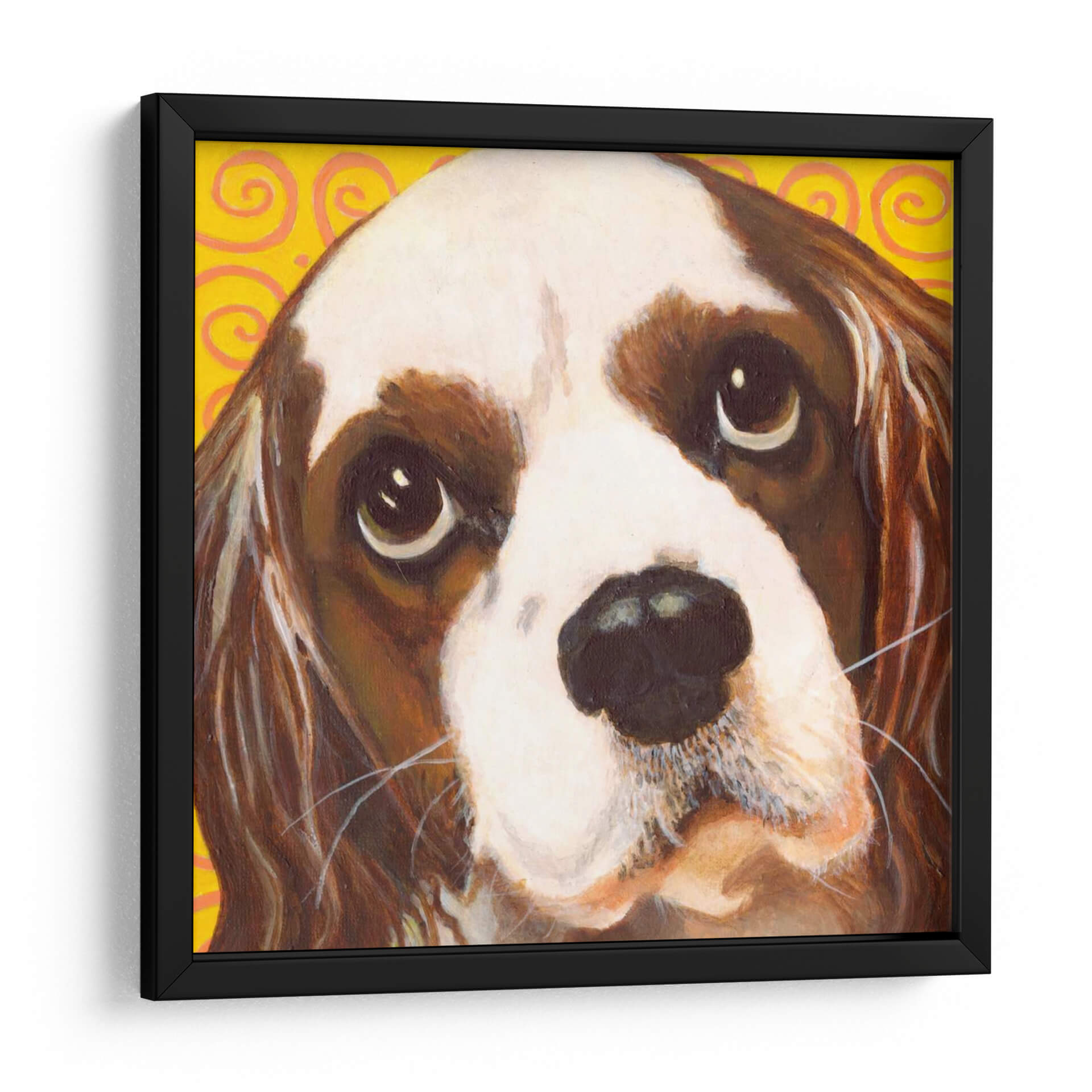 Este encantador cuadro decorativo, titulado 'Dogs Drynns - Charlie' y obra del artista Dylnn Roll, captura la esencia juguetona y leal de un Cavalier King Charles Spaniel. La obra presenta un primer plano del rostro de un perro con ojos grandes y expresivos que miran directamente al espectador, invitando a una conexión inmediata. La paleta de colores se centra en cálidos tonos marrones y blancos cremosos para el pelaje, contrastando vívidamente con un fondo amarillo brillante adornado con remolinos juguetones en naranja. Esta vibrante combinación de colores y el estilo expresivo del artista añaden una dosis de energía y alegría a cualquier espacio. La composición, centrada en el rostro del perro, resalta su personalidad amigable y curiosa. Es una pieza de arte perfecta para los amantes de los perros y para aquellos que buscan añadir un toque de calidez y carácter a su hogar u oficina. Ideal para salones, dormitorios o estudios, este cuadro decorativo se convertirá en un punto focal que evoca sonrisas y conversaciones. Su estilo único y su tema entrañable lo hacen un regalo excepcional para cualquier ocasión, infundiendo personalidad y vida a la decoración de interiores.