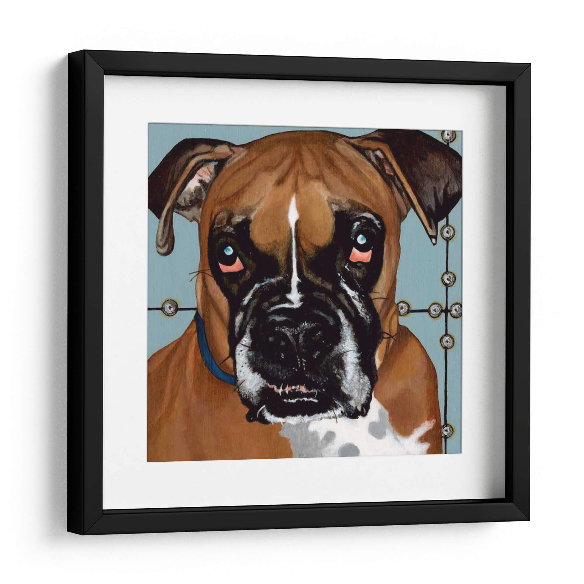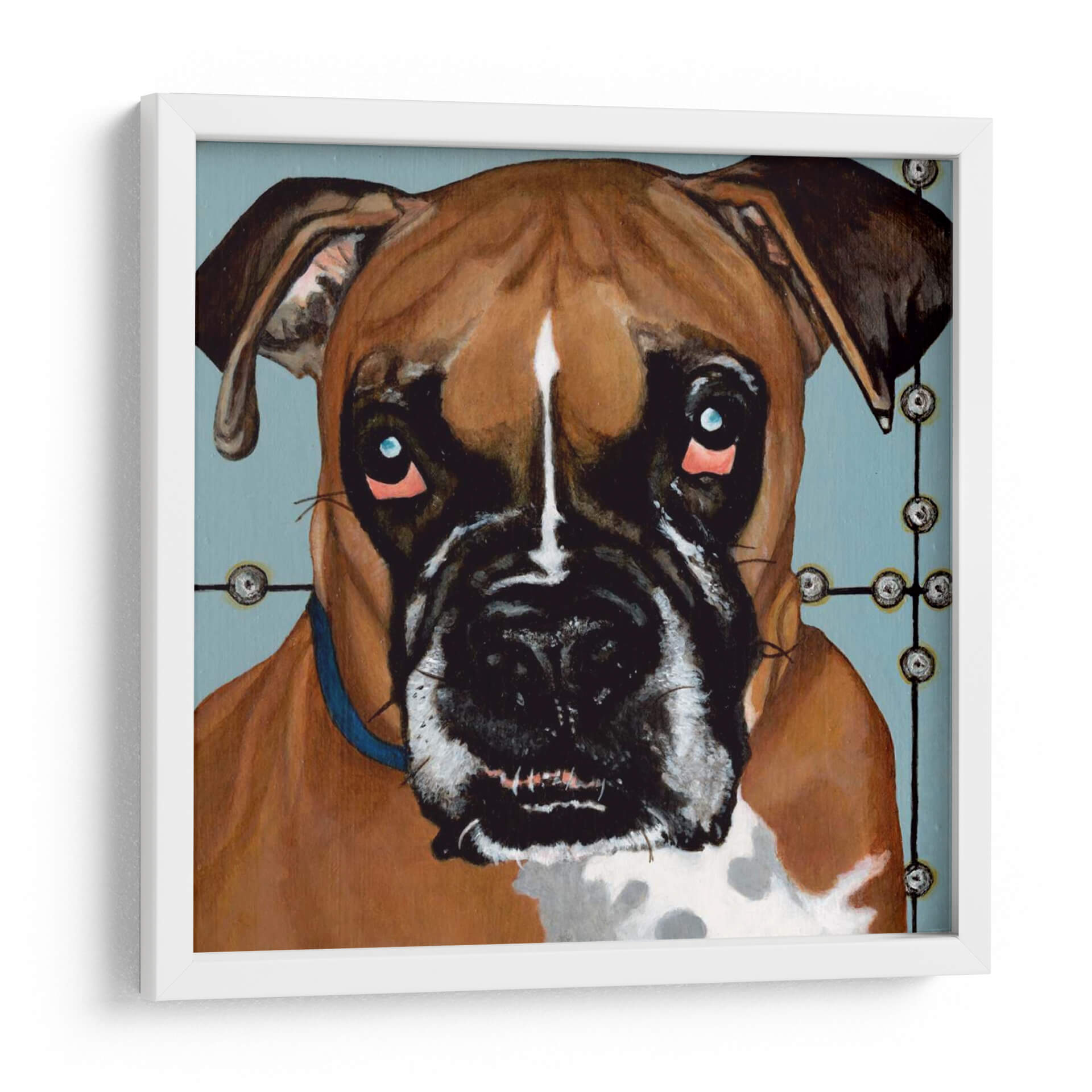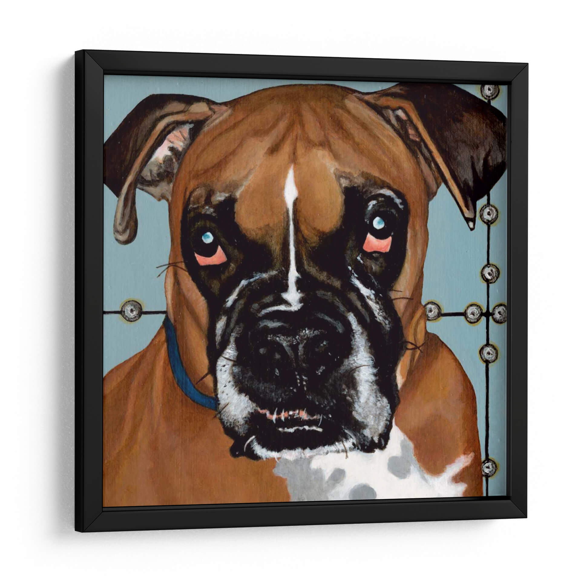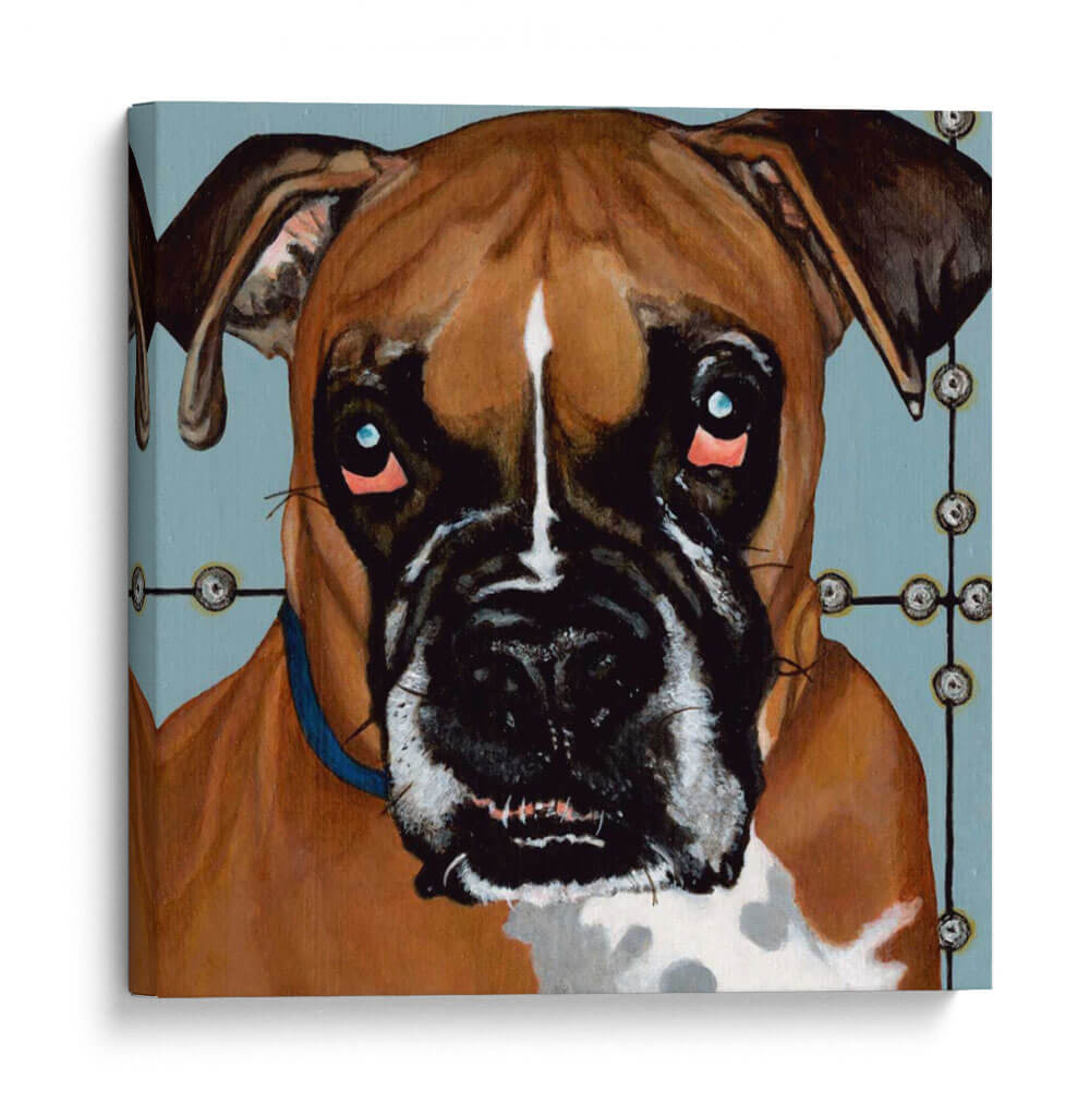 Sumérgete en la expresiva mirada de "Dogs Drynns - Rocco", una obra de arte cautivadora que captura la esencia de un boxer con una intensidad conmovedora. Dylnn Roll, el artista, ha creado un retrato que va más allá de la simple representación, explorando las profundidades emocionales de su sujeto. La paleta de colores, dominada por tonos cálidos y terrosos del pelaje del perro, se contrasta maravillosamente con un fondo azul sereno y apagado, creando una atmósfera íntima y a la vez moderna. Los ojos penetrantes, con un toque de azul eléctrico y sutiles brillos rosados alrededor, invitan a la reflexión y añaden una dimensión de vulnerabilidad y carácter. La composición se centra en el rostro del perro, destacando sus rasgos distintivos y su expresión única. Este cuadro decorativo es ideal para los amantes de los animales y para quienes buscan añadir un toque de personalidad y calidez a su hogar u oficina. Su estilo contemporáneo y su profundidad emocional lo convierten en una pieza de conversación perfecta para salones, estudios o cualquier espacio que necesite un punto focal lleno de alma. "Dogs Drynns - Rocco" no es solo una imagen, es una conexión emocional esperando adornar tus paredes.