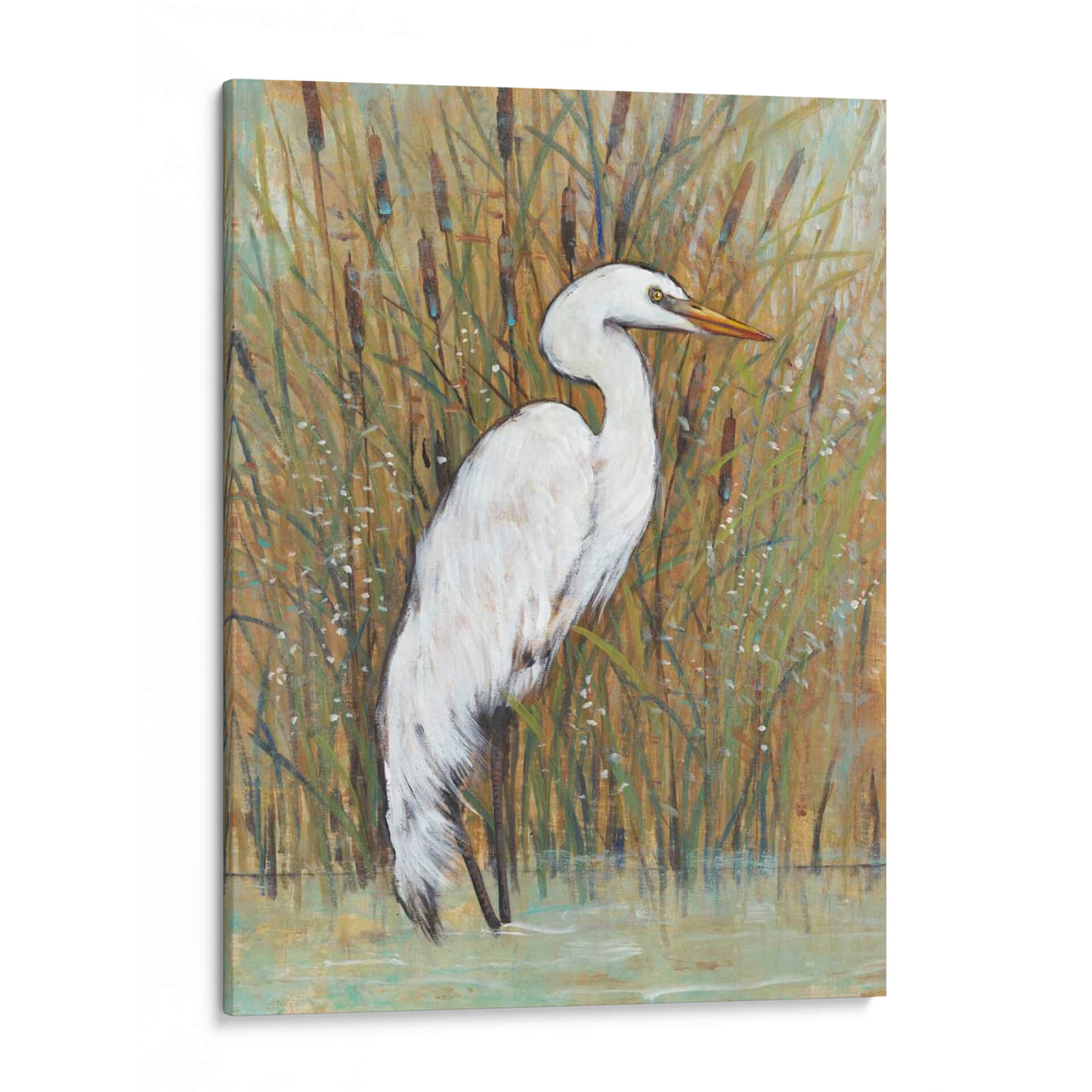 Captura la serenidad de la naturaleza con "Egret Blanco II", una obra de arte evocadora de Tim O'Toole. Este cuadro decorativo presenta una elegante garza blanca inmóvil entre cañas altas y secas, con el agua serena reflejando los tonos cálidos del entorno. La paleta de colores, dominada por ocres, verdes apagados y toques de azul verdoso en el agua, crea una atmósfera de calma y tranquilidad. El estilo pictórico, con pinceladas visibles y una textura rica, añade profundidad y carácter a la pieza. La composición, centrada en la figura estilizada de la garza, ofrece un punto focal armonioso que invita a la contemplación. Ideal para espacios que buscan un toque de naturaleza serena y sofisticada, como salones, dormitorios o estudios. "Egret Blanco II" es más que una simple decoración de pared; es una ventana a un momento de paz natural, perfecta para infundir calma y belleza en tu hogar u oficina. Su presencia sutil pero impactante lo convierte en una adición versátil a cualquier esquema de decoración, aportando elegancia y una conexión con el mundo natural. Este cuadro decorativo es una invitación a la quietud, un recordatorio visual de la belleza en los momentos de pausa.