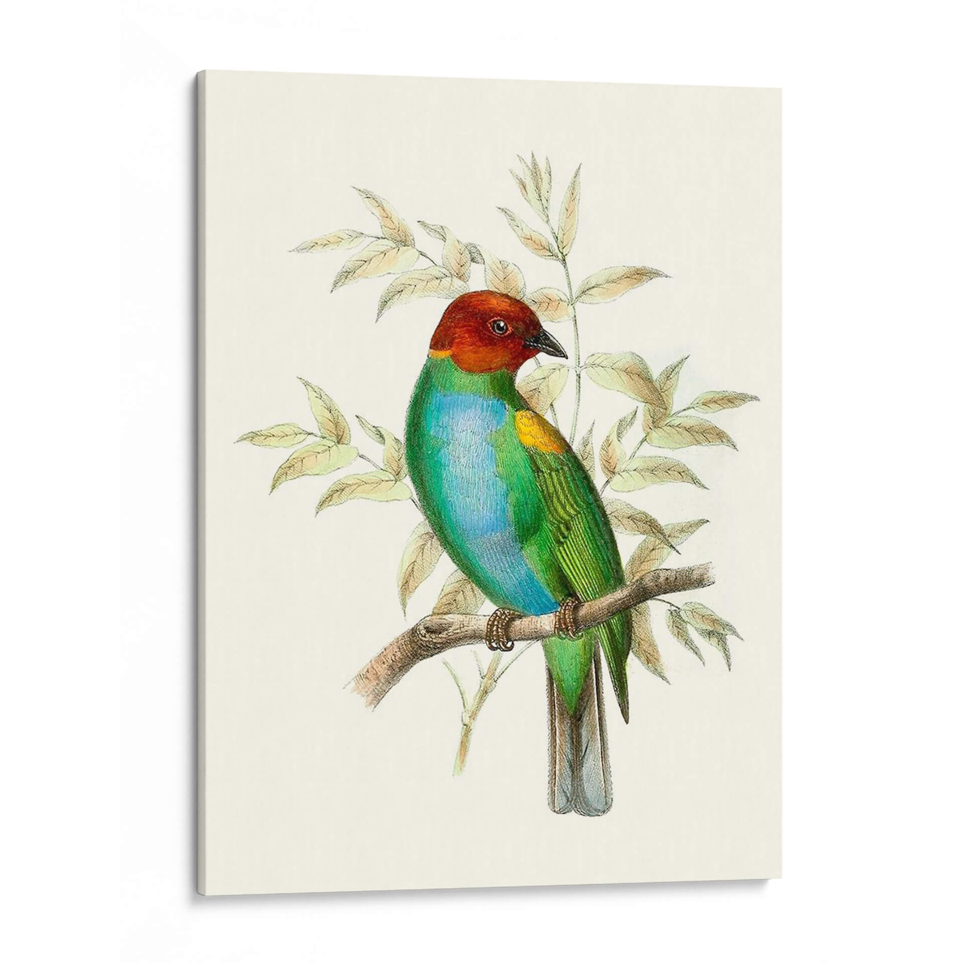 Embellece tu hogar u oficina con este cautivador cuadro decorativo que presenta un vibrante pájaro posado en una rama. La obra captura la delicadeza de la naturaleza con un estilo que recuerda a las ilustraciones botánicas clásicas. Un protagonista de plumaje en tonos intensos de verde esmeralda, azul turquesa y un llamativo capuchón rojo, se erige sobre una rama de aspecto rústico, rodeado de sutiles hojas en tonos ocre y beige. La paleta de colores, aunque rica, se mantiene armoniosa, creando una atmósfera de serenidad y conexión con el mundo natural. La composición se centra en la figura del ave, logrando un equilibrio perfecto entre el detalle y la simplicidad del fondo neutro, lo que permite que el sujeto principal resalte. Este cuadro es ideal para añadir un toque de color y elegancia a cualquier espacio, desde una sala de estar moderna hasta un estudio o dormitorio que busque inspiración y calma. Su diseño atemporal lo convierte en una pieza versátil, perfecta para quienes aprecian la belleza de la fauna y el arte con un toque de clasicismo. Transforma tus paredes en una galería personal con esta obra que evoca la tranquilidad y la majestuosidad de las aves en su hábitat.