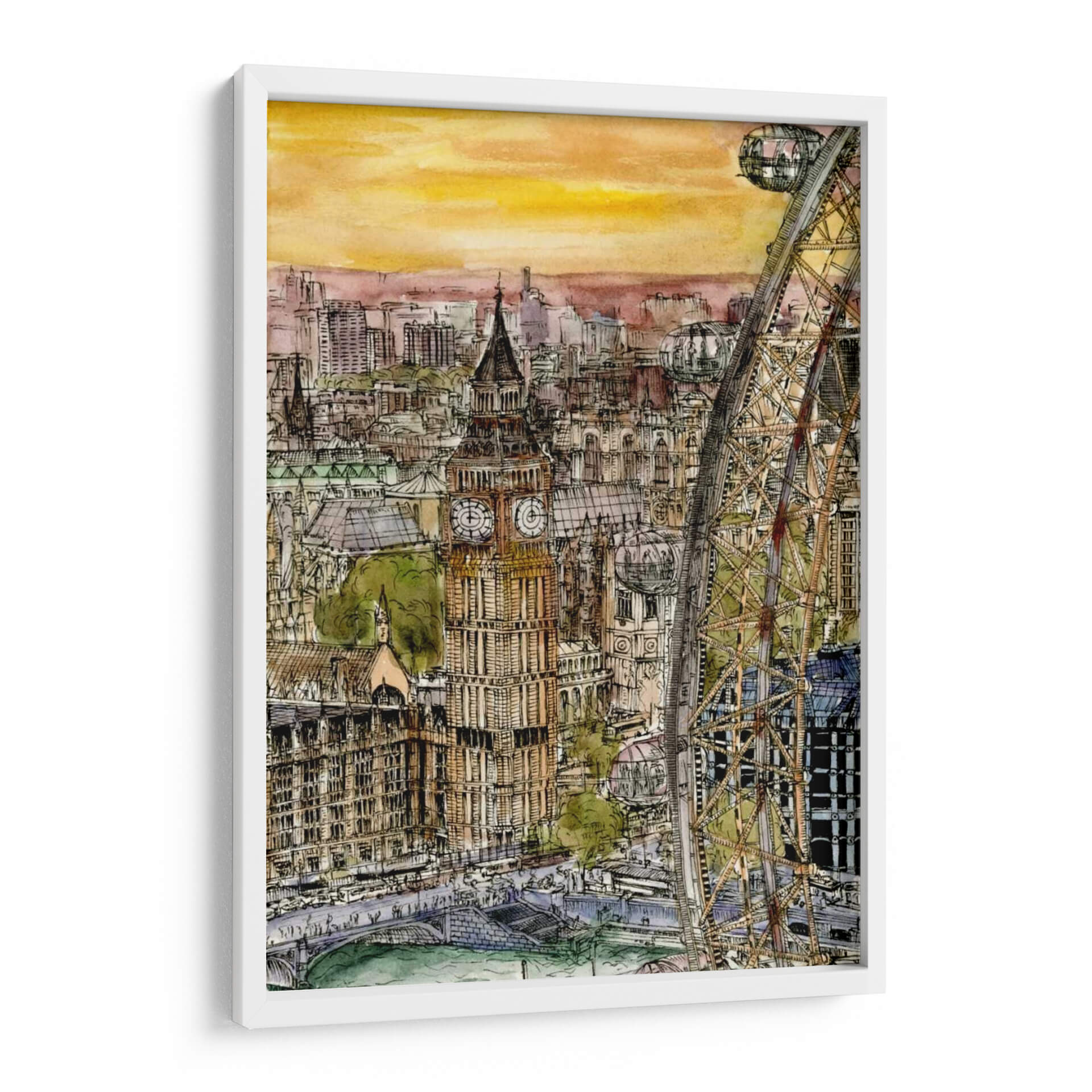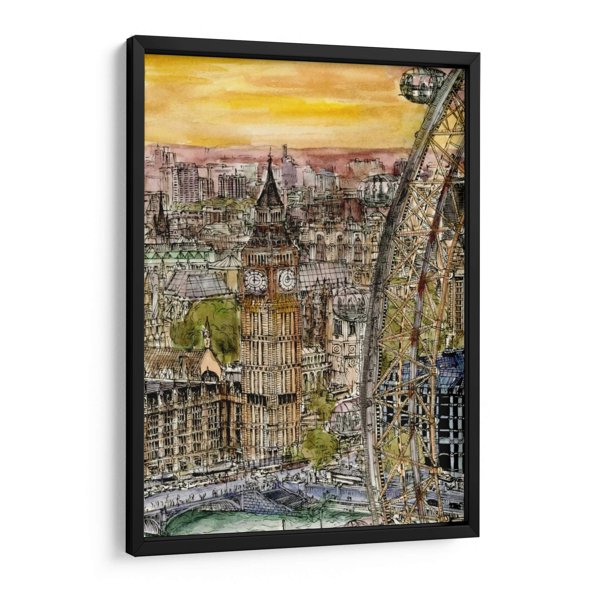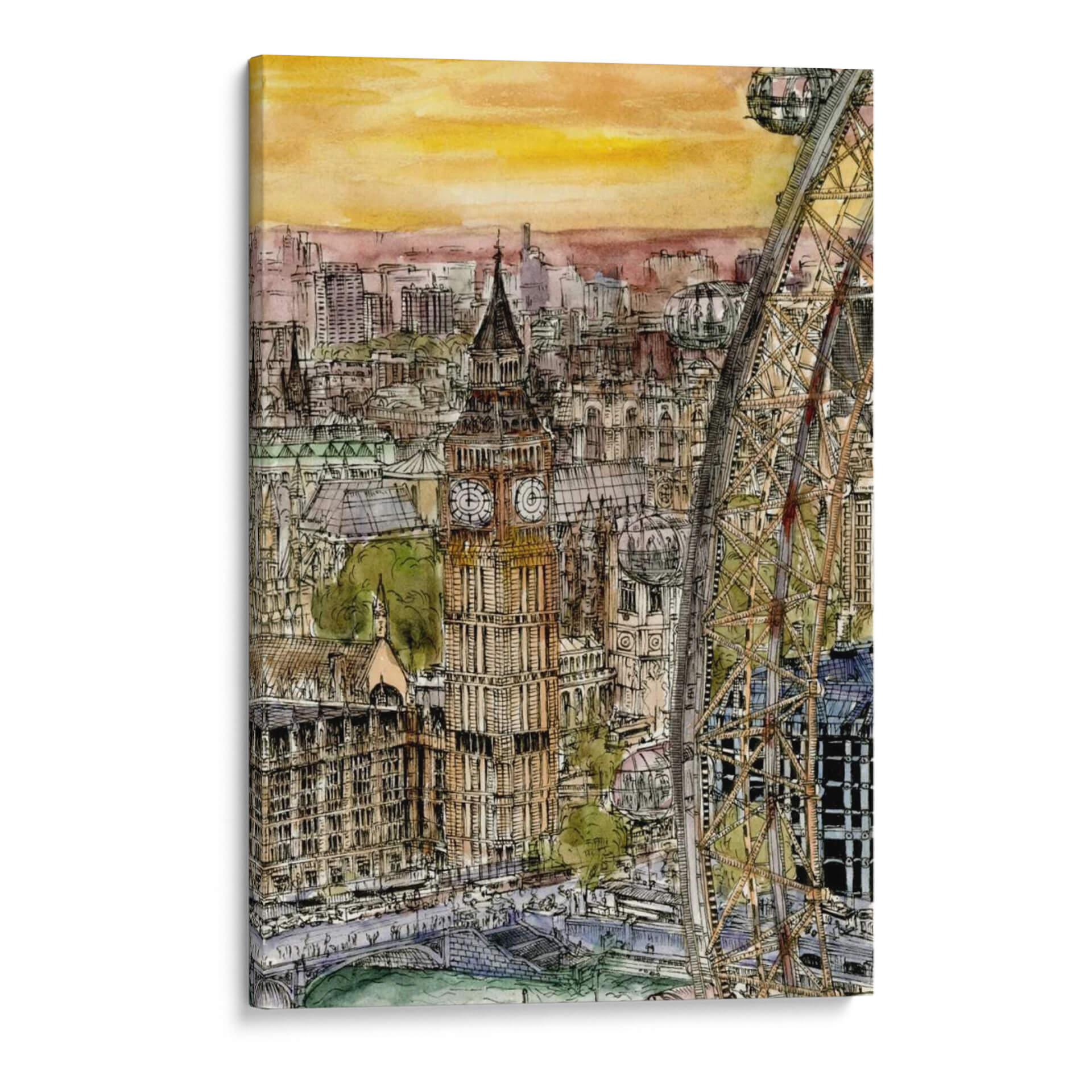 Transporta tu espacio a las vibrantes calles de Londres con este cautivador cuadro decorativo "Escena De La Ciudad Iv", obra de la talentosa artista Melissa Wang. Esta pieza captura la majestuosidad arquitectónica y el dinamismo urbano con un estilo que fusiona la precisión del dibujo a tinta con la delicadeza de la acuarela. Observa cómo los icónicos edificios, incluido el emblemático Big Ben, se alzan contra un cielo de tonos cálidos y anaranjados, evocando la atmósfera de un atardecer o amanecer en la capital británica. La composición detallada, con la imponente noria de Londres como elemento destacado, invita a sumergirse en cada rincón de la escena, descubriendo la vida y el movimiento de la ciudad. Los colores, predominantemente terrosos y ocres con toques de verde y azul, crean una paleta rica y sofisticada que aporta calidez y carácter a cualquier ambiente. Este cuadro decorativo es ideal para aquellos que buscan añadir un toque de cosmopolitismo y elegancia a su hogar u oficina, sirviendo como un punto focal que inspira conversaciones y transporta a sus espectadores a momentos memorables o anhelados viajes. Una adición perfecta para amantes de la arquitectura, viajeros y quienes aprecian el arte urbano con un toque distintivo y emotivo.