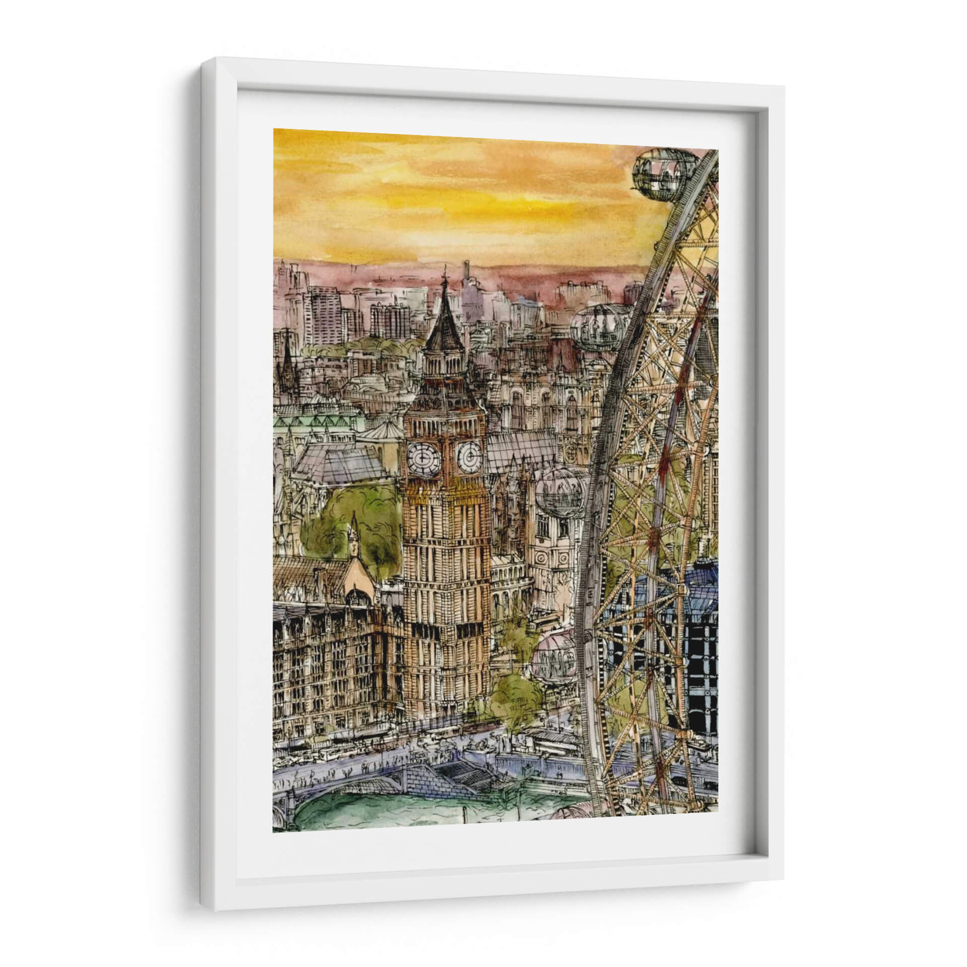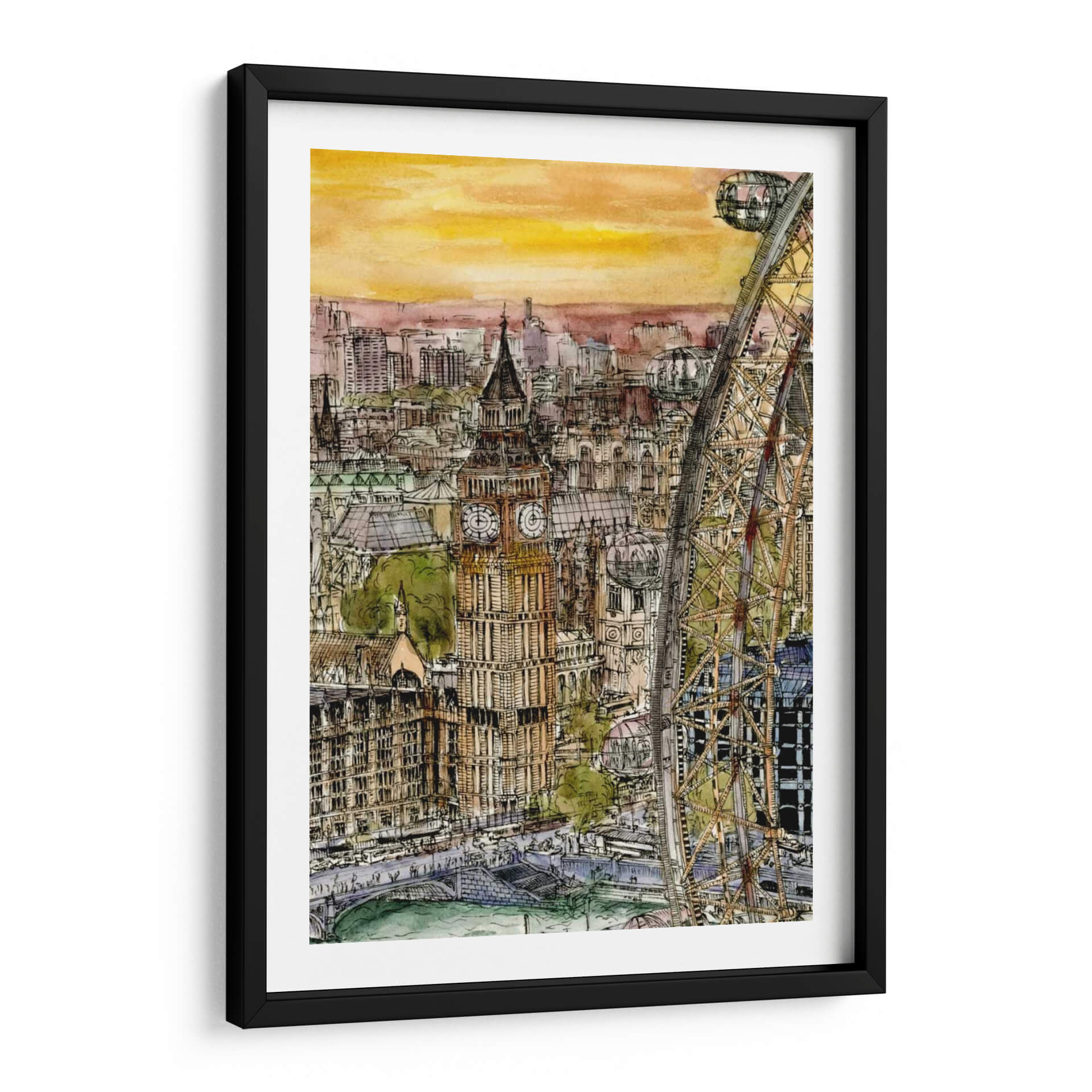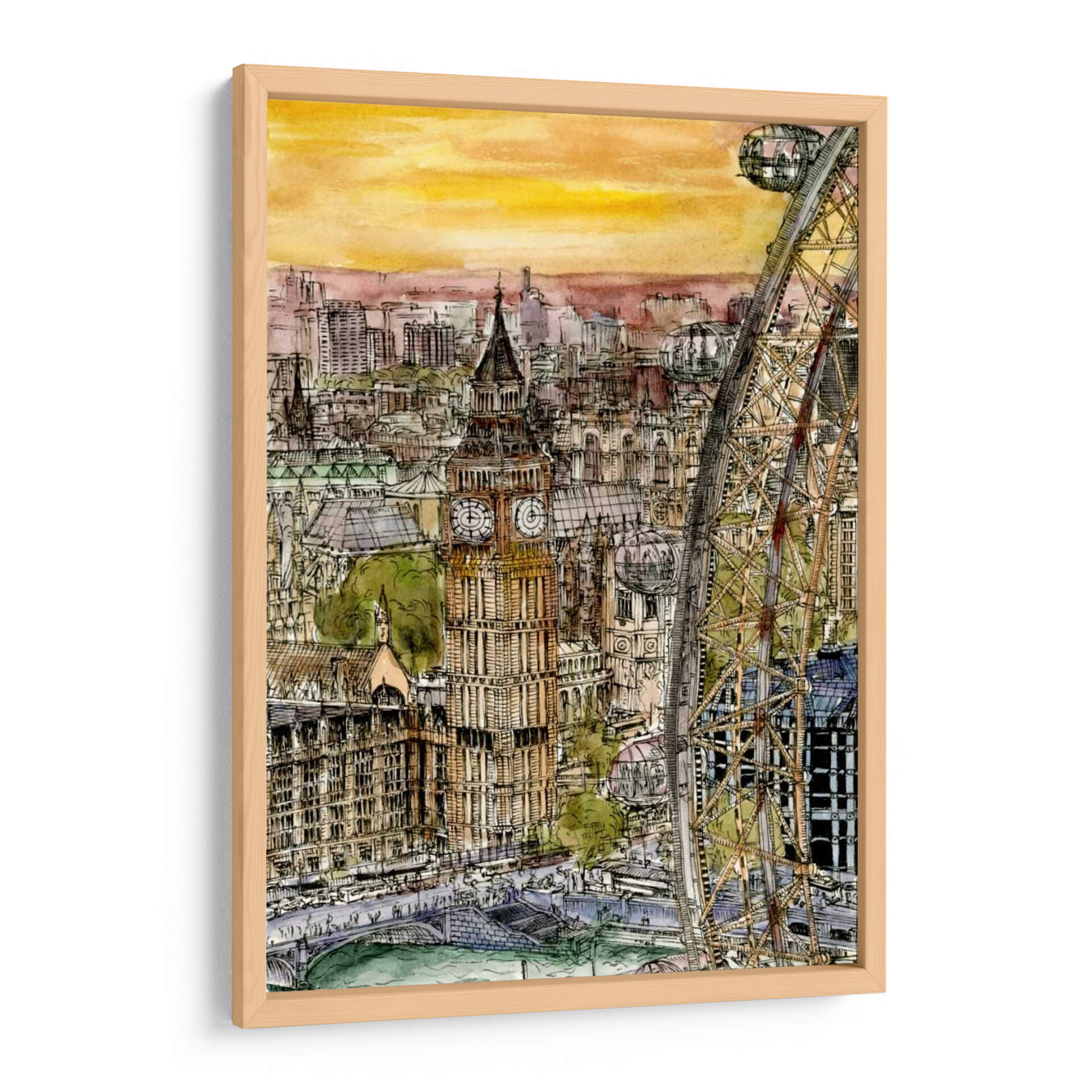 Transporta tu espacio a las vibrantes calles de Londres con este cautivador cuadro decorativo "Escena De La Ciudad Iv", obra de la talentosa artista Melissa Wang. Esta pieza captura la majestuosidad arquitectónica y el dinamismo urbano con un estilo que fusiona la precisión del dibujo a tinta con la delicadeza de la acuarela. Observa cómo los icónicos edificios, incluido el emblemático Big Ben, se alzan contra un cielo de tonos cálidos y anaranjados, evocando la atmósfera de un atardecer o amanecer en la capital británica. La composición detallada, con la imponente noria de Londres como elemento destacado, invita a sumergirse en cada rincón de la escena, descubriendo la vida y el movimiento de la ciudad. Los colores, predominantemente terrosos y ocres con toques de verde y azul, crean una paleta rica y sofisticada que aporta calidez y carácter a cualquier ambiente. Este cuadro decorativo es ideal para aquellos que buscan añadir un toque de cosmopolitismo y elegancia a su hogar u oficina, sirviendo como un punto focal que inspira conversaciones y transporta a sus espectadores a momentos memorables o anhelados viajes. Una adición perfecta para amantes de la arquitectura, viajeros y quienes aprecian el arte urbano con un toque distintivo y emotivo.
