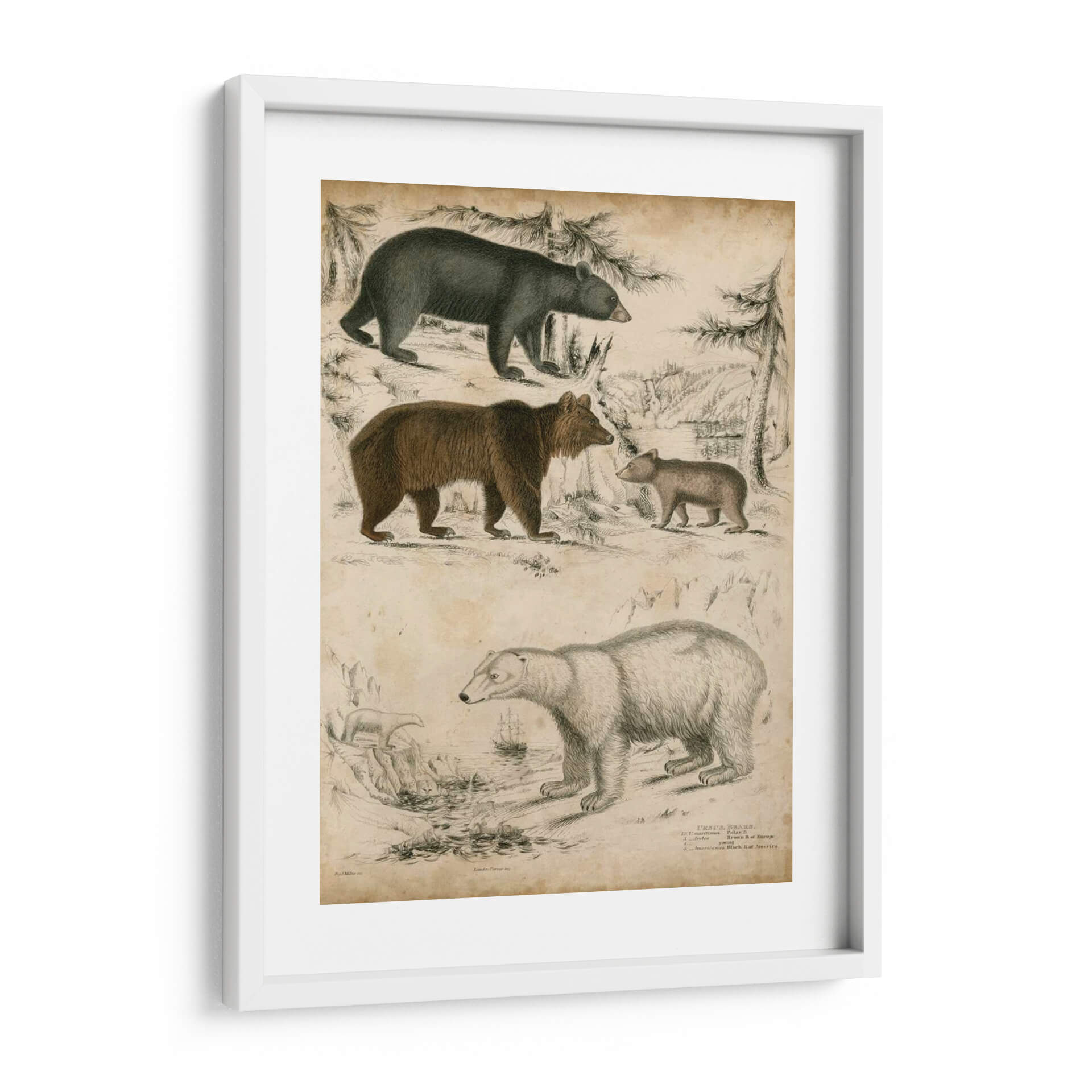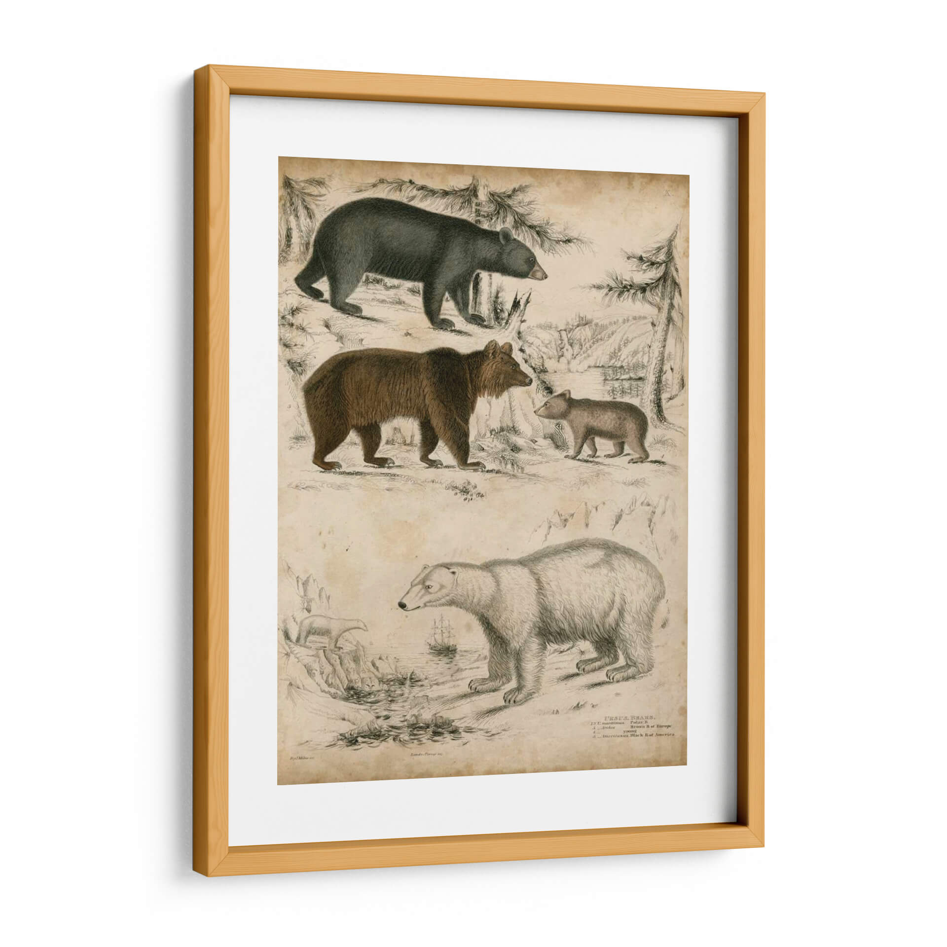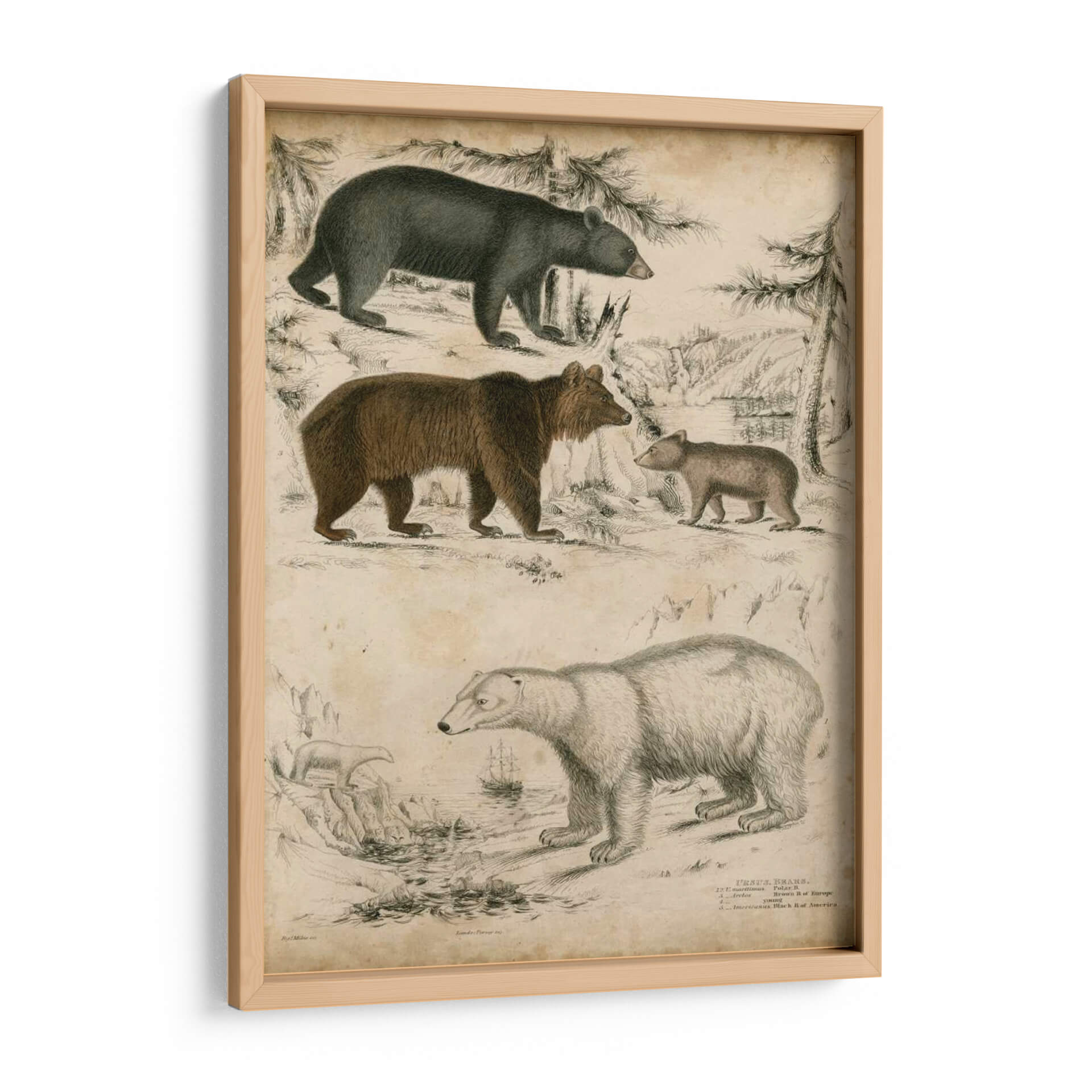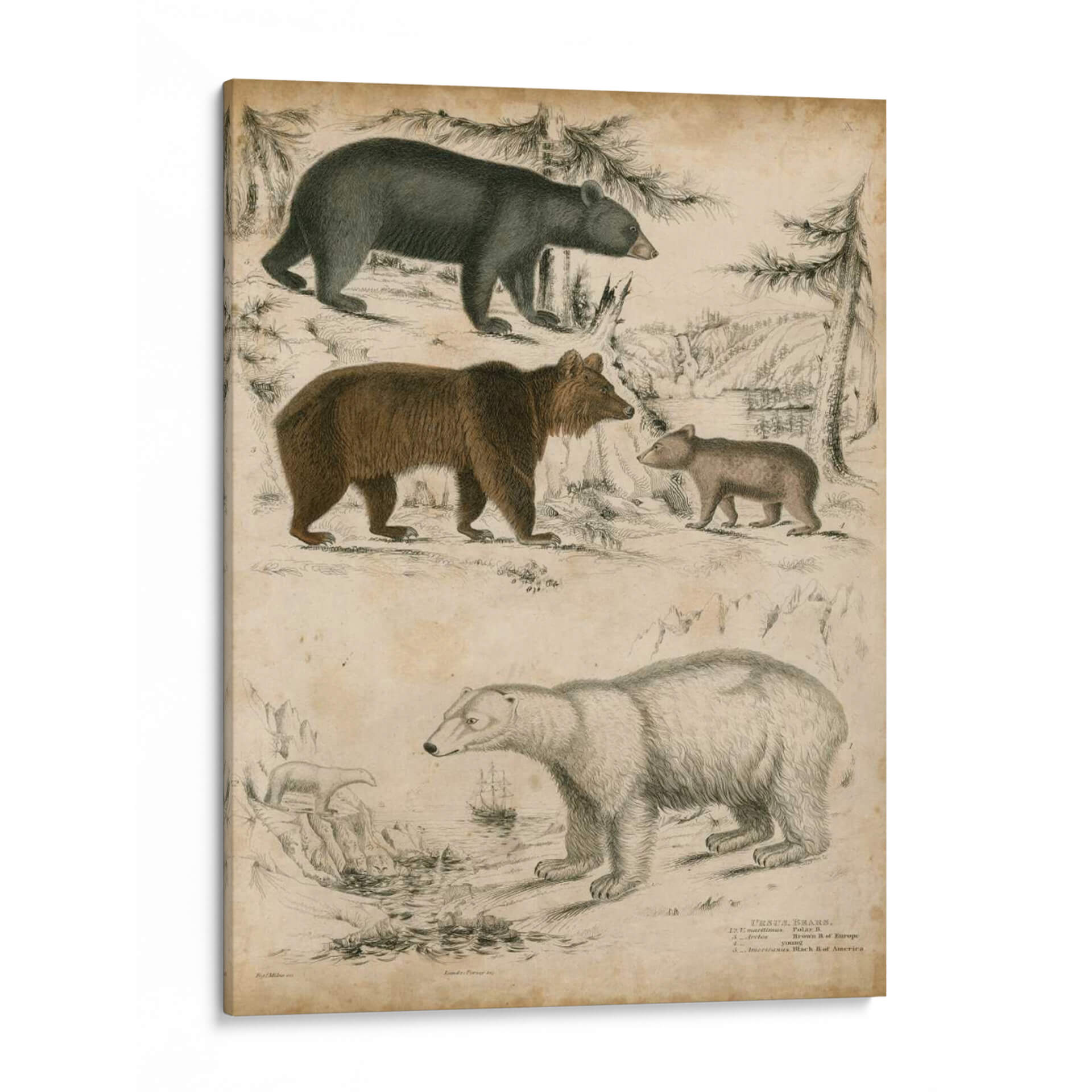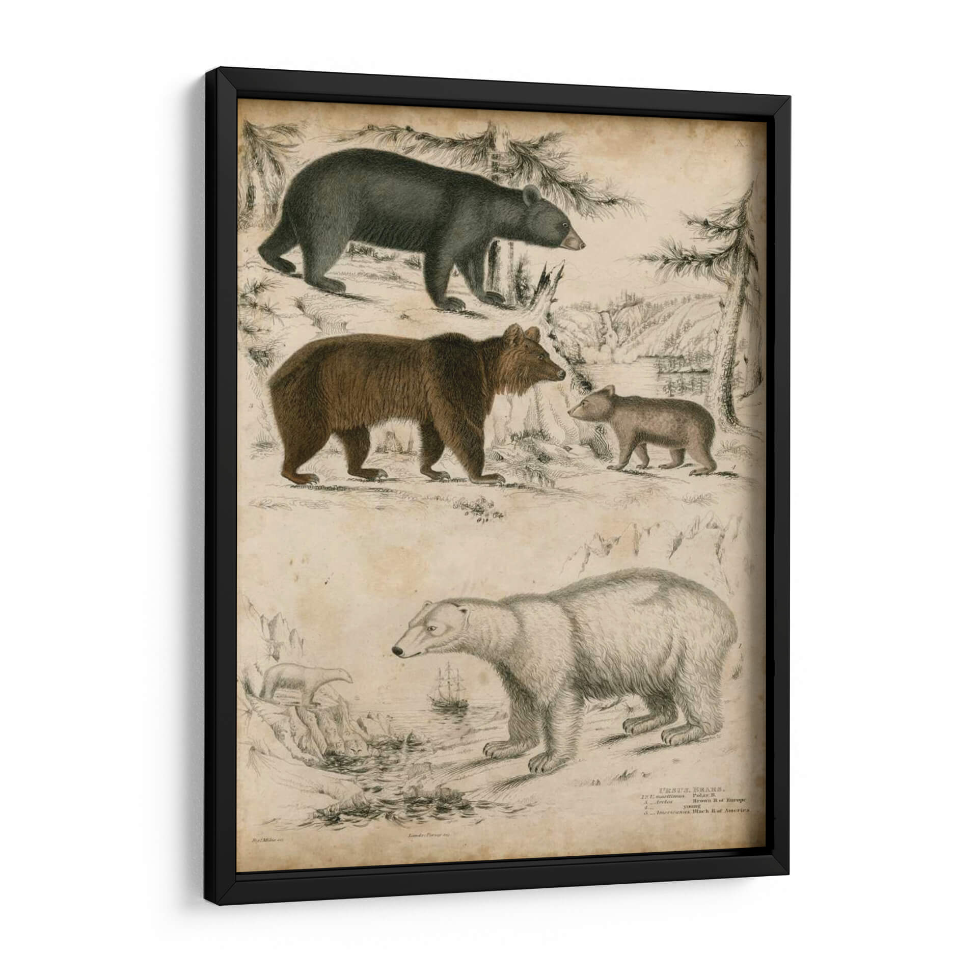 Sumérgete en la majestuosidad de la naturaleza con este cautivador cuadro decorativo que presenta diversas especies de osos en su hábitat natural. La obra, con un estilo que evoca las ilustraciones científicas clásicas, despliega una paleta de colores tierra y grises sobre un fondo envejecido que añade un toque de autenticidad histórica. En la parte superior, un oso negro imponente se mueve en un entorno boscoso, mientras que debajo, un oso pardo y su cría pasean por un paisaje nevado, evocando la ternura familiar y la fuerza de la vida salvaje. La sección inferior nos transporta a las regiones polares, con un oso polar solitario observando un paisaje helado y acuático con un velero a lo lejos. Esta pieza es perfecta para añadir un aire de sofisticación natural y un toque de aventura a cualquier espacio, ya sea una sala de estar, un estudio o una oficina. Su detallada representación y su atmósfera serena invitan a la contemplación y al aprecio por la vida animal, convirtiéndola en un punto focal educativo y estético. Ideal para amantes de la naturaleza, la historia y el arte con carácter.