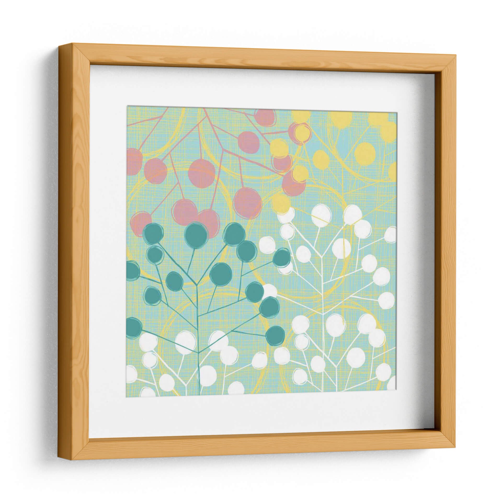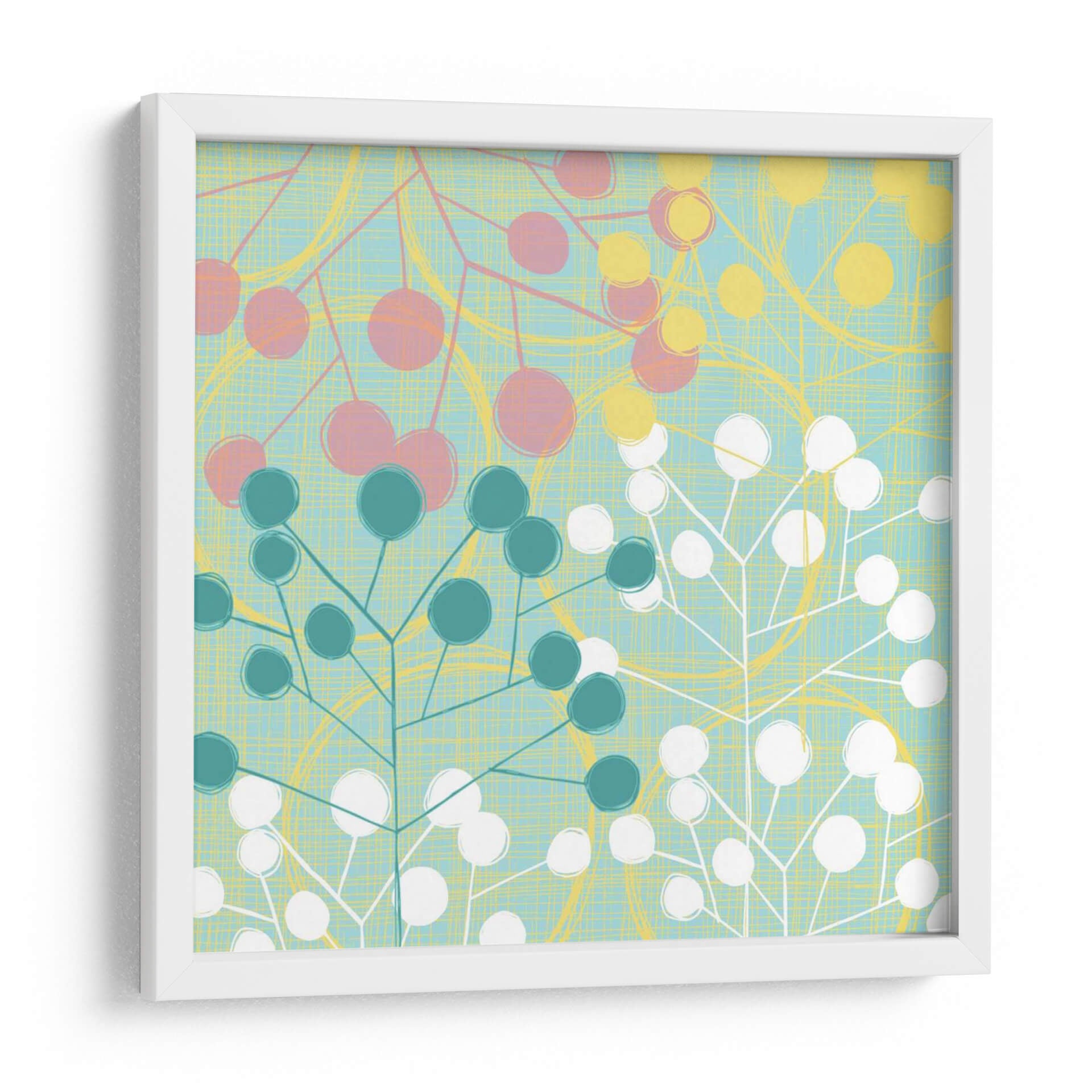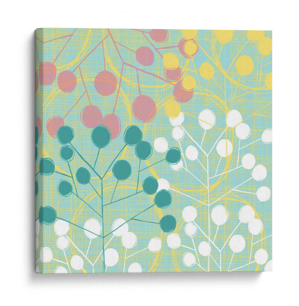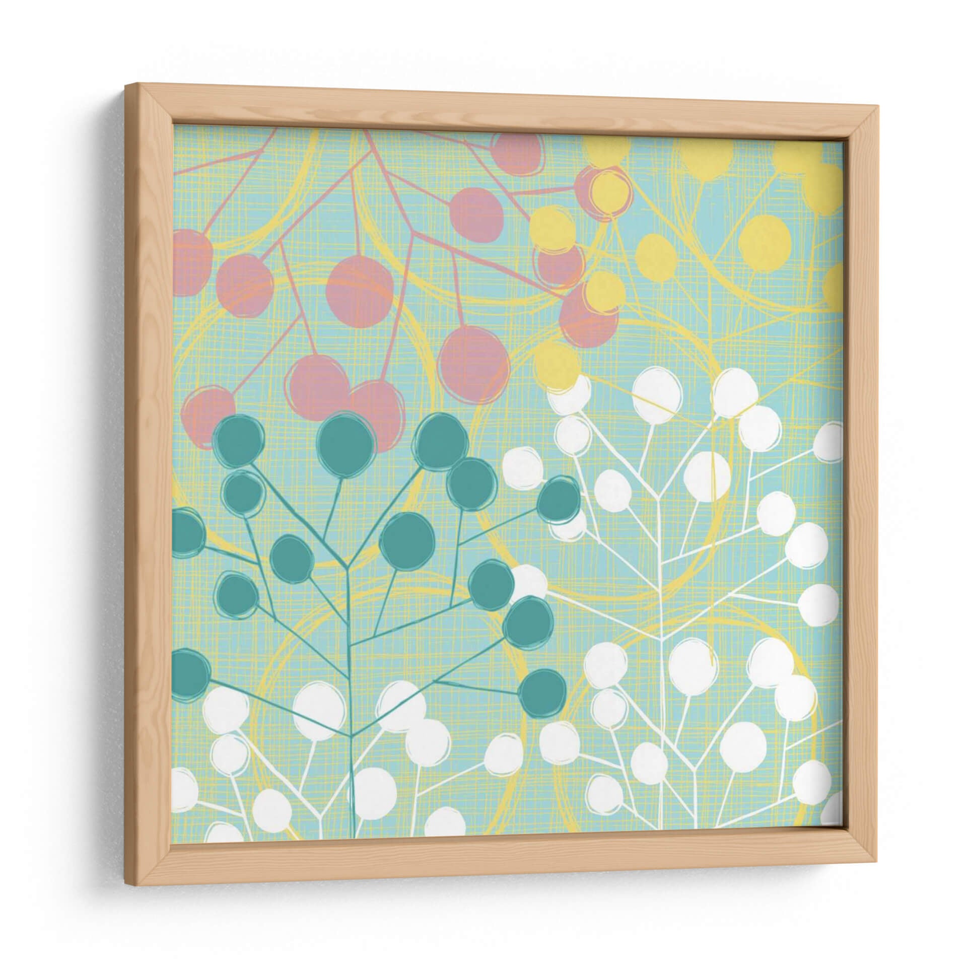 Sumérgete en la delicadeza botánica de 'Estampando Flores II', una obra de Ali Benyon que captura la esencia de la primavera con un estilo moderno y abstracto. Este cuadro decorativo presenta un fondo de textura suave en un sereno tono azul verdoso, sobre el cual se despliegan ramas estilizadas adornadas con grupos de círculos de colores vibrantes. Verás delicados racimos de flores en tonos rosa pálido, amarillo brillante, verde azulado y blanco puro, cada uno con un contorno ligeramente imperfecto que añade un toque artesanal y orgánico. Las finas líneas amarillas y blancas que se entrelazan sutilmente por todo el lienzo aportan profundidad y movimiento, evocando la sensación del viento meciendo las flores. La composición es equilibrada y alegre, transmitiendo una atmósfera de calma y renovación. Ideal para añadir un toque de color y vida a cualquier estancia, desde un salón moderno hasta un dormitorio acogedor o una oficina luminosa, este cuadro decorativo es una invitación a la contemplación de la belleza natural a través de una perspectiva artística contemporánea. Su diseño versátil lo convierte en la elección perfecta para quienes buscan una pieza que combine sofisticación y una pizca de alegría.