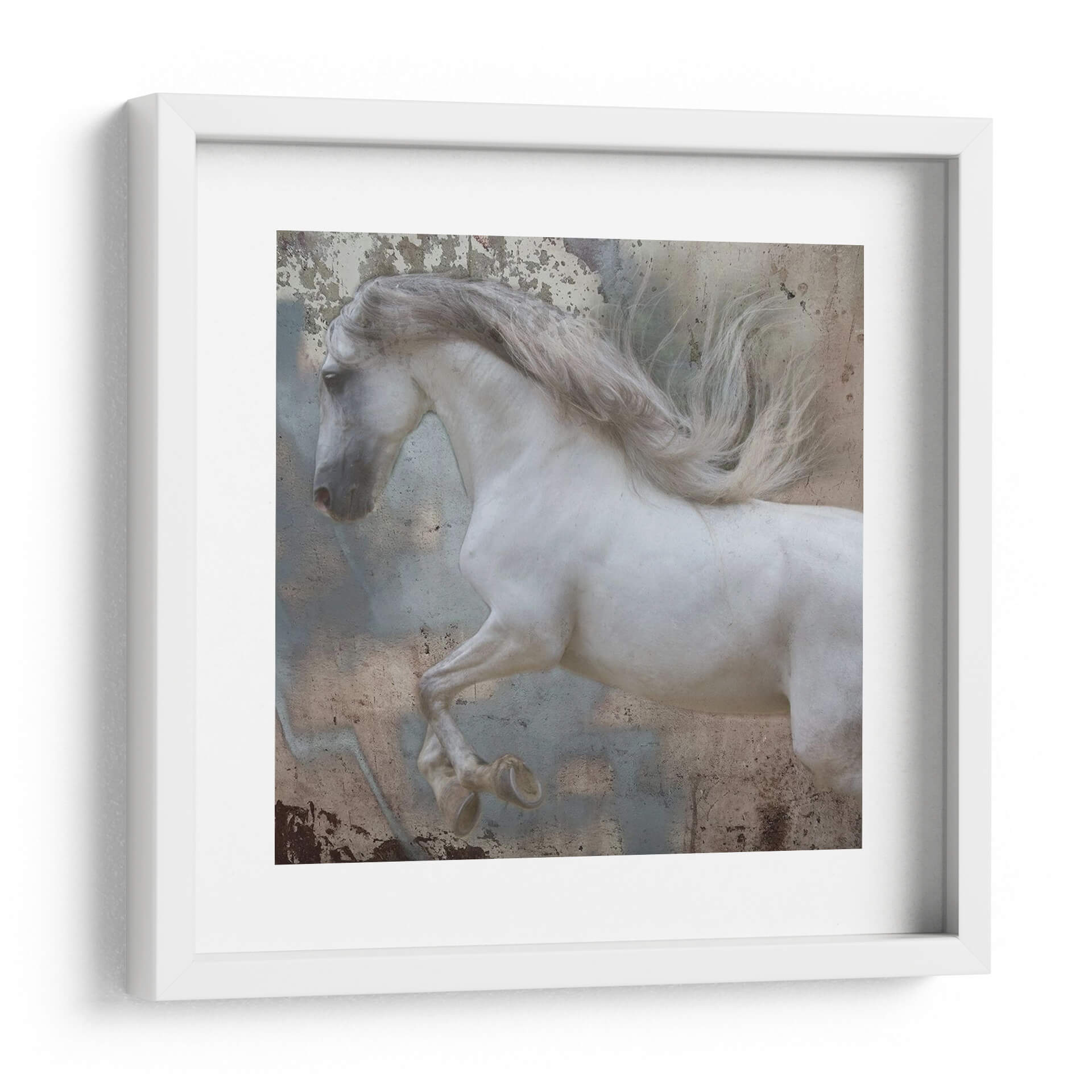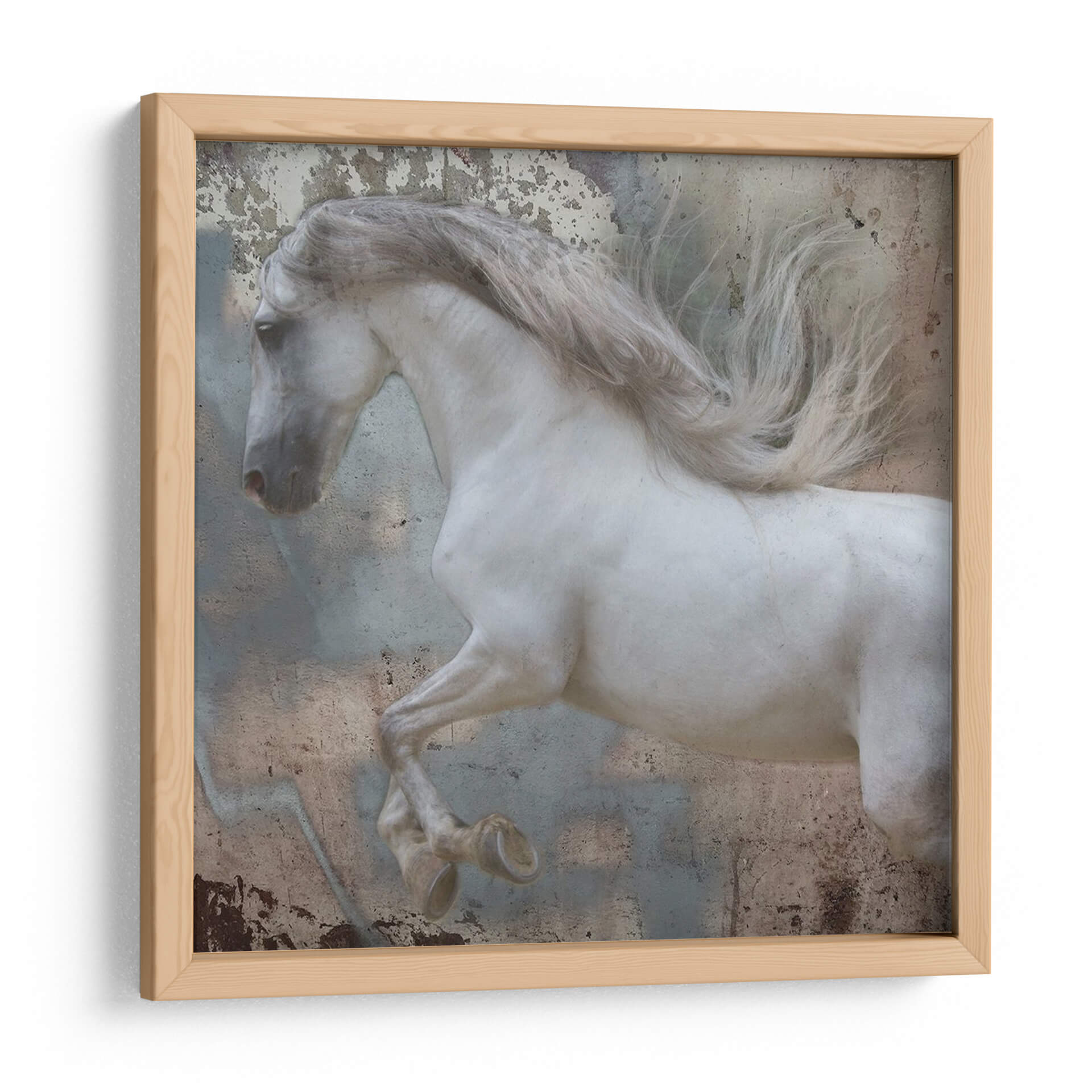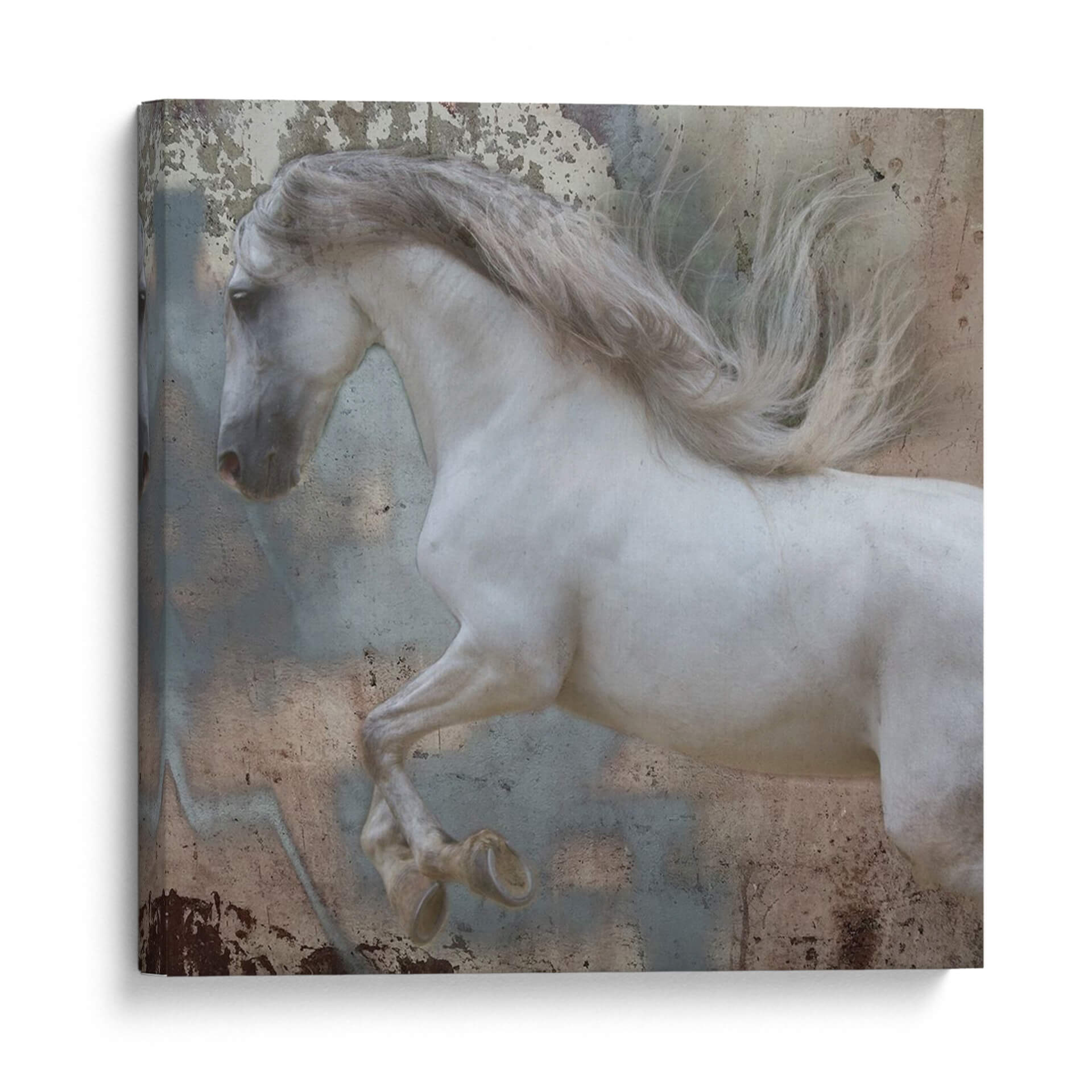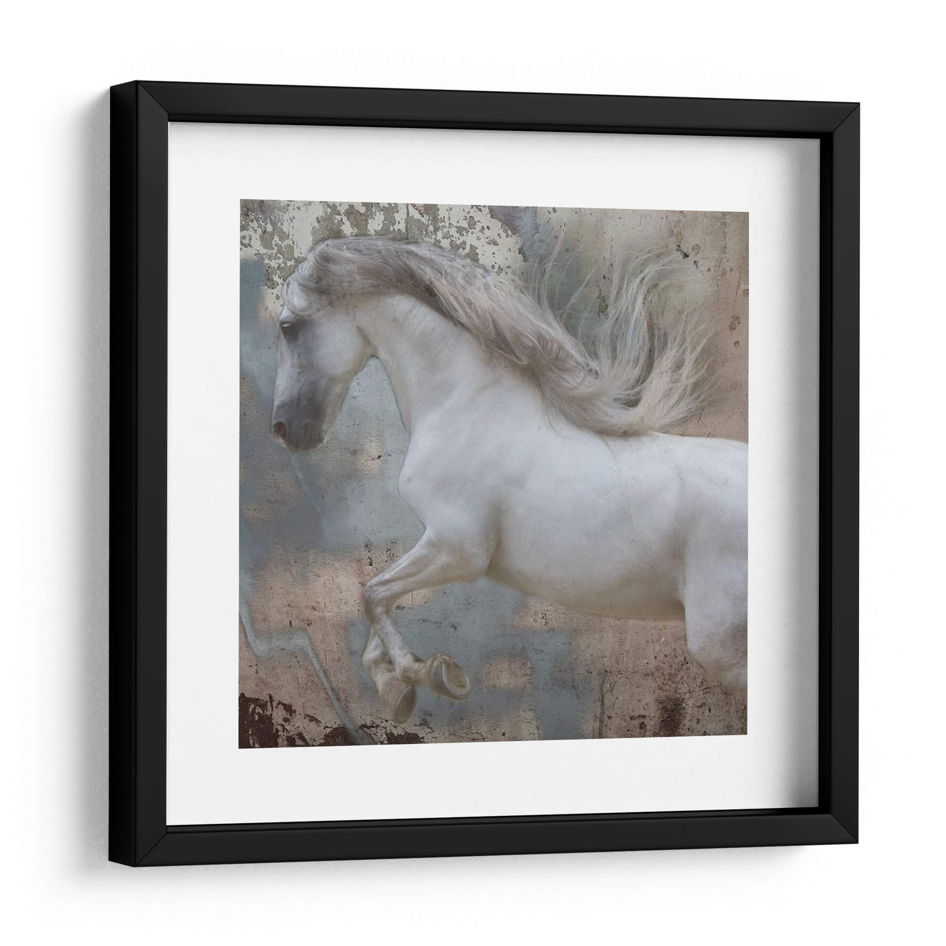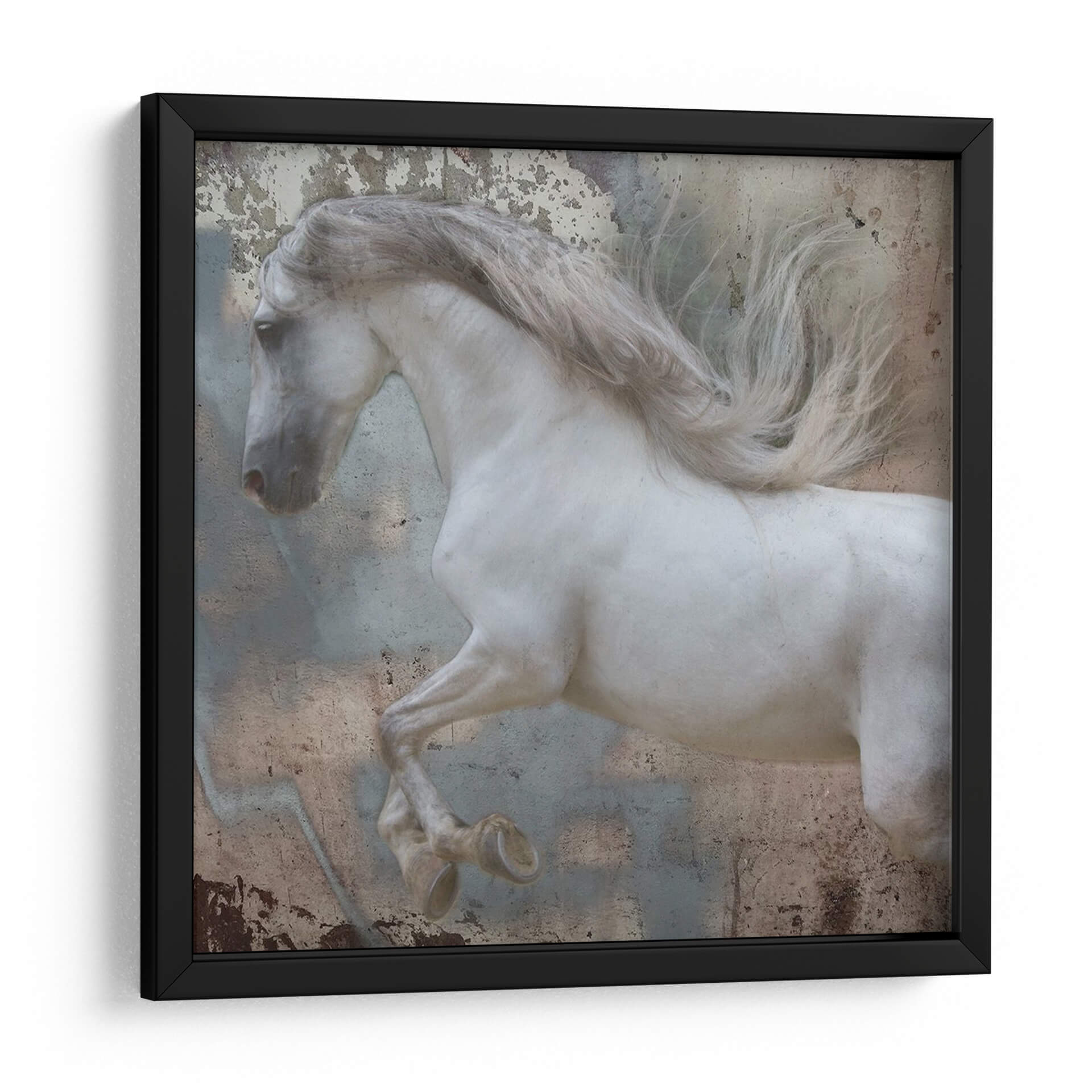 Captura la esencia indómita de la naturaleza con este impresionante cuadro decorativo de un caballo blanco en movimiento. La obra 'Exposiciones De Caballos Iv' de Allen Friedlander presenta una majestuosa criatura equina, cuyo pelaje blanco resalta contra un fondo texturizado con matices grises, ocres y toques de azul deslavado. La composición dinámica evoca una sensación de libertad y poder, con el caballo en pleno galope, su crin ondeando al viento y sus músculos tensos por la acción. La paleta de colores, aunque sutil, crea una atmósfera evocadora que combina la pureza del blanco con la rusticidad de la textura del fondo, sugiriendo un contraste entre lo salvaje y lo refinado. Este cuadro decorativo es ideal para añadir un toque de elegancia y energía a salones modernos, estudios o entradas principales, convirtiéndose en un punto focal que inspira admiración y evoca la belleza atemporal de estos magníficos animales. Su estilo, que fusiona lo figurativo con elementos abstractos en el fondo, lo hace versátil para diversos estilos de decoración contemporánea.