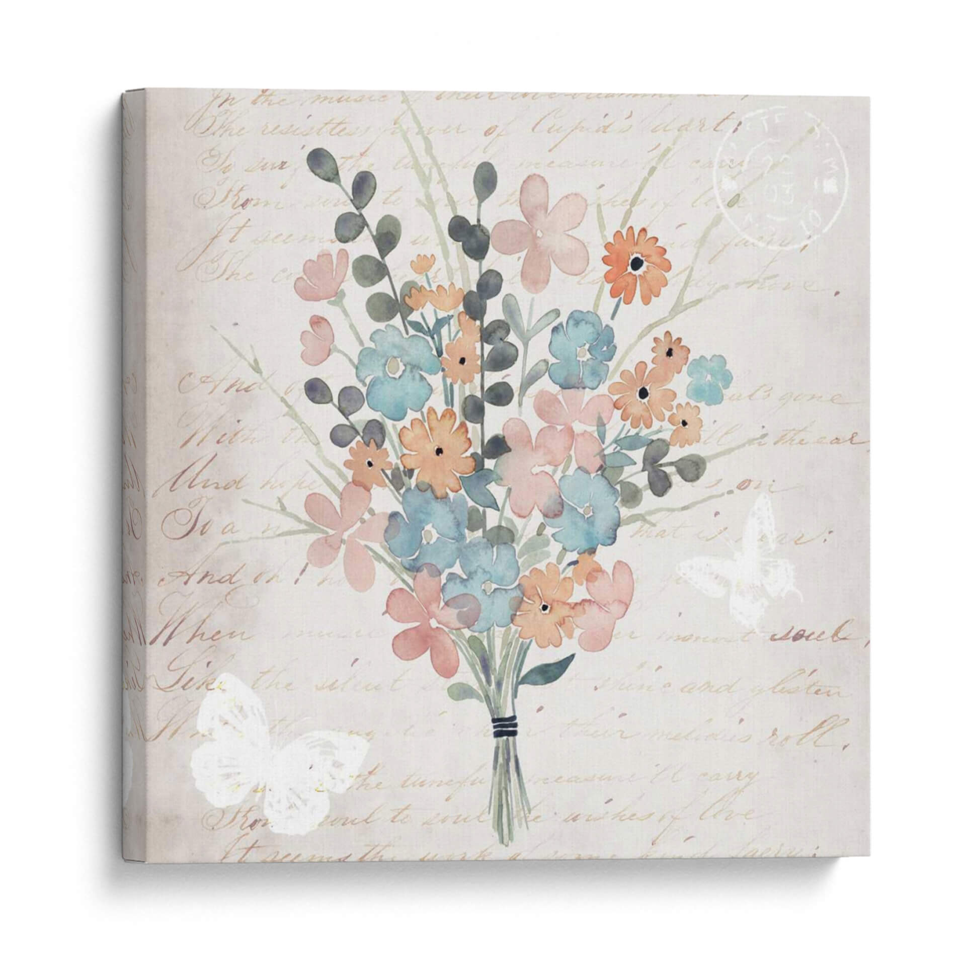 Inunda tu hogar de delicadeza y encanto con 'Fleurs Pastel II', una obra de arte que captura la serenidad de un ramo de flores silvestres en acuarela. Los suaves tonos pastel de rosas, azules y naranjas se entrelazan con verdes botánicos sobre un fondo que evoca cartas antiguas y caligrafía tenue, añadiendo un toque nostálgico y romántico. Cada pincelada de acuarela transmite ligereza y frescura, creando una atmósfera de calma y belleza natural. Las sutiles mariposas blancas que flotan en el fondo añaden un elemento etéreo, invitando a la contemplación y al ensueño. Este cuadro decorativo es perfecto para quienes buscan infundir a sus espacios una sensación de paz y elegancia atemporal. Ideal para dormitorios, salas de estar o cualquier rincón que necesite un toque de dulzura y sofisticación. 'Fleurs Pastel II' no es solo una pieza decorativa, es una invitación a la tranquilidad y al aprecio por la belleza efímera de la naturaleza, aportando un aire de jardín secreto a tu decoración.