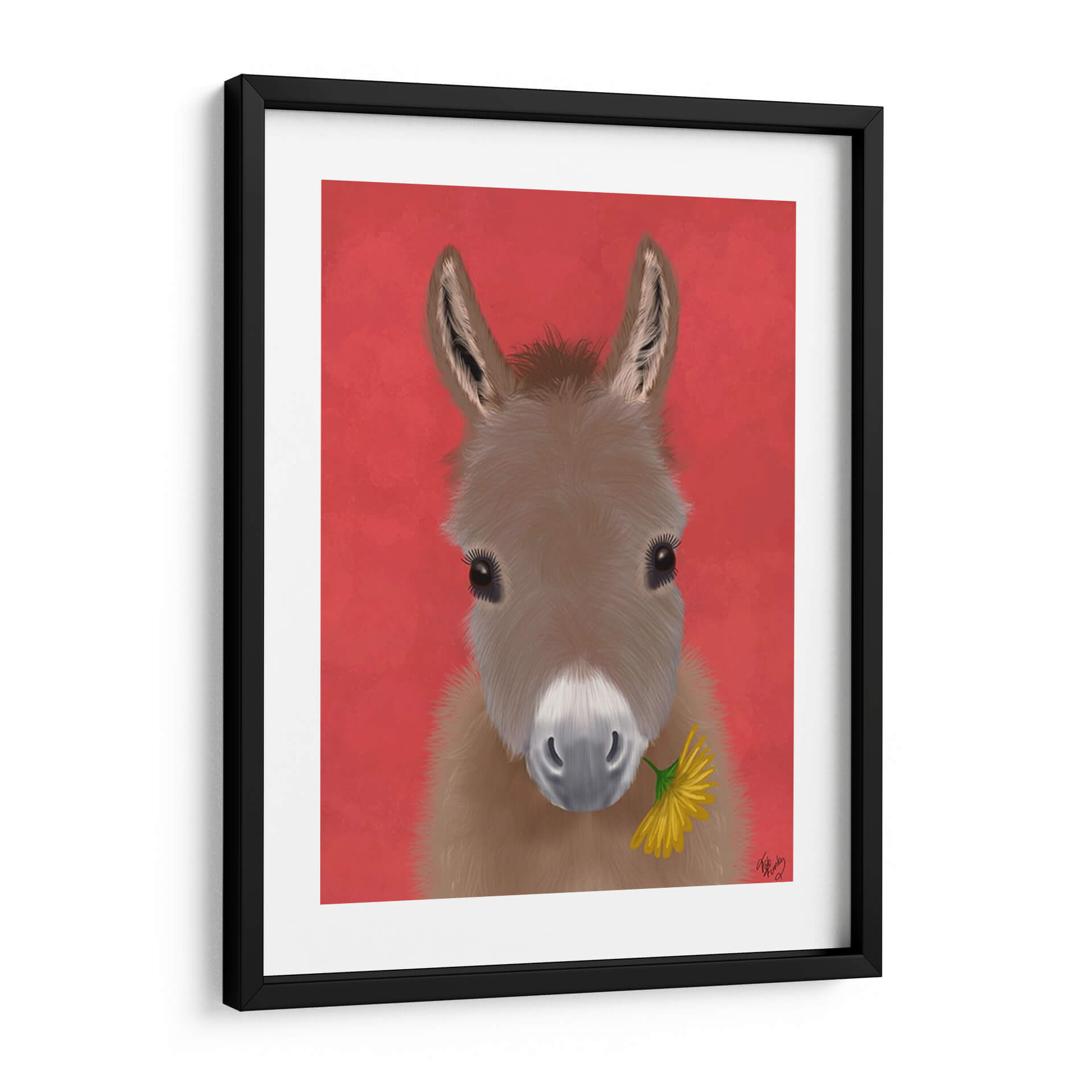 Este encantador cuadro decorativo 'Flor Amarilla Burro' del artista Fab Funky captura la inocencia y ternura de un burro joven con una flor silvestre en su hocico. La obra presenta un primer plano del rostro del animal, con grandes ojos expresivos y orejas puntiagudas, sobre un vibrante fondo rojo texturizado. La paleta de colores, dominada por los tonos marrones y grises del burro y el amarillo brillante de la flor, contrasta maravillosamente con el fondo carmesí, creando una pieza visualmente impactante y llena de personalidad. El estilo artístico, con un toque de realismo y suavidad en el pelaje, evoca una sensación de dulzura y alegría, perfecta para añadir un toque whimsical y cálido a cualquier espacio. Este cuadro es ideal para habitaciones infantiles, salas de estar modernas o cualquier rincón que necesite un estallido de color y carácter. Su composición centrada y el detalle en la textura del pelo invitan a la contemplación y sonríen al observador. Transforma tu hogar con esta pieza única que combina arte contemporáneo con un tema entrañable y juguetón, asegurando conversaciones y admiración.