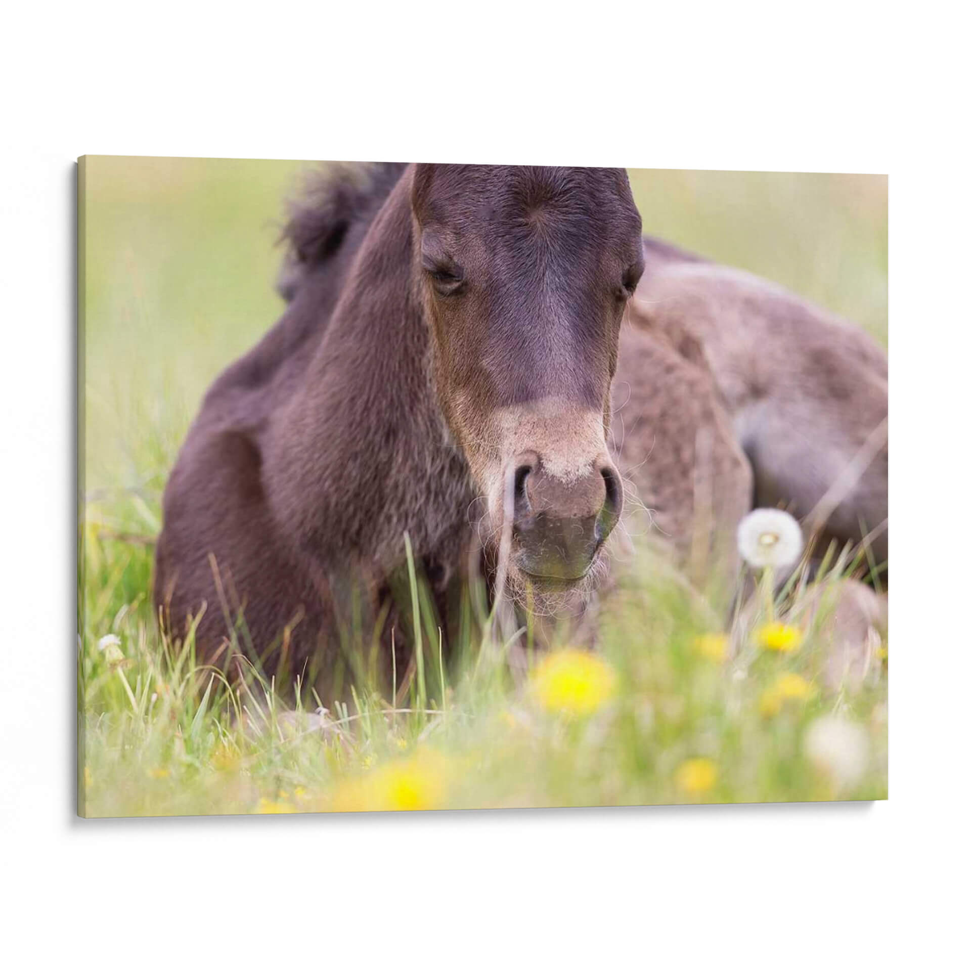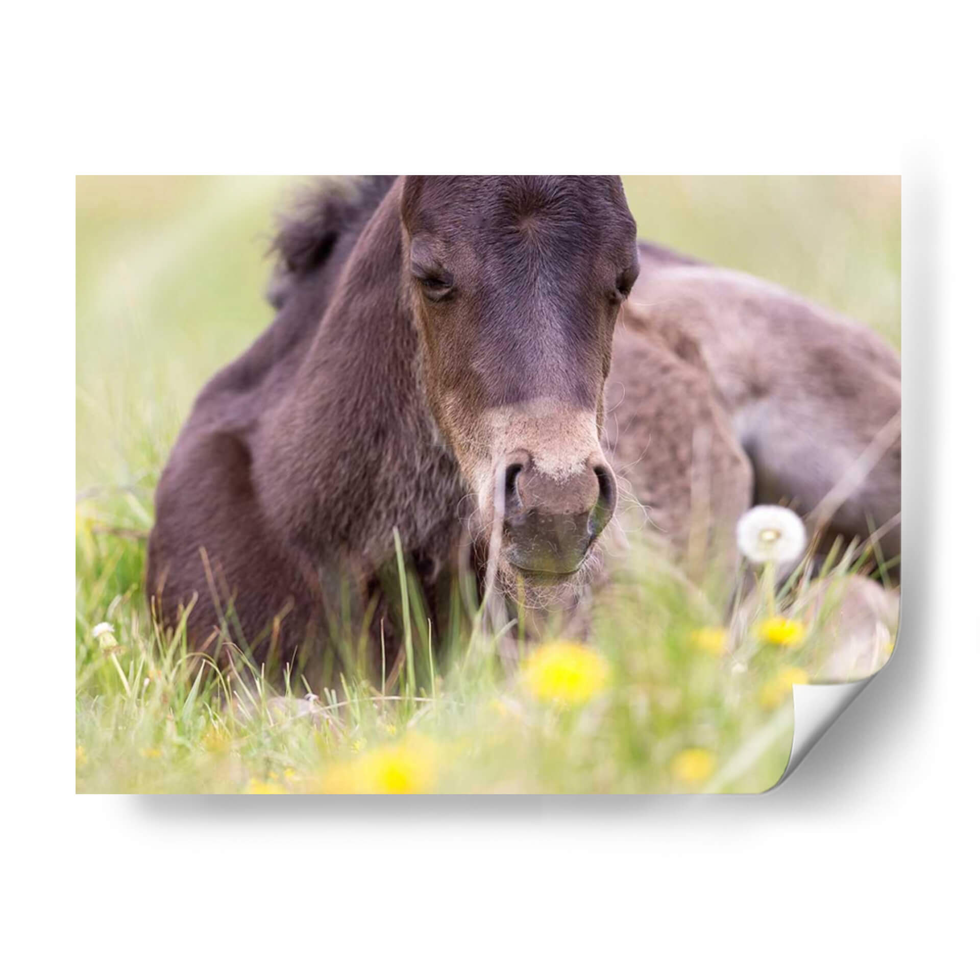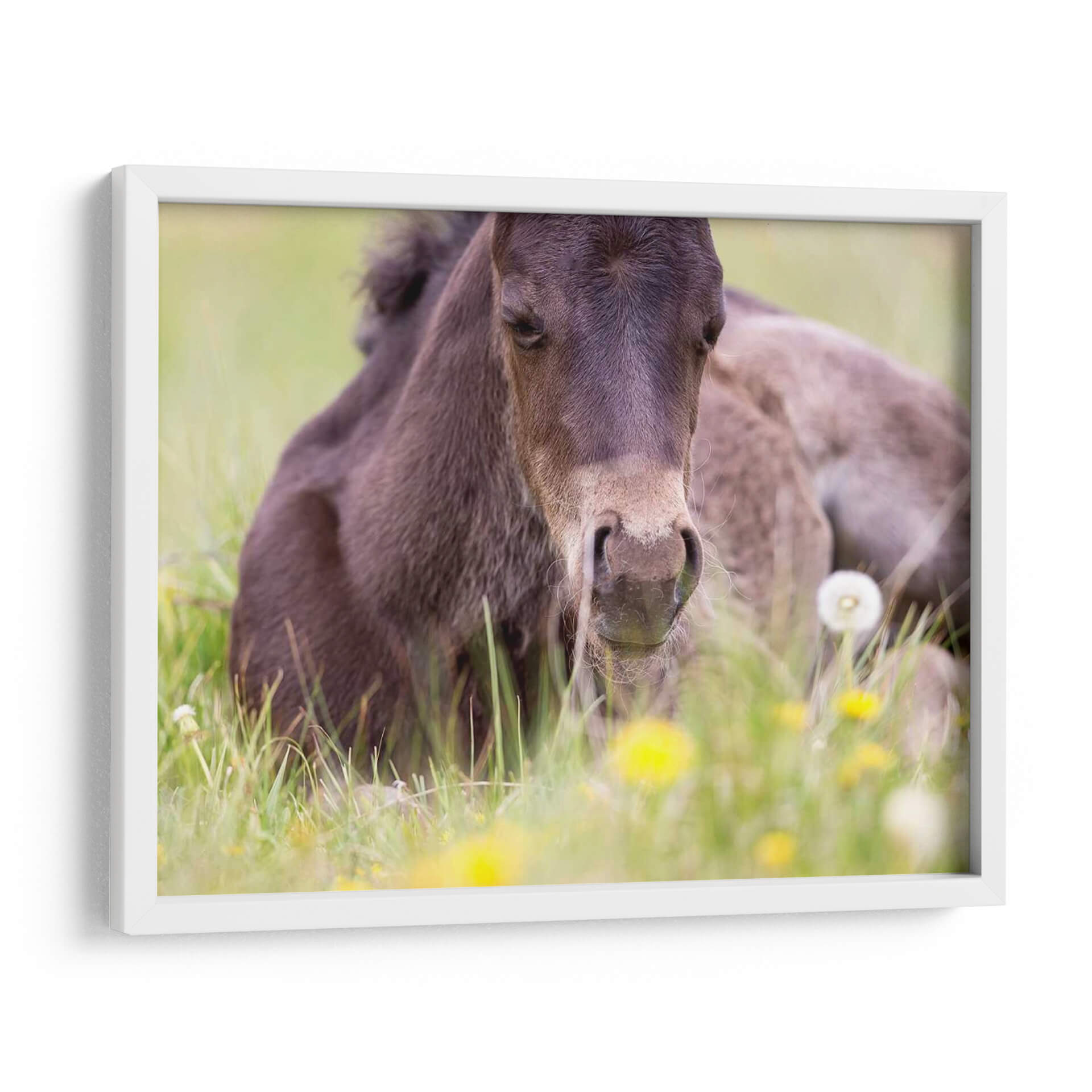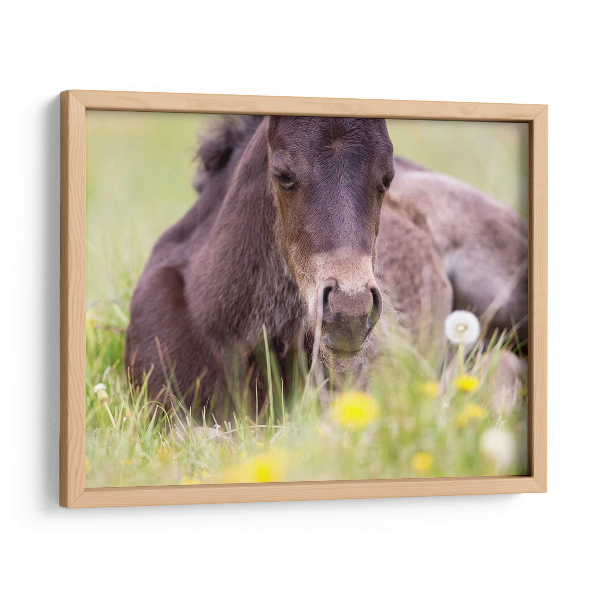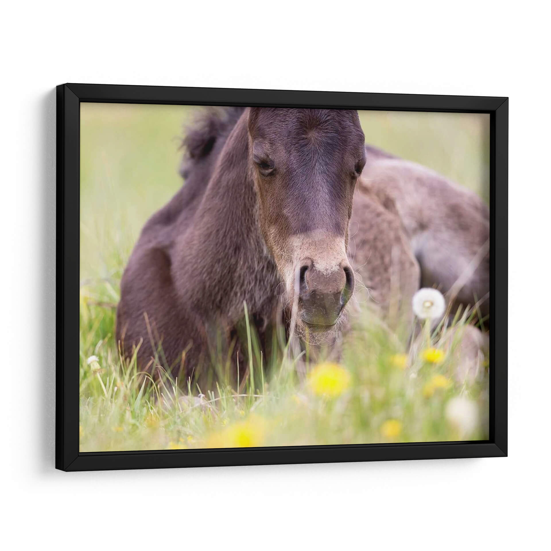 Descubre la ternura y la inocencia con este cautivador cuadro decorativo de un potrillo recostado entre la hierba y flores silvestres. La obra 'Flor Frolick V' de Ozana Sturgeon captura un momento de paz y serenidad en la naturaleza, presentando a un tierno potrillo con pelaje oscuro y ojos soñolientos, rodeado de un entorno verde vibrante salpicado de delicadas flores amarillas y blancas. La suave iluminación y el enfoque selectivo resaltan la textura del pelaje del animal y la frescura del prado, creando una atmósfera de calma y dulzura inigualable. Este cuadro es perfecto para añadir un toque de vida y encanto a cualquier espacio, ya sea una habitación infantil, un dormitorio acogedor o un rincón tranquilo en tu sala de estar. Su estilo fotográfico realista, con un ligero desenfoque en el fondo, dirige toda la atención a la adorable figura central, invitando a la contemplación y a la conexión emocional. Añade esta pieza única a tu colección de arte de pared y transforma tu hogar en un santuario de paz y belleza natural. Es una elección ideal para amantes de los animales y para quienes buscan un arte inspirador y conmovedor.