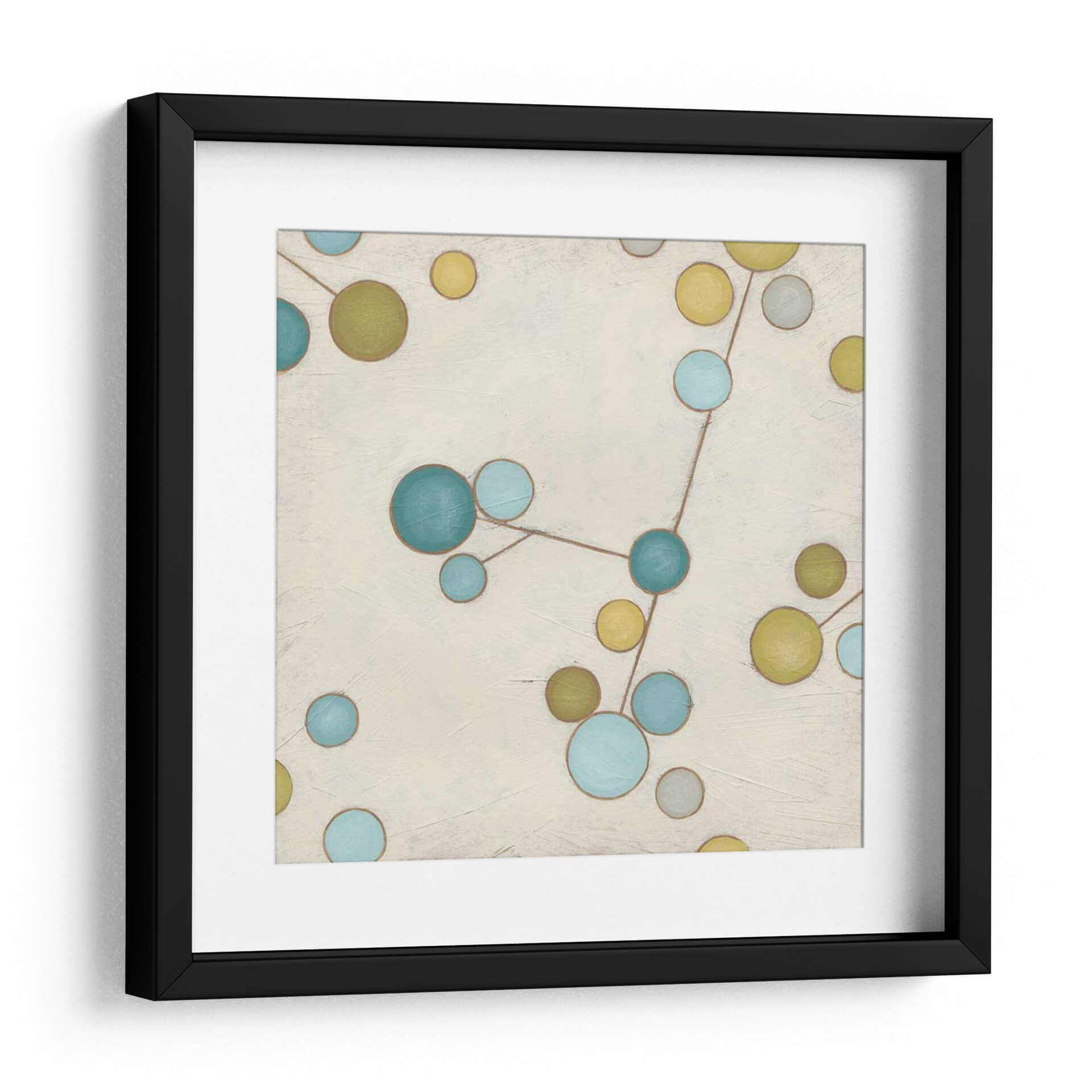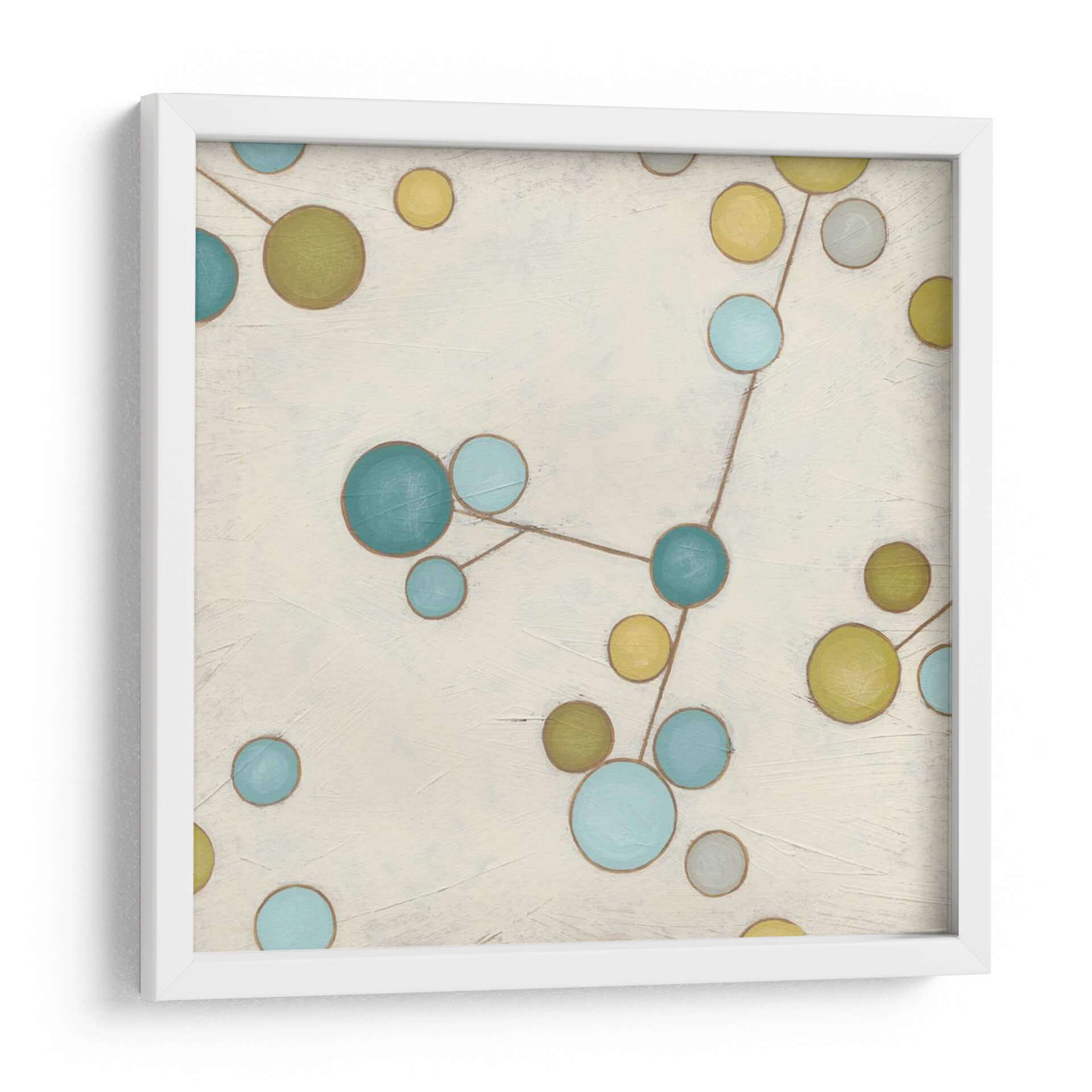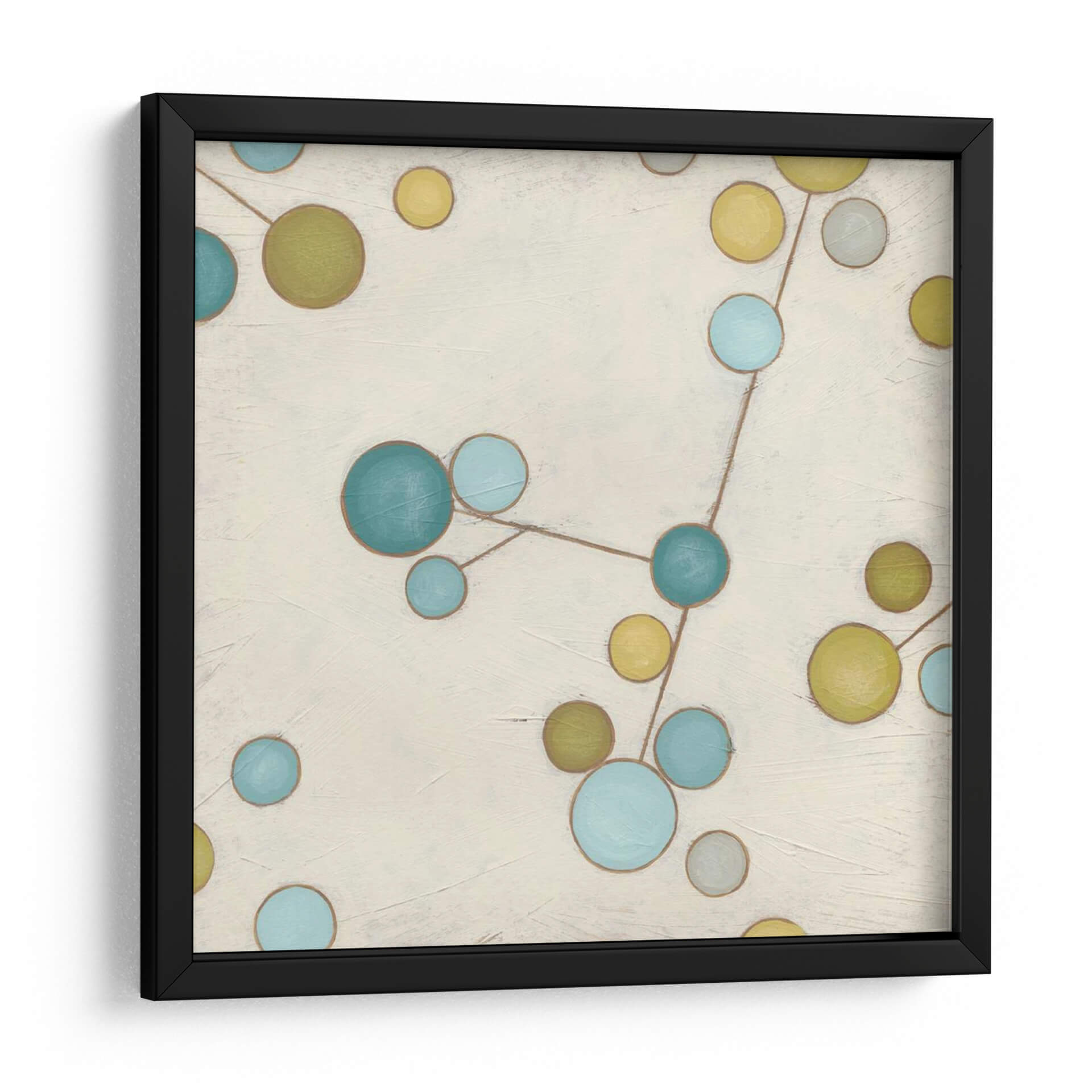 Sumérgete en la belleza etérea de 'Flores Moleculares I', una obra de arte contemporáneo que combina la abstracción con una delicada conexión visual. Las esferas en tonos azul cerúleo, verde oliva y amarillo mostaza se entrelazan a través de finas líneas marrones sobre un lienzo de fondo neutro y texturizado. Esta composición, que recuerda a una constelación o a la estructura de una molécula, evoca una sensación de orden y misterio en el universo. Los colores vibrantes pero suaves crean una atmósfera de calma y reflexión, perfecta para añadir un toque de sofisticación y pensamiento abstracto a tu hogar u oficina. Ideal para espacios modernos, minimalistas o eclécticos, este cuadro decorativo es un punto focal que invita a la contemplación y la conversación. Transforma tu sala de estar, dormitorio o estudio con esta pieza única que fusiona ciencia y arte de manera armoniosa. 'Flores Moleculares I' no es solo una decoración, es una ventana a la intrincada belleza del mundo que nos rodea, capturada con maestría por June Erica Vess.