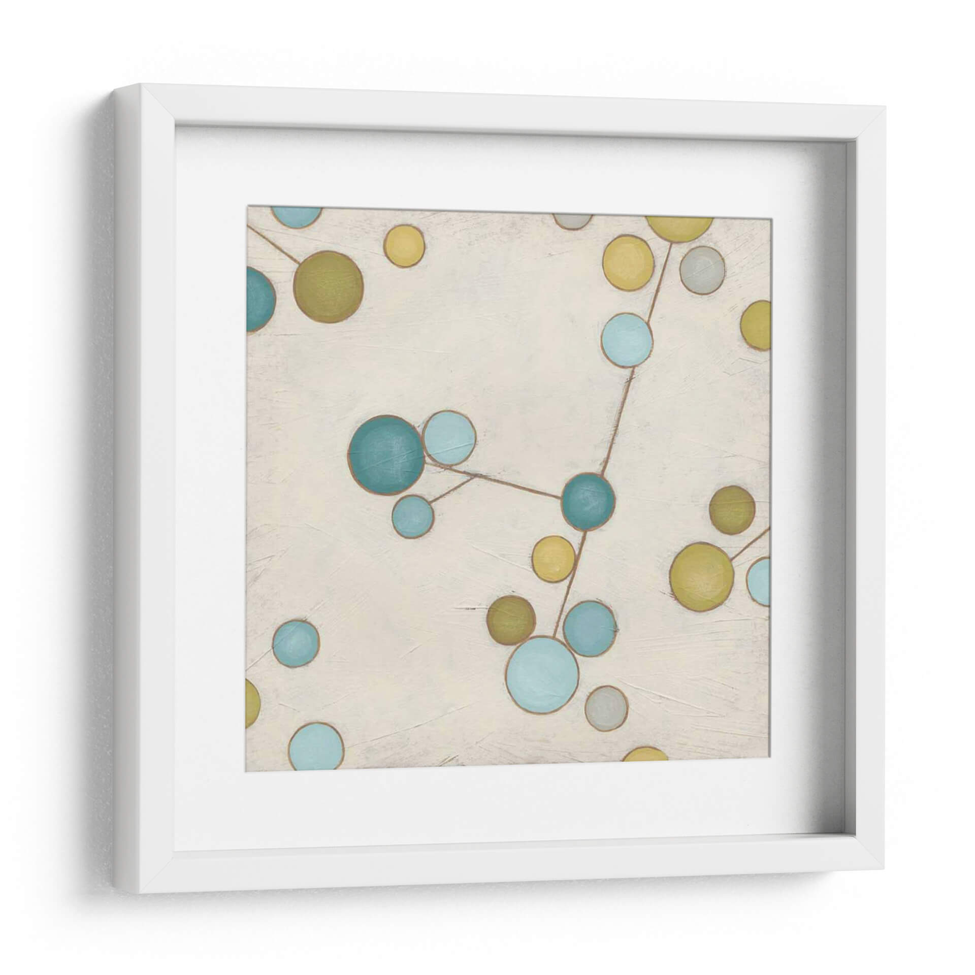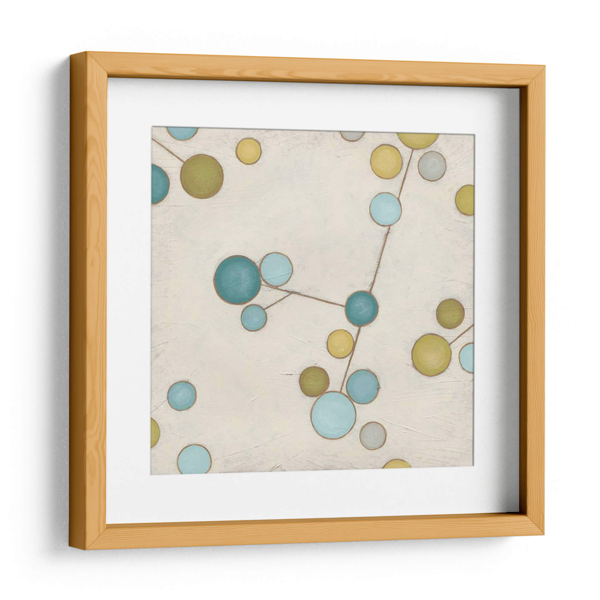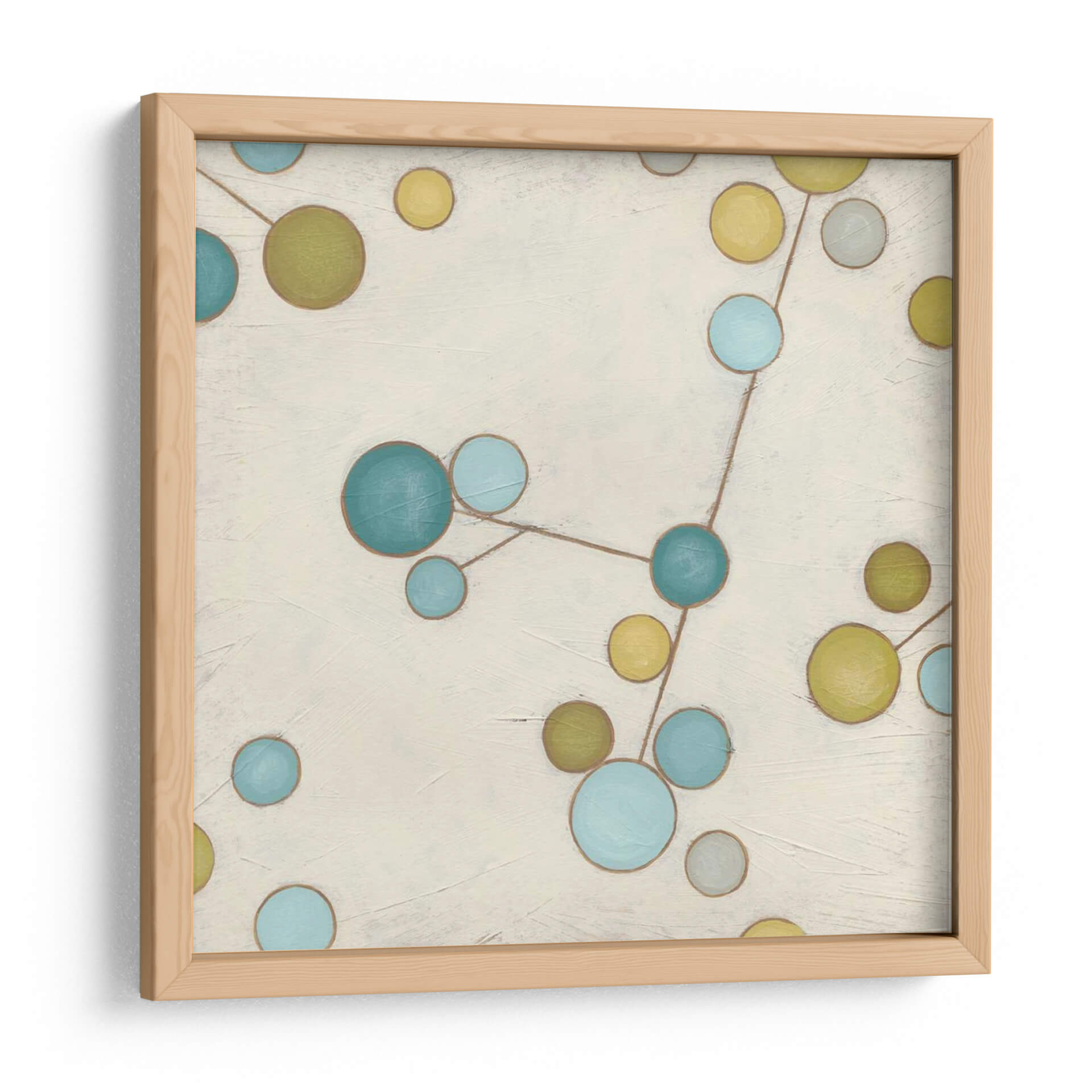 Sumérgete en la belleza etérea de 'Flores Moleculares I', una obra de arte contemporáneo que combina la abstracción con una delicada conexión visual. Las esferas en tonos azul cerúleo, verde oliva y amarillo mostaza se entrelazan a través de finas líneas marrones sobre un lienzo de fondo neutro y texturizado. Esta composición, que recuerda a una constelación o a la estructura de una molécula, evoca una sensación de orden y misterio en el universo. Los colores vibrantes pero suaves crean una atmósfera de calma y reflexión, perfecta para añadir un toque de sofisticación y pensamiento abstracto a tu hogar u oficina. Ideal para espacios modernos, minimalistas o eclécticos, este cuadro decorativo es un punto focal que invita a la contemplación y la conversación. Transforma tu sala de estar, dormitorio o estudio con esta pieza única que fusiona ciencia y arte de manera armoniosa. 'Flores Moleculares I' no es solo una decoración, es una ventana a la intrincada belleza del mundo que nos rodea, capturada con maestría por June Erica Vess.