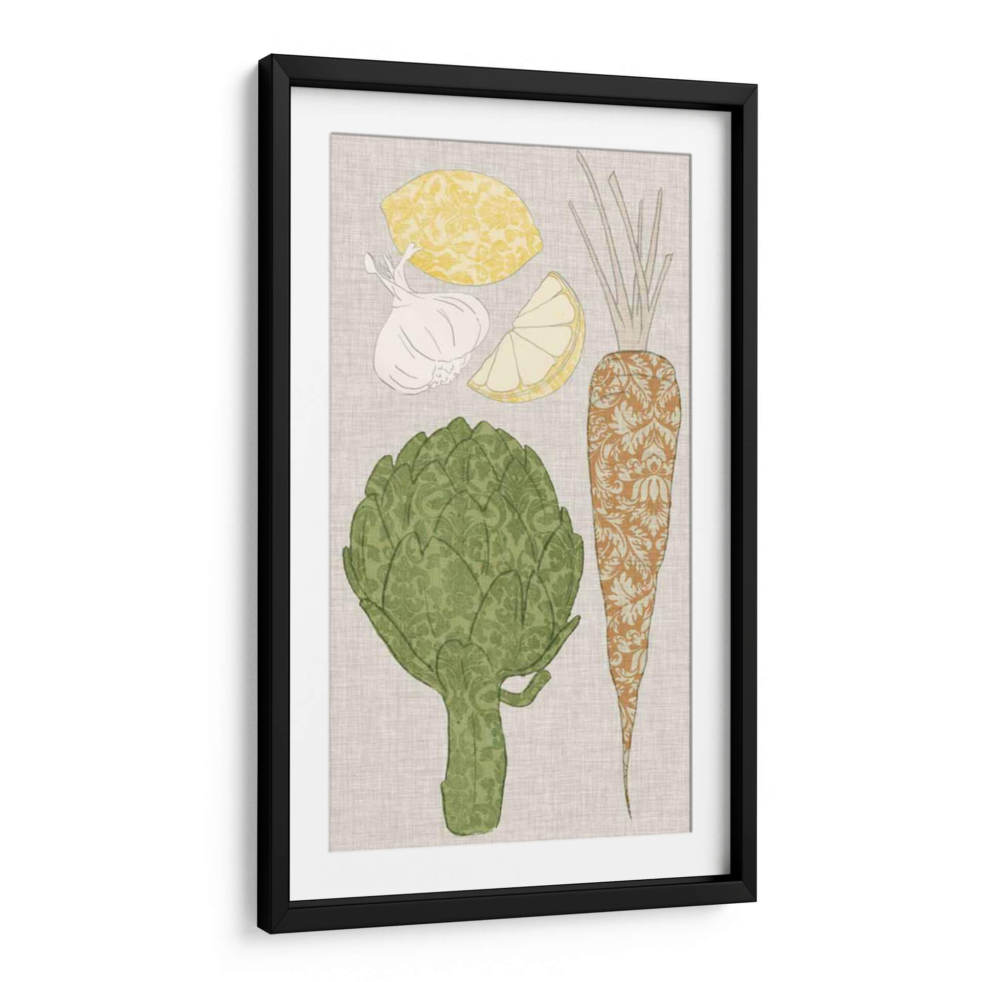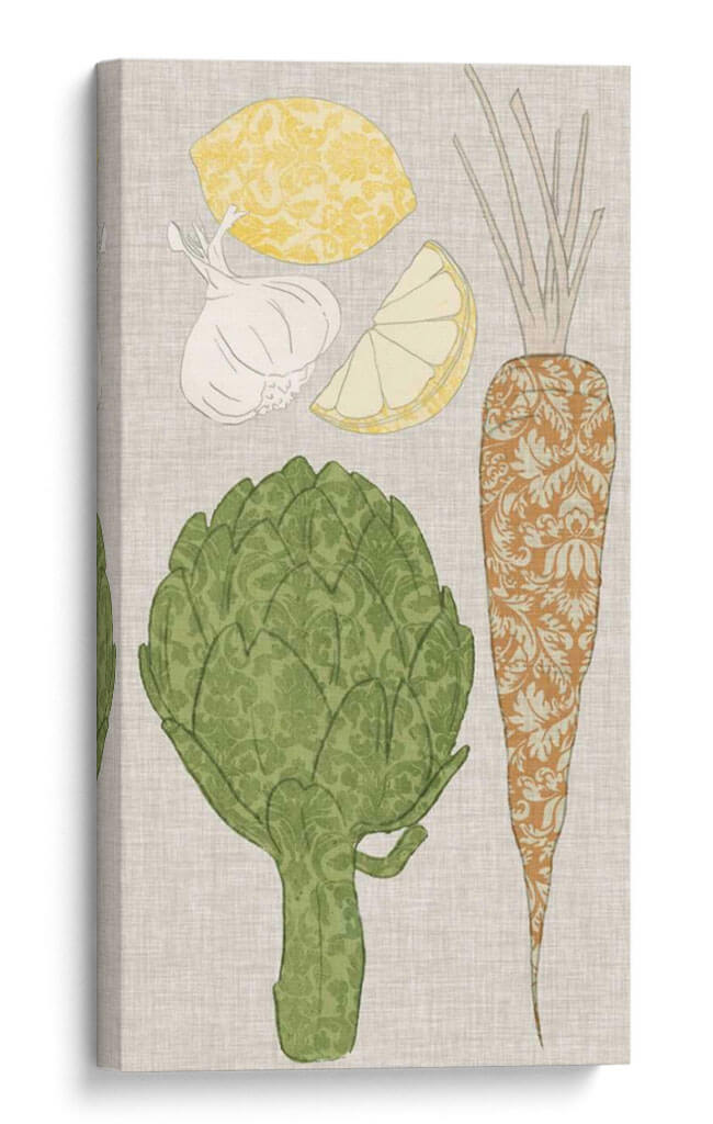 Transforma tu cocina o comedor con este evocador cuadro decorativo que celebra la frescura y vitalidad de los productos de la huerta. La obra, titulada "Frutas De Contorno Y Verduras Vi" por Vision Studio, presenta una cautivadora composición de alcachofa, ajo, rodajas y limón entero, junto a una zanahoria estilizada. Cada elemento está representado con un delicado contorno que realza sus formas orgánicas, mientras que patrones sutiles inspirados en damasco añaden una textura visual rica y sofisticada. La paleta de colores, dominada por verdes vibrantes, amarillos soleados y tonos tierra cálidos, crea una atmósfera acogedora y llena de vida, perfecta para espacios donde se busca estimular el apetito y la conversación. Este cuadro decorativo es ideal para cocinas rústicas, comedores modernos o incluso para añadir un toque de encanto natural a una oficina. Su estilo, que combina lo gráfico con lo orgánico, lo convierte en una pieza versátil que complementará una amplia gama de decoraciones interiores, aportando un aire fresco y contemporáneo a cualquier ambiente. Descubre cómo este arte de pared puede dar vida a tus paredes y convertir tu espacio en un refugio de buen gusto y frescura.