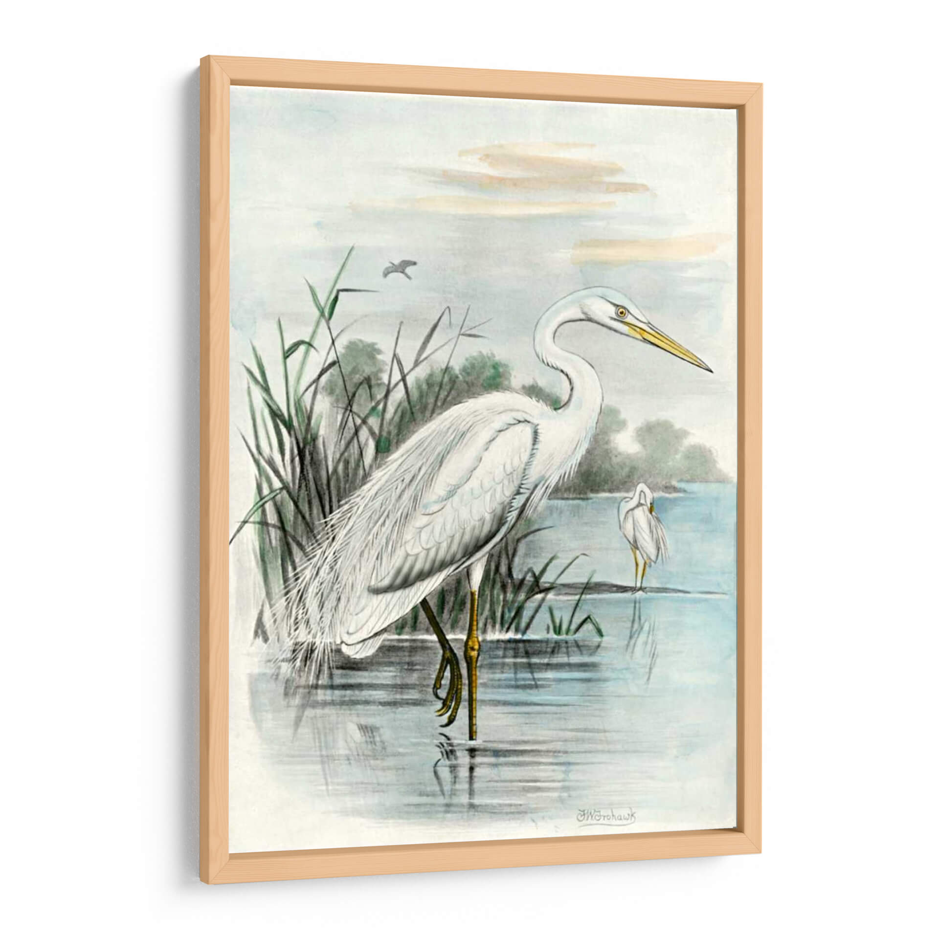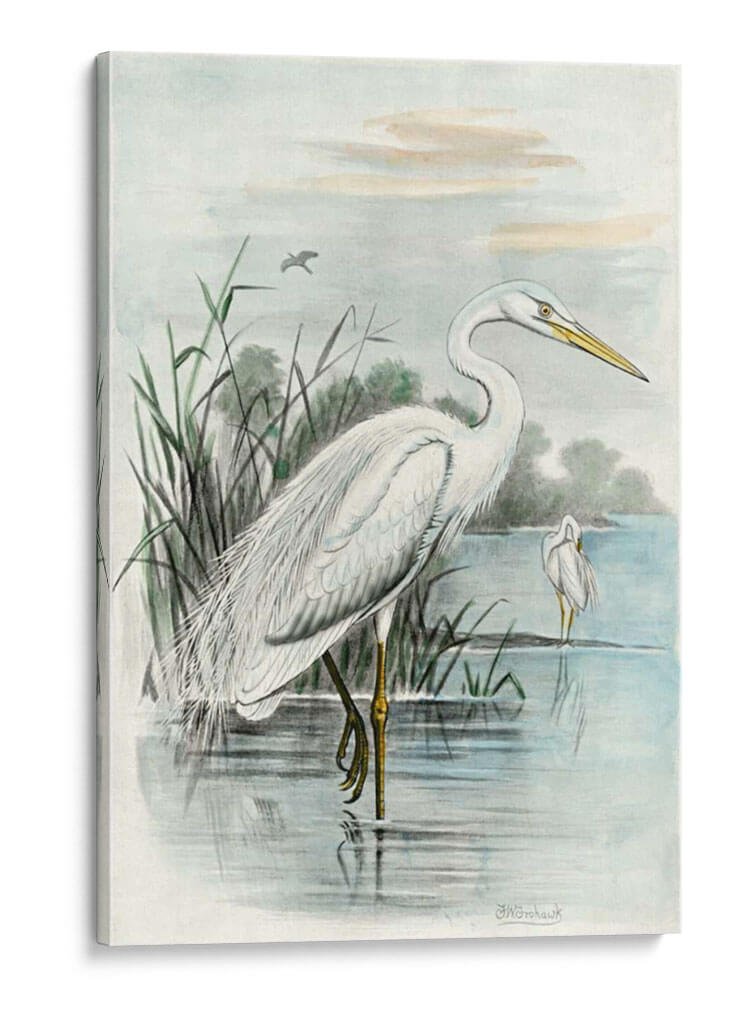 Sumérgete en la serenidad y elegancia de la naturaleza con este cautivador cuadro decorativo que presenta una garza blanca de gran tamaño en su hábitat natural. La obra captura la majestuosidad de estas aves con un detalle exquisito, destacando el plumaje blanco inmaculado y el grácil cuello de la garza principal. Rodeada de juncos verdes y reflejos suaves en el agua, la composición evoca una atmósfera de calma y tranquilidad. La paleta de colores, dominada por tonos fríos y pasteles como el azul cielo pálido y los verdes acuáticos, complementa la pureza del ave y crea un ambiente relajante, ideal para cualquier espacio que busque un toque de paz y armonía. El estilo realista y detallado de la ilustración, junto con la delicada presencia de una segunda garza en la distancia, añade profundidad y narración a la escena, invitando a la contemplación. Este cuadro decorativo es perfecto para añadir un punto focal sereno a tu sala de estar, dormitorio o estudio, transformando cualquier habitación en un oasis de calma y belleza natural. Una pieza que resuena con los amantes de la vida silvestre y el arte de inspiración natural, aportando sofisticación y un aire de pureza a tu decoración.