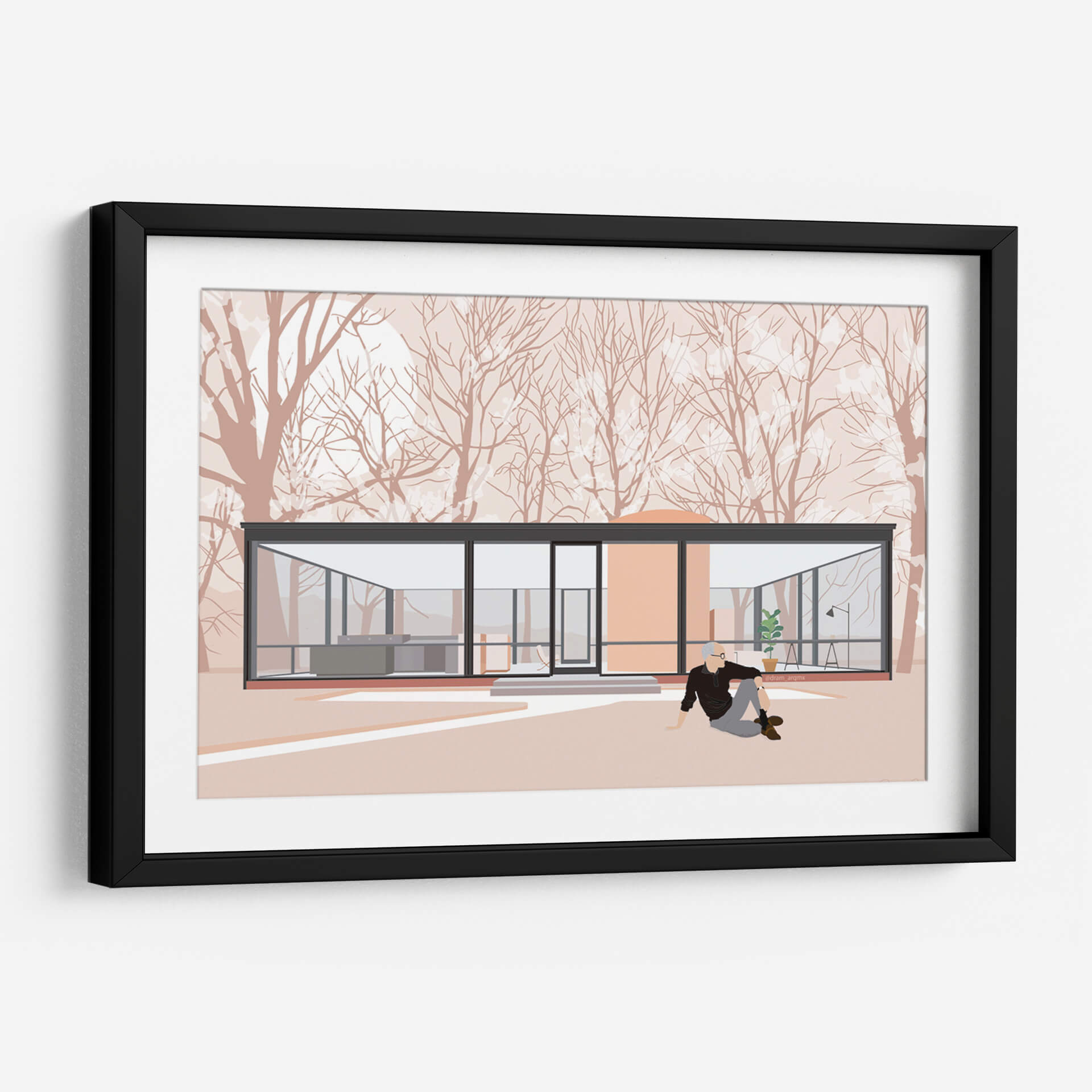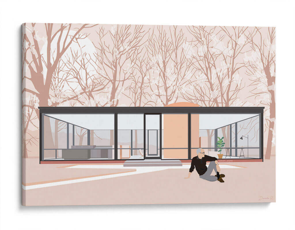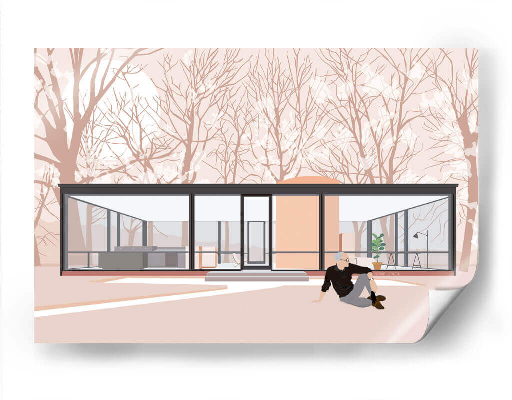 Sumérgete en la serenidad arquitectónica con "Glass House", una obra de arte contemporáneo que captura la esencia de la vida moderna y la conexión con la naturaleza. Este cuadro decorativo presenta una icónica casa de cristal rodeada por un bosque de árboles caducifolios, cuyas ramas desnudas crean un patrón intrincado contra un fondo de tonos rosados y melocotón. La composición minimalista y las líneas limpias de la arquitectura contrastan armoniosamente con la organicidad del paisaje exterior. En primer plano, una figura masculina reposa en el suelo, invitando a la contemplación y la reflexión, creando una atmósfera de calma y tranquilidad. Los colores suaves y la iluminación difusa de la obra transmiten una sensación de paz, ideal para espacios que buscan un refugio de serenidad, como dormitorios, estudios o salones de lectura. "Glass House" es más que una simple decoración; es una invitación a experimentar la arquitectura como arte y a encontrar la belleza en la simplicidad y la introspección. Añade este toque de elegancia minimalista y contemplativa a tu hogar y transforma cualquier ambiente en un santuario de estilo y paz.