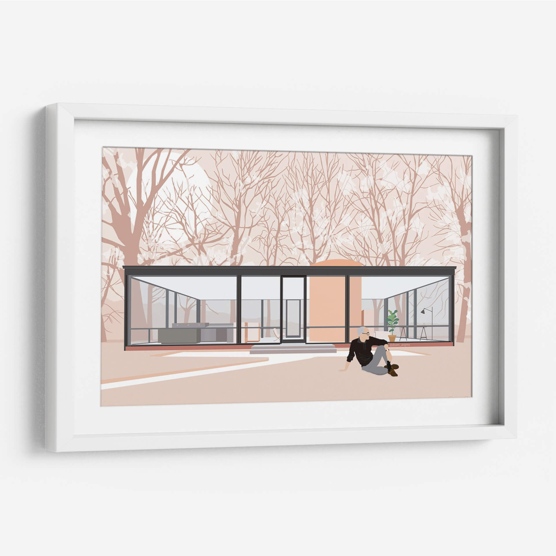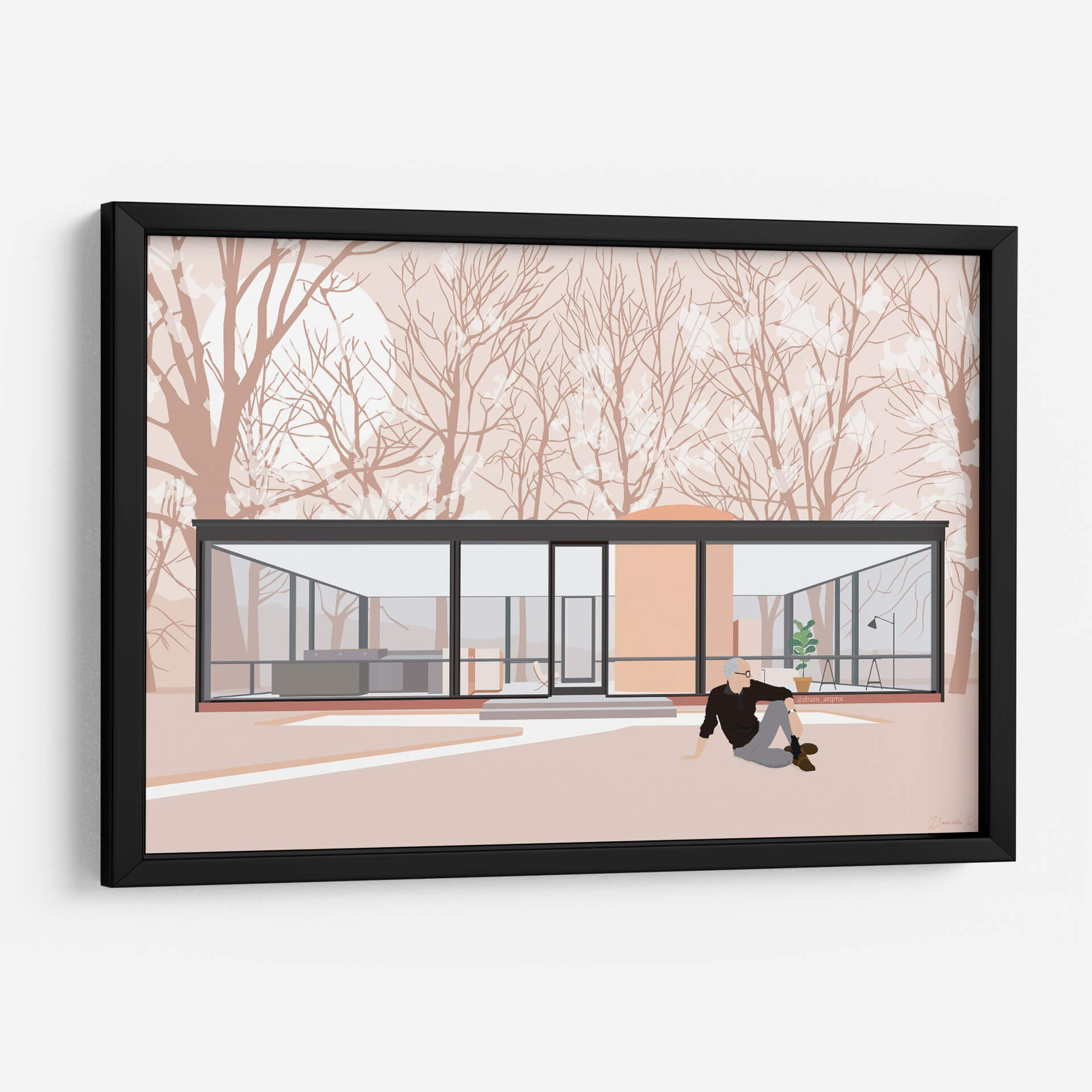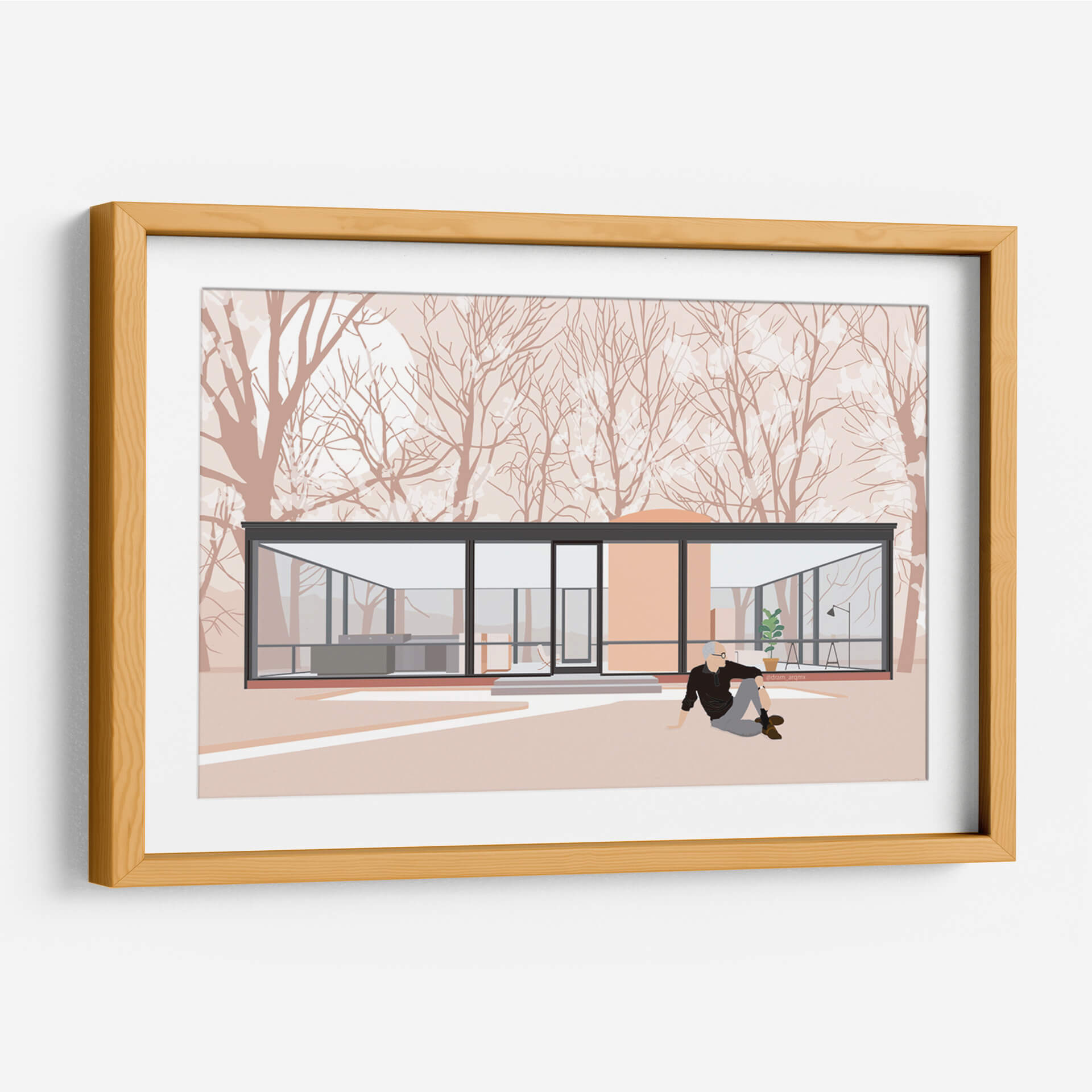 Sumérgete en la serenidad arquitectónica con "Glass House", una obra de arte contemporáneo que captura la esencia de la vida moderna y la conexión con la naturaleza. Este cuadro decorativo presenta una icónica casa de cristal rodeada por un bosque de árboles caducifolios, cuyas ramas desnudas crean un patrón intrincado contra un fondo de tonos rosados y melocotón. La composición minimalista y las líneas limpias de la arquitectura contrastan armoniosamente con la organicidad del paisaje exterior. En primer plano, una figura masculina reposa en el suelo, invitando a la contemplación y la reflexión, creando una atmósfera de calma y tranquilidad. Los colores suaves y la iluminación difusa de la obra transmiten una sensación de paz, ideal para espacios que buscan un refugio de serenidad, como dormitorios, estudios o salones de lectura. "Glass House" es más que una simple decoración; es una invitación a experimentar la arquitectura como arte y a encontrar la belleza en la simplicidad y la introspección. Añade este toque de elegancia minimalista y contemplativa a tu hogar y transforma cualquier ambiente en un santuario de estilo y paz.