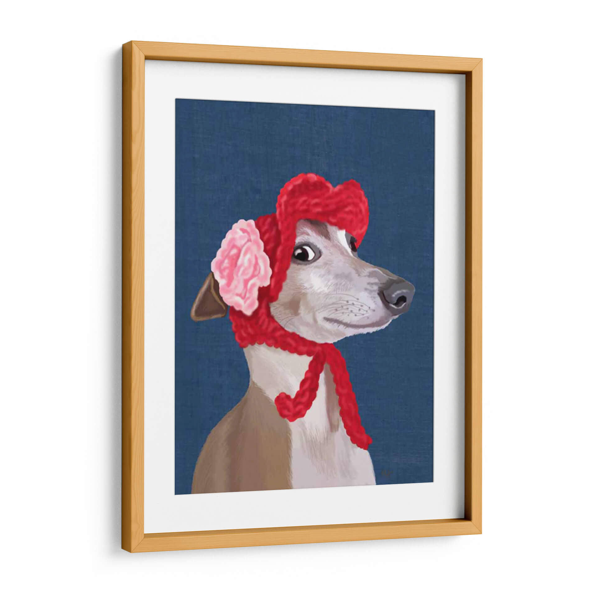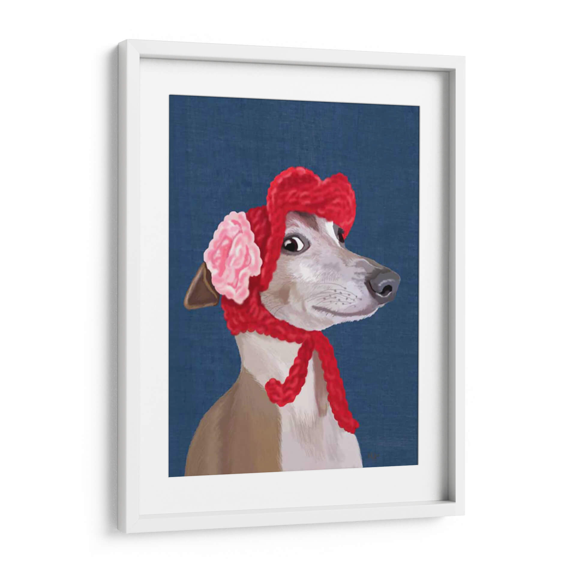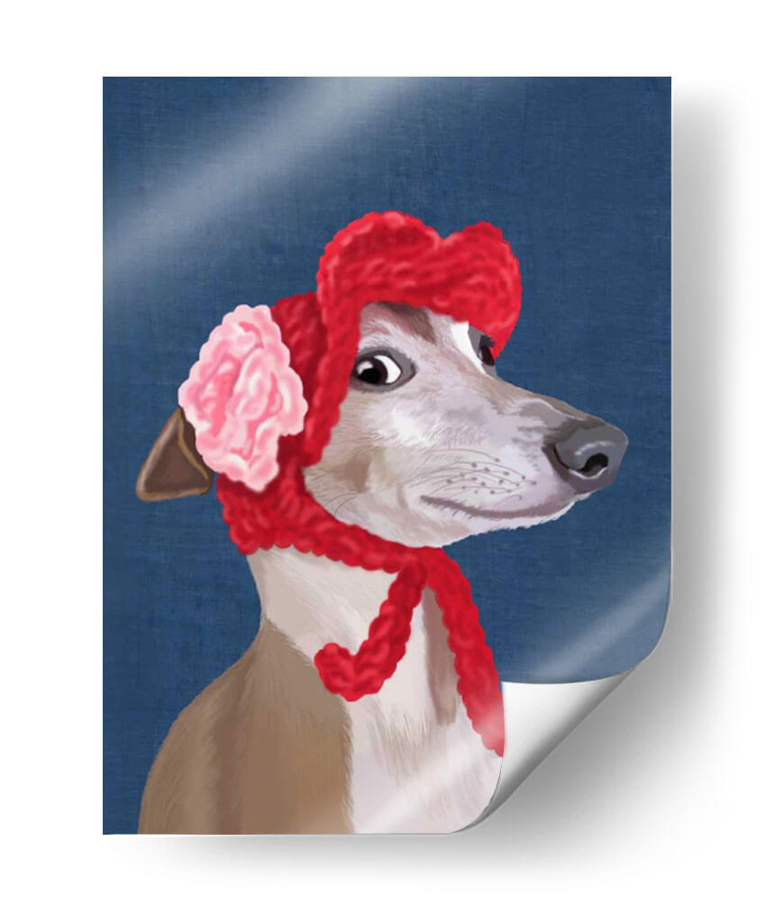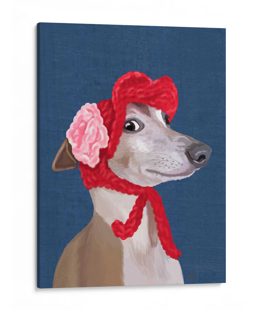 Descubre la encantadora obra "Greyhound Con Sombrero Lanudo Rojo" del artista Fab Funky, una pieza que irradia dulzura y estilo. Este cuadro decorativo presenta un retrato detallado de un galgo vestido con un llamativo sombrero rojo de lana y un accesorio floral en tonos rosa pálido, contrastando elegantemente con un fondo azul profundo. La expresión curiosa y la mirada penetrante del perro capturan la atención, invitando a la contemplación. El estilo artístico, con pinceladas definidas y una paleta de colores vibrantes pero armoniosos, combina elementos realistas con un toque de fantasía, creando una atmósfera juguetona y sofisticada. Ideal para quienes buscan añadir un toque de personalidad y calidez a su hogar u oficina, esta pieza es perfecta para salas de estar, dormitorios o cualquier espacio que necesite un acento de color y carácter. Su composición centrada en el animal, con un enfoque en su rostro expresivo, la convierte en un punto focal cautivador. Añade esta obra maestra contemporánea a tu colección y transforma tus paredes en una galería de arte personal que refleje tu buen gusto y tu amor por las mascotas con un giro artístico único. Es un regalo perfecto para amantes de los perros y del arte.
