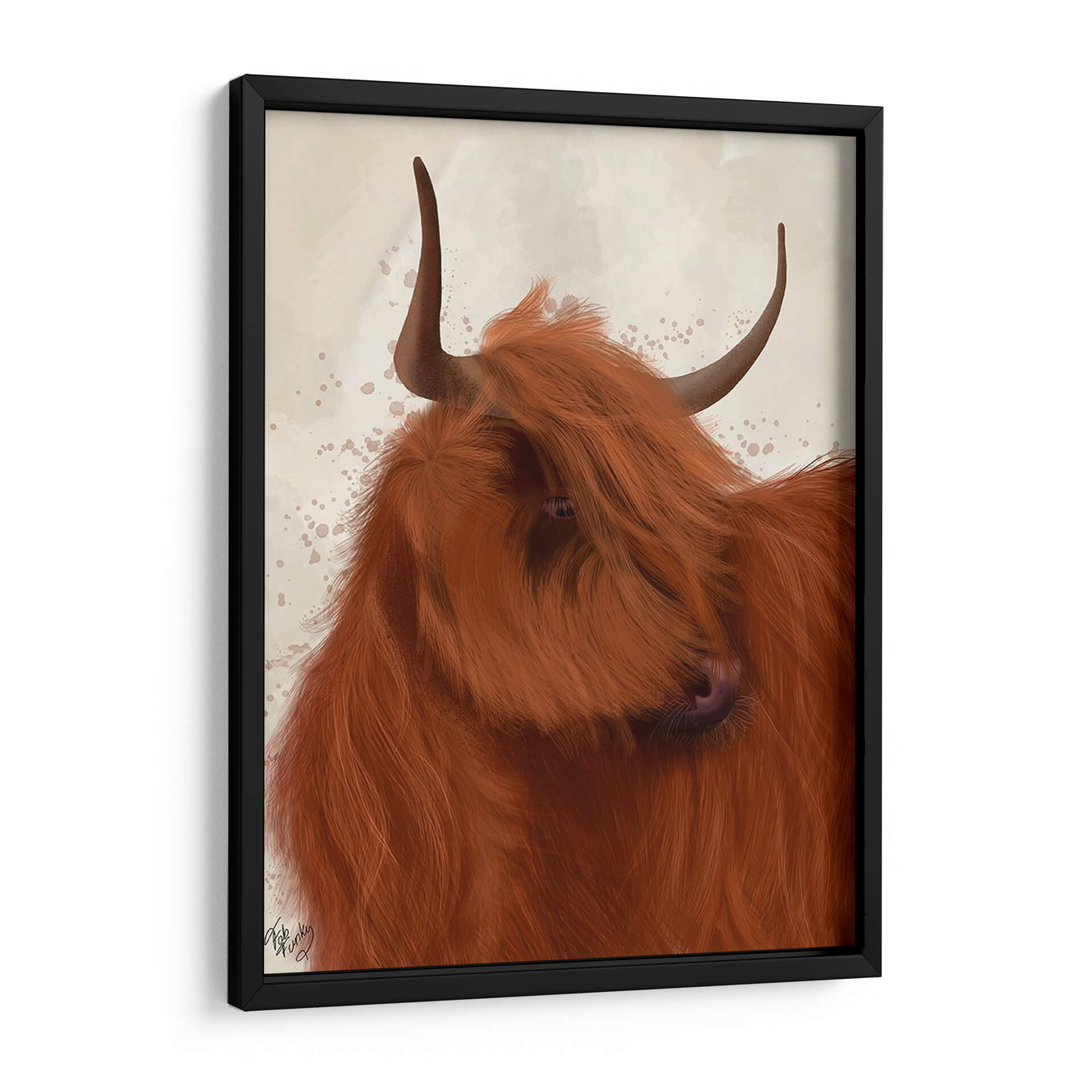 Este cautivador cuadro decorativo presenta un retrato íntimo de una vaca de las Highlands, capturando la esencia rústica y el encanto inconfundible de estas majestuosas criaturas. La obra se centra en la cabeza del animal, destacando su pelaje largo y desordenado en tonos rojizos y terracota, que contrasta sutilmente con un fondo de textura suave en tonos beige y toques de salpicaduras de pintura marrón claro. La mirada del animal, parcialmente oculta por su exuberante pelaje, añade un toque de misterio y profundidad a la composición. El estilo digital, aunque detallado en la textura del pelo, mantiene una estética contemporánea y artística, lo que lo convierte en una pieza versátil para diversos entornos. Ideal para quienes buscan añadir un elemento de naturaleza, calidez y carácter a su hogar u oficina, este cuadro decorativo puede ser un punto focal encantador en una sala de estar, un dormitorio acogedor o incluso un espacio de trabajo creativo. Su paleta de colores terrosos y su tema animal la hacen perfecta para interiores rústicos, modernos o de inspiración escandinava, aportando una sensación de paz y conexión con la tierra. Una adición única para amantes de los animales y del arte que aprecian la belleza en lo cotidiano.