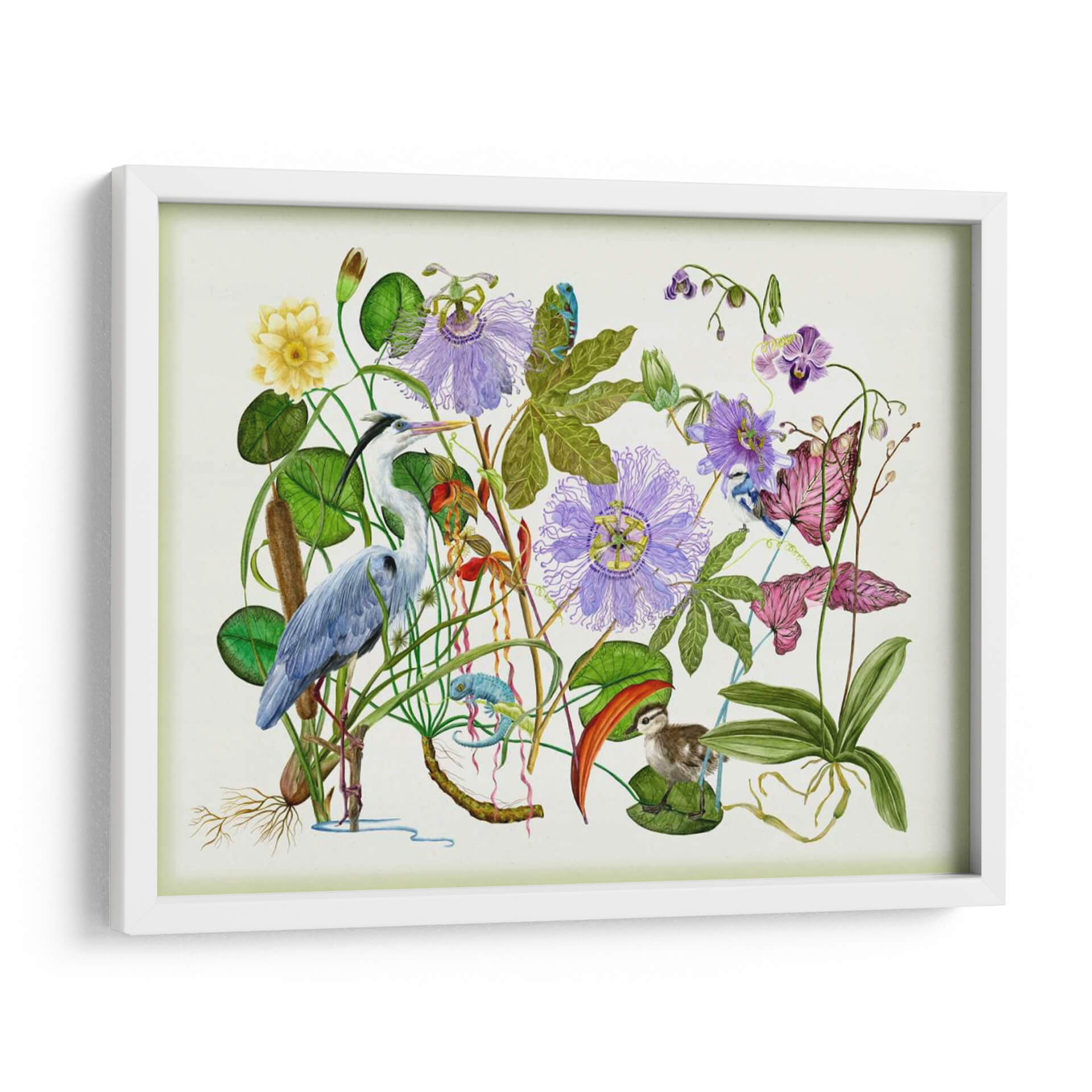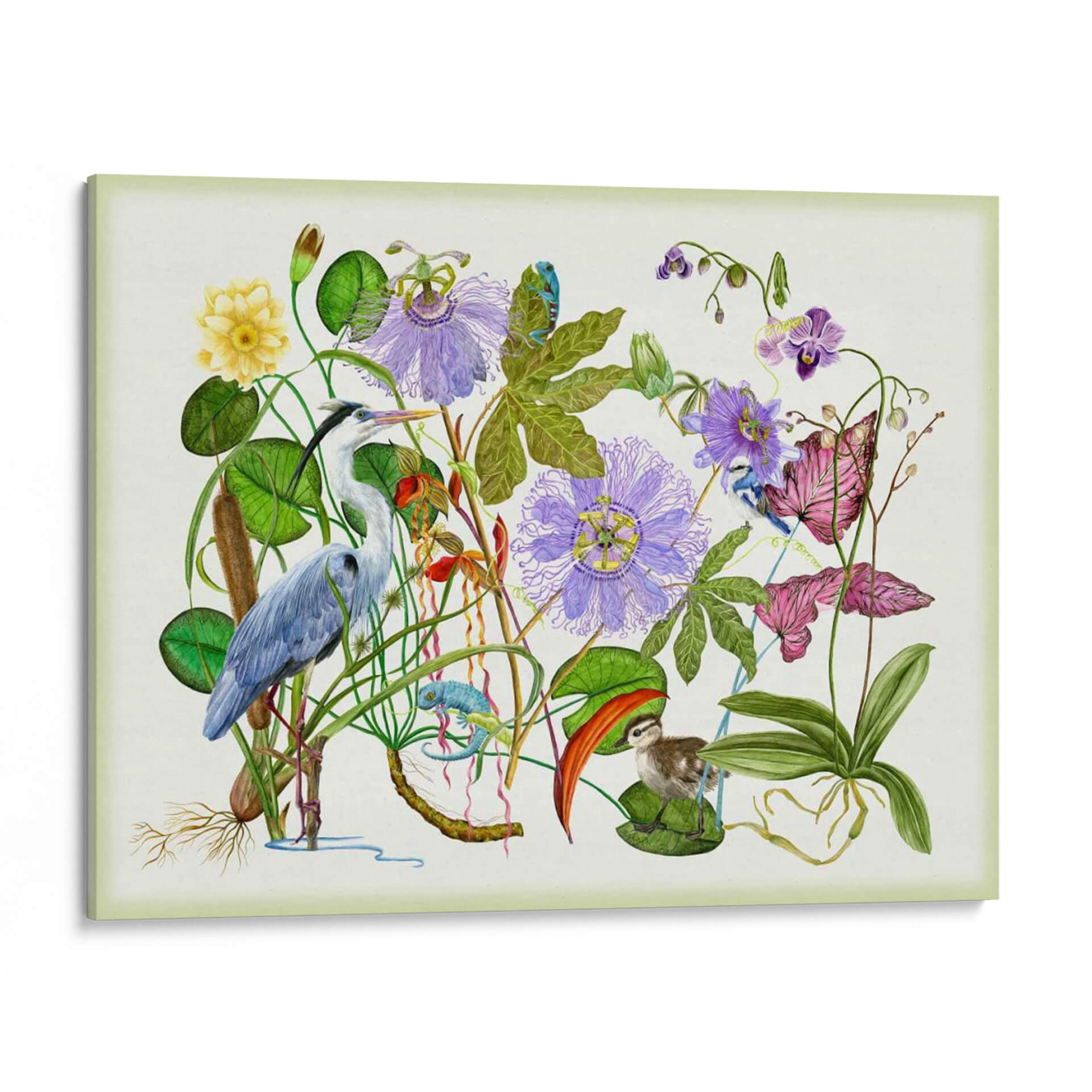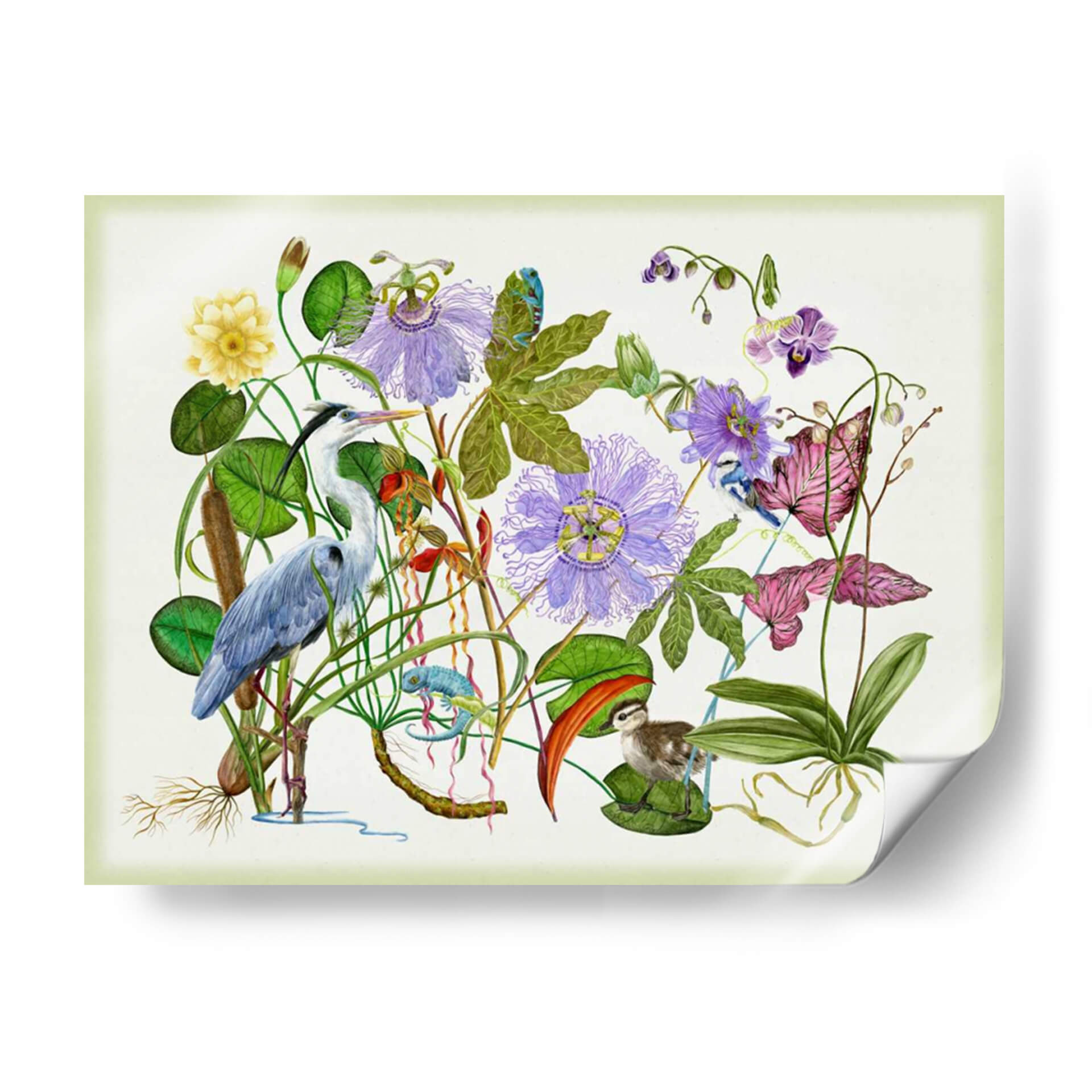 Sumérgete en la serenidad de la naturaleza con "Hipnotizar", una obra de arte exquisita de Melissa Wang. Este cuadro decorativo te transporta a un vibrante ecosistema acuático, donde una garza elegante se alza entre exuberante vegetación, flores de pasionaria púrpura y delicadas orquídeas. La composición detallada presenta un camaleón juguetón y un tierno polluelo, añadiendo un toque de vida y fantasía a la escena. La paleta de colores, dominada por verdes profundos, púrpuras etéreos y el azul sereno de la garza, crea una atmósfera de calma y contemplación. Cada trazo de pincel parece dar vida a este rincón natural, invitándote a observar los intrincados detalles de las hojas, las raíces aéreas y las texturas de las plumas. "Hipnotizar" es más que una simple decoración; es una ventana a un mundo de tranquilidad y maravilla natural, perfecta para infundir serenidad en tu sala de estar, dormitorio o estudio. Añade un toque de sofisticación y conexión con la naturaleza a tu hogar con esta pieza cautivadora, un lienzo que invita a la reflexión y la admiración por la belleza del mundo salvaje. Ideal para amantes del arte botánico y la vida silvestre.