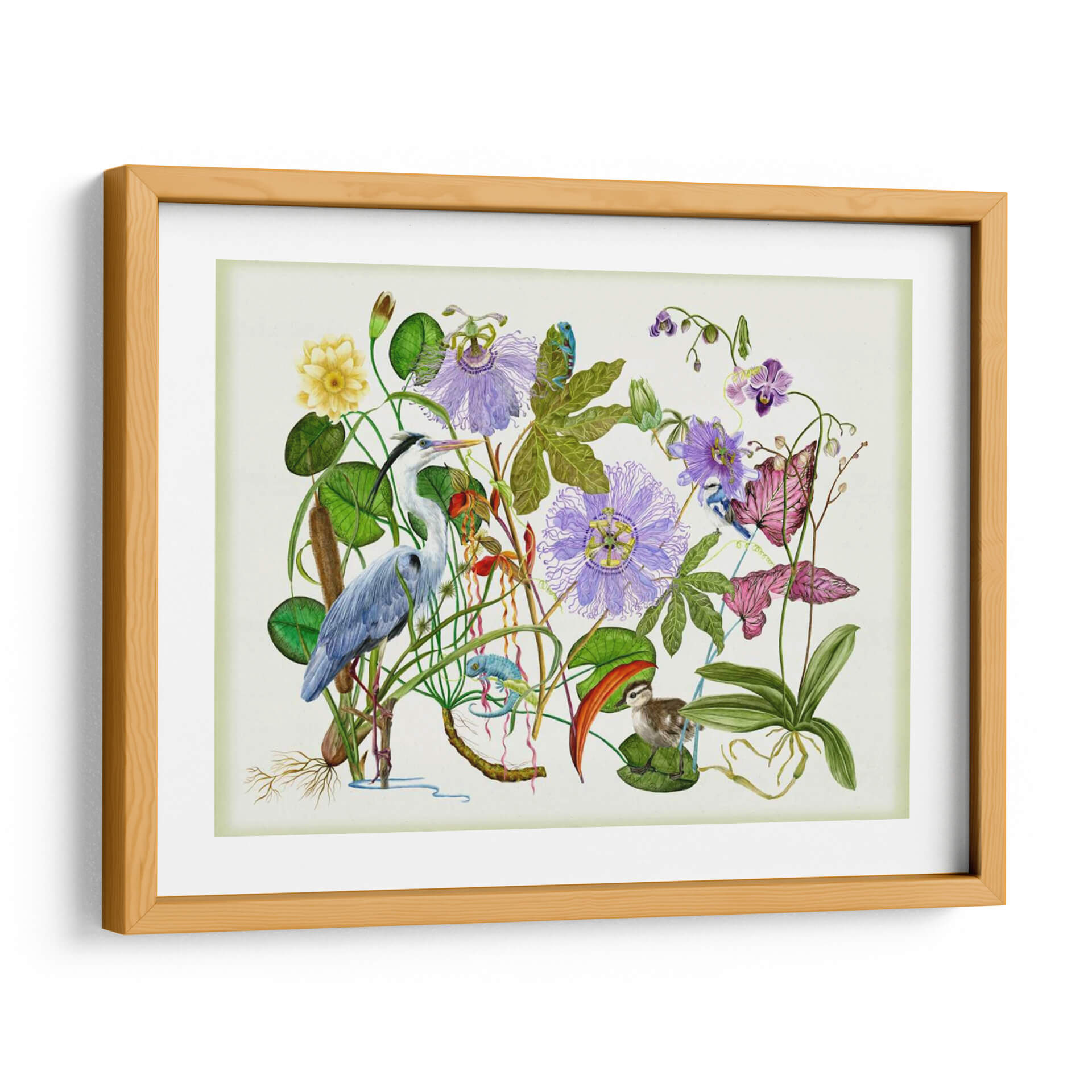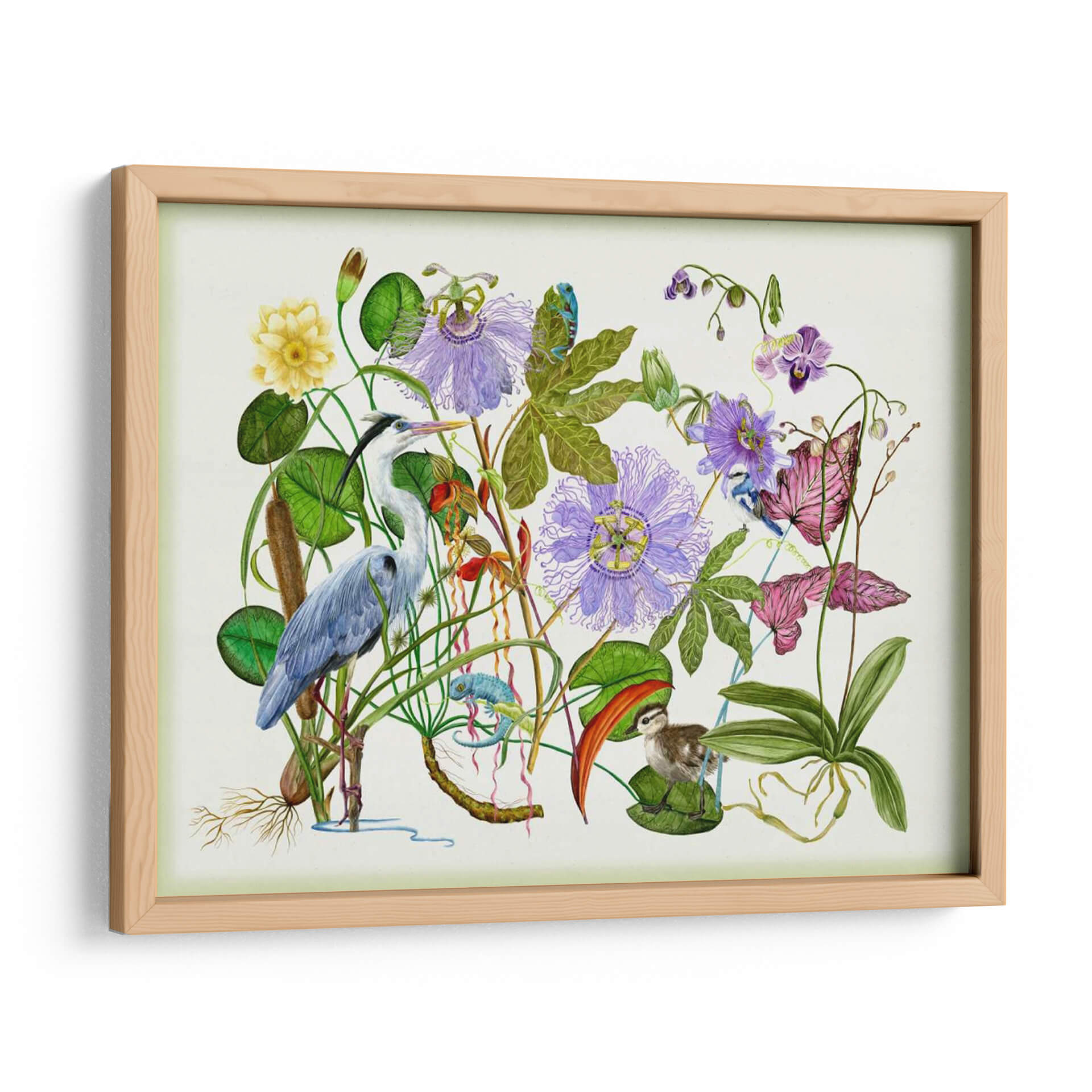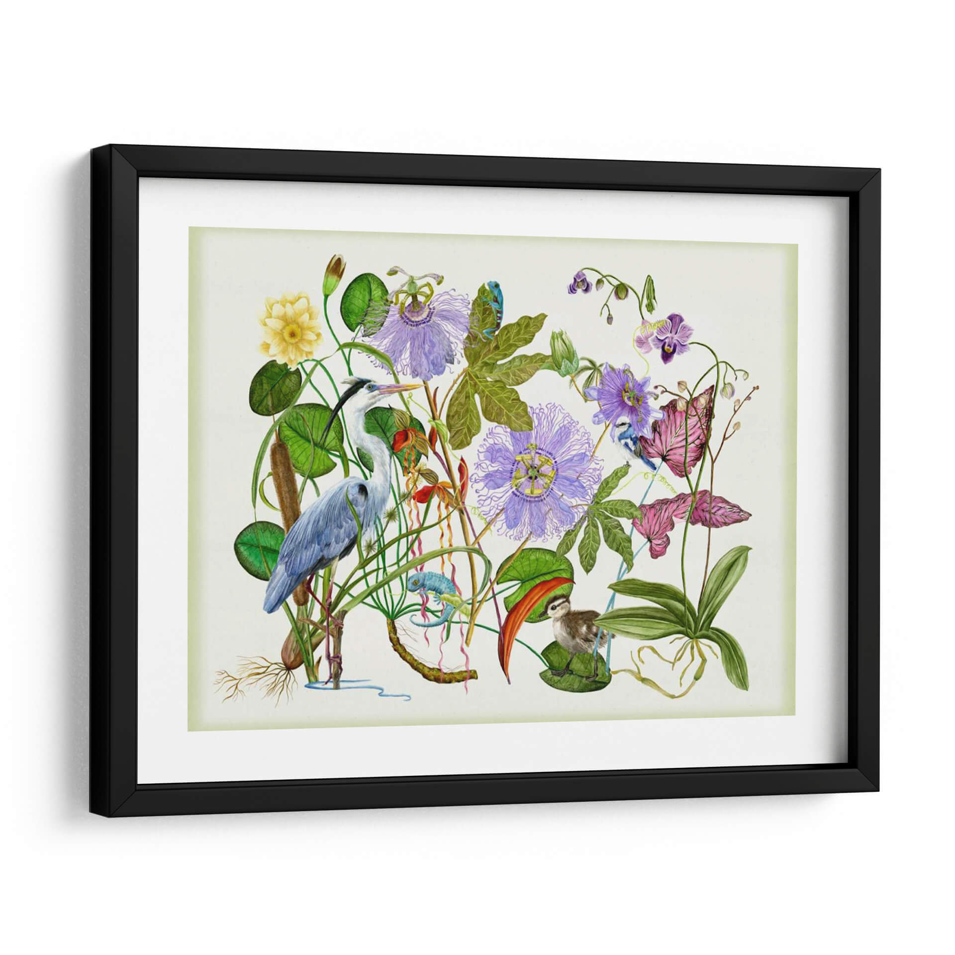 Sumérgete en la serenidad de la naturaleza con "Hipnotizar", una obra de arte exquisita de Melissa Wang. Este cuadro decorativo te transporta a un vibrante ecosistema acuático, donde una garza elegante se alza entre exuberante vegetación, flores de pasionaria púrpura y delicadas orquídeas. La composición detallada presenta un camaleón juguetón y un tierno polluelo, añadiendo un toque de vida y fantasía a la escena. La paleta de colores, dominada por verdes profundos, púrpuras etéreos y el azul sereno de la garza, crea una atmósfera de calma y contemplación. Cada trazo de pincel parece dar vida a este rincón natural, invitándote a observar los intrincados detalles de las hojas, las raíces aéreas y las texturas de las plumas. "Hipnotizar" es más que una simple decoración; es una ventana a un mundo de tranquilidad y maravilla natural, perfecta para infundir serenidad en tu sala de estar, dormitorio o estudio. Añade un toque de sofisticación y conexión con la naturaleza a tu hogar con esta pieza cautivadora, un lienzo que invita a la reflexión y la admiración por la belleza del mundo salvaje. Ideal para amantes del arte botánico y la vida silvestre.