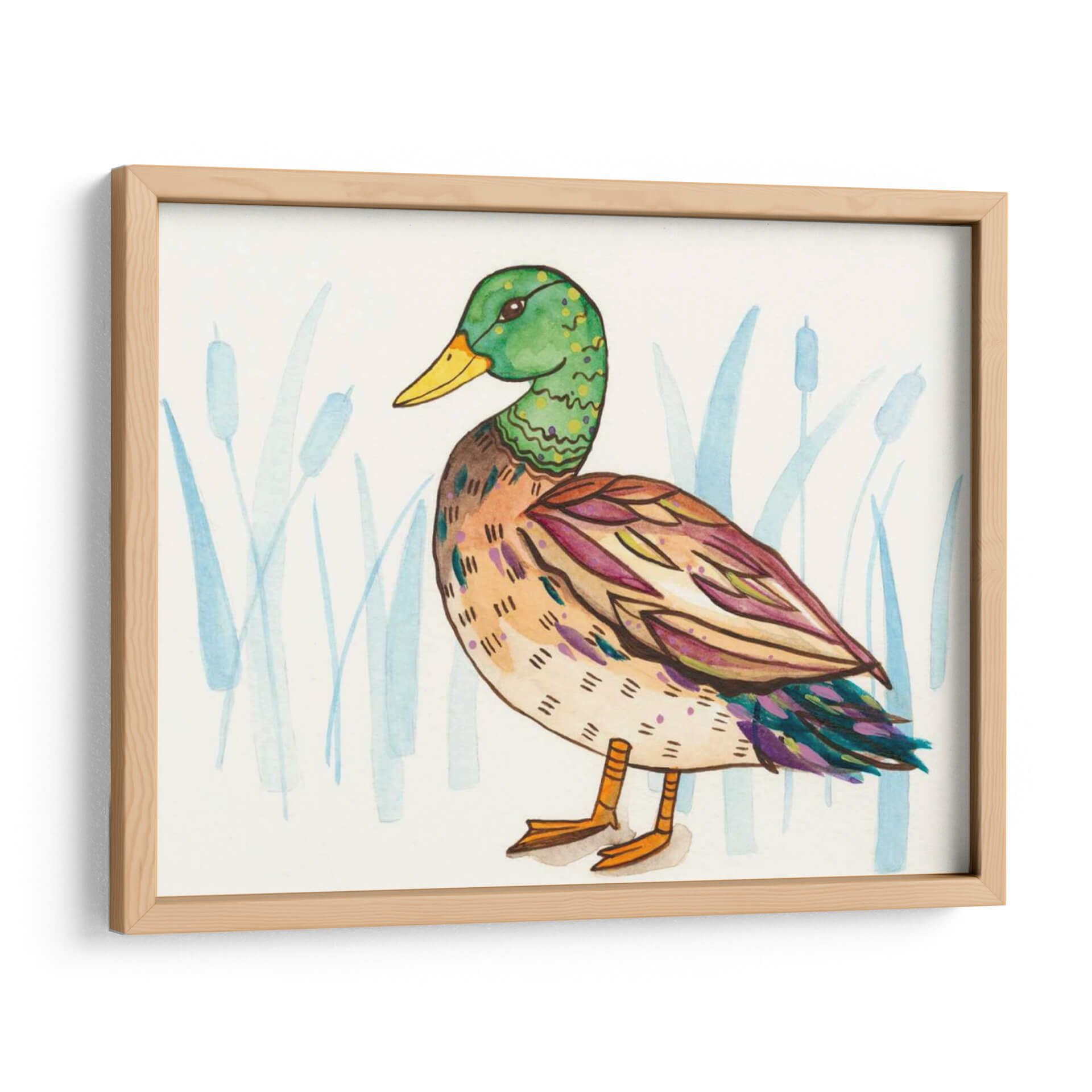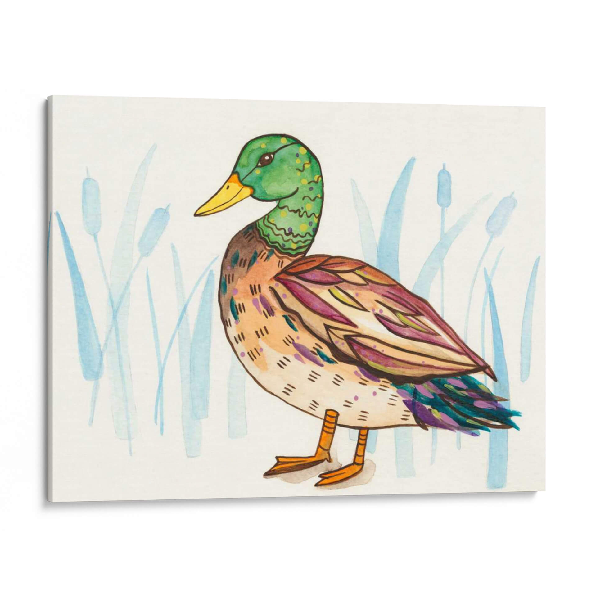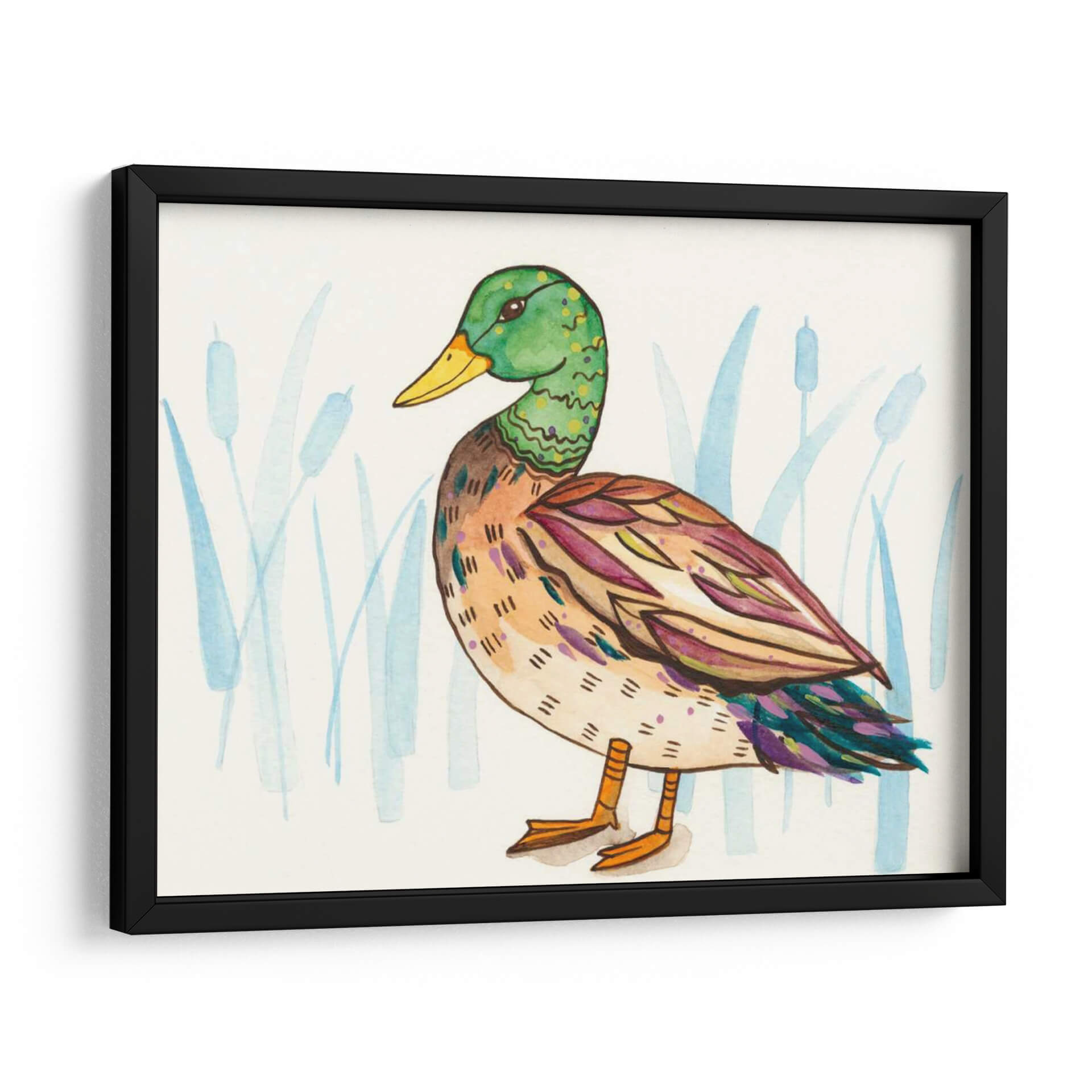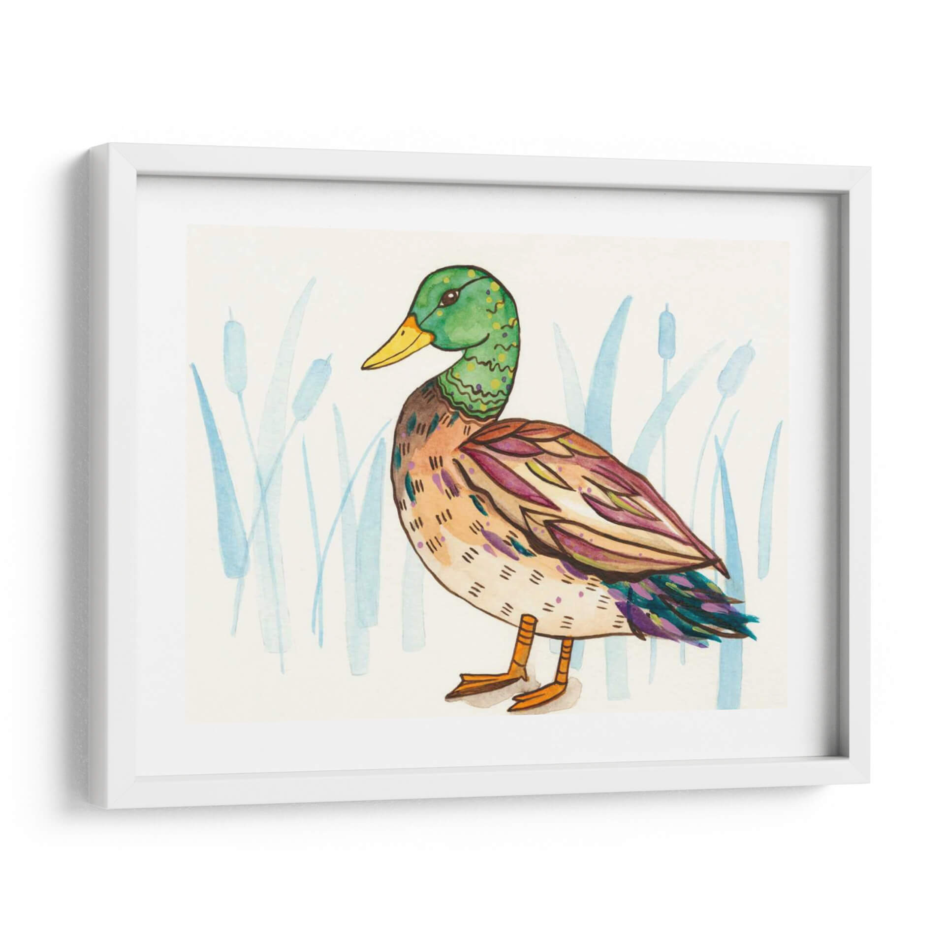 Aporta un toque de naturaleza y encanto a tu hogar con "Humedal Mallard I", una cautivadora obra de arte de Rebekah Ewer. Este cuadro decorativo captura la serena belleza de un pato ánade real, representado con un estilo artístico único que combina lo figurativo con toques abstractos. La paleta de colores, dominada por verdes vibrantes en la cabeza del ave, tonos cálidos y terrosos en su cuerpo, y acentos de morado y azul en las alas, crea una composición visualmente rica y armoniosa. El fondo, sutilmente ilustrado con juncos en tonos azules y acuosos, evoca la atmósfera tranquila de un humedal, aportando una sensación de paz y conexión con la naturaleza. La técnica de acuarela, con sus trazos delicados y su transparencia, dota a la pieza de una ligereza y frescura inigualables. "Humedal Mallard I" es ideal para espacios que buscan un punto focal orgánico y lleno de vida, como salas de estar modernas, dormitorios acogedores o incluso oficinas que deseen un ambiente más relajado. Este cuadro decorativo no solo embellece tus paredes, sino que también invita a la contemplación y a la apreciación de la fauna y los paisajes naturales, convirtiéndose en una pieza esencial para los amantes del arte contemporáneo con inspiración en la vida silvestre.