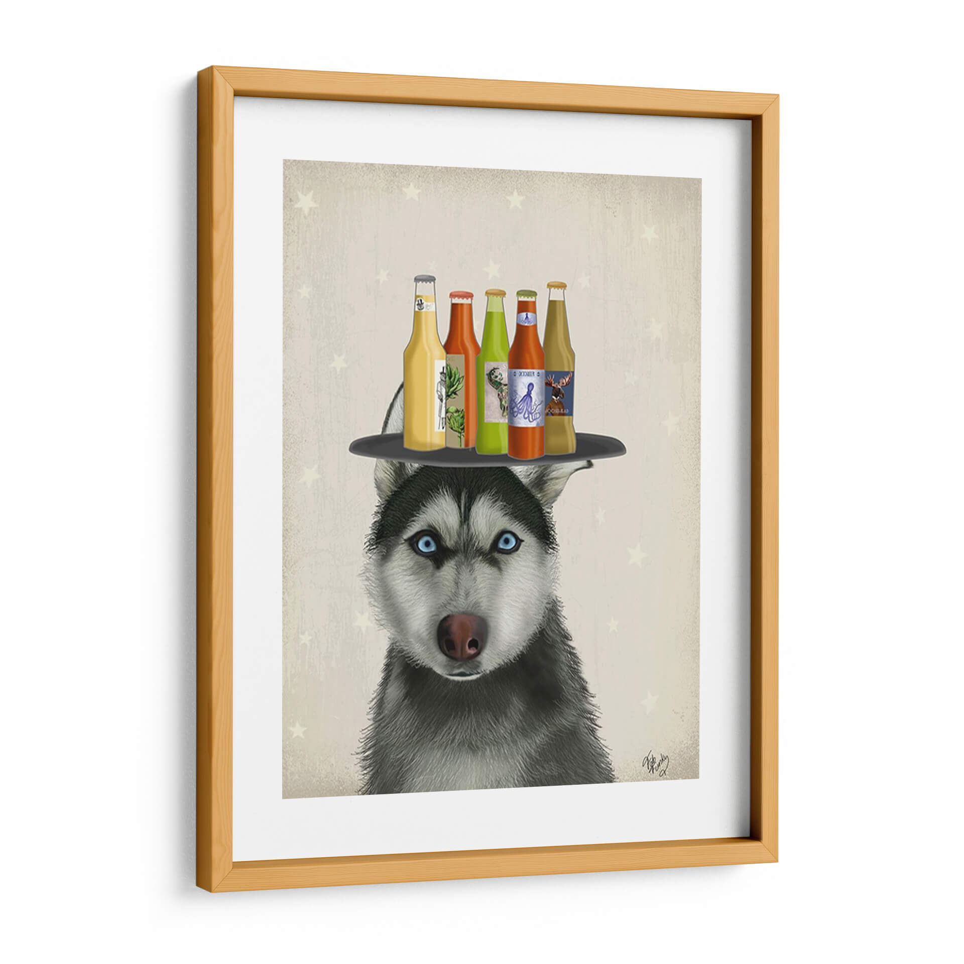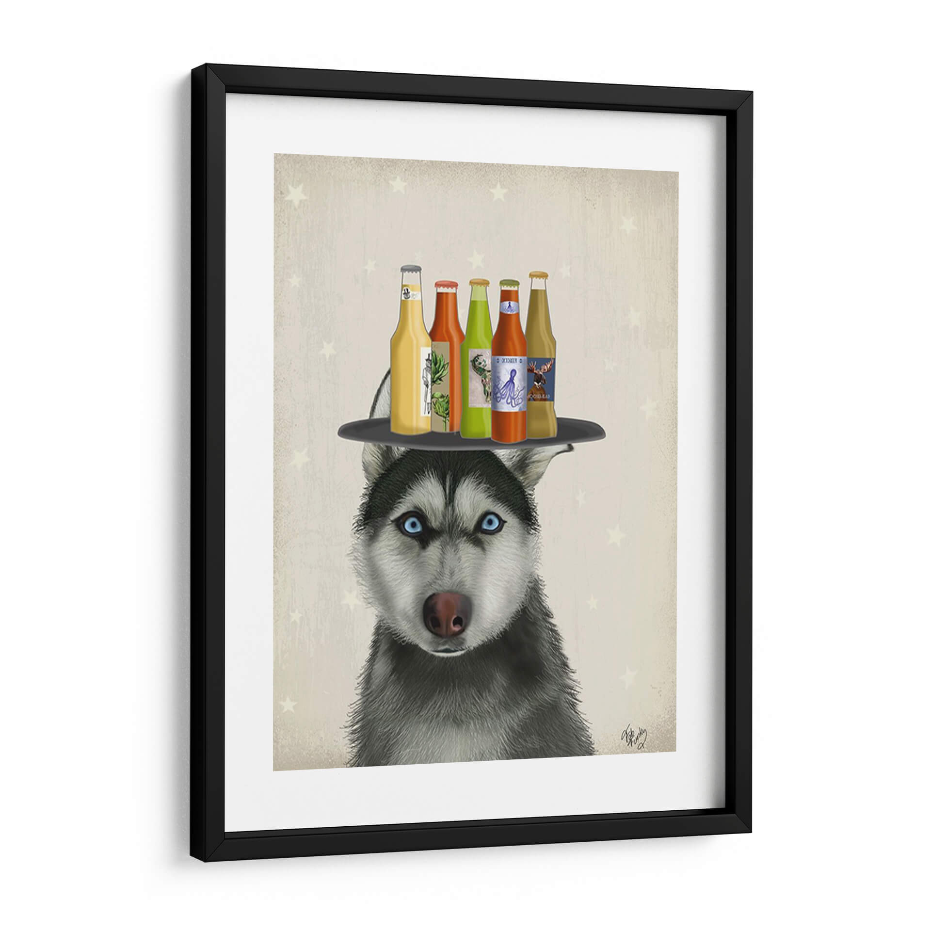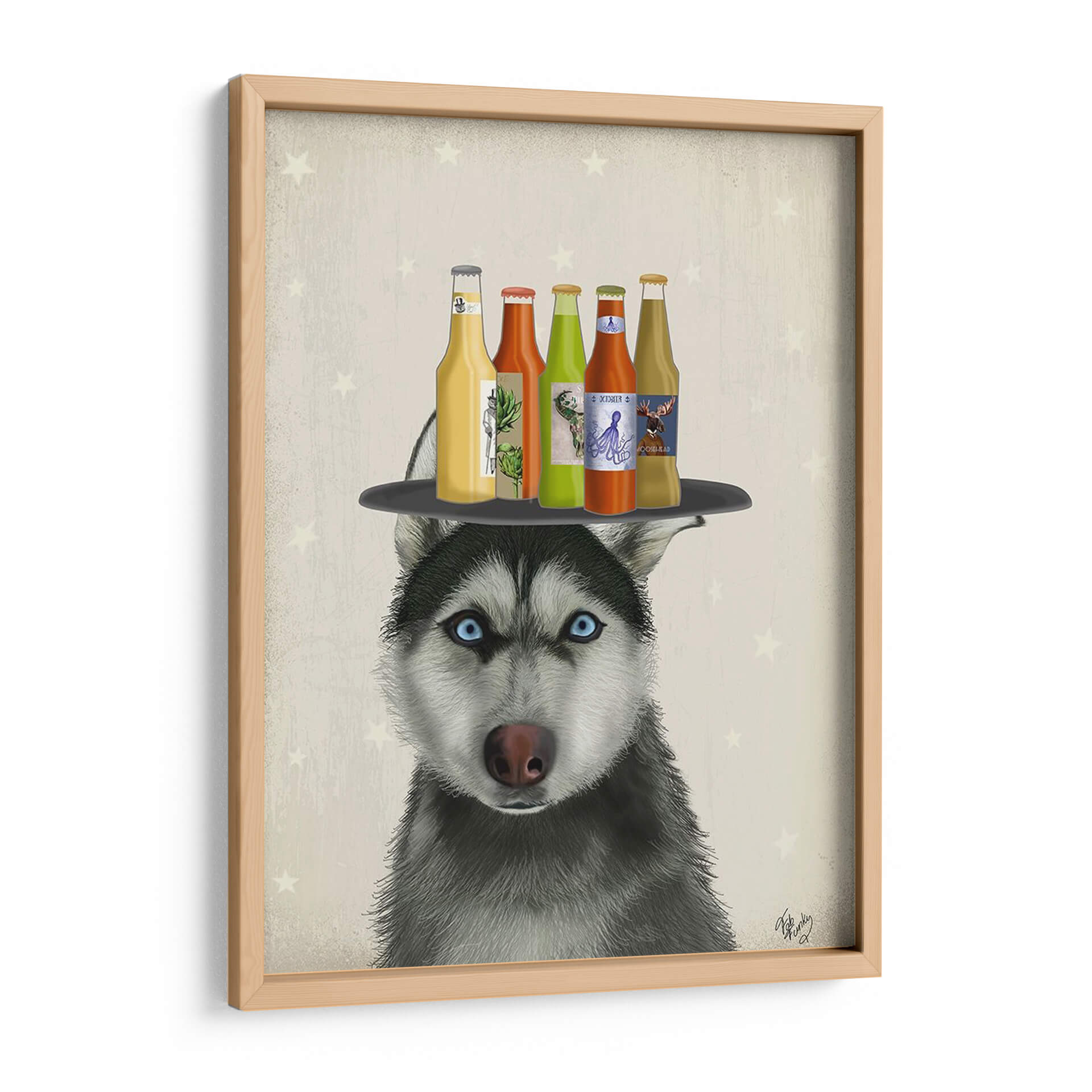 Este encantador cuadro decorativo presenta un husky de mirada intensa y ojos azules penetrantes, con una bandeja llena de botellas de cerveza equilibrada magistralmente sobre su cabeza. La obra, titulada "Husky 2 Beer Lover" del artista Fab Funky, combina un retrato animal detallado con un toque de humor surrealista. El fondo, de un tono beige suave y adornado con delicadas estrellas blancas, crea una atmósfera lúdica y acogedora, realzando la personalidad única de la pieza. Los colores vibrantes de las botellas contrastan sutilmente con el pelaje gris y blanco del husky, capturando la atención del espectador. El estilo artístico, que mezcla lo realista con lo fantástico, lo convierte en una pieza ideal para quienes buscan añadir un punto de conversación y originalidad a su hogar u oficina. Perfecto para amantes de los perros, aficionados a la cerveza o cualquiera que aprecie el arte contemporáneo con un giro divertido. Este cuadro decorativo aportará alegría y carácter a cualquier espacio, ya sea una sala de estar moderna, una cocina informal o un bar personal. Una elección excelente para decorar con arte que evoca sonrisas y admiración.