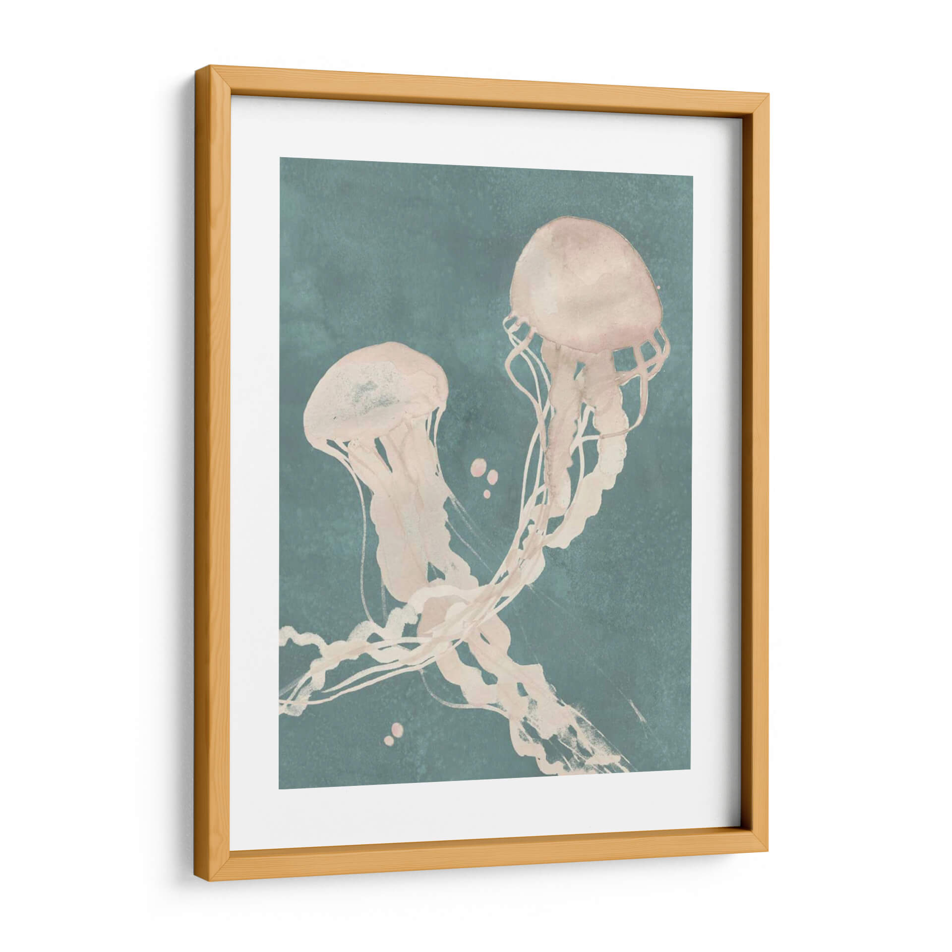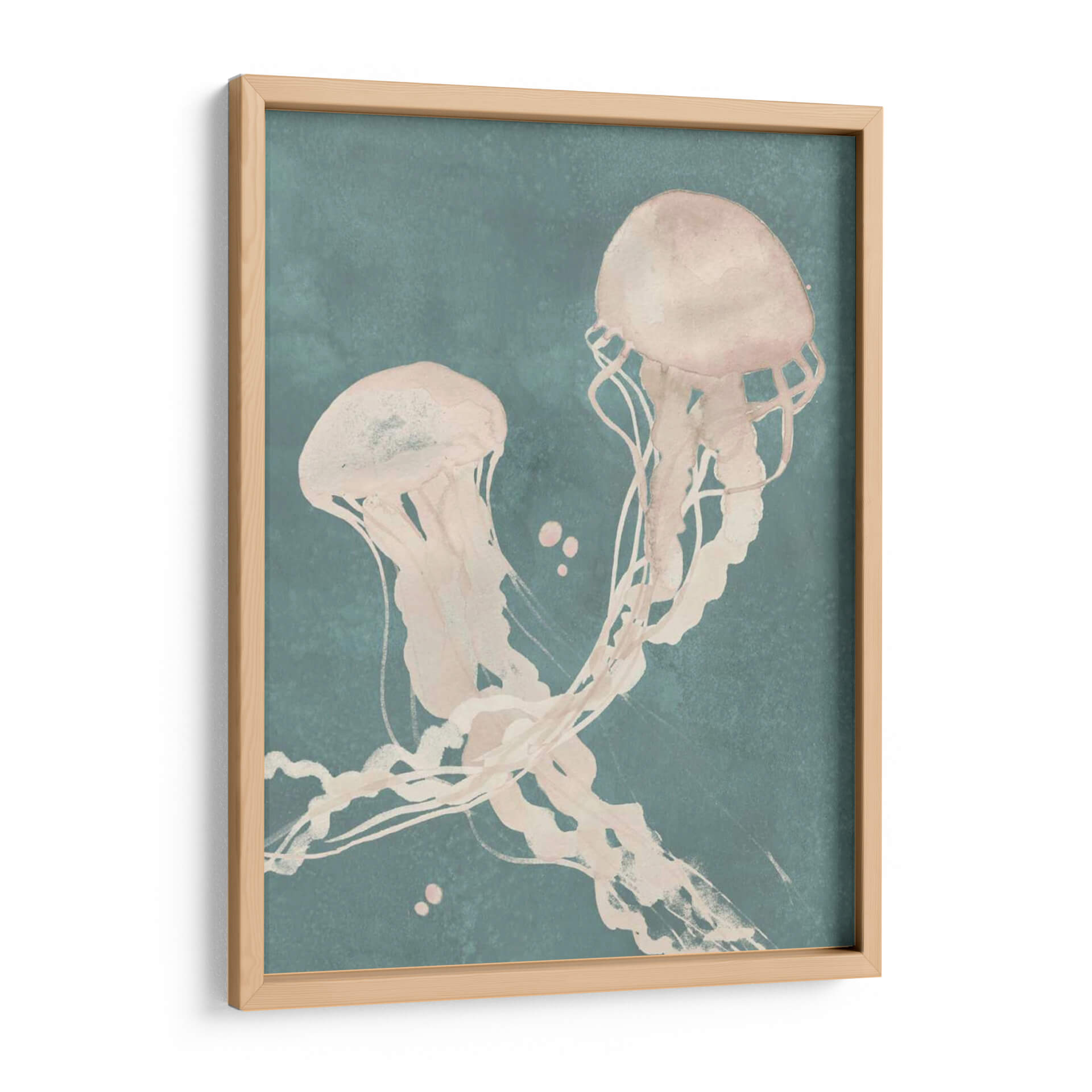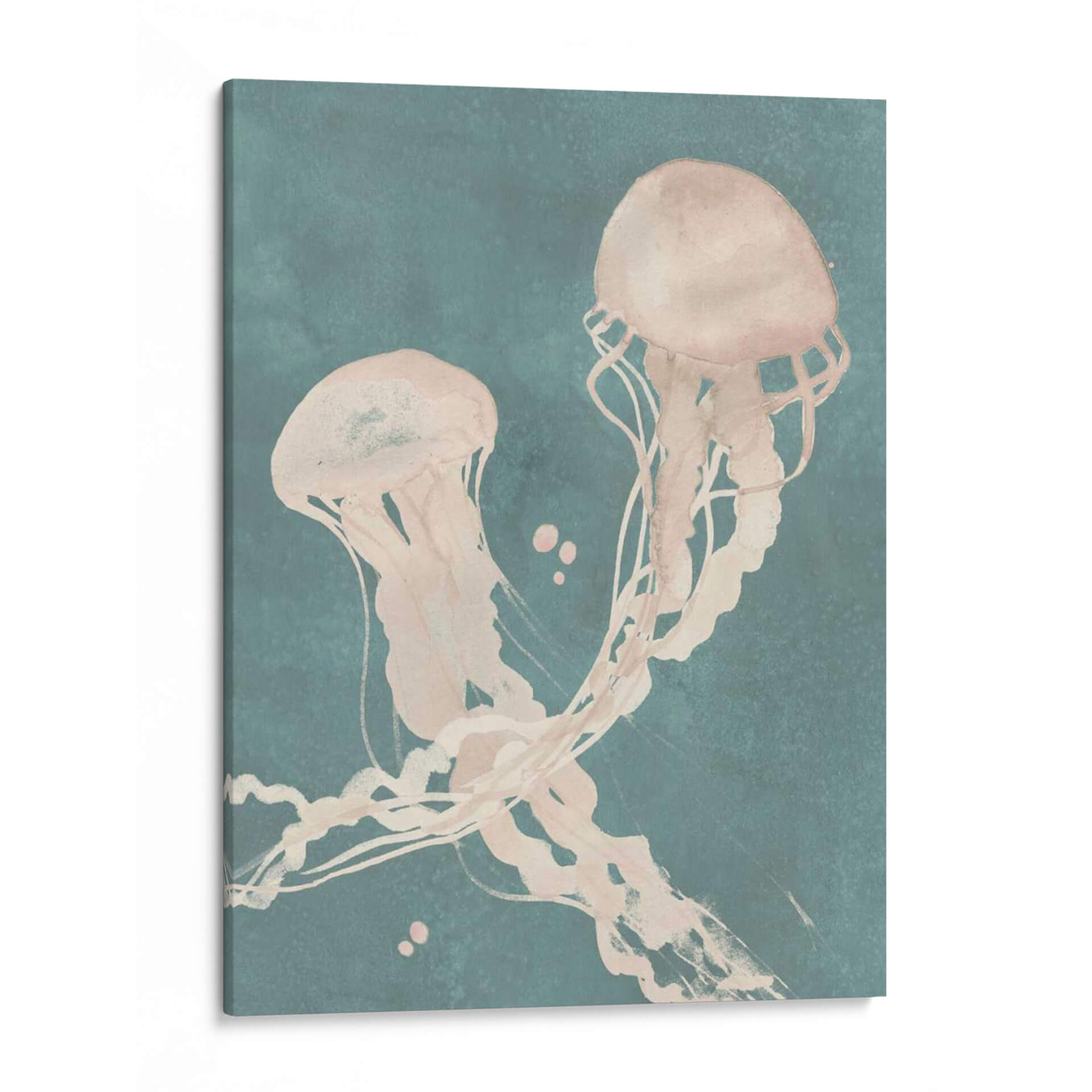 Sumérgete en la serena belleza del océano con "Jellyfish Dance II", una obra de arte cautivadora de Grace Popp. Este cuadro decorativo captura la etérea danza de dos medusas en un fondo texturizado en tonos azul verdoso profundo, evocando una sensación de calma y misterio marino. La paleta de colores, dominada por suaves tonos rosados y cremosos para las medusas que contrastan elegantemente con el fondo acuático, crea una atmósfera de tranquilidad y sofisticación. El estilo artístico, una delicada fusión de lo figurativo y lo abstracto con toques de acuarela, permite que la imaginación del espectador vuele, interpretando el movimiento fluido y la gracia de estas criaturas marinas. "Jellyfish Dance II" es ideal para añadir un toque de serenidad y elegancia contemporánea a tu sala de estar, dormitorio o cualquier espacio que necesite una dosis de paz inspirada en la naturaleza. Su composición dinámica pero sutil convierte a esta pieza en un punto focal que invita a la contemplación, perfecta para quienes buscan arte que transmita calma y belleza natural. Transforma tu hogar en un santuario de paz con este encantador cuadro decorativo marino que captura la magia del mundo submarino.