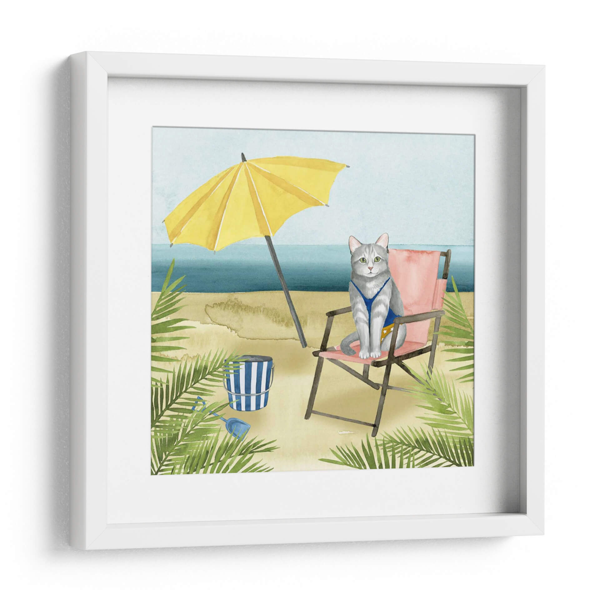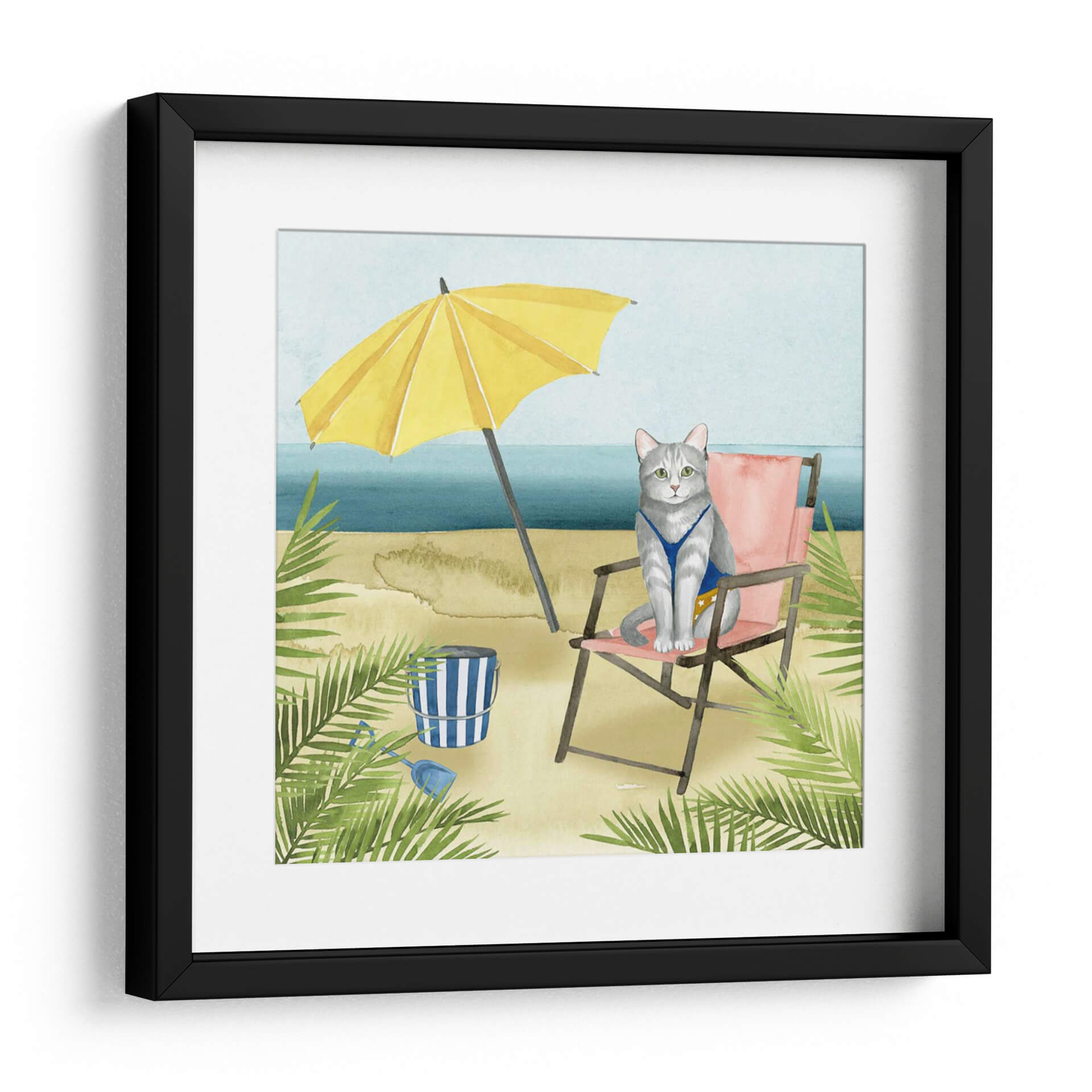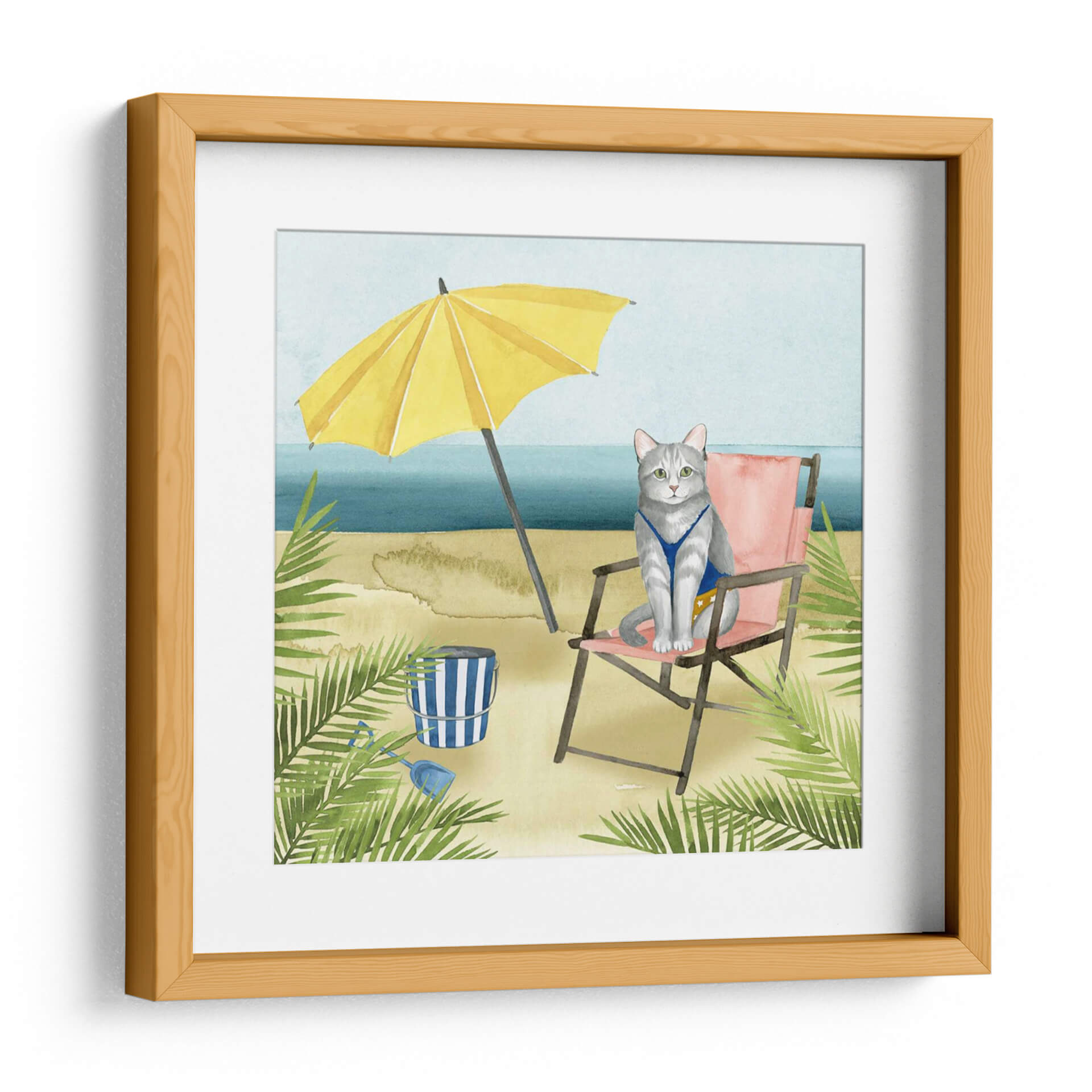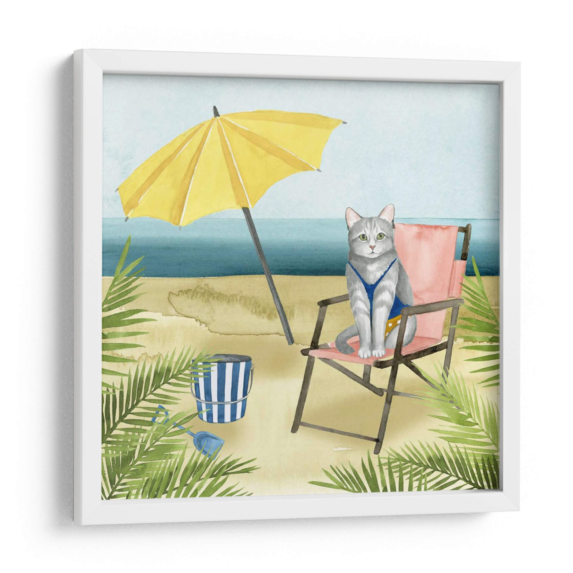 Sumérgete en la alegría de un día de verano con "Kitties Costeros II", una encantadora obra de arte de Grace Popp. Esta pieza captura a un adorable gato atigrado sentado con confianza en una silla de playa rosa, bajo la sombra de un vibrante paraguas amarillo. El fondo nos transporta a una serena costa, con el azul del mar extendiéndose hasta el horizonte, mientras la arena dorada y las exuberantes palmeras en primer plano crean una atmósfera vacacional idílica. Los colores pastel, con suaves tonos celestes y amarillos cálidos, junto con el toque juguetón del atuendo del gato, infunden una sensación de paz y diversión. El estilo de acuarela añade una textura suave y etérea, perfecta para añadir un toque de whimsy y calidez a cualquier espacio. Ideal para el dormitorio, la sala de estar o incluso una guardería, este cuadro decorativo evoca sensaciones de relajación y felicidad. Es una pieza que promete arrancar sonrisas y traer la brisa del mar a tu hogar, convirtiéndose en un punto focal encantador y lleno de personalidad.