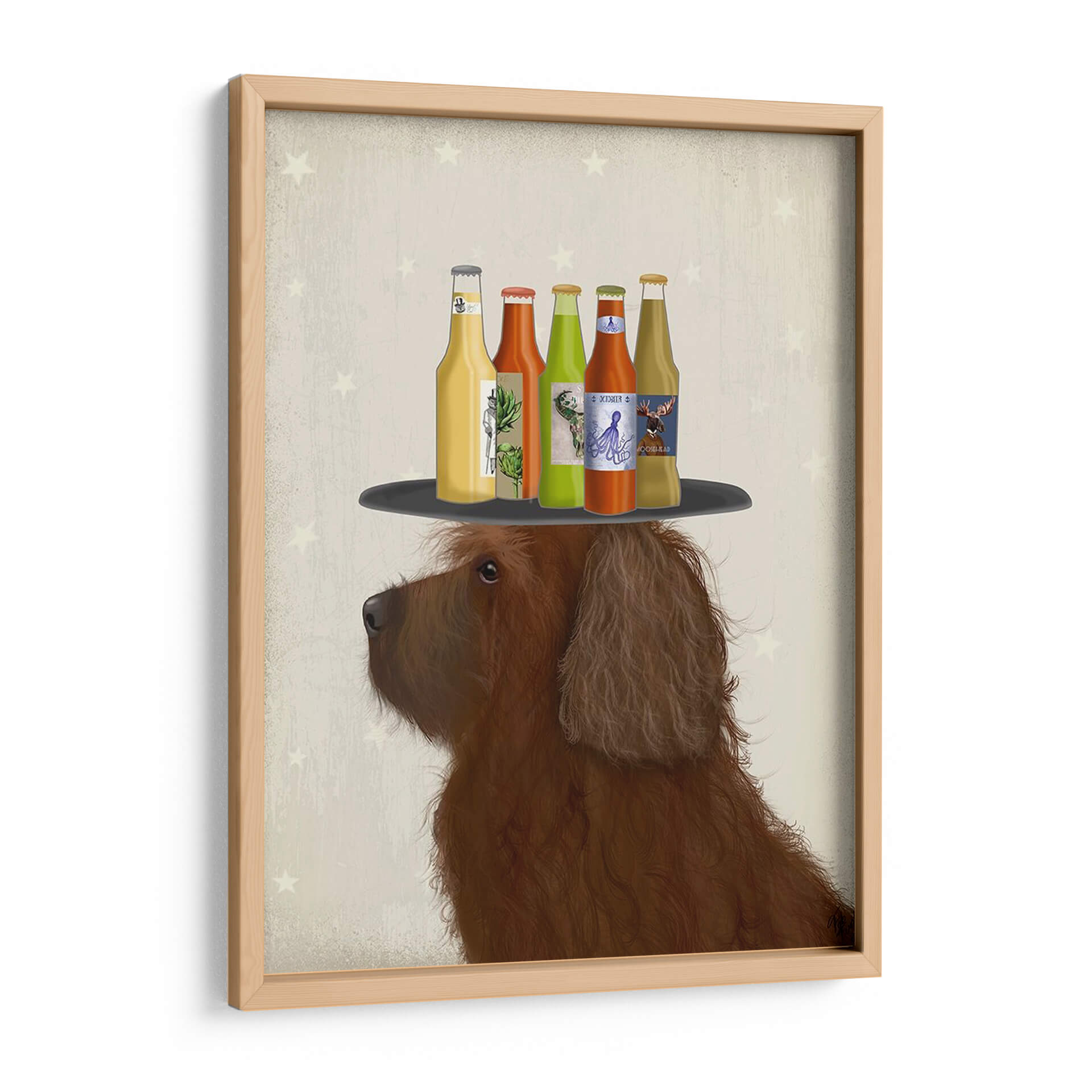 Descubre el encanto juguetón y la originalidad de "Labradoodle Marrón 2 Cerveza Amante", una obra de arte digital que captura la atención con su propuesta única y llena de personalidad. Este cuadro decorativo presenta a un adorable Labradoodle marrón con un elaborado peinado de botellas de cerveza equilibradas sobre una bandeja en su cabeza. La paleta de colores, dominada por tonos tierra y pastel, crea una atmósfera cálida y acogedora, acentuada por un sutil patrón de estrellas en el fondo que añade un toque de fantasía. El estilo artístico, una mezcla de ilustración detallada y encanto rústico, lo convierte en una pieza ideal para espacios que buscan un toque de humor y sofisticación.
