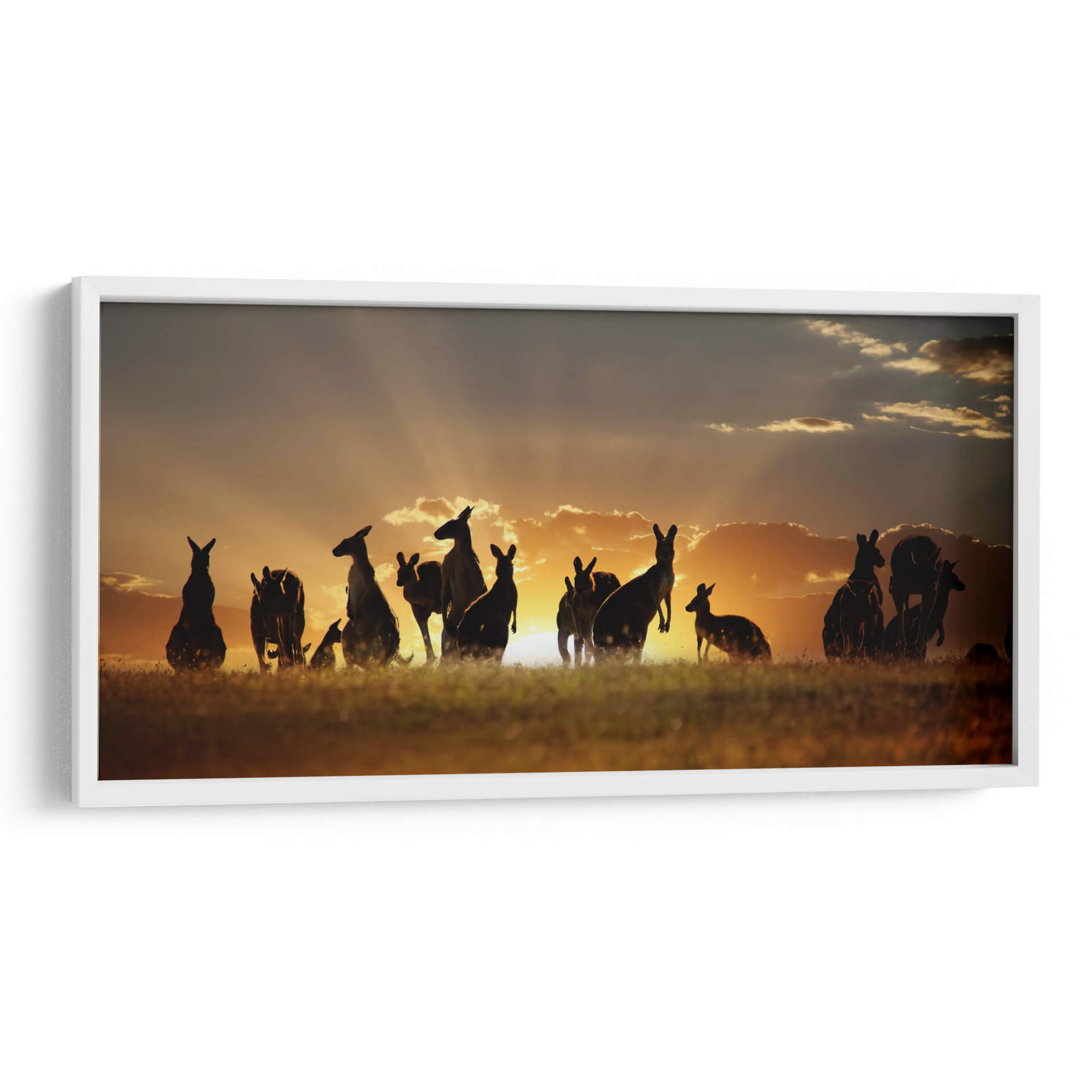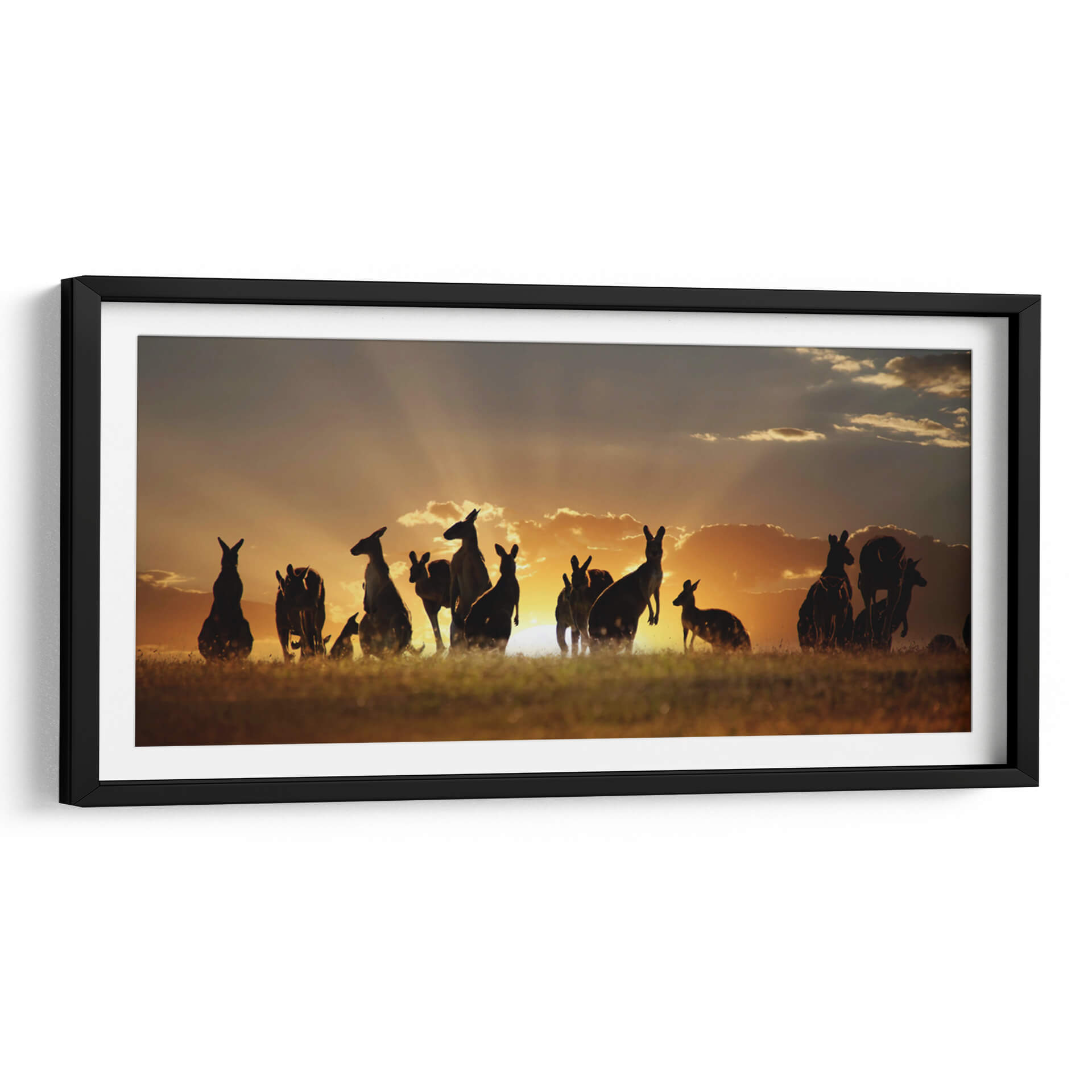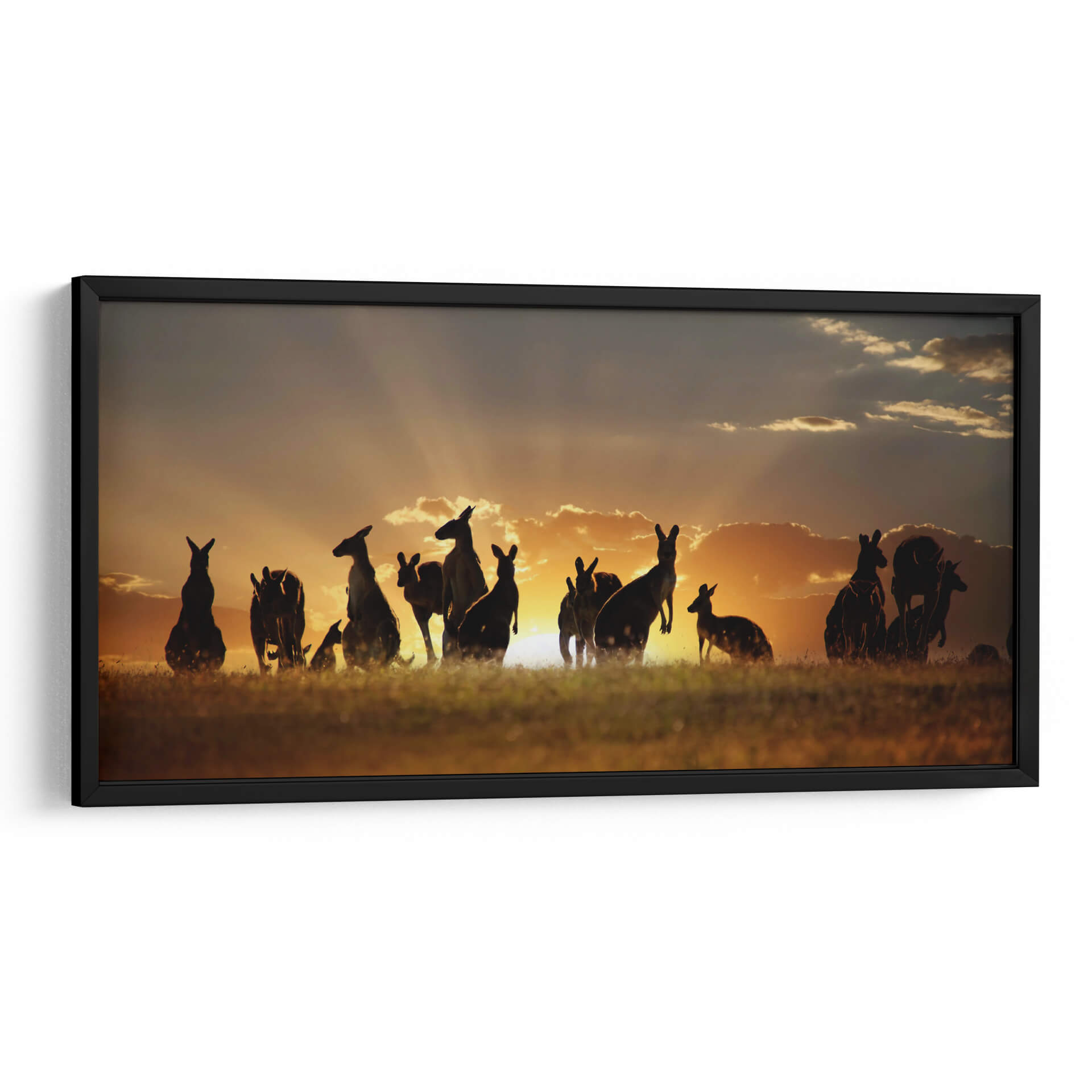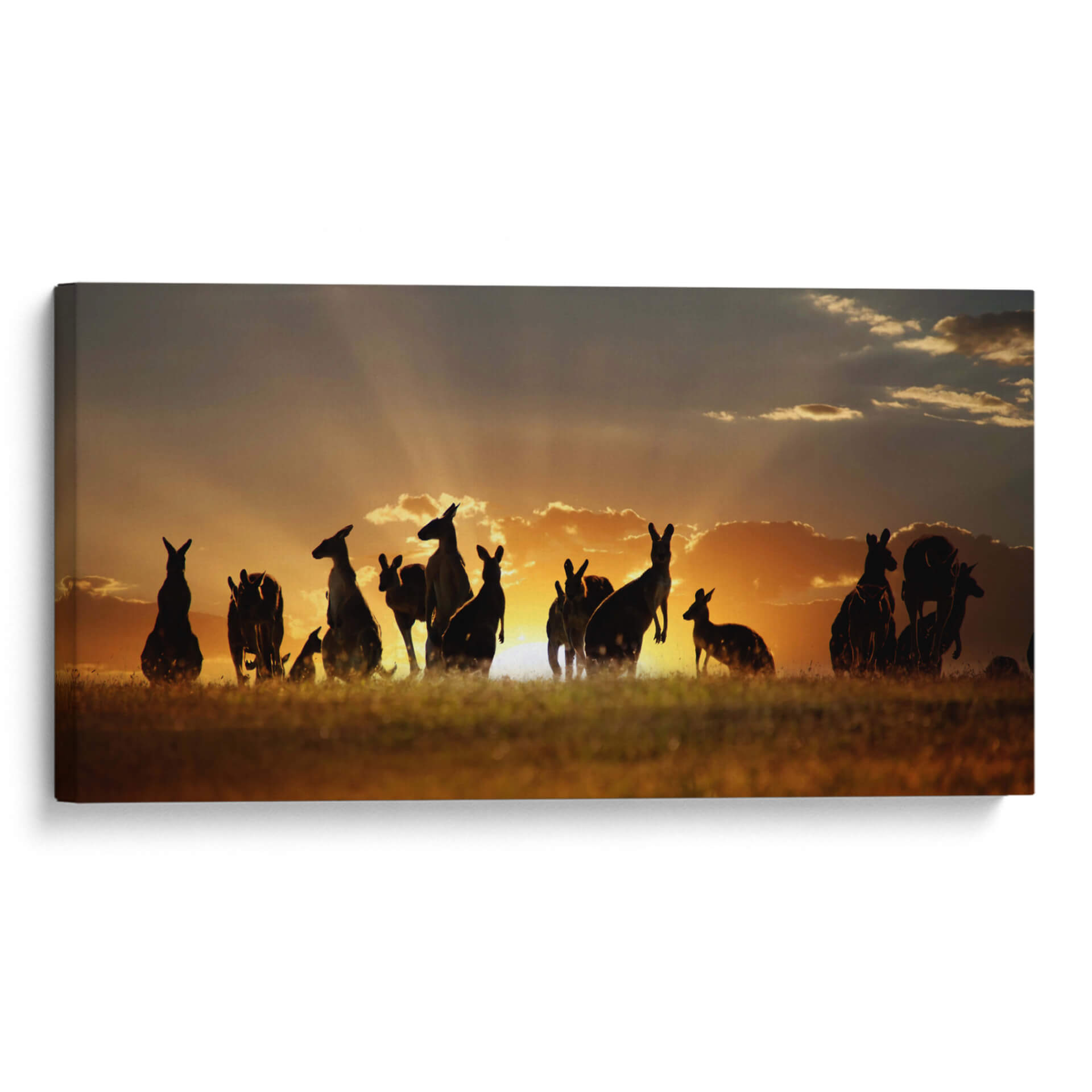 Sumérgete en la majestuosidad de la naturaleza con este cautivador cuadro decorativo 'Los canguros'. La obra captura un momento efímero al atardecer, donde siluetas oscuras de canguros se recortan contra un cielo teñido de cálidos tonos naranjas, dorados y rojizos. Los rayos del sol se filtran entre las nubes, creando un efecto dramático y etéreo que envuelve la escena en una atmósfera de serenidad y aventura salvaje. La hierba seca del primer plano, bañada por la luz crepuscular, añade textura y profundidad, contrastando sutilmente con las figuras animales. Este cuadro decorativo es una ventana a la vida salvaje australiana, evocando una sensación de libertad y conexión con el entorno natural. Su composición horizontal lo hace ideal para espacios amplios como salas de estar, comedores o incluso oficinas, donde busca añadir un toque de carácter y calidez. El juego de luces y sombras, junto con la paleta de colores cálidos y terrosos, genera un ambiente acogedor y a la vez inspirador, perfecto para quienes buscan un arte que hable de la belleza indómita del mundo.