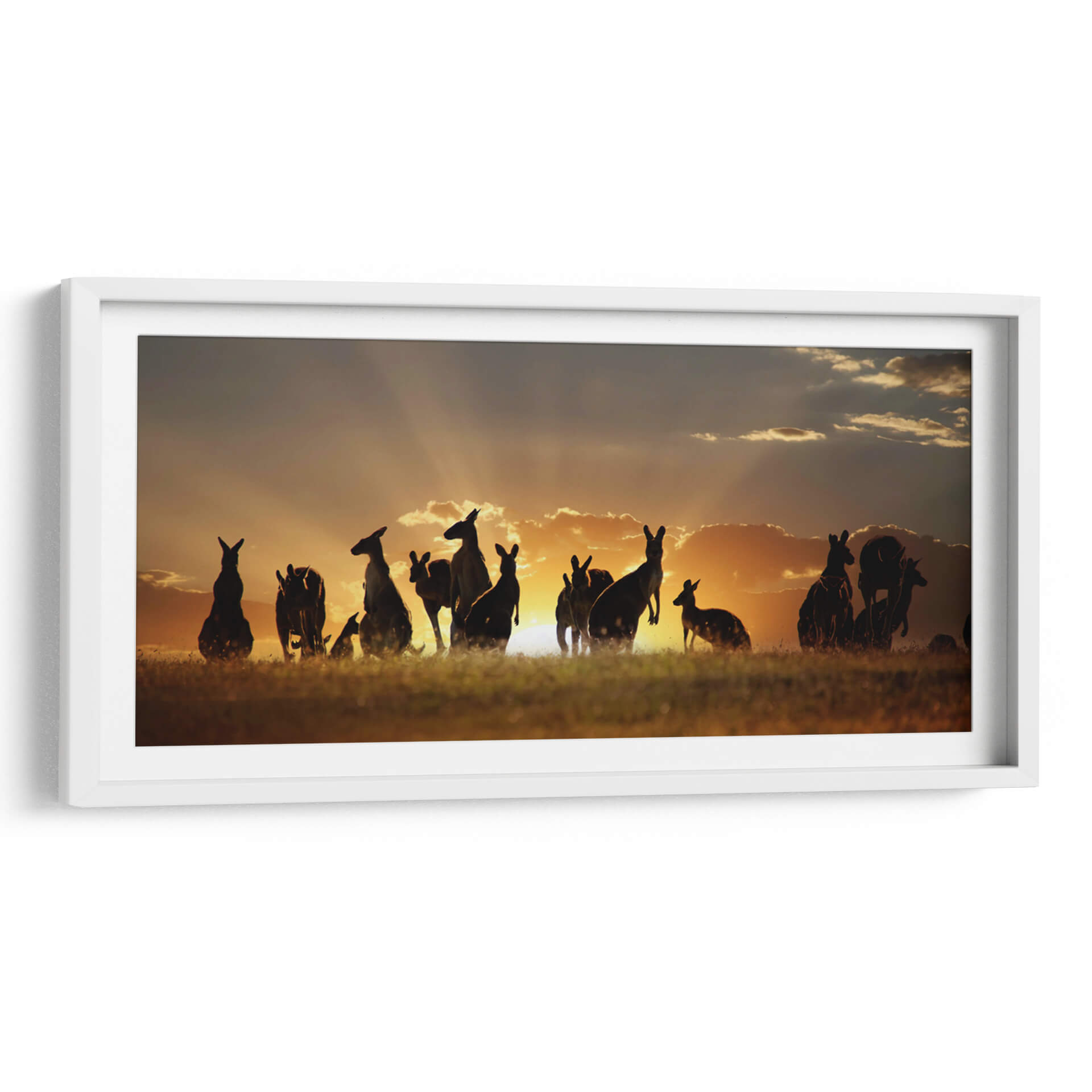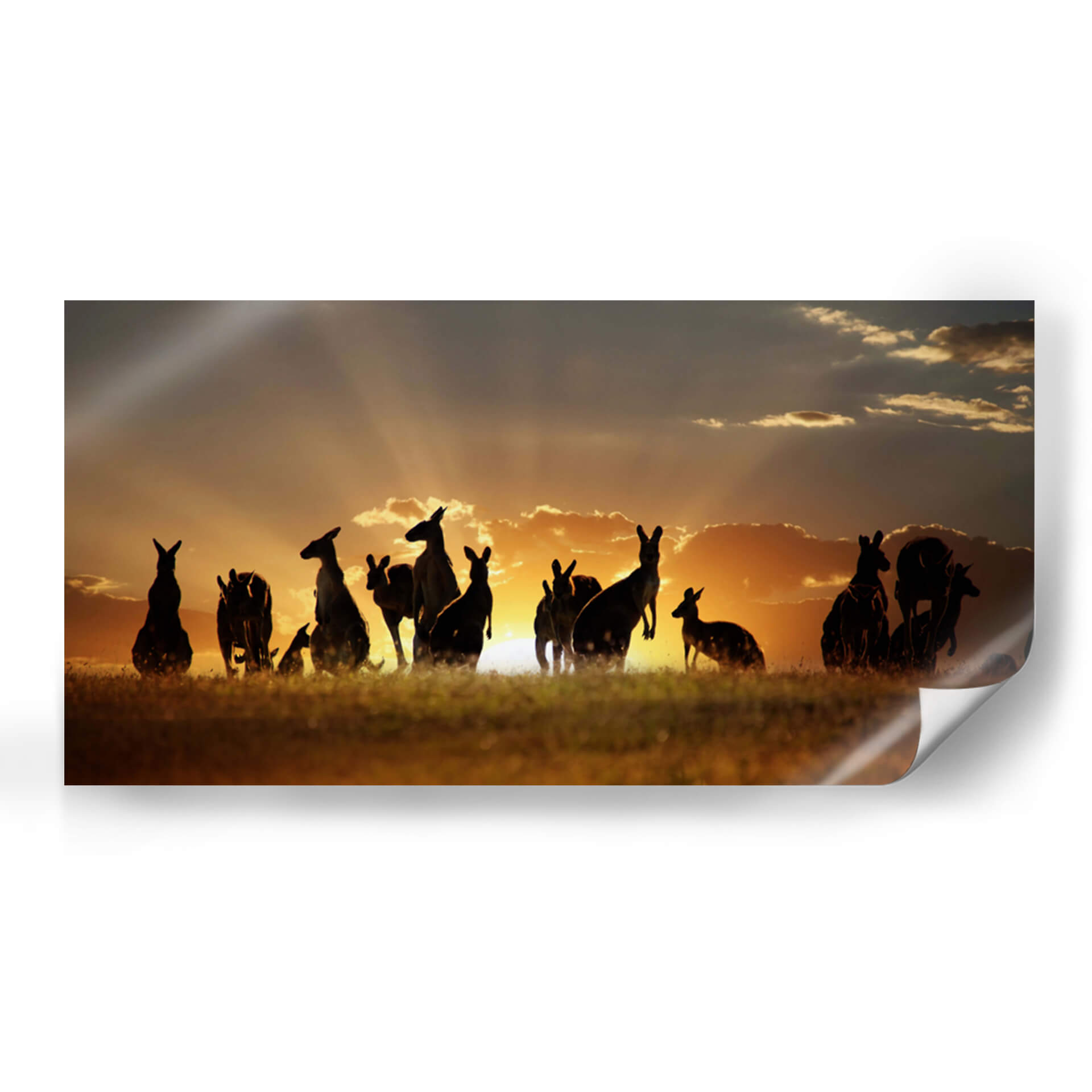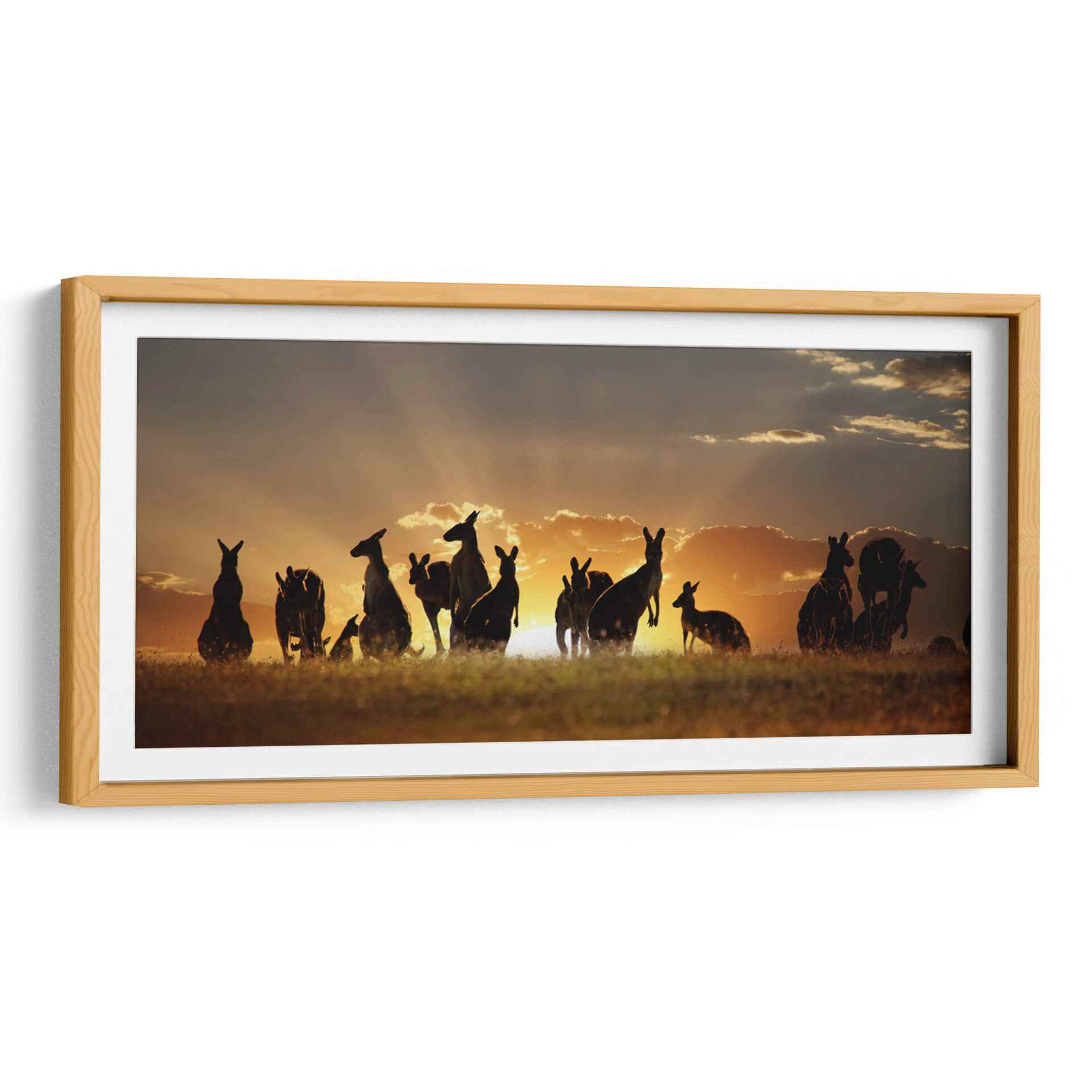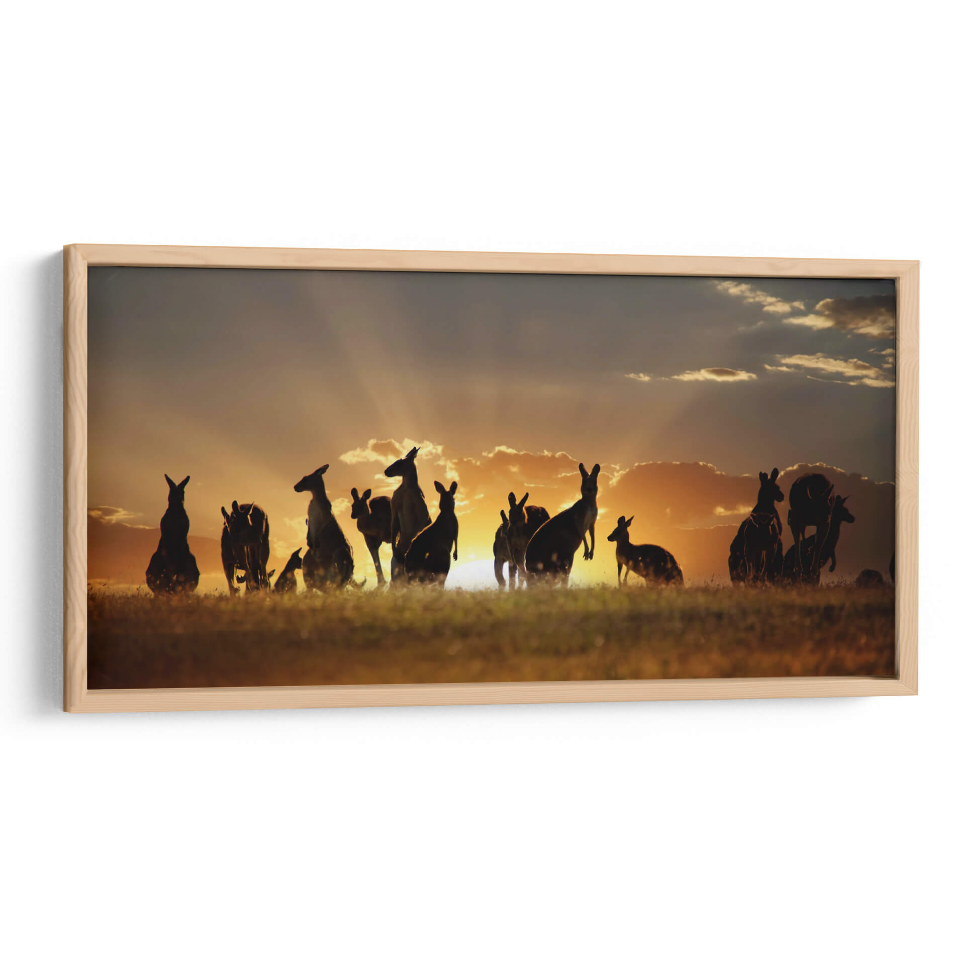 Sumérgete en la majestuosidad de la naturaleza con este cautivador cuadro decorativo 'Los canguros'. La obra captura un momento efímero al atardecer, donde siluetas oscuras de canguros se recortan contra un cielo teñido de cálidos tonos naranjas, dorados y rojizos. Los rayos del sol se filtran entre las nubes, creando un efecto dramático y etéreo que envuelve la escena en una atmósfera de serenidad y aventura salvaje. La hierba seca del primer plano, bañada por la luz crepuscular, añade textura y profundidad, contrastando sutilmente con las figuras animales. Este cuadro decorativo es una ventana a la vida salvaje australiana, evocando una sensación de libertad y conexión con el entorno natural. Su composición horizontal lo hace ideal para espacios amplios como salas de estar, comedores o incluso oficinas, donde busca añadir un toque de carácter y calidez. El juego de luces y sombras, junto con la paleta de colores cálidos y terrosos, genera un ambiente acogedor y a la vez inspirador, perfecto para quienes buscan un arte que hable de la belleza indómita del mundo.