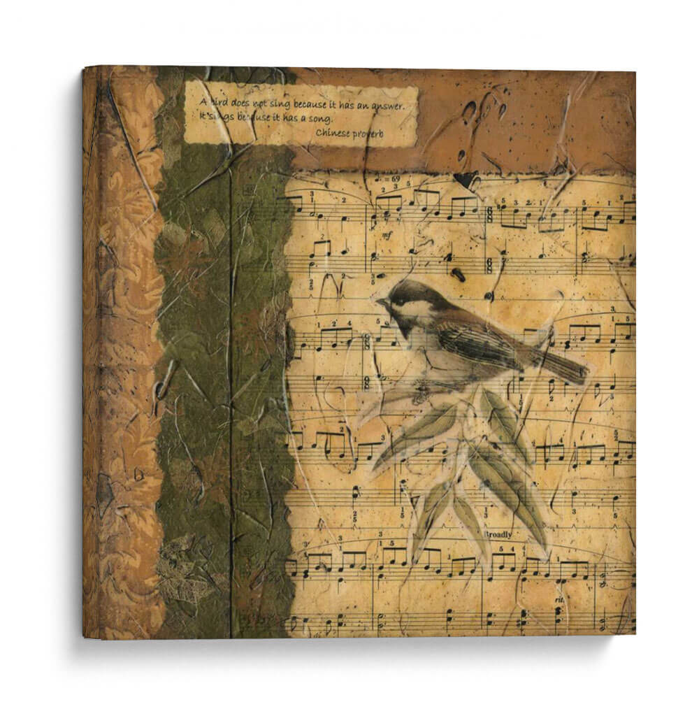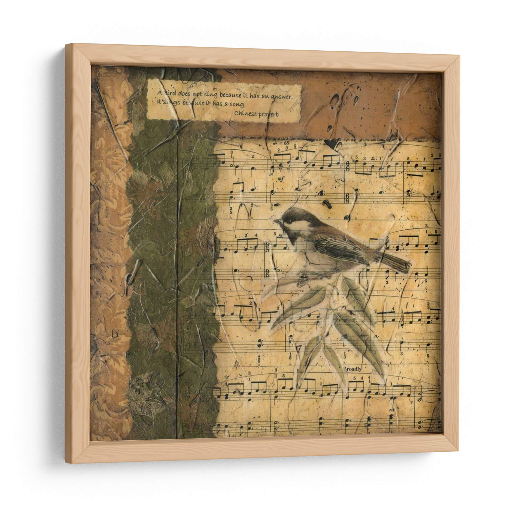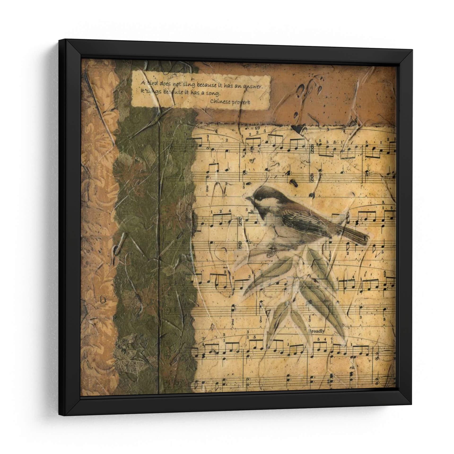 Captura la esencia de la música y la naturaleza con "Melodía De Aves I", una obra de arte única de Nancy Slocum. Este cuadro decorativo presenta una delicada representación de un ave posada sobre ramas, superpuesta sobre partituras antiguas, evocando una atmósfera nostálgica y serena. La paleta de colores, dominada por tonos tierra, verdes apagados y el sepia de las notas musicales, crea una sensación de calidez y tranquilidad. El estilo, que combina elementos realistas con un fondo texturizado y vintage, aporta profundidad y carácter. La composición, con el ave como punto focal, invita a la contemplación, sugiriendo una conexión intrínseca entre el canto y el alma. Este cuadro es ideal para añadir un toque de sofisticación y paz a tu sala de estar, estudio o dormitorio, transformando cualquier espacio en un refugio de inspiración. Descubre la belleza atemporal de la música y la fauna a través de esta pieza artística excepcional.