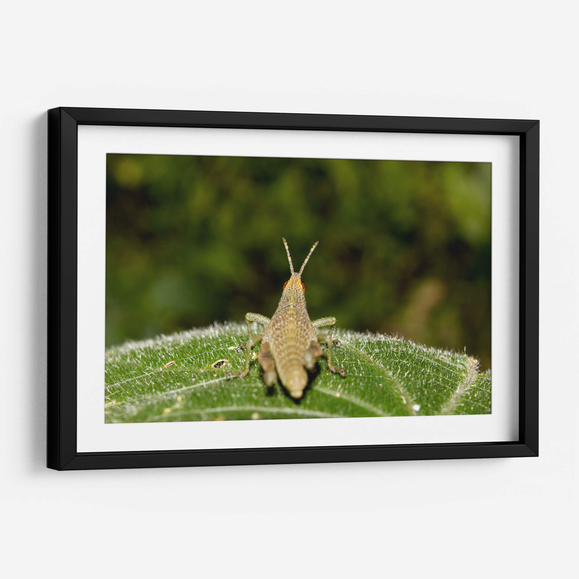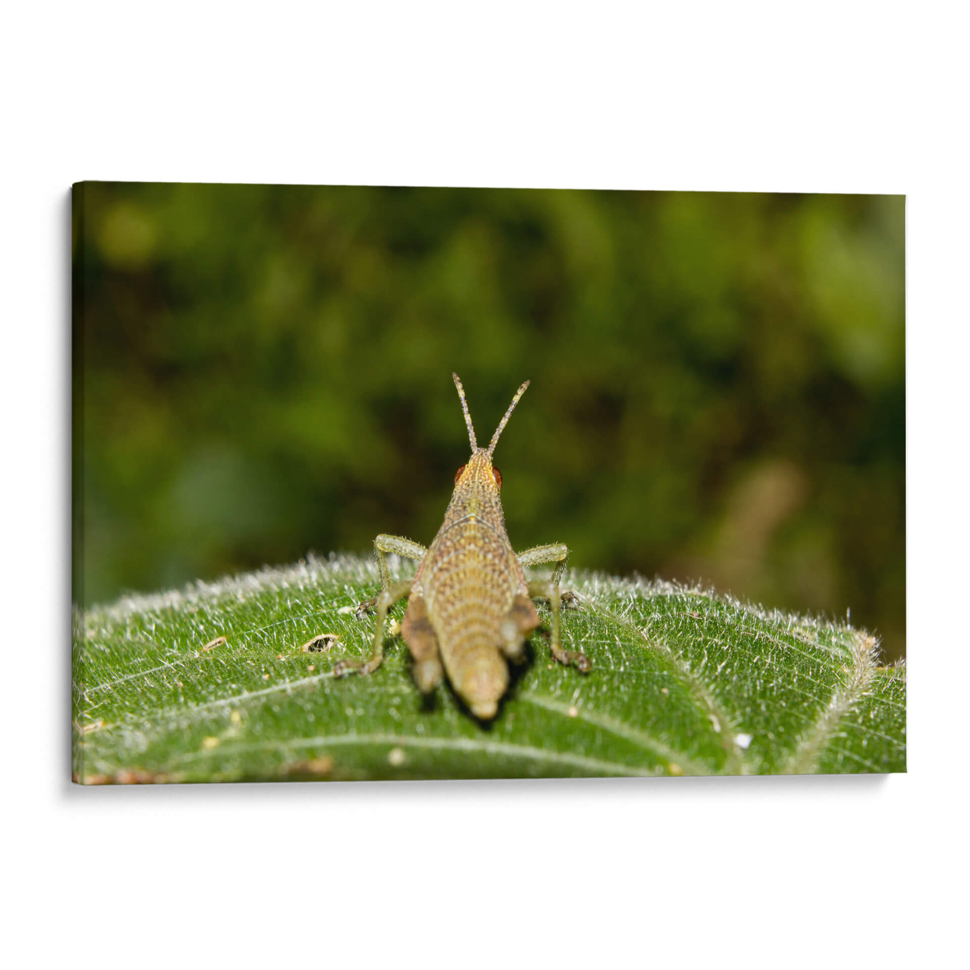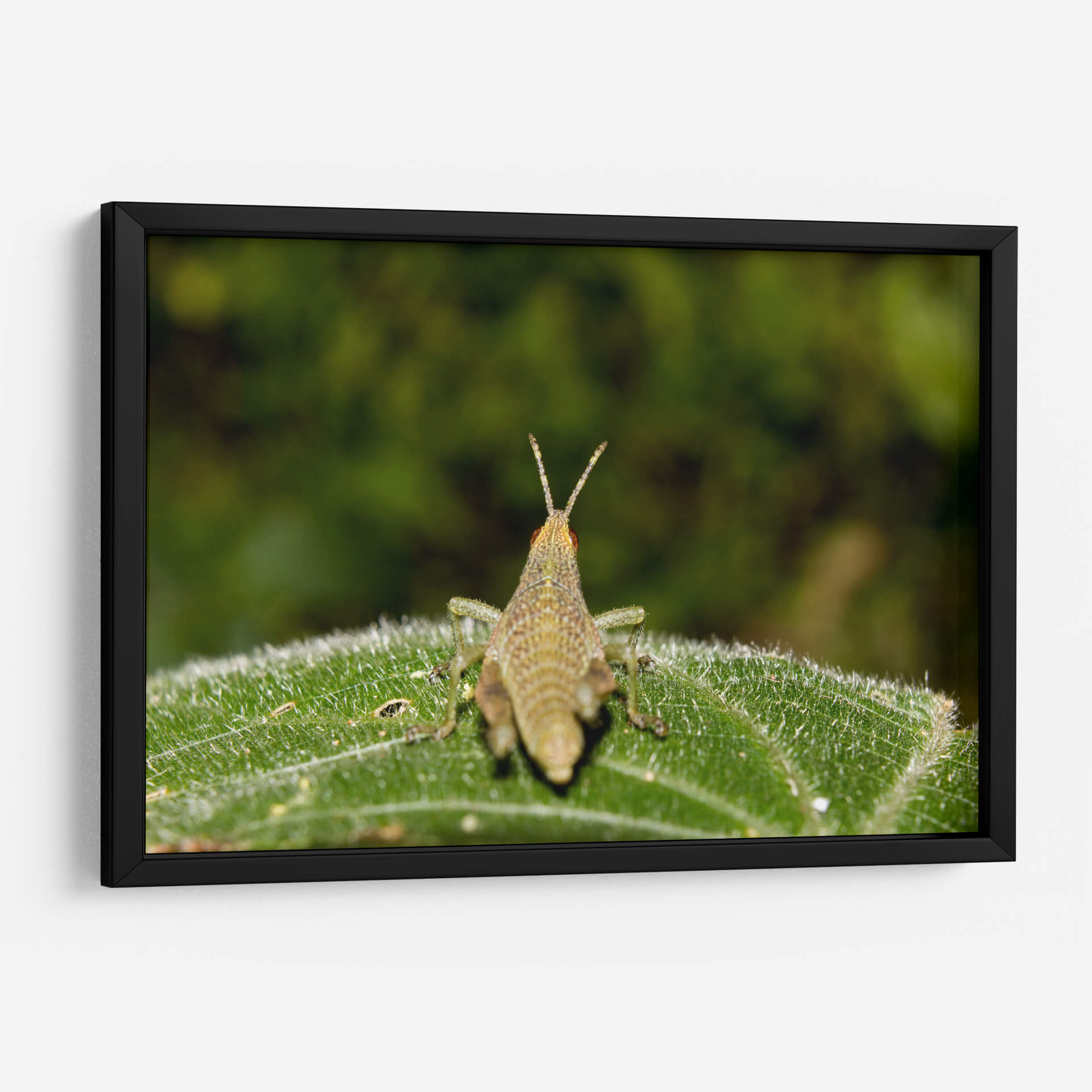 Sumérgete en el fascinante mundo de la naturaleza con este cuadro decorativo 'Minimundus07' del artista Jiván. La obra captura la esencia de la vida en miniatura, presentando un primer plano detallado de un saltamontes posado sobre una hoja verde vibrante. Los verdes profundos y texturizados del fondo crean una atmósfera serena y natural, mientras que la hoja, con sus finos vellos y venas marcadas, aporta una sensación de realismo y delicadeza. El protagonista, el saltamontes, exhibe una paleta de tonos tierra y ocres, con detalles intrincados en su exoesqueleto y sus distintivos ojos rojos que parecen mirar directamente al espectador, añadiendo un toque de vida y curiosidad a la composición. Este cuadro es una invitación a apreciar la belleza oculta en los pequeños detalles del entorno natural. Su estilo realista y macro fotográfico lo convierte en una pieza ideal para añadir un toque de frescura y vitalidad a cualquier espacio, desde una sala de estar moderna hasta un estudio o dormitorio que busque inspiración en la tranquilidad del campo. 'Minimundus07' no es solo una imagen, es una ventana a un universo detallado, un recordatorio de la complejidad y la maravilla que nos rodea.