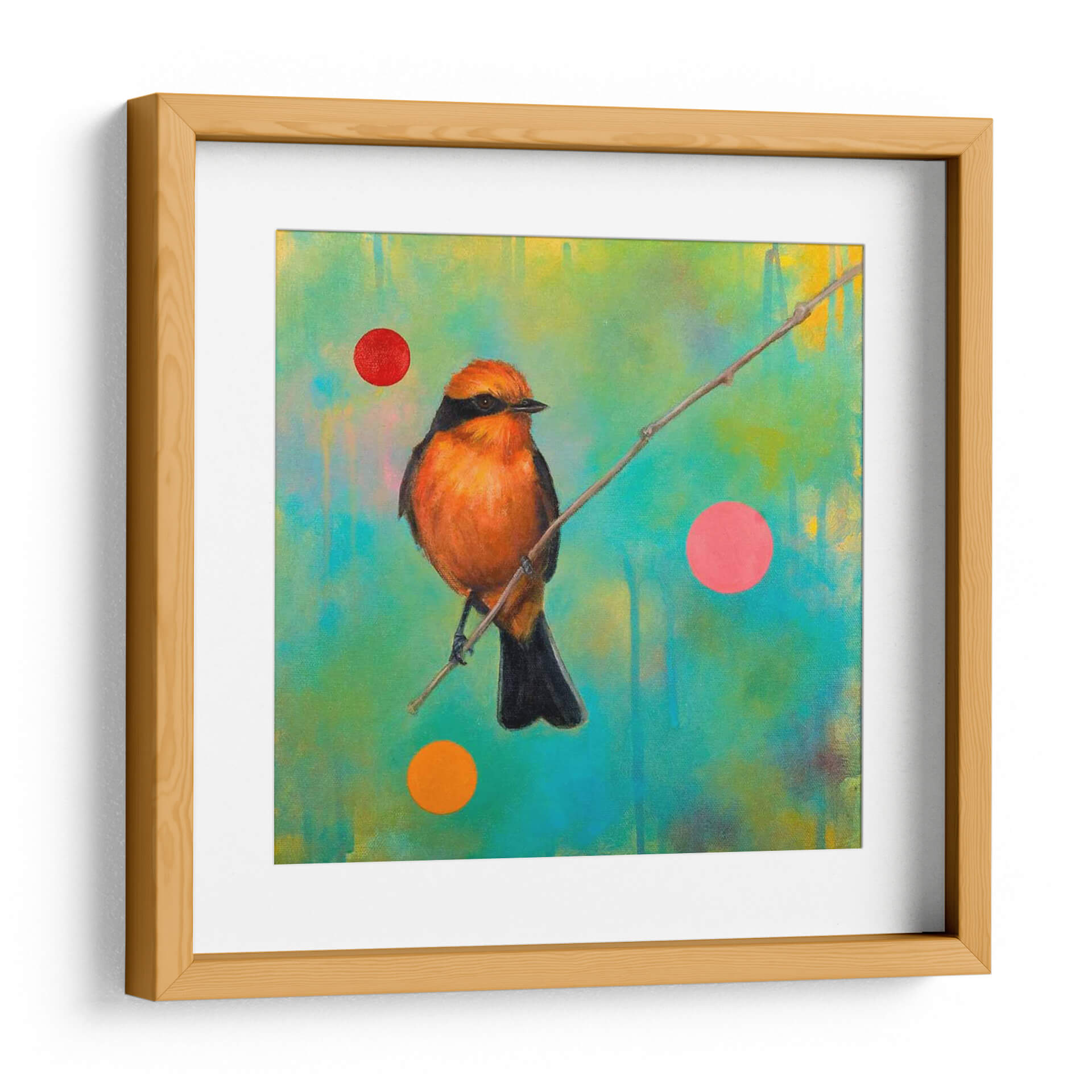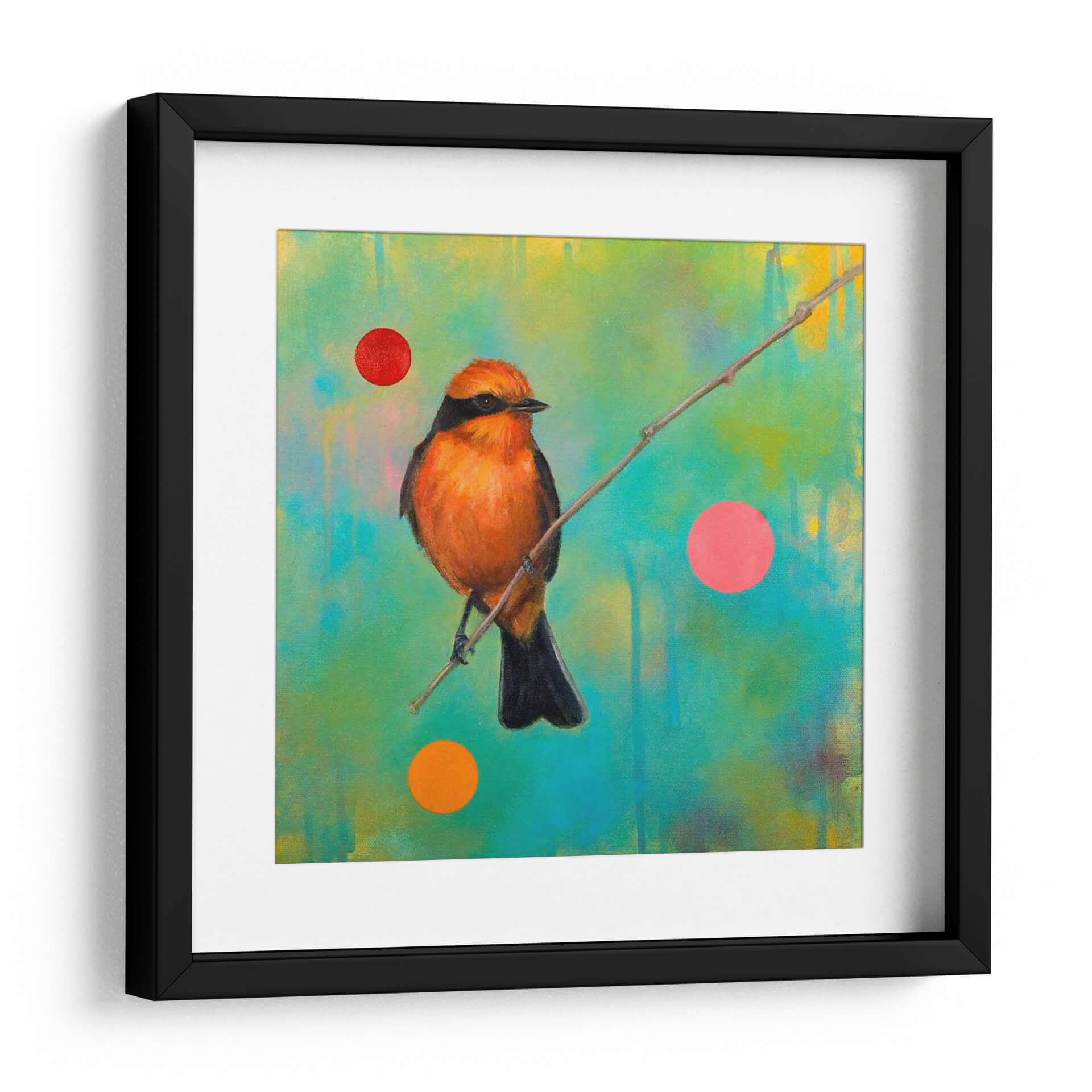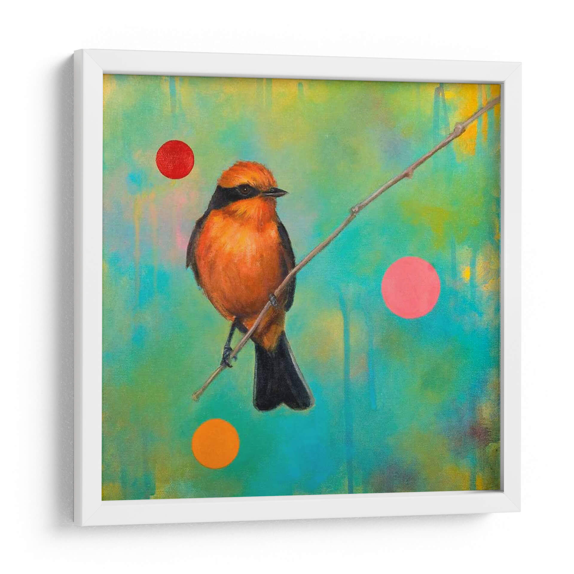 Sumérgete en la cautivadora belleza de "Misterios Del Universo Iv", una obra de arte contemporáneo que celebra la naturaleza y la abstracción. Este cuadro decorativo presenta un vibrante pájaro naranja posado en una rama delgada, contrastando con un fondo etéreo de tonos verdes y amarillos con sutiles texturas. La composición se realza con la adición juguetona de círculos de colores vivos (rojo, rosa y naranja), que añaden un toque moderno y surrealista a la escena. La técnica pictórica, que sugiere pinceladas expresivas y una atmósfera onírica, invita a la contemplación. Ideal para quienes buscan infundir vida y color en sus espacios, este cuadro es perfecto para salas de estar, dormitorios o estudios, aportando un aire de misterio y una conexión con la fauna y la vibrante energía del universo. "Misterios Del Universo Iv" es más que una simple decoración de pared; es una ventana a la imaginación de la artista Bridget G. Evans, una pieza que dialoga con el espectador y transforma cualquier ambiente en una galería personal.