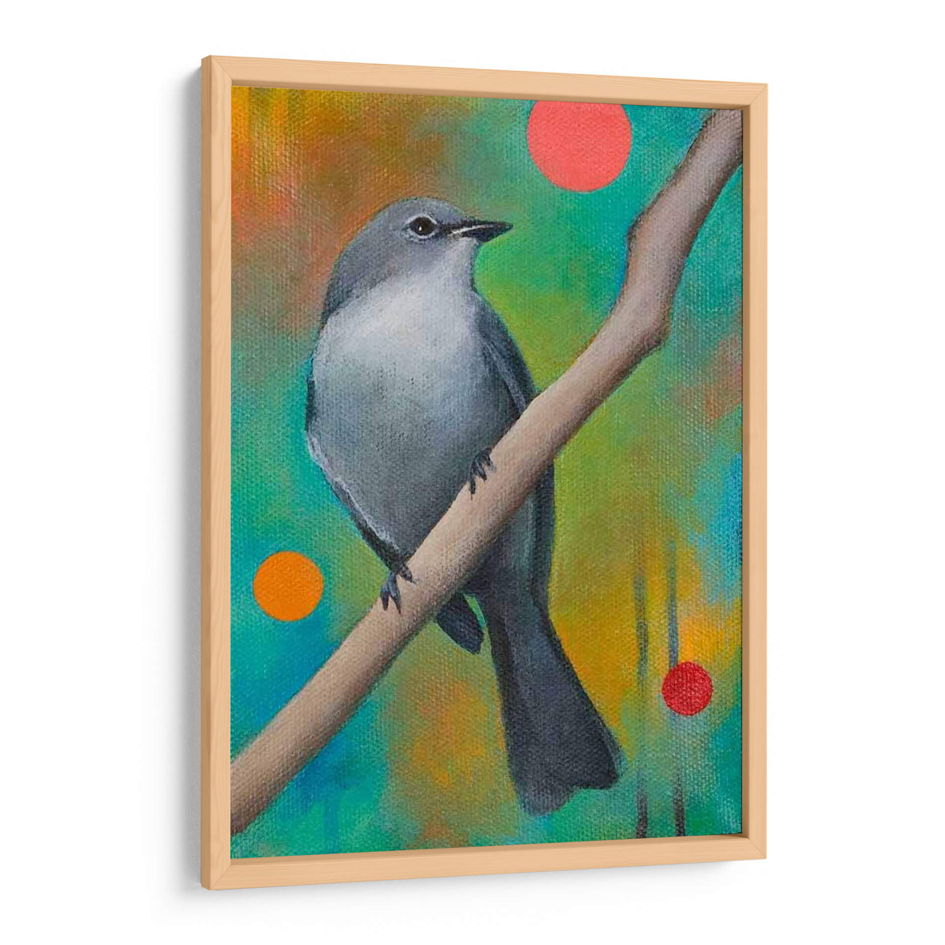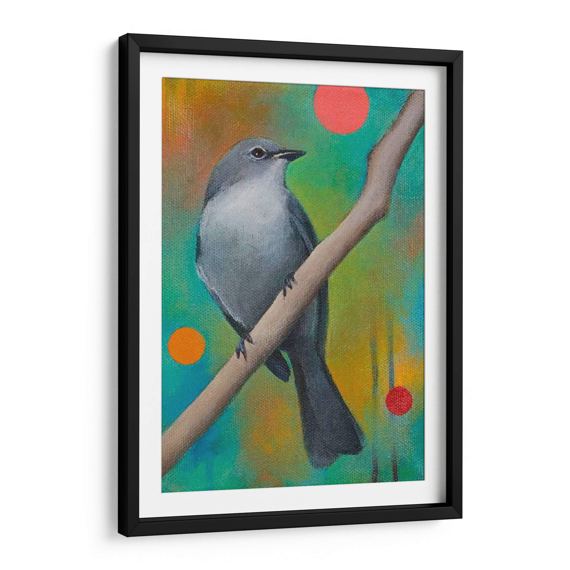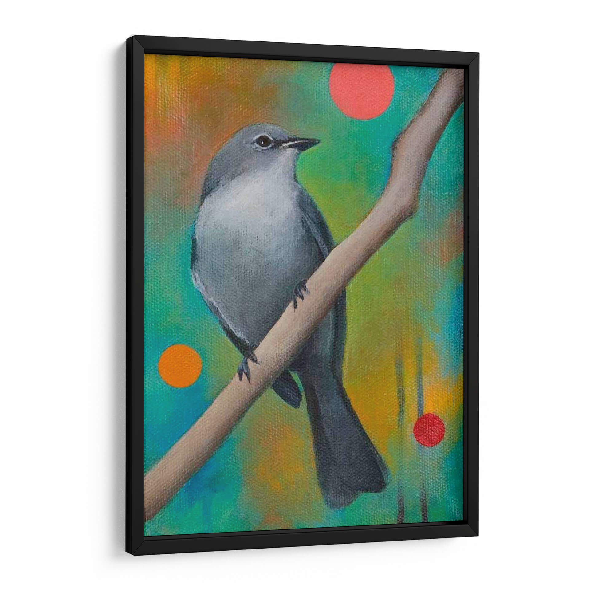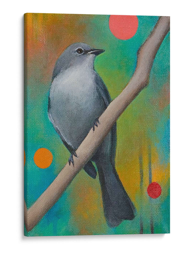 Sumérgete en la serenidad y el encanto de "Misterios Del Universo Xiv", una cautivadora obra de arte de Bridget G. Evans que captura la delicadeza de un ave posada en una rama. La vibrante paleta de colores, con un fondo que evoca la transición del día a la noche con tonos turquesas, verdes, naranjas y amarillos, crea una atmósfera etérea y enigmática. Los toques de color rojo y naranja en forma de círculos añaden un elemento lúdico y moderno a la composición. El ave, representada con trazos suaves y una paleta de grises y blancos, irradia calma y contemplación, convirtiéndose en el punto focal de la pieza. Este cuadro decorativo abstracto, con su estilo único y evocador, es perfecto para infundir paz y un toque de naturaleza estilizada en cualquier espacio de tu hogar u oficina. Ideal para salones modernos, dormitorios tranquilos o incluso como pieza de acento en una entrada. Transforma tu pared en una ventana a un universo de calma y belleza sutil con este impresionante cuadro de pájaro.